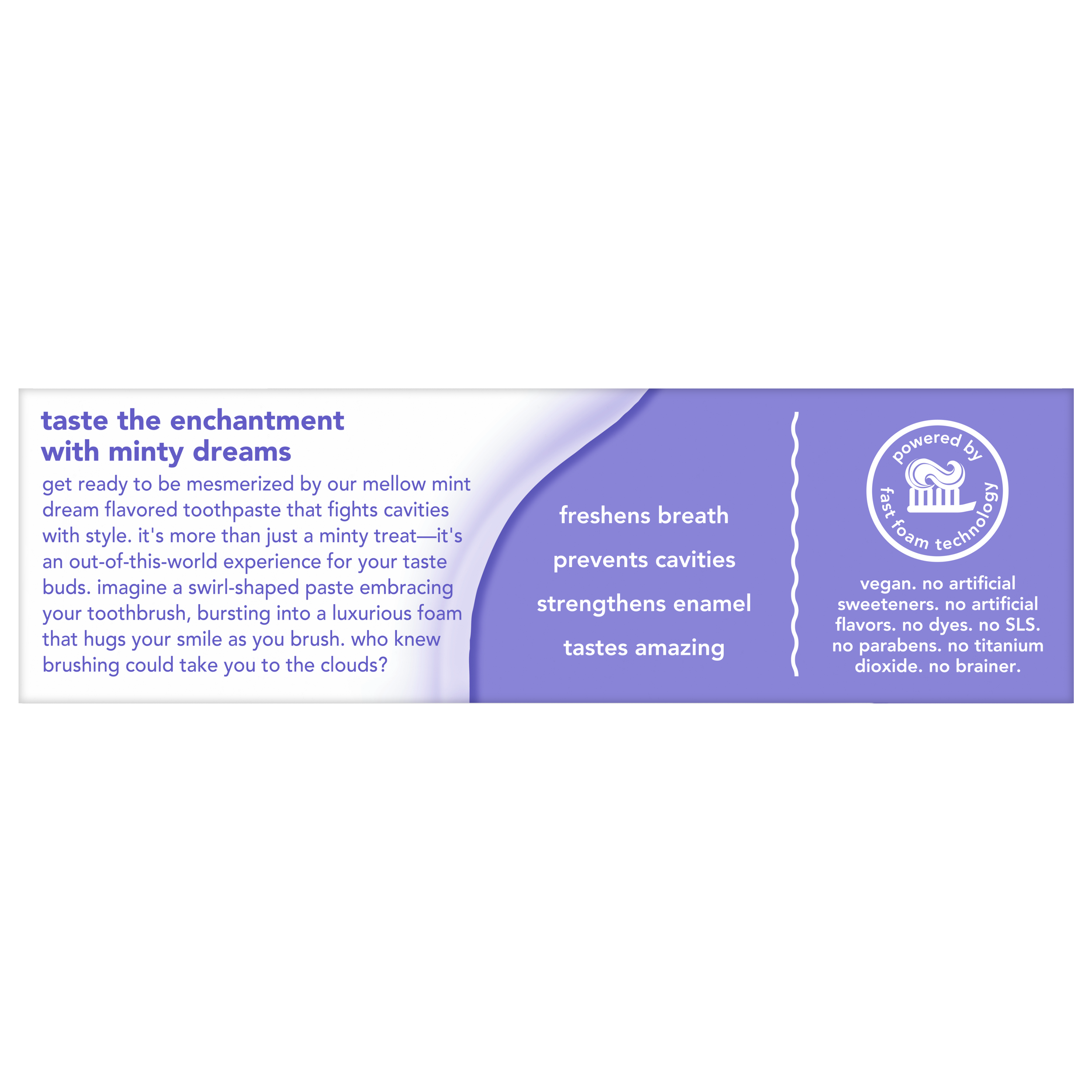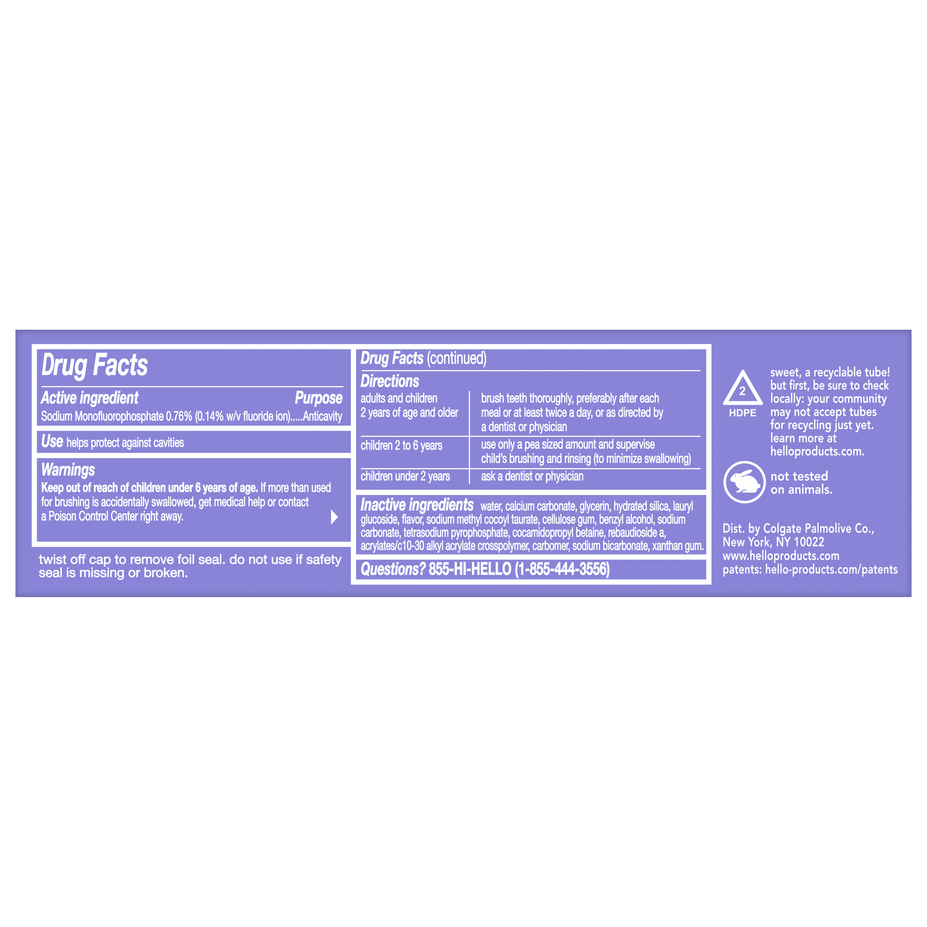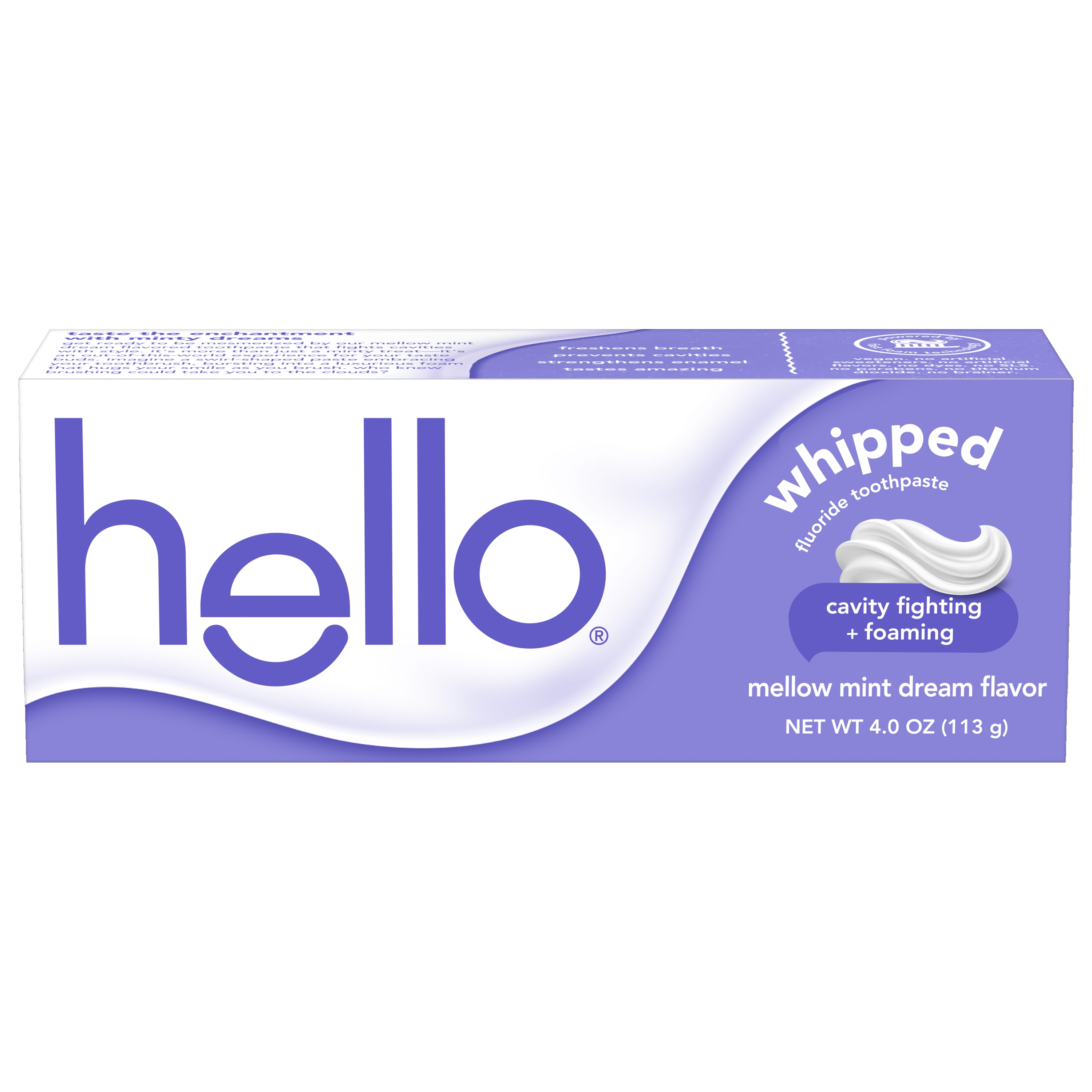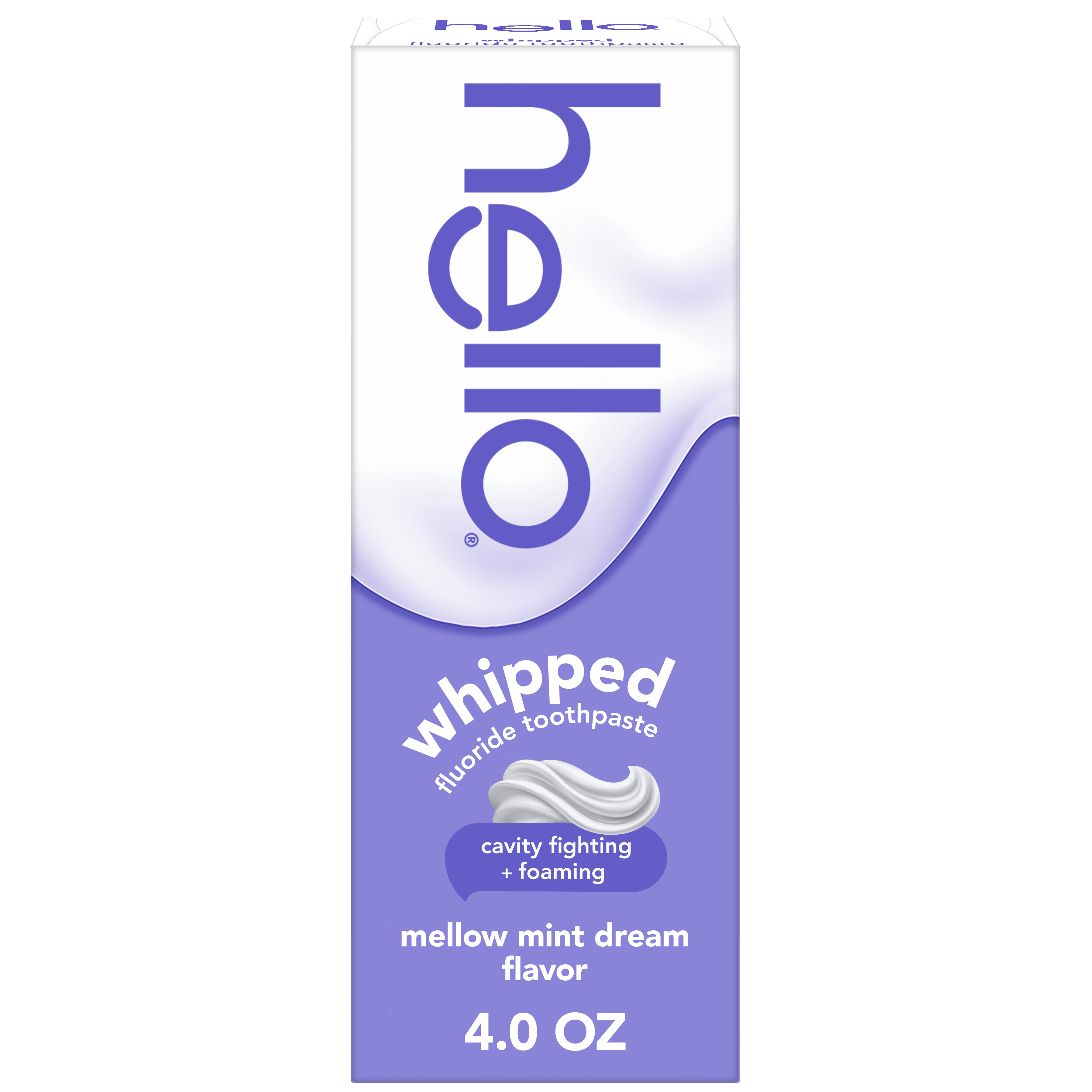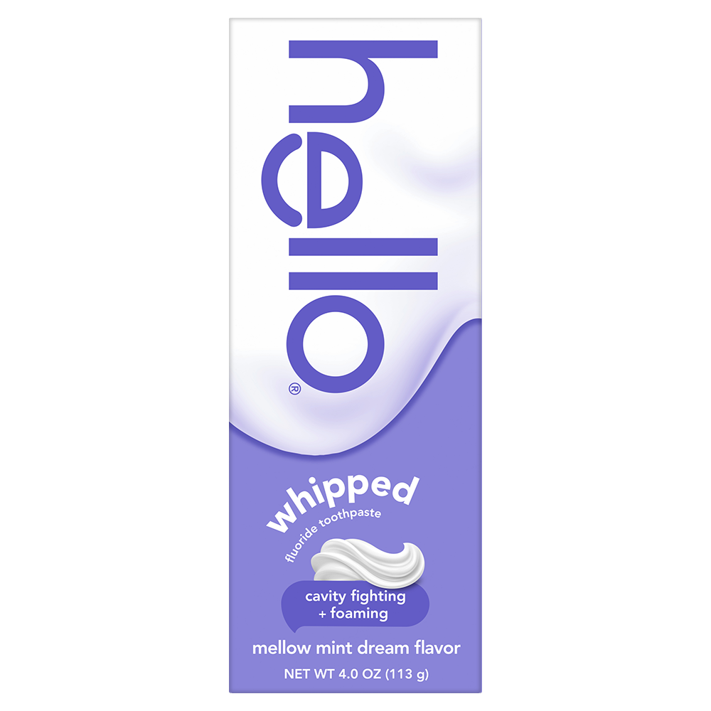 SKU 61045055 Consumer Unit - GTIN 00827854018124 Case - GTIN 10827854018121 Product Category Oral Care Product Sub Category Toothpaste Product Equity (Brand) hello Product Sub Brand Hello Adult TP Product Title hello Whipped Fluoride Toothpaste, Minty Foam Toothpaste, Mellow Mint Dream, 4.0 oz Product Description Say hello to dreamy, foamy, cavity-fighting mint toothpaste for adults that will leave your breath feeling on cloud nine with hello Whipped Mellow Mint Dream Adult Fluoride Toothpaste. Powered by fast foam technology, this hello toothpaste with fluoride delivers an amazing foaming texture, freshens breath, and is tough on cavities. Get ready to be mesmerized by a mint flavored foaming toothpaste that tastes amazing and fights cavities. With its unique foamy texture and playful, swirly nurdle shape, this foam toothpaste is more than just a minty treat—it's an out-of-this-world experience for your taste buds. Imagine a swirl-shaped paste embracing your toothbrush, bursting into a luxurious foam that hugs your smile as you brush. This hello mint toothpaste uses a fluoride formula to help strengthen enamel and prevent cavities. Fight cavities with style using hello Whipped Mellow Mint Dream Fluoride Toothpaste. hello Whipped Toothpaste is an SLS free toothpaste with fluoride that contains no dyes, no artificial flavors or sweeteners, no parabens, and no titanium dioxide. Now that’s a no-brainer. Plus, hello Whipped Foam Toothpaste is vegan, not tested on animals, and comes in a recyclable carton and tube.* *Check locally: your community may not accept tubes for recycling just yet. Bullet 1 Includes one (1) 4.0 oz tube of hello Whipped Mellow Mint Dream Fluoride Toothpaste, Foaming Toothpaste Bullet 2 The unique foaming texture and swirly nurdle shape of hello Whipped Foam Toothpaste transforms your brushing from boring to magical Bullet 3 The fluoride toothpaste is a dreamy way to fight cavities and strengthen enamel Bullet 4 This hello fluoride toothpaste is more than just a minty treat, it’s an out-of-this-world experience for your taste buds and it freshens breath Bullet 5 This Mellow Mint Dream SLS free toothpaste contains no artificial flavors or sweeteners, titanium dioxide, parabens, or dyes Bullet 6 hello Whipped Mellow Mint Dream Fluoride Toothpaste for Adults delivers foamy cavity-fighting toughness all whipped togethe Bullet 7 hello Whipped Mellow Mint Dream mint toothpaste is a lush, foamy experience in a delish flavor that will have your breath feeling on cloud nine Active Ingredients Sodium Monofluorophosphate 0.76% (0.14% w/v fluoride ion) Walmart RPC 17963000947 Walmart URL (Computed) https://www.walmart.com/ip/a/17963000947 Target RPC 94823720 Target URL https://www.target.com/p/a/-/A-94823720