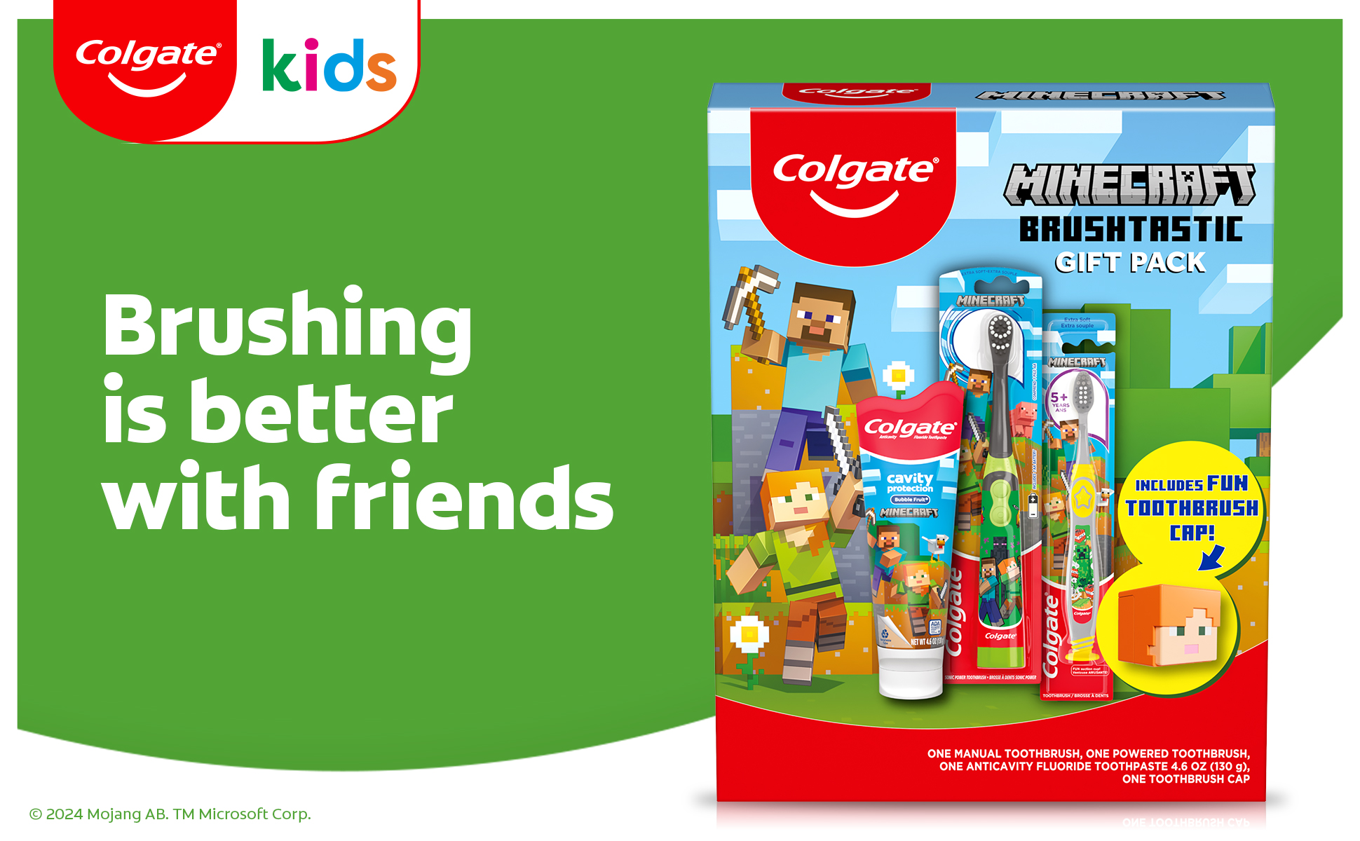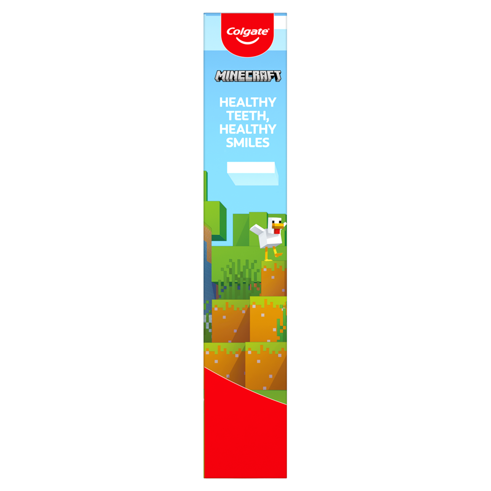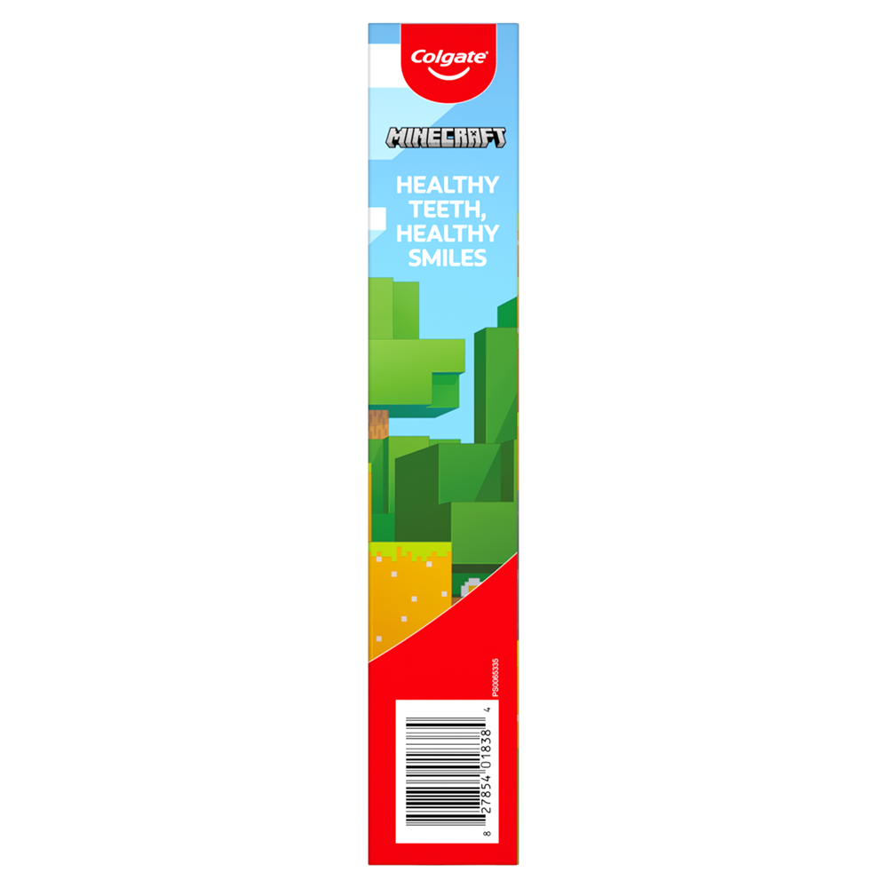 SKU 61045374 Consumer Unit - GTIN 00827854018384 Case - GTIN 10827854018374 Product Category Oral Care Product Sub Category Oral Care SUC Mixed Product Equity (Brand) Colgate Product Sub Brand Oral Care SBR Mixed Product Title Colgate Kids Minecraft Toothbrush and Kids Toothpaste Gift Set Product Description Make brushing brushtastic with this fun Colgate Minecraft gift set. This Minecraft-themed Colgate Kids toothbrush set encourages good brushing habits and comes with a battery powered Minecraft toothbrush, a manual kids toothbrush, and a kids fluoride toothpaste with a fun Minecraft-themed cap. Make teeth brushing fun for kids using this Minecraft kids gift set. This Colgate Kids toothbrush and kids toothpaste set includes an ADA-accepted fluoride toothpaste to protect against cavities, fortify weak spots on enamel, and reduce plaque buildup with regular brushing. Plus, its mild Bubble Fruit flavor tastes yummy while it works to freshen breath. Both Colgate Kids Toothbrushes in this gift set have extra soft bristles that are gentle on delicate gums and growing teeth. The Colgate Kids battery toothbrush has a vibrating brush head to help kids brush well, while the manual toothbrush has a rounded handle and comfortable grip for small hands. At Colgate, we’re making kids toothbrushes fun because we know the power of a healthy smile. Our children’s oral health initiative, Bright Smiles, Bright Futures, has impacted the lives of more than a billion children by providing free oral health education and dental care in over 80 countries. As the world leader in oral care, Colgate is committed to improving children's oral health around the world. eCommerce Copy- Long Description ids Brushing Made Fun Make teeth brushing fun for kids using this Minecraft kids gift set. This Colgate Kids toothbrush and kids toothpaste sets include an ADA-accepted fluoride toothpaste to protect against cavities, fortify weak spots on enamel, and reduce plaque buildup with regular brushing. Plus, its mild Bubble Fruit flavor tastes yummy while it works to freshen breath. Both Colgate Kids Toothbrushes in this gift set have extra soft bristles that are gentle on delicate gums and growing teeth. The Colgate Kids battery toothbrush has a vibrating brush head to help kids brush well, while the manual toothbrush has a rounded handle and comfortable grip for small hands. Healthy Teeth, Healthy Smiles At Colgate, we’re making kids toothbrushes fun because we know the power of a healthy smile. Our children’s oral health initiative, Bright Smiles, Bright Futures, has impacted the lives of more than a billion children by providing free oral health education and dental care in over 80 countries. As the world leader in oral care, Colgate is committed to improving children's oral health around the world. Bullet 1 The Minecraft gift set includes one (1) kids manual toothbrush, one (1) kids toothpaste and one (1) kids battery toothbrush with AA battery Bullet 2 The kids battery powered Minecraft toothbrush and manual toothbrush use extra soft bristles to help remove plaque buildup and cavity-causing bacteria Bullet 3 The Colgate Kids Battery Powered Toothbrush has a vibrating brush head while the manual toothbrush has a rounded handle and comfortable grip for little hands Bullet 4 A mild Bubble Fruit flavor in the kids fluoride toothpaste tastes yummy and works to freshen breath Bullet 5 This Colgate Kids cavity protection toothpaste with fluoride is ADA-accepted and uses a fluoride formula that helps fight cavities Active Ingredients Sodium Fluoride 0.24 % (0.15% w/v fluoride ion) Walmart RPC 670258519 Walmart URL (Computed) https://www.walmart.com/ip/a/670258519