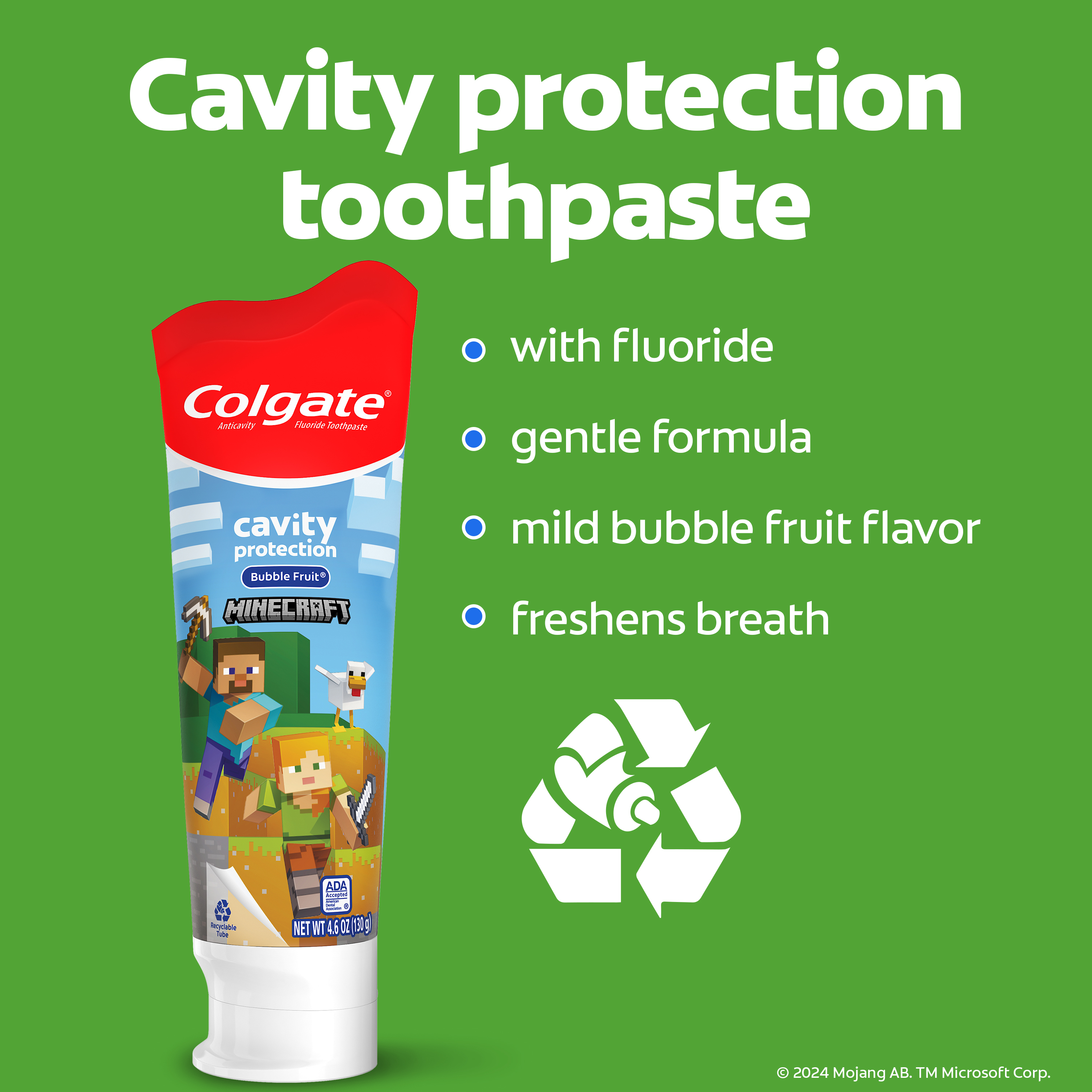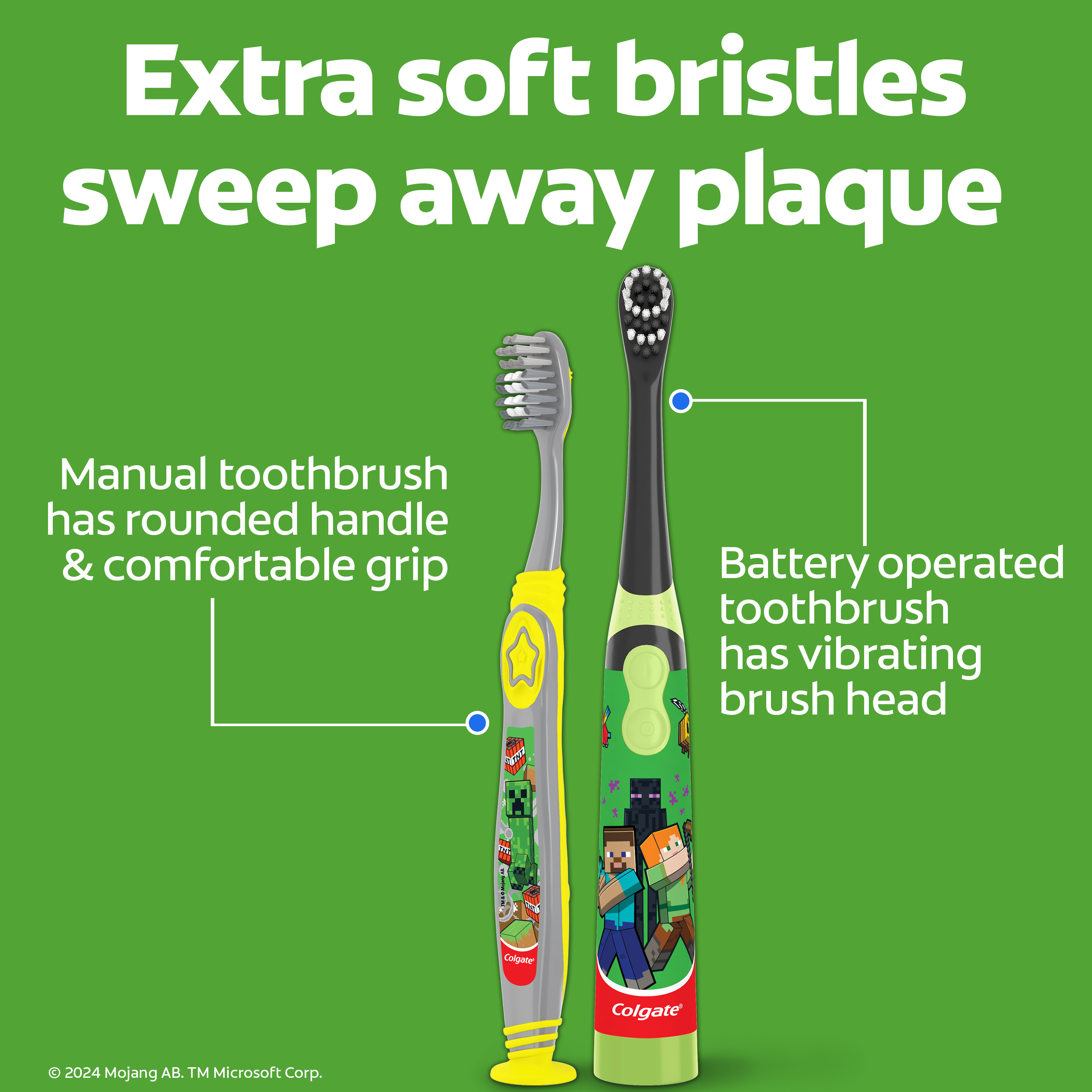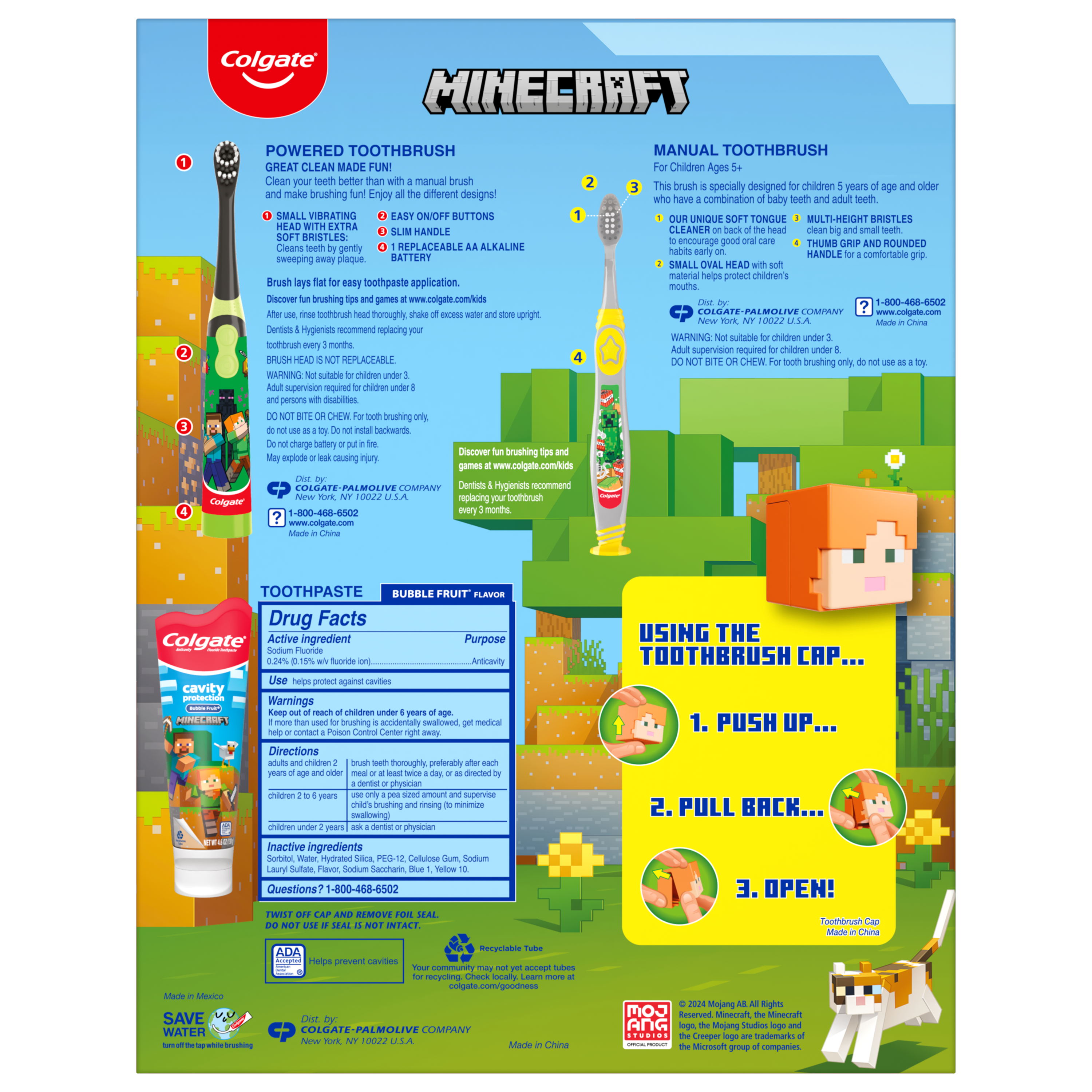 SKU 61045374 Consumer Unit - GTIN 00827854018384 Case - GTIN 10827854018374 Product Category Oral Care Product Sub Category Oral Care SUC Mixed Product Equity (Brand) Colgate Product Sub Brand Oral Care SBR Mixed Product Title Colgate Kids Minecraft Toothbrush and Kids Toothpaste Gift Set Product Description Make brushing brushtastic with this fun Colgate Minecraft gift set. This Minecraft-themed Colgate Kids toothbrush set encourages good brushing habits and comes with a battery powered Minecraft toothbrush, a manual kids toothbrush, and a kids fluoride toothpaste with a fun Minecraft-themed cap. Make teeth brushing fun for kids using this Minecraft kids gift set. This Colgate Kids toothbrush and kids toothpaste set includes an ADA-accepted fluoride toothpaste to protect against cavities, fortify weak spots on enamel, and reduce plaque buildup with regular brushing. Plus, its mild Bubble Fruit flavor tastes yummy while it works to freshen breath. Both Colgate Kids Toothbrushes in this gift set have extra soft bristles that are gentle on delicate gums and growing teeth. The Colgate Kids battery toothbrush has a vibrating brush head to help kids brush well, while the manual toothbrush has a rounded handle and comfortable grip for small hands. At Colgate, we’re making kids toothbrushes fun because we know the power of a healthy smile. Our children’s oral health initiative, Bright Smiles, Bright Futures, has impacted the lives of more than a billion children by providing free oral health education and dental care in over 80 countries. As the world leader in oral care, Colgate is committed to improving children's oral health around the world. eCommerce Copy- Long Description ids Brushing Made Fun Make teeth brushing fun for kids using this Minecraft kids gift set. This Colgate Kids toothbrush and kids toothpaste sets include an ADA-accepted fluoride toothpaste to protect against cavities, fortify weak spots on enamel, and reduce plaque buildup with regular brushing. Plus, its mild Bubble Fruit flavor tastes yummy while it works to freshen breath. Both Colgate Kids Toothbrushes in this gift set have extra soft bristles that are gentle on delicate gums and growing teeth. The Colgate Kids battery toothbrush has a vibrating brush head to help kids brush well, while the manual toothbrush has a rounded handle and comfortable grip for small hands. Healthy Teeth, Healthy Smiles At Colgate, we’re making kids toothbrushes fun because we know the power of a healthy smile. Our children’s oral health initiative, Bright Smiles, Bright Futures, has impacted the lives of more than a billion children by providing free oral health education and dental care in over 80 countries. As the world leader in oral care, Colgate is committed to improving children's oral health around the world. Bullet 1 The Minecraft gift set includes one (1) kids manual toothbrush, one (1) kids toothpaste and one (1) kids battery toothbrush with AA battery Bullet 2 The kids battery powered Minecraft toothbrush and manual toothbrush use extra soft bristles to help remove plaque buildup and cavity-causing bacteria Bullet 3 The Colgate Kids Battery Powered Toothbrush has a vibrating brush head while the manual toothbrush has a rounded handle and comfortable grip for little hands Bullet 4 A mild Bubble Fruit flavor in the kids fluoride toothpaste tastes yummy and works to freshen breath Bullet 5 This Colgate Kids cavity protection toothpaste with fluoride is ADA-accepted and uses a fluoride formula that helps fight cavities Active Ingredients Sodium Fluoride 0.24 % (0.15% w/v fluoride ion) Walmart RPC 670258519 Walmart URL (Computed) https://www.walmart.com/ip/a/670258519