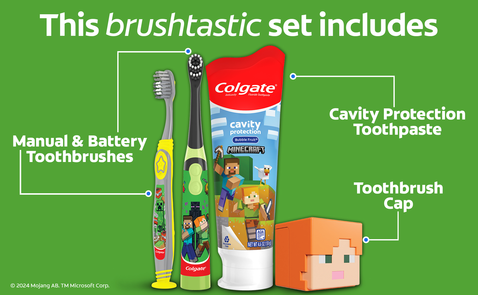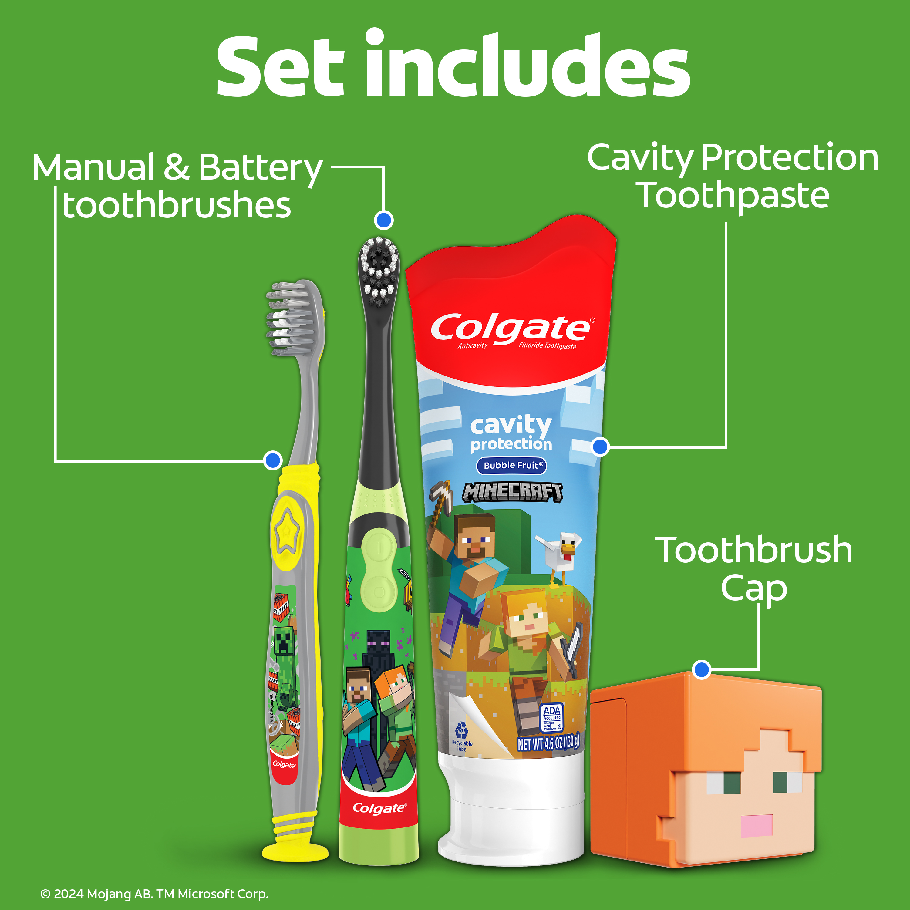 Colgate Kids Toothbrush Set with Toothpaste, Minecraft Gift Set, 1 manual toothbrush, 1 powered toothbrush, 1 toothpaste, and 1 toothbrush cap