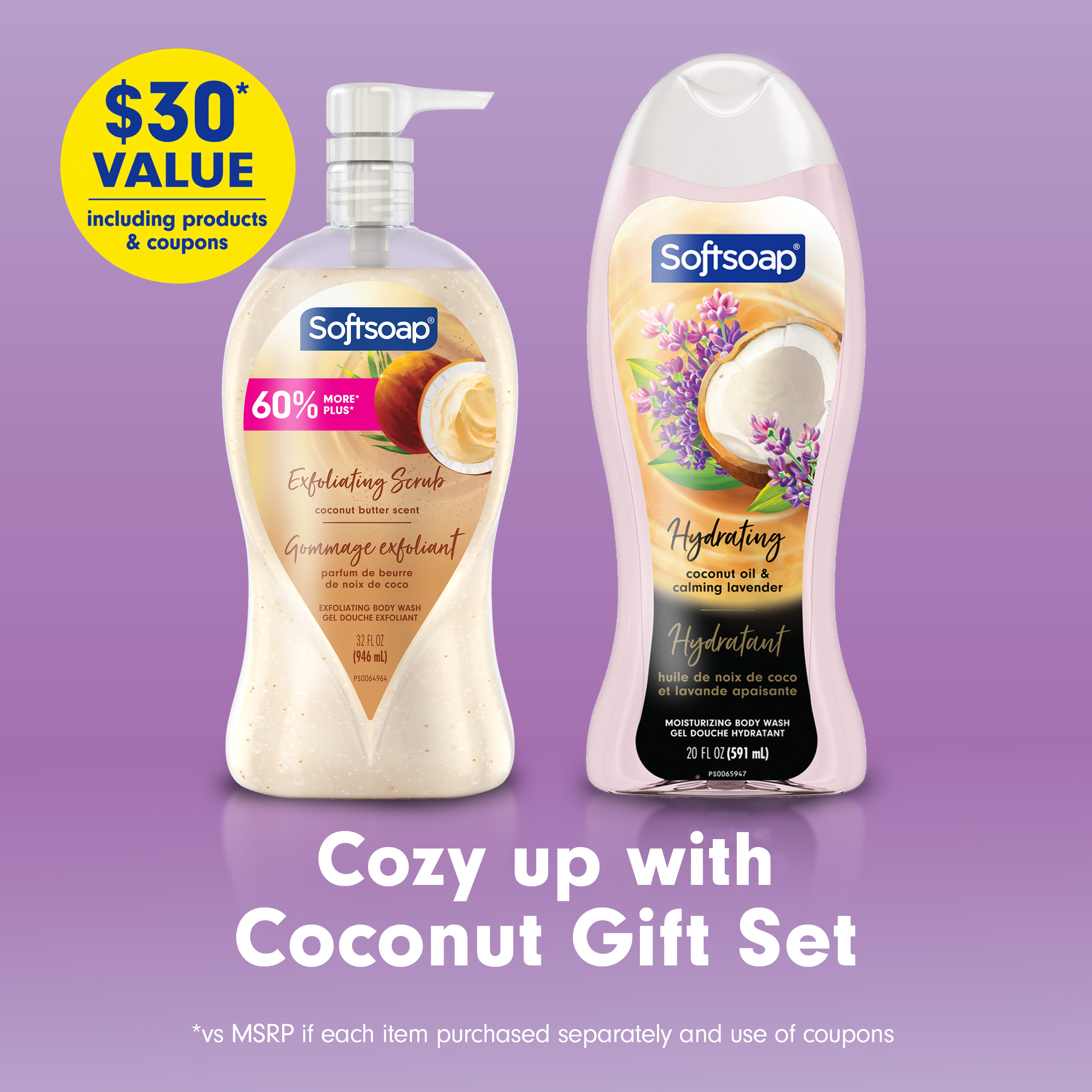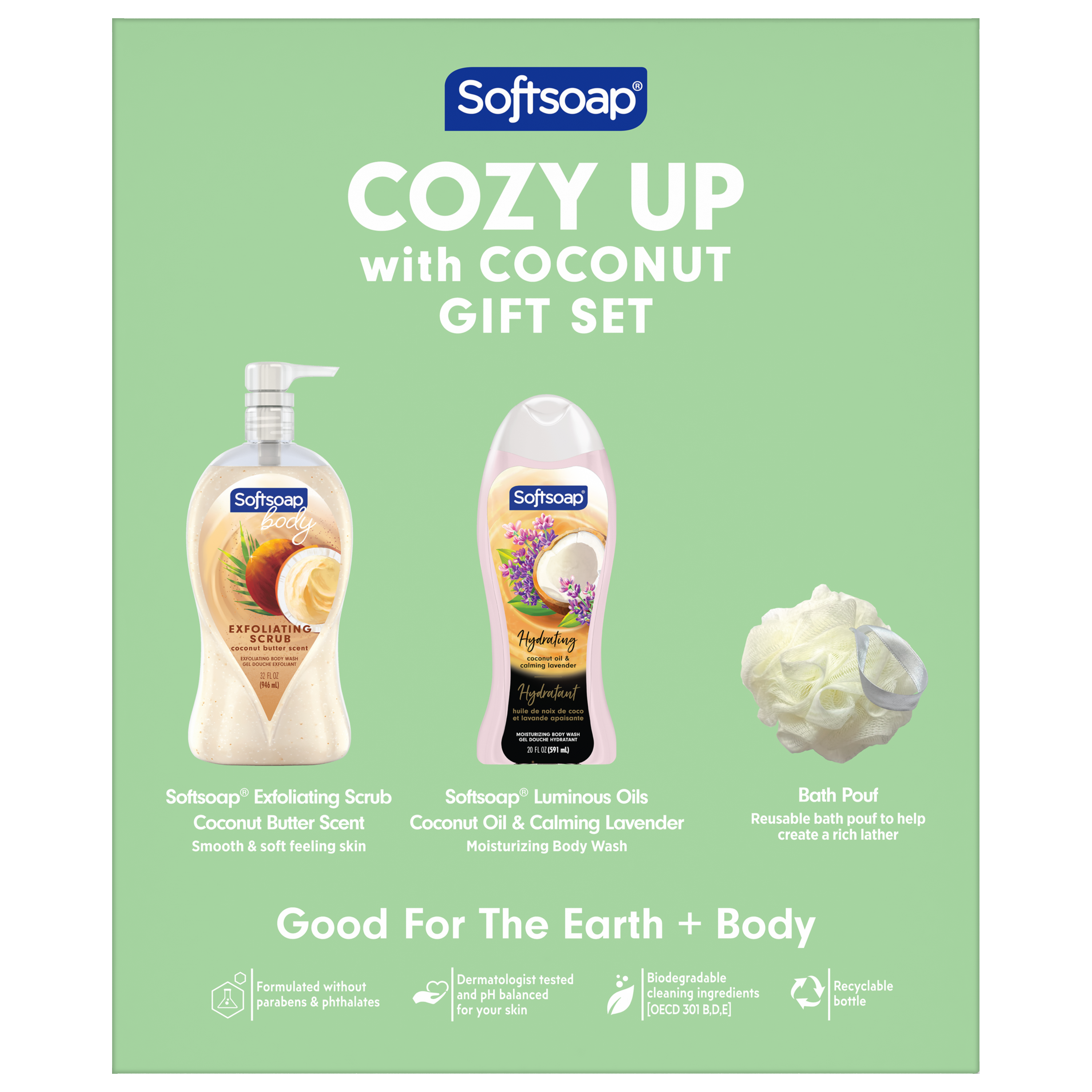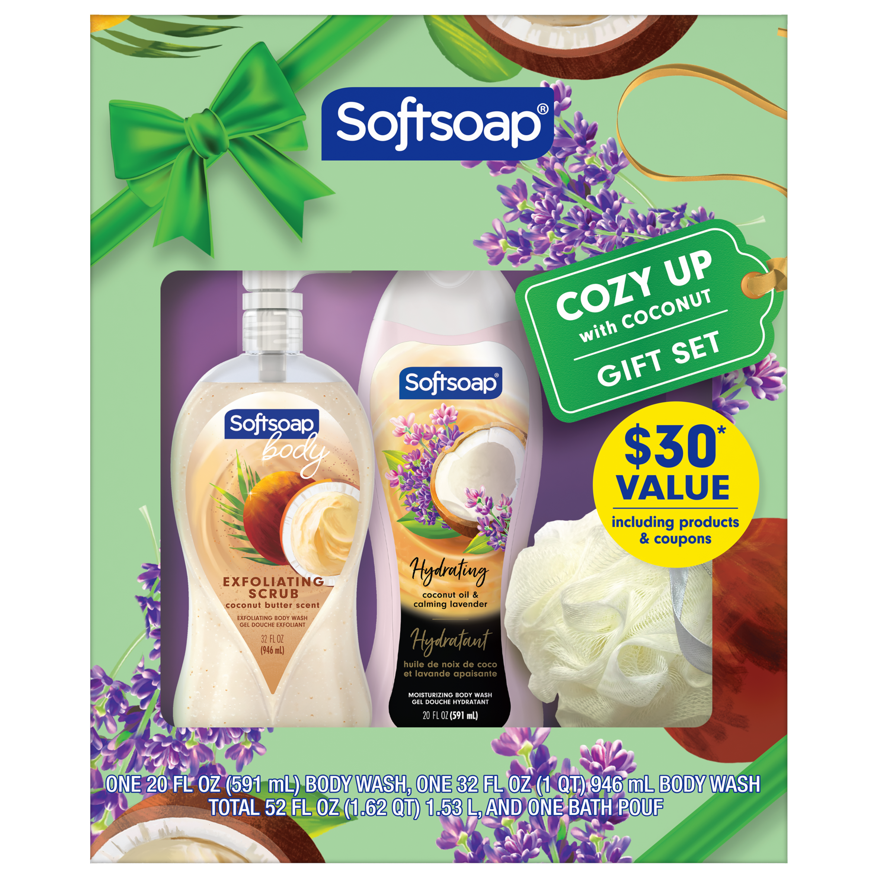| Product Description | Step into a world of indulgence with Softsoap Exfoliating Body Wash, designed to pamper your skin with luxurious ingredients. This gift set includes a Softsoap Coconut Butter Scent Body Wash that has real coconut oil and coconut butter scent. This body wash gently exfoliates and helps remove dry skin for smooth and soft feeling skin. Softsoap Hydrating Coconut Oil and Lavender Body Wash gives you a delightfully moisturizing yet effective clean. This liquid body wash for women is made with real coconut and lavender oils. Our body wash is made with biodegradable cleaning ingredients and formulated without parabens and phthalates. The reusable bath pouf helps create a rich lather, adding an extra touch of luxury to your daily routine. Our gift set is valued at $30, and includes products and coupons (1) for an exceptional shower experience. Celebrate the holiday season with the perfect gift that combines luxury and invigoration and feel the joy of clean with Softsoap liquid body wash!