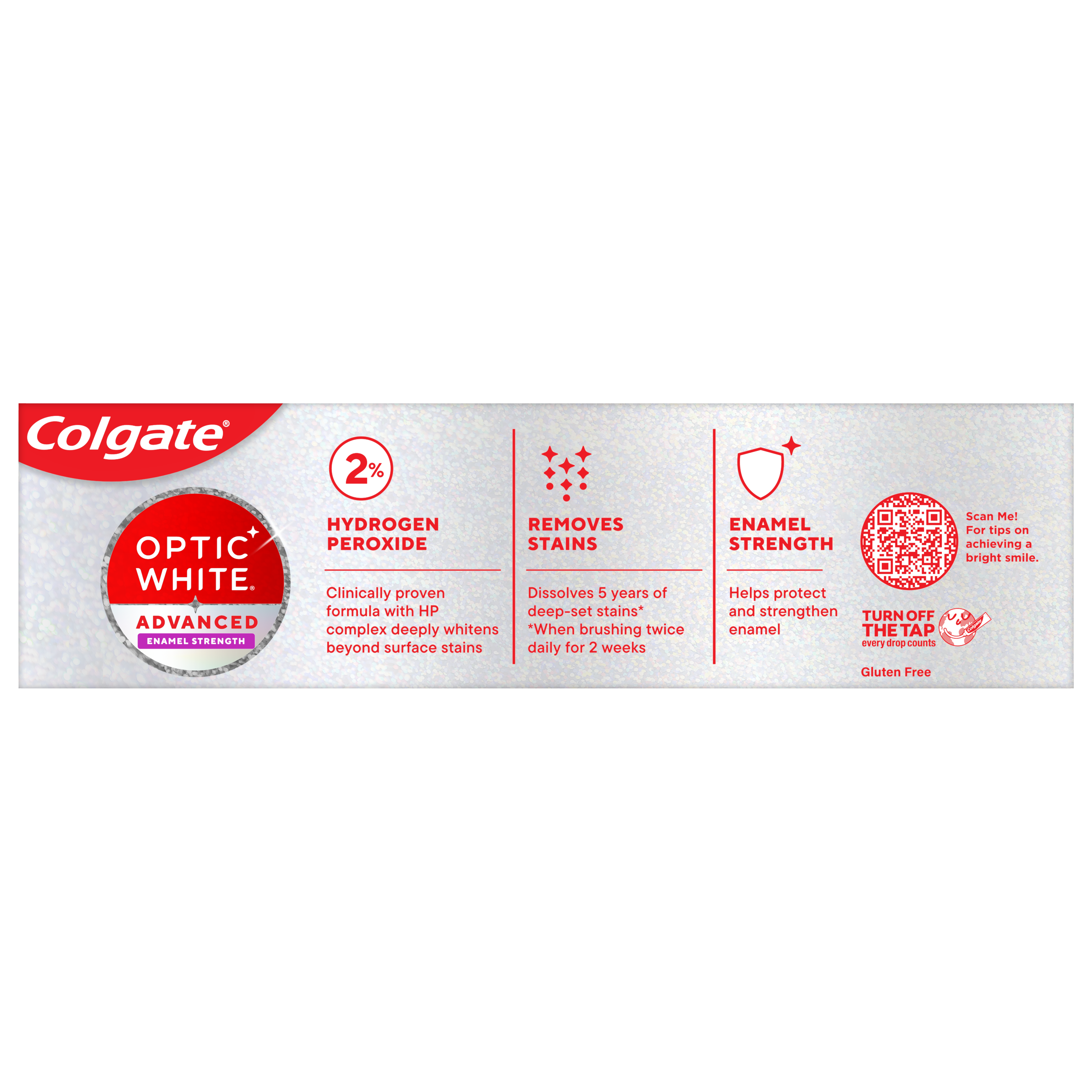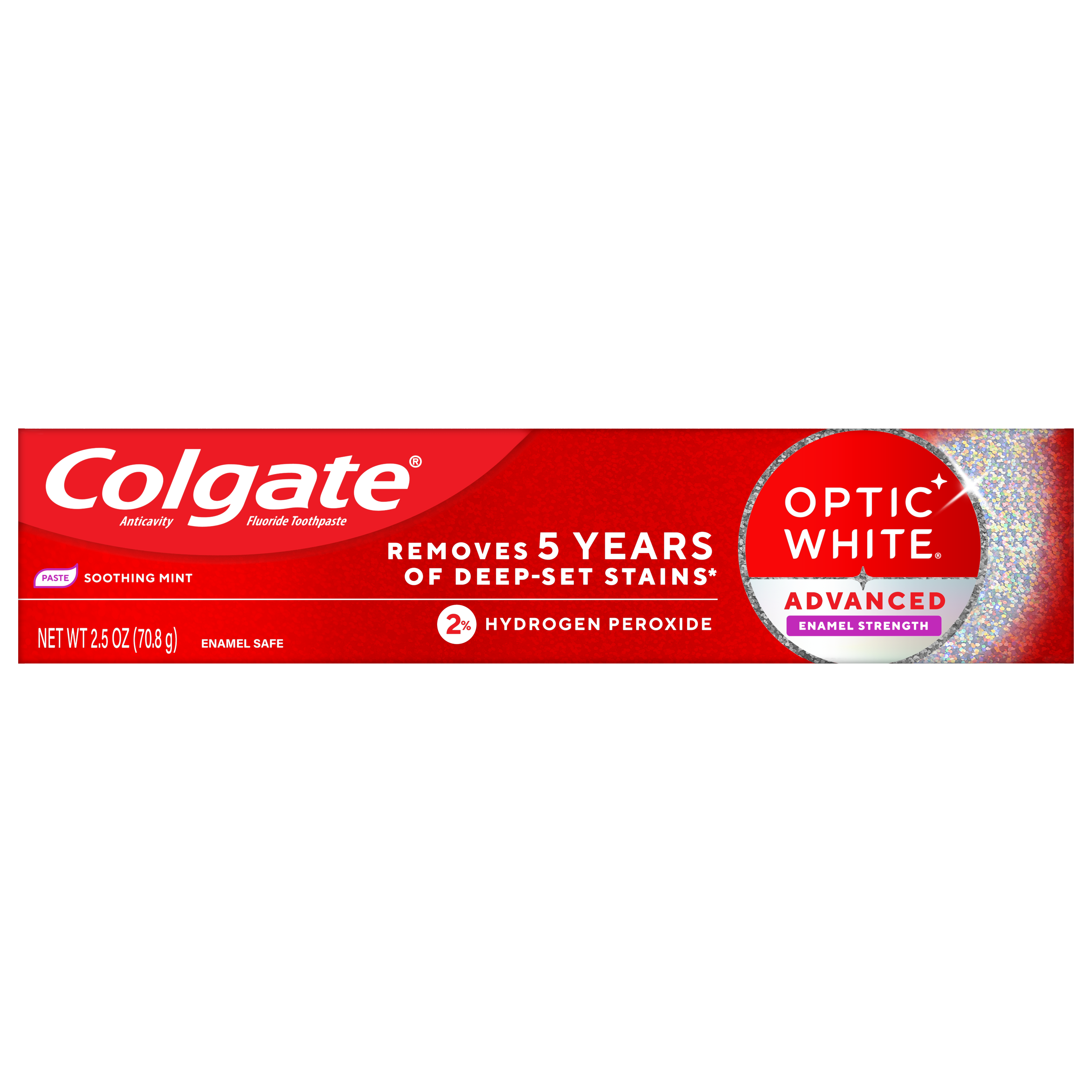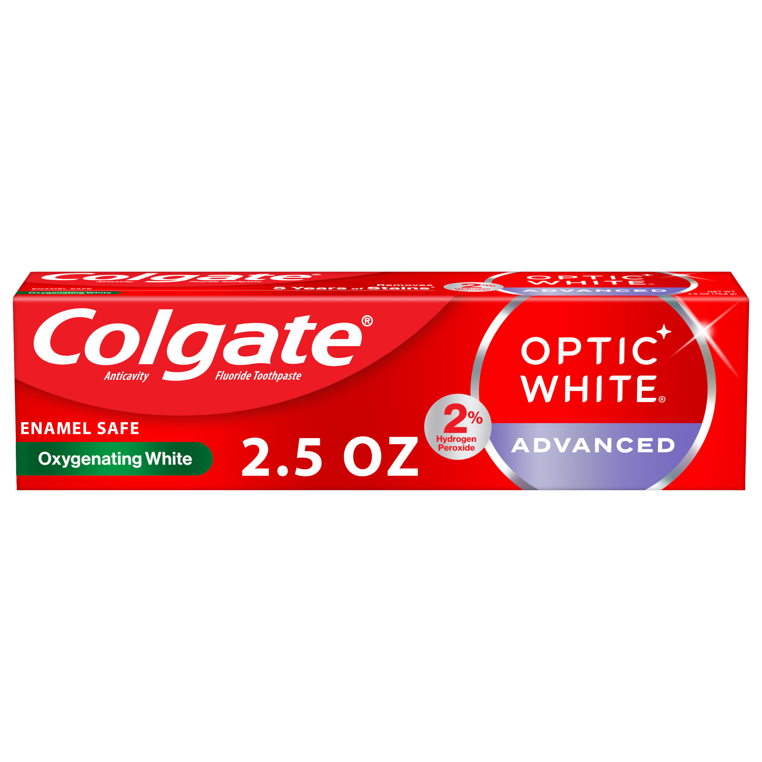 SKU 61045563 Consumer Unit - GTIN 00827854018681 Case - GTIN 10827854018671 Product Category Oral Care Product Sub Category Toothpaste Product Equity (Brand) Colgate Product Sub Brand Colgate Optic White TP Product Title Colgate Optic White Advanced Hydrogen Peroxide Toothpaste, Oxygenating White, 2.5 oz Product Description Remove 5 years of stains* using Colgate Optic White Advanced Hydrogen Peroxide Teeth Whitening Toothpaste. Use this hydrogen peroxide toothpaste with a 2% hydrogen peroxide-based formula to whiten beyond surface stains. Made with a refreshing Oxygenating White flavor, Colgate Optic White Advanced Whitening Toothpaste effectively removes tea, coffee, and wine stains** so you can achieve a bright smile. Colgate Optic White Advanced Hydrogen Peroxide Toothpaste is a patented whitening toothpaste with 2% hydrogen peroxide that removes surface stains and is enamel-safe. This teeth whitening toothpaste for adults is also an anticavity fluoride toothpaste to help prevent cavities. For whitening that works, choose Colgate Optic White Advanced Hydrogen Peroxide Toothpaste. Go beyond surface stains with this Colgate Optic White Advanced Toothpaste. Colgate Optic White Hydrogen Peroxide Toothpaste is a gluten-free mint toothpaste with a patented 2% hydrogen peroxide formula that is enamel-safe. Unlock a radiant smile with Colgate Optic White Advanced Oxygenating White Hydrogen Peroxide Toothpaste. *when brushing twice daily for 2 weeks **as shown in a laboratory study eCommerce Copy- Long Description Colgate Optic White Advanced Hydrogen Peroxide Toothpaste, Oxygenating White, 2.5 Oz. Remove 5 years of stains* using Colgate Optic White Advanced Hydrogen Peroxide Teeth Whitening Toothpaste. Use this hydrogen peroxide toothpaste with a 2% hydrogen peroxide-based formula to whiten beyond surface stains. Made with a cool mint flavor, Colgate Optic White Advanced Whitening Toothpaste effectively removes tea, coffee, and wine stains** so you can achieve a bright smile. Whitening That Works Colgate Optic White Advanced Hydrogen Peroxide Toothpaste is a patented whitening toothpaste with 2% hydrogen peroxide that removes surface stains and is enamel-safe. This teeth whitening toothpaste for adults is also an anticavity fluoride toothpaste to help prevent cavities. For whitening that works, choose Colgate Optic White Advanced Hydrogen Peroxide Toothpaste. Gluten Free and Enamel-Safe Go beyond surface stains with Colgate Optic White Advanced Toothpaste. Colgate Optic White Hydrogen Peroxide Toothpaste is a gluten free mint toothpaste with a patented 2% hydrogen peroxide formula that is enamel-safe. Unlock a radiant smile with Colgate Optic White Advanced Oxygenating White Hydrogen Peroxide Toothpaste. *when brushing twice daily for 2 weeks **as shown in a laboratory study Bullet 1 Includes one (1) 2.5 oz tube of Colgate Optic White Advanced Oxygenating White Hydrogen Peroxide Toothpaste, Teeth Whitening Toothpaste Bullet 2 Remove 5 years of stains* with Colgate Optic White Advanced Teeth Whitening Toothpaste (*when brushing twice daily for 2 weeks) Bullet 3 This 2% hydrogen peroxide toothpaste uses a patented whitening formula and comes in an Oxygenating White mint toothpaste flavor Bullet 4 Enamel-safe and effectively removes tea, coffee, and wine stains** with the 2% hydrogen peroxide formula (**as shown in a laboratory study) Bullet 5 Colgate Optic White Advanced Hydrogen Peroxide Toothpaste is an anticavity toothpaste made with fluoride to help fight cavities Bullet 6 This whitening stain removal toothpaste is gluten-free and enamel-safe for daily use Bullet 8 For whitening that works, choose the Colgate Optic White Advanced Icy Fresh Hydrogen Peroxide Toothpaste Active Ingredients Sodium Monofluorophosphate 1.14% (0.19% w/v fluoride ion)