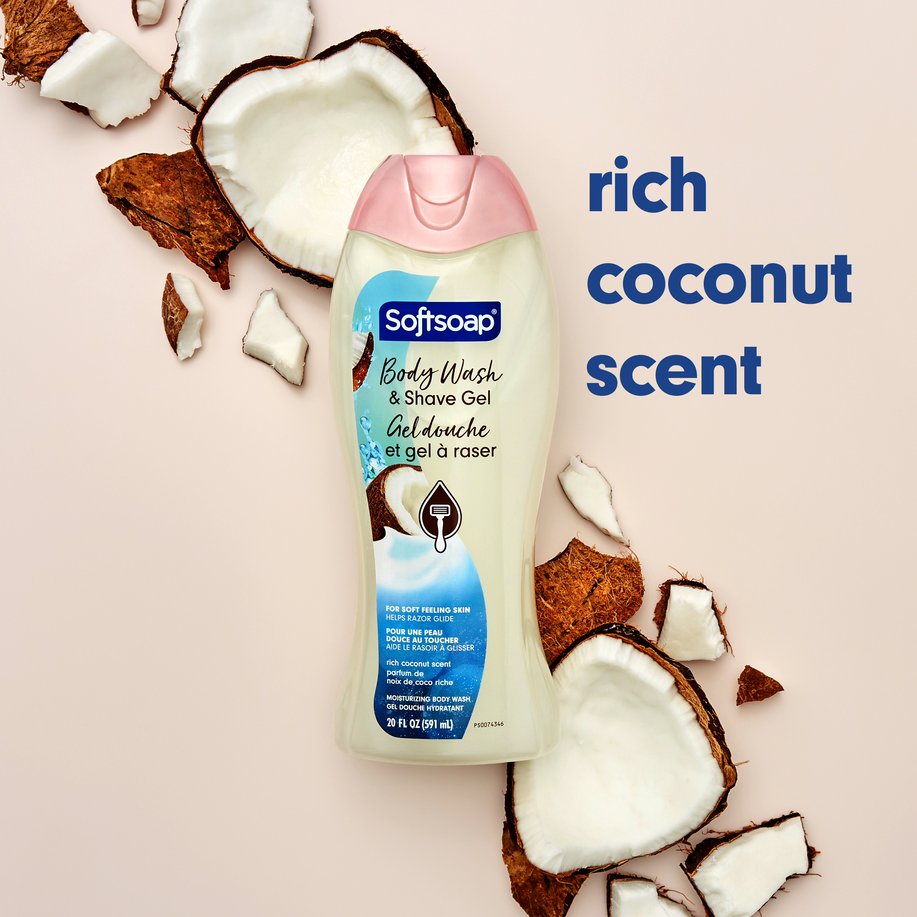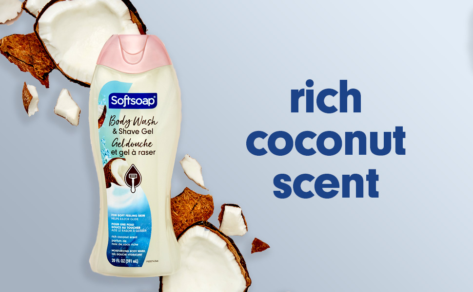 SKU 61046010 Consumer Unit - GTIN 00827854019213 Case - GTIN 10827854019203 Product Category Personal Care Product Sub Category Body Wash Product Equity (Brand) Softsoap Product Sub Brand Softsoap BW Product Title Softsoap Moisturizing Body Wash and Shave Gel, Rich Coconut Scent, 20 fl oz Bottle Product Description Indulge in the tropical aroma of coconuts as it envelops your senses with Softsoap Moisturizing Body Wash and Shave Gel. This white colored body wash doubles as a shave gel, simplifying your shower routine. Formulated to moisturize for softer feeling skin, it also helps your razor glide effortlessly, letting you shave with ease. This body wash for women is pH balanced. It is free from parabens and phthalates, so you can feel good about your body wash. Experience a moisturizing body wash that nourishes your skin and is designed to provide a comfortable, easy shave every time. Treat yourself to a Rich Coconut Scented body wash with a fragrance everyone loves. Wrap yourself in the delightful scent of coconuts while knowing you're using a body wash that's gentle on your skin. With a formula crafted to care for you, this body wash offers a luxurious experience every time you shower. Feel the joy of clean! Bullet 1 One 20 fl oz bottle of Softsoap Moisturizing Body Wash and Shave Gel, Rich Coconut Scent Bullet 2 Dual-benefit body wash and shave gel simplifies your shower routine Bullet 3 Moisturizing formula for softer feeling skin Bullet 4 Shave gel helps razor glide effortlessly for a smoother shave Bullet 5 Experience a moisturizing body wash that nourishes your skin Bullet 6 Designed to provide a comfortable, easy shave every time Bullet 7 Treat yourself to a Rich Coconut Scented body wash with a fragrance everyone loves Amazon RPC B0DHWJCN8N AMZ URL https://www.amazon.com/dp/B0DHWJCN8N Walmart RPC 12095951415 Walmart URL (Computed) https://www.walmart.com/ip/a/12095951415