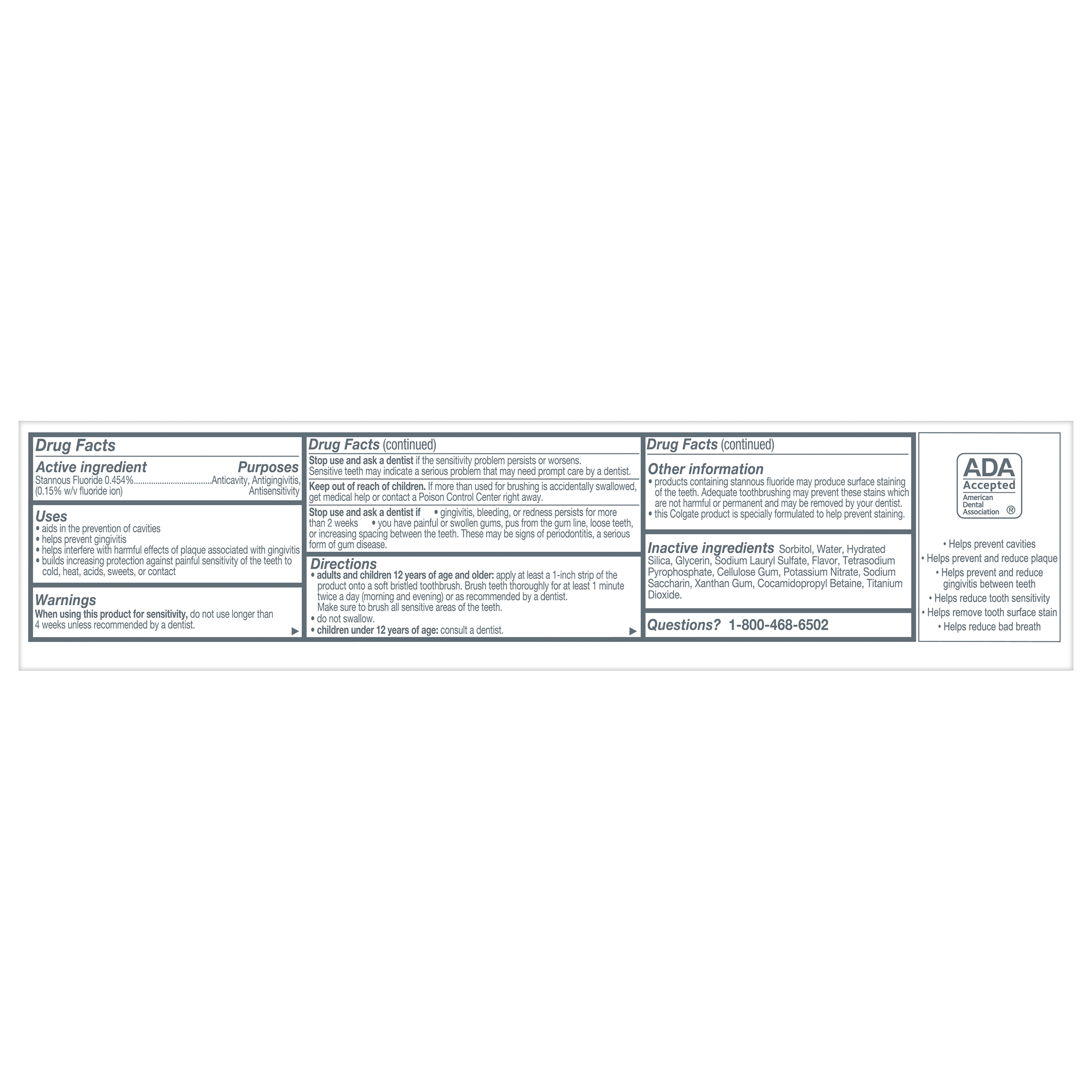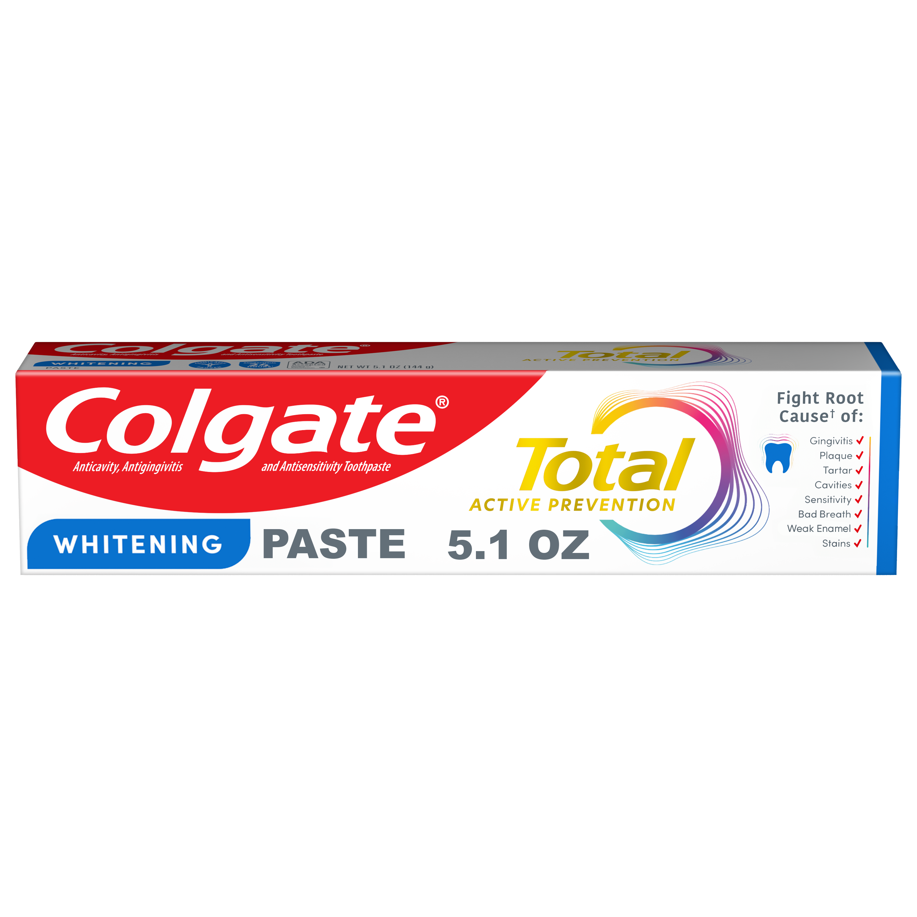 SKU 61046054 Consumer Unit - GTIN 00827854001881 Case - GTIN 10827854001888 Product Category Oral Care Product Sub Category Toothpaste Product Equity (Brand) Colgate Product Sub Brand Colgate Total TP Product Title Colgate Total Active Prevention Whitening Toothpaste, Mint, 5.1 oz Product Description Help stop oral health problems* before they start with Colgate Total Active Prevention Whitening Toothpaste. This anticavity toothpaste fights bacteria, the root cause of many oral health issues such as gingivitis, plaque, tartar, sensitivity, weak enamel, stains, bad breath, and cavities. In addition, this whitening toothpaste features cutting-edge cooling technology and blends peppermint and spearmint together for an invigorating minty flavor profile. This science-backed fluoride toothpaste uses a unique, clinically-proven stannous fluoride formula to help fight plaque bacteria. Plus, this whitening mint toothpaste helps minimize bad breath and helps remove stains. Colgate Total Active Prevention Whitening Fluoride Toothpaste can help improve your oral health by tackling many oral health issues* before they begin. This Colgate Total anticavity toothpaste offers 24 hours of long-lasting antibacterial protection when brushing twice daily with 4 weeks of continued use. Feel secure knowing that Colgate Total Active Prevention Whitening Toothpaste has your whitening, cavities, gingivitis, and sensitivity prevention needs covered for a healthy and brighter smile. *such as cavities and gingivitis **vs. non-antibacterial fluoride toothpaste with 3 months continued use eCommerce Copy- Long Description Help stop oral health problems* before they start with Colgate Total Active Prevention Whitening Toothpaste. This anticavity toothpaste fights bacteria, the root cause of many oral health issues such as gingivitis, plaque, tartar, sensitivity, weak enamel, stains, bad breath, and cavities. In addition, this whitening toothpaste features cutting-edge cooling technology and blends peppermint and spearmint together for an invigorating minty flavor profile. This science-backed fluoride toothpaste uses a unique, clinically-proven stannous fluoride formula to help fight plaque bacteria. Plus, this whitening mint toothpaste helps minimize bad breath and helps remove stains. Colgate Total Active Prevention Whitening Fluoride Toothpaste can help improve your oral health by tackling many oral health issues* before they begin. This Colgate Total anticavity toothpaste offers 24 hours of long-lasting antibacterial protection when brushing twice daily with 4 weeks of continued use. Feel secure knowing that Colgate Total Active Prevention Whitening Toothpaste has your whitening, cavities, gingivitis, and sensitivity prevention needs covered for a healthy and brighter smile. *such as cavities and gingivitis **vs. non-antibacterial fluoride toothpaste with 3 months continued use Bullet 1 Includes one (1) 5.1 oz tube of Colgate Total Active Prevention Whitening Toothpaste, Mint Bullet 2 Fights bacteria, the root cause of oral health issues like gingivitis, plaque, tartar, sensitivity, weak enamel, stains, bad breath, and cavities Bullet 3 This whitening fluoride toothpaste uses a clinically proven formula to help stop oral health issues before they start* Bullet 4 The refreshing mint toothpaste formula helps freshen breath and removes surface stains Bullet 5 This anticavity toothpaste offers long-lasting 24 hours of antibacterial protection when brushing twice daily with 4 weeks of continued use Bullet 6 For superior performance** against sensitivity, plaque, gingivitis, and tartar, choose Colgate Total Active Prevention Whitening Toothpaste Active Ingredients Active (s): Stannous Fluoride 0.454% (0.15% w/v fluoride ion) Walmart RPC 809336932 Walmart URL (Computed) https://www.walmart.com/ip/a/809336932 Target RPC 13773793 Target URL https://www.target.com/p/a/-/A-13773793 Albertsons RPC 970479001 Albertsons URL https://www.albertsons.com/shop/product-details.970479001.html CVS RPC 194429 Family Dollar RPC 902967