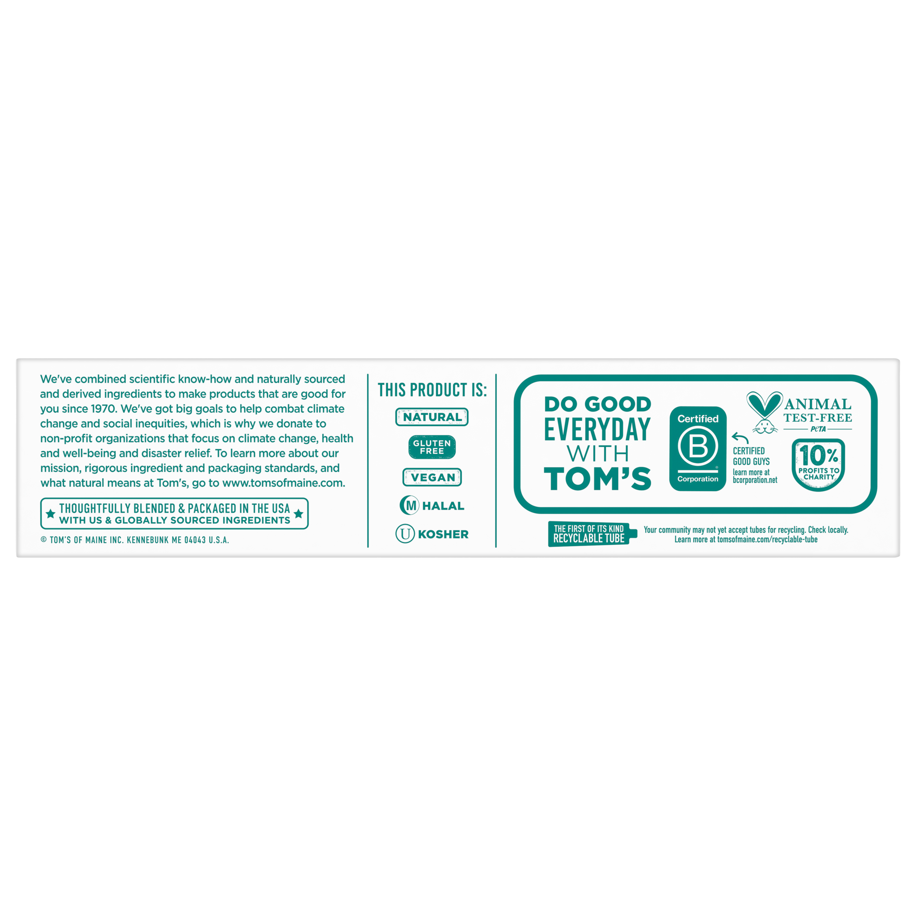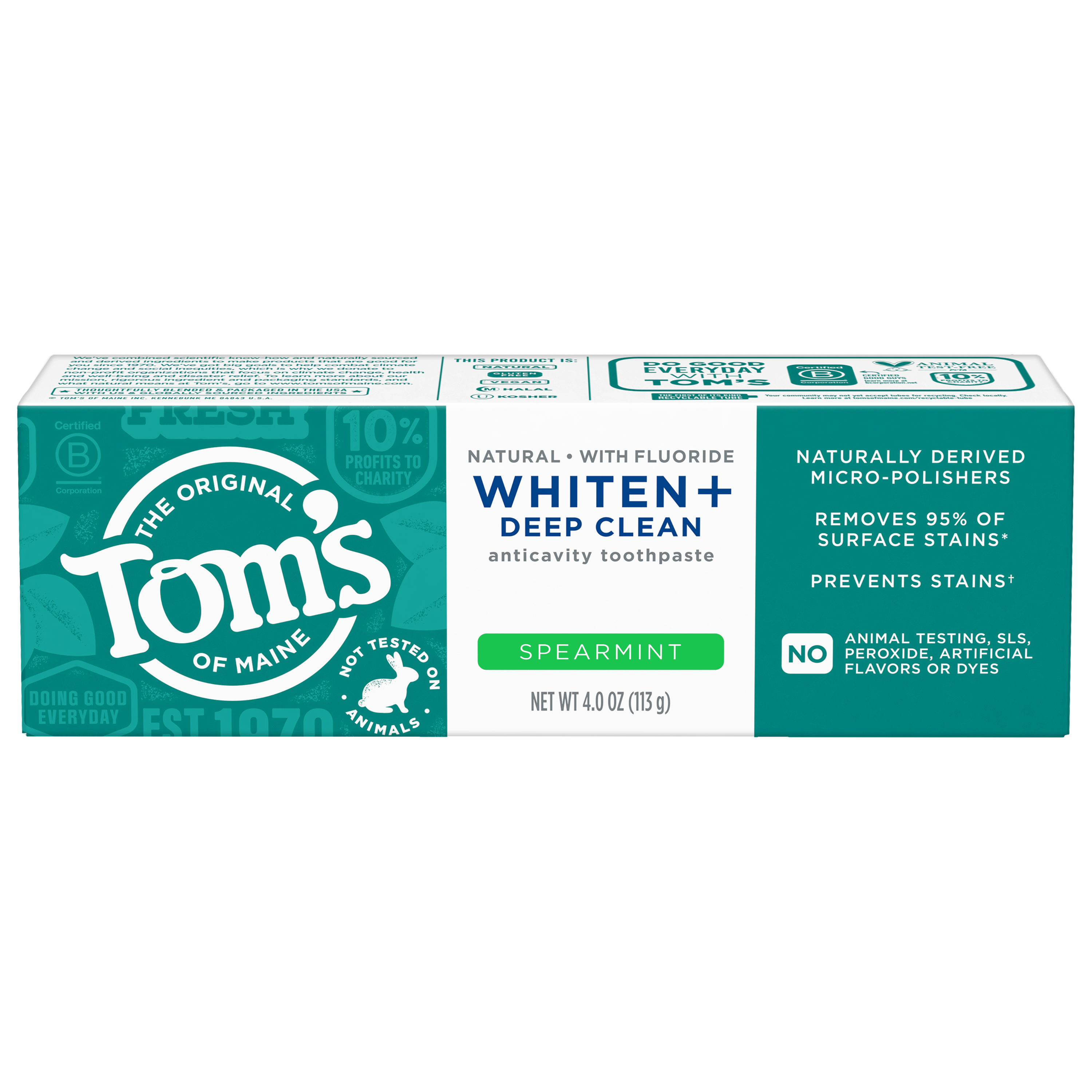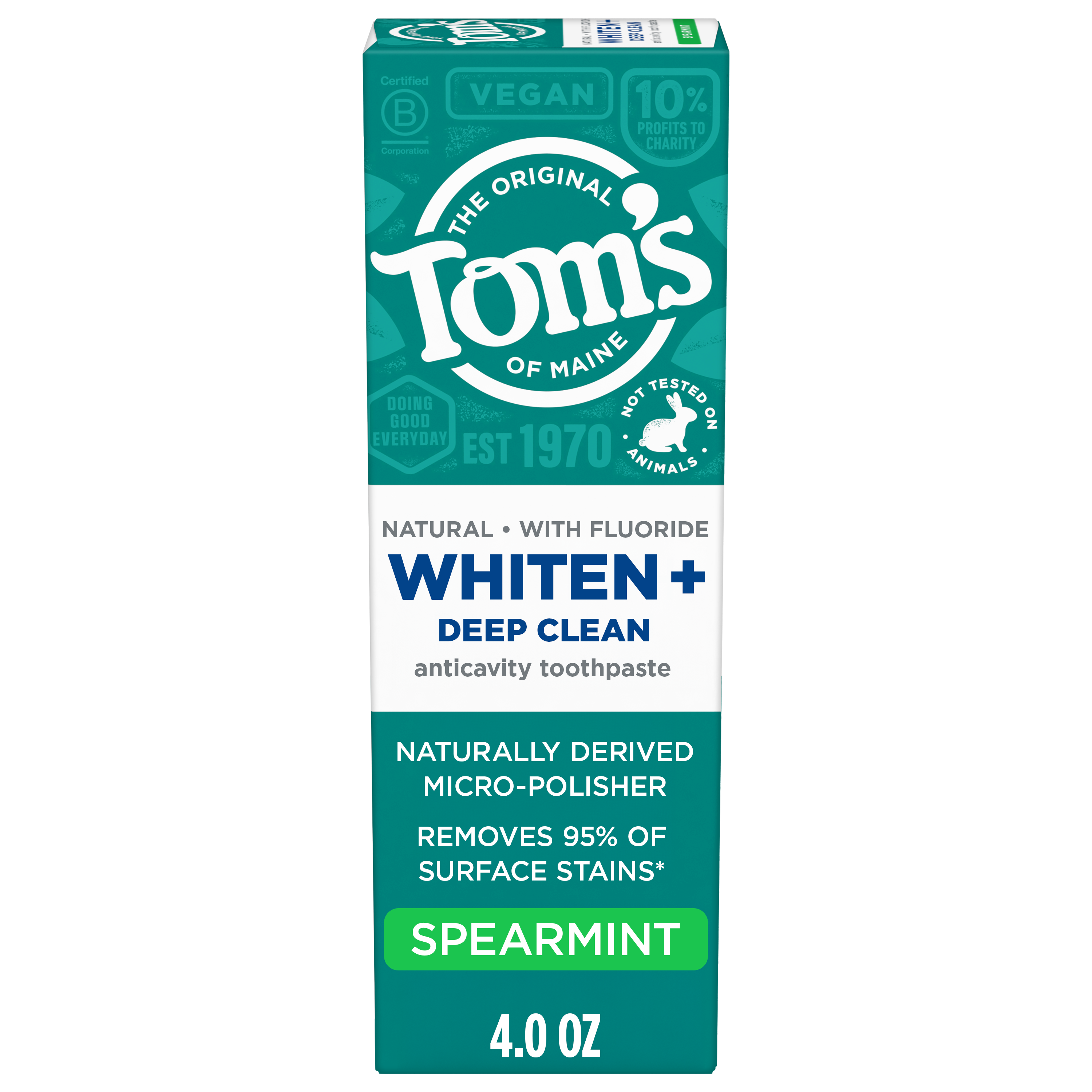 SKU 61046077 Consumer Unit - GTIN 00827854019329 Case - GTIN 10827854019319 Product Category Oral Care Product Sub Category Toothpaste Product Equity (Brand) Tom's of Maine Product Sub Brand Tom's Whiten+ TP Product Title Tom’s of Maine Whiten Plus Deep Clean Whitening Toothpaste, Spearmint, 4.0 oz Product Description Discover a whiter, brighter smile with Tom’s of Maine Whiten Plus Deep Clean Whitening Toothpaste. This natural enamel safe teeth whitening toothpaste is specially formulated to help whiten without causing sensitivity. In addition, Tom’s of Maine Whiten Plus Deep Clean Toothpaste removes up to 95% of surface stains* to help you reveal a brighter smile. Tom’s of Maine Whiten Plus Deep Clean Toothpaste with Fluoride doubles as an anticavity toothpaste and has ingredients that are clinically shown to prevent stains. This spearmint vegan toothpaste is formulated with plant-based cleansers and naturally derived micro-polishers that help gently polish your teeth and prevent new stains from occurring. This whitening fluoride toothpaste contains no peroxide, SLS, artificial flavors, or artificial dyes and is not tested on animals so you can feel good about how you take care of your oral care every time you brush. Choose Tom’s of Maine Whiten Plus Deep Clean Anticavity Toothpaste for an enamel safe natural whiter smile. *after 2 weeks of twice daily use Bullet 1 What's Inside: Includes one (1) 4.0 oz tube of Tom’s of Maine Whiten Plus Deep Clean Natural Whitening Toothpaste with Fluoride, Spearmint Bullet 2 Removes Stains: After 2 weeks of twice daily use, this whitening toothpaste removes up to 95% of surface stains to help with a whiter, brighter smile Bullet 3 Enamel Safe Whitening Toothpaste: This natural whitening toothpaste safely whitens teeth without causing sensitivity Bullet 4 Clinically Proven Whitening: Whitens teeth using plant-based cleansers and naturally derived micro-polishers that remove and prevent new stains Bullet 5 Natural Oral Care: Tom’s of Maine Whiten Plus Deep Clean is not tested on animals and is made with no peroxide, artificial flavors, SLS, or dyes Amazon RPC B0DCMLN91V AMZ URL https://www.amazon.com/dp/B0DCMLN91V