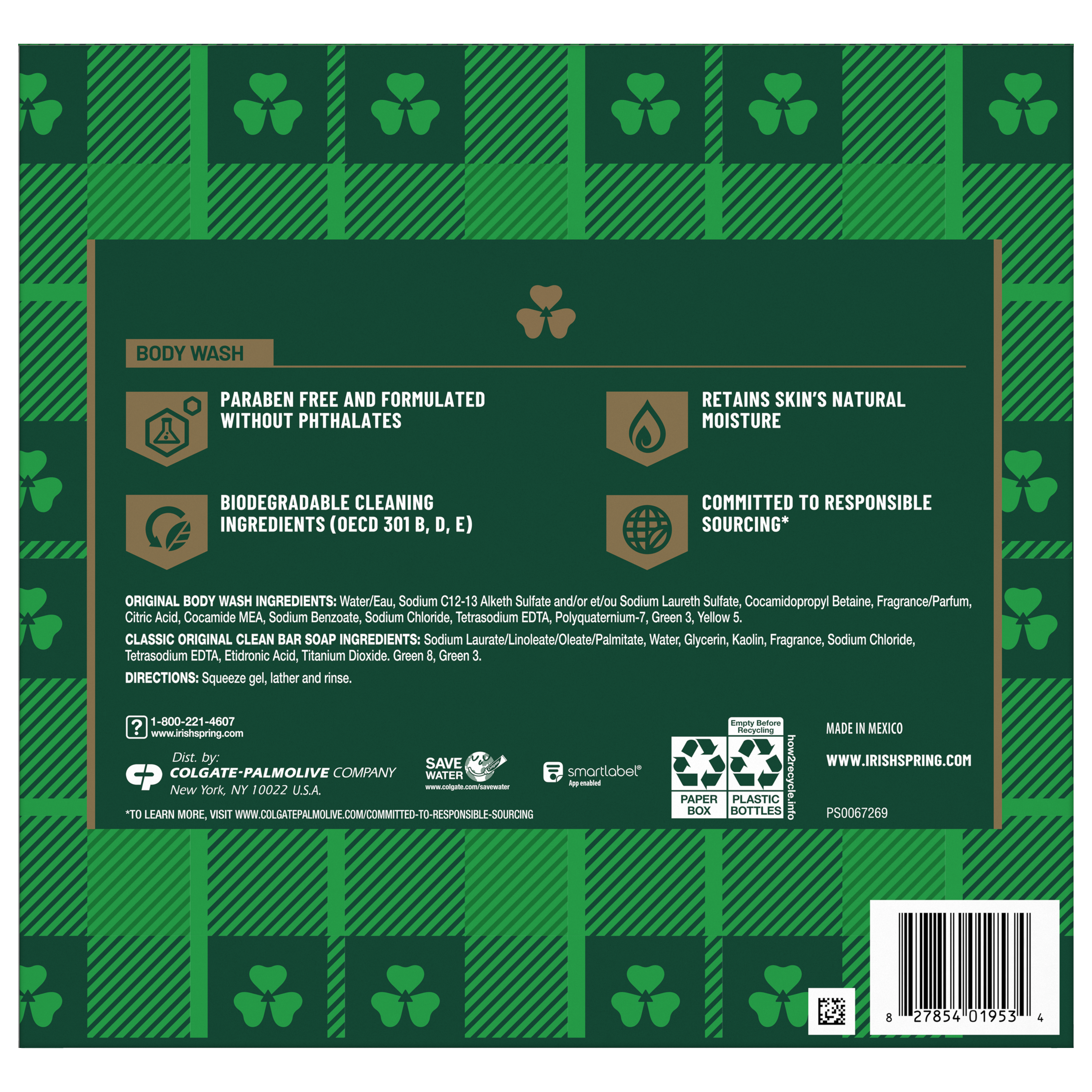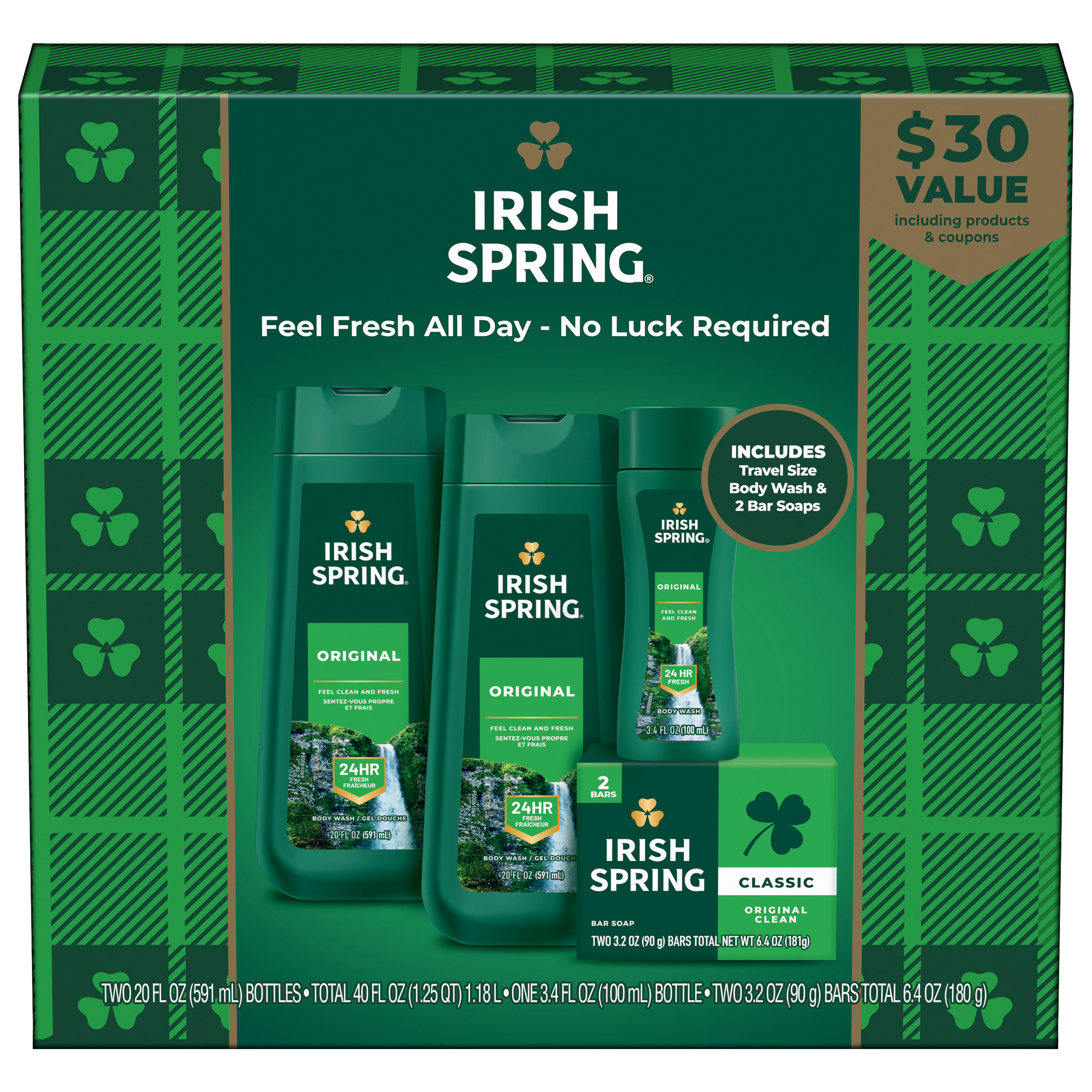 | Bullet 1 | Irish Spring Winter Gift Set: Includes two (2) 20 oz Original body wash, one (1) trial-size body wash and two (2) Classic Original bar soaps |