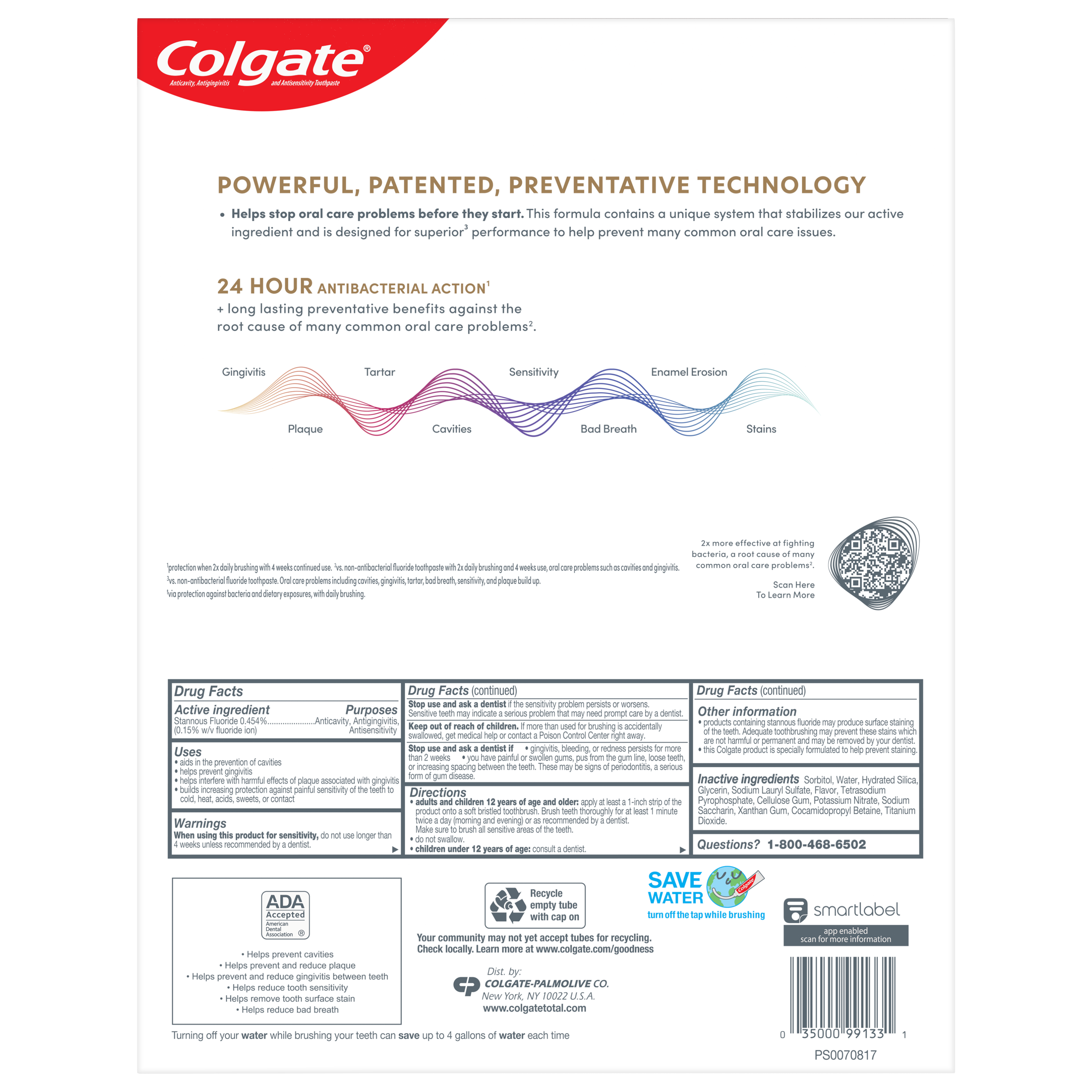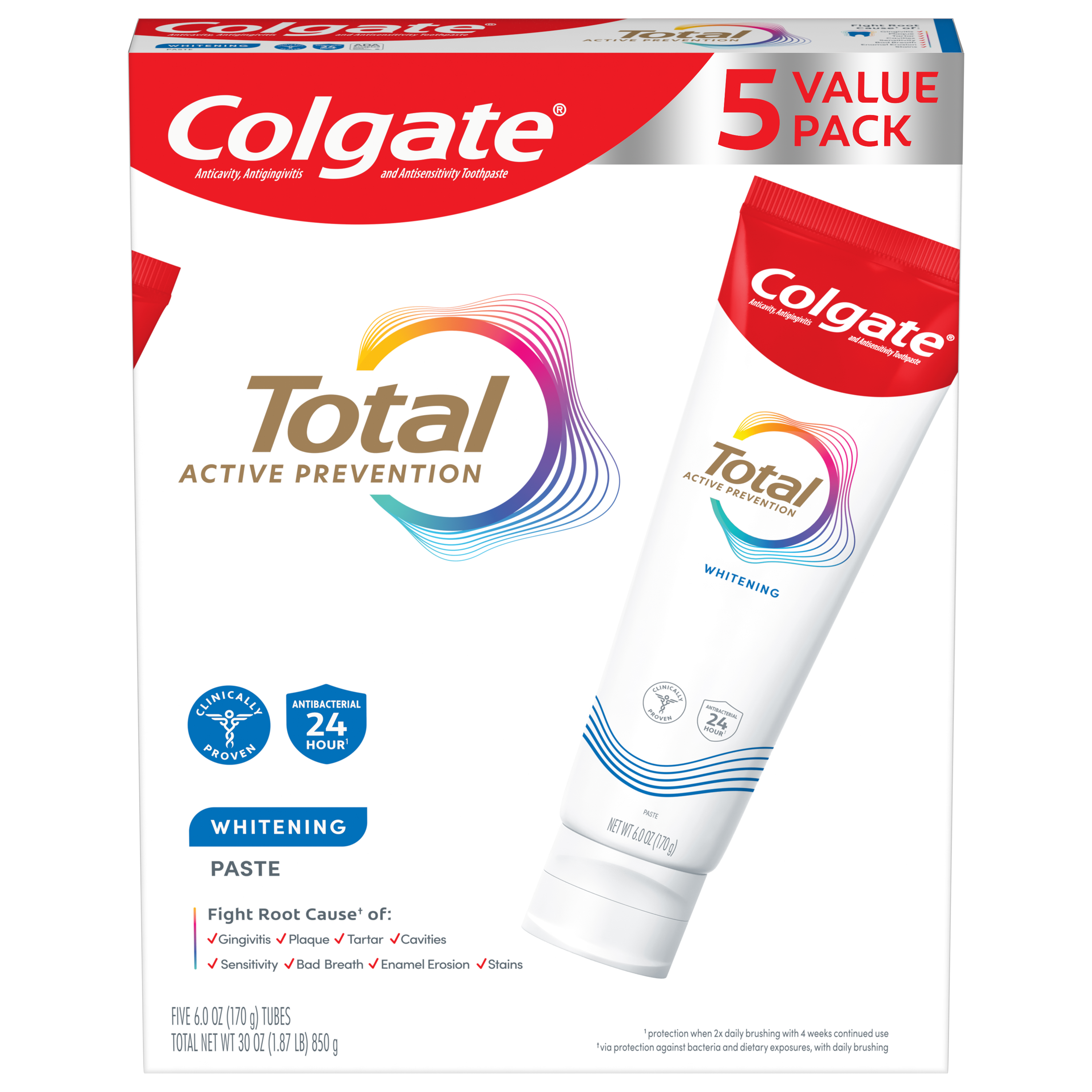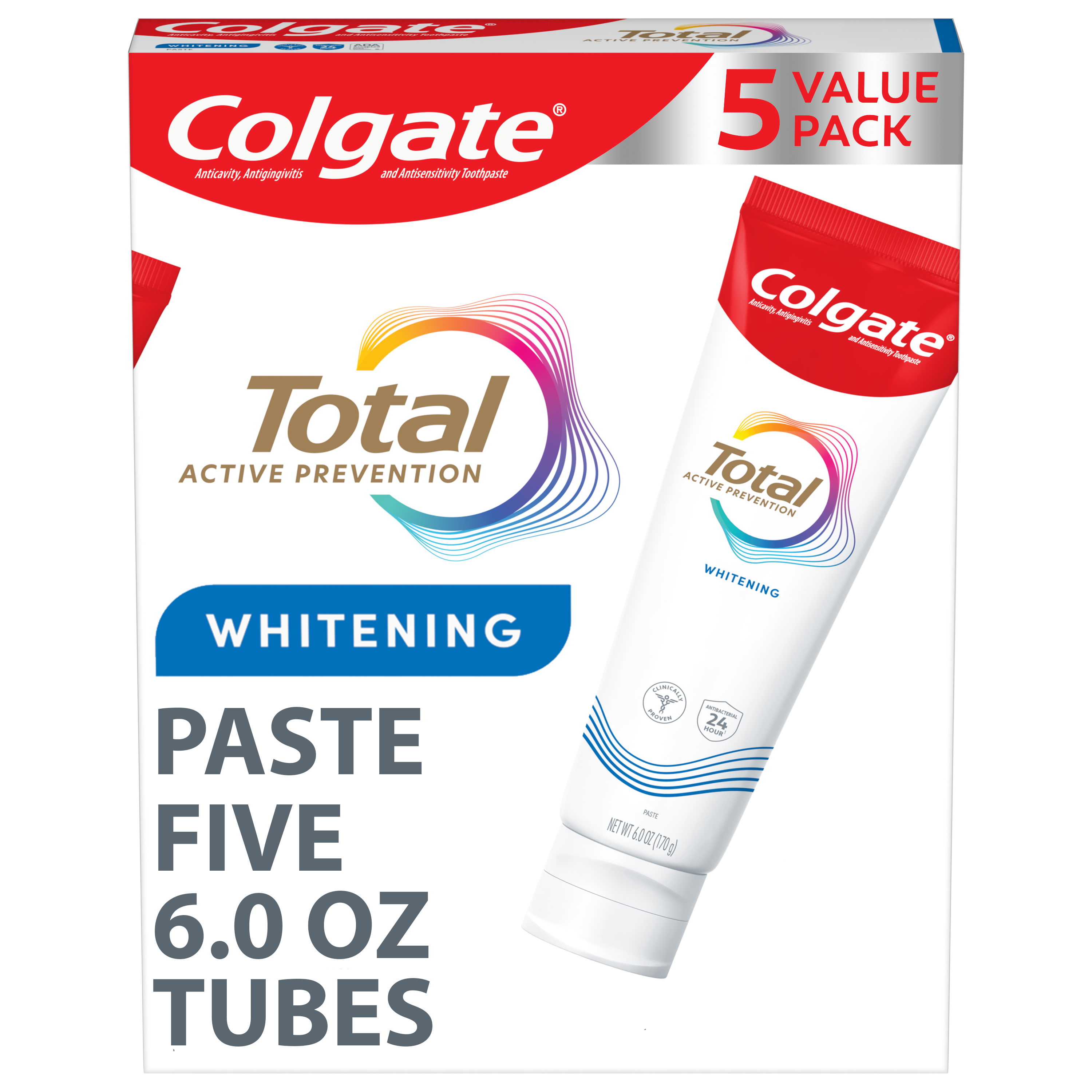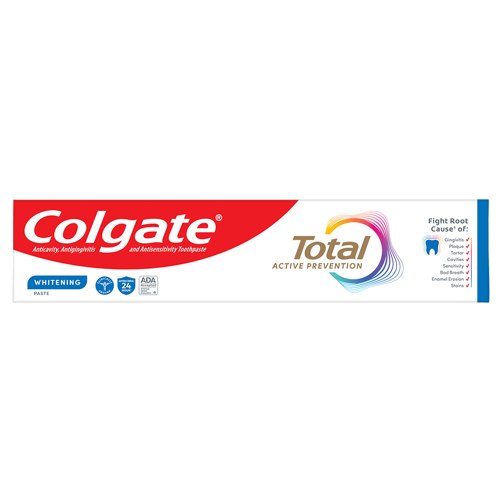 SKU 61046322 Consumer Unit - GTIN 00035000991331 Case - GTIN 10827854019616 Product Category Oral Care Product Sub Category Toothpaste Product Equity (Brand) Colgate Product Sub Brand Colgate Total TP Product Title Colgate Total Whitening Paste Toothpaste 6.0oz 5pk eCommerce Copy- Long Description Caring for the health of your smile and keeping it protected begins before oral health problems start. That’s why Colgate Total Active Prevention Whitening Toothpaste, with its new formula, has been scientifically designed for active prevention and to fight the root causes* of many oral health problems³. And with clinically proven 24h antibacterial¹ protection and a unique² system that stabilises the active prevention ingredient, it’s designed for superior⁴ performance. Just what you need to protect your smile from future oral health problems. And, with its advanced whitening system for 35% less surface stains⁵, it’s also a good whitening toothpaste. Beyond teeth cleaning and teeth whitening, the powerful, patented², preventative technology in Colgate’s Total Active Prevention Whitening Toothpaste helps with 8 oral health problems: 1. Gum problems 2. Plaque 3. Tartar 4. Sensitivity 5. Enamel erosion 6. Surface stains 7. Bad breath 8. Cavities With Colgate Total Active Prevention Whitening Toothpaste you can be confident that your smile is protected and taken care of. *Plaque reduction before problems occur; helps protect enamel against acid erosion. ¹With 2x daily brushing after 4 weeks continued use. ²US patented. ³Bacterial plaque reduction, with 3 months continued use. ⁴Vs. non-antibacterial fluoride toothpaste. ⁵Vs non-whitening toothpaste after 6 weeks twice daily use. _________________________________ For markets where Total Mouthwash and Toothbrush are available: replace the last line of copy with this and add disclaimer By using Colgate Total Active Prevention Whitening Toothpaste together with Colgate Total Mouthwash and a Colgate Total Toothbrush, it’s 15x more effective at fighting a root cause⁶, so you can be confident your smile is protected and taken care of. ⁶Bacterial plaque reduction vs. non-antibacterial fluoride toothpaste and regular brush, with 1 week continued use.