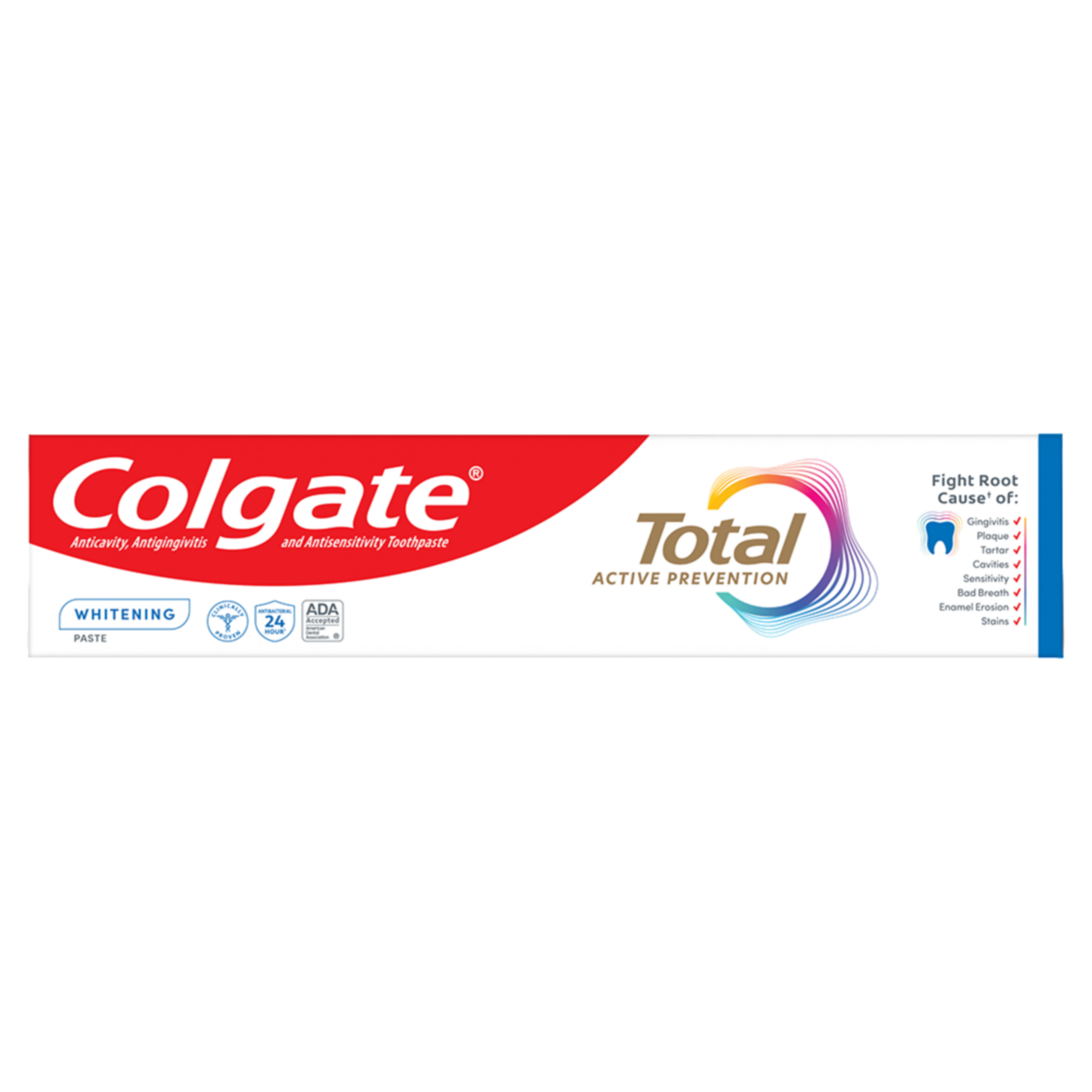 SKU 61046323 Consumer Unit - GTIN 00035000991386 Case - GTIN 10827854019593 Product Category Oral Care Product Sub Category Toothpaste Product Equity (Brand) Colgate Product Sub Brand Colgate Total TP Product Title Colgate Total Active Prevention Whitening Toothpaste, Mint, 5 Pack, 6.0 Oz Product Description Help stop oral health problems* before they start with Colgate Total Active Prevention Whitening Toothpaste. This anticavity toothpaste pack fights bacteria, the root cause of many oral health issues such as gingivitis, tartar, sensitivity, weak enamel, stains, bad breath, and cavities. In addition, this whitening toothpaste features cutting-edge cooling technology and blends peppermint and spearmint together for an invigorating minty flavor profile. This science-backed fluoride toothpaste uses a unique, clinically-proven stannous fluoride formula to help fight plaque bacteria. Plus, this whitening mint toothpaste helps minimize bad breath and helps remove stains. Colgate Total Active Prevention Whitening Fluoride Toothpaste can help improve your oral health by tackling many oral health issues* before they begin. This Colgate Total anticavity toothpaste offers 24 hours of long-lasting antibacterial protection when brushing twice daily with 4 weeks of continued use. Feel secure knowing that Colgate Total Active Prevention Whitening Toothpaste has your whitening, cavities, gingivitis, and sensitivity prevention needs covered for a healthy and brighter smile. *such as cavities and gingivitis **vs. non-antibacterial fluoride toothpaste with 3 months continued use eCommerce Copy- Long Description Caring for the health of your smile and keeping it protected begins before oral health problems start. That’s why Colgate Total Active Prevention Whitening Toothpaste, with its new formula, has been scientifically designed for active prevention and to fight the root causes* of many oral health problems³. And with clinically proven 24h antibacterial¹ protection and a unique² system that stabilises the active prevention ingredient, it’s designed for superior⁴ performance. Just what you need to protect your smile from future oral health problems. And, with its advanced whitening system for 35% less surface stains⁵, it’s also a good whitening toothpaste. Beyond teeth cleaning and teeth whitening, the powerful, patented², preventative technology in Colgate’s Total Active Prevention Whitening Toothpaste helps with 8 oral health problems: 1. Gum problems 2. Plaque 3. Tartar 4. Sensitivity 5. Enamel erosion 6. Surface stains 7. Bad breath 8. Cavities With Colgate Total Active Prevention Whitening Toothpaste you can be confident that your smile is protected and taken care of. *Plaque reduction before problems occur; helps protect enamel against acid erosion. ¹With 2x daily brushing after 4 weeks continued use. ²US patented. ³Bacterial plaque reduction, with 3 months continued use. ⁴Vs. non-antibacterial fluoride toothpaste. ⁵Vs non-whitening toothpaste after 6 weeks twice daily use. _________________________________ For markets where Total Mouthwash and Toothbrush are available: replace the last line of copy with this and add disclaimer By using Colgate Total Active Prevention Whitening Toothpaste together with Colgate Total Mouthwash and a Colgate Total Toothbrush, it’s 15x more effective at fighting a root cause⁶, so you can be confident your smile is protected and taken care of. ⁶Bacterial plaque reduction vs. non-antibacterial fluoride toothpaste and regular brush, with 1 week continued use. Bullet 1 Includes five (5) 6.0 oz tubes of Colgate Total Active Prevention Whitening Toothpaste Bullet 2 Fights bacteria, the root cause of oral health issues like gingivitis, tartar, sensitivity, weak enamel, bad breath, and cavities Bullet 3 This whitening fluoride toothpaste uses a clinically proven formula to help stop oral health issues before they start* Bullet 4 The refreshing mint toothpaste formula helps freshen breath and removes surface stains Bullet 5 For superior performance** against sensitivity, gingivitis, and tartar, choose Colgate Total Active Prevention Whitening Toothpaste Bullet 6 This anticavity toothpaste pack offers long-lasting 24 hours of antibacterial protection when brushing twice daily with 4 weeks of continued use