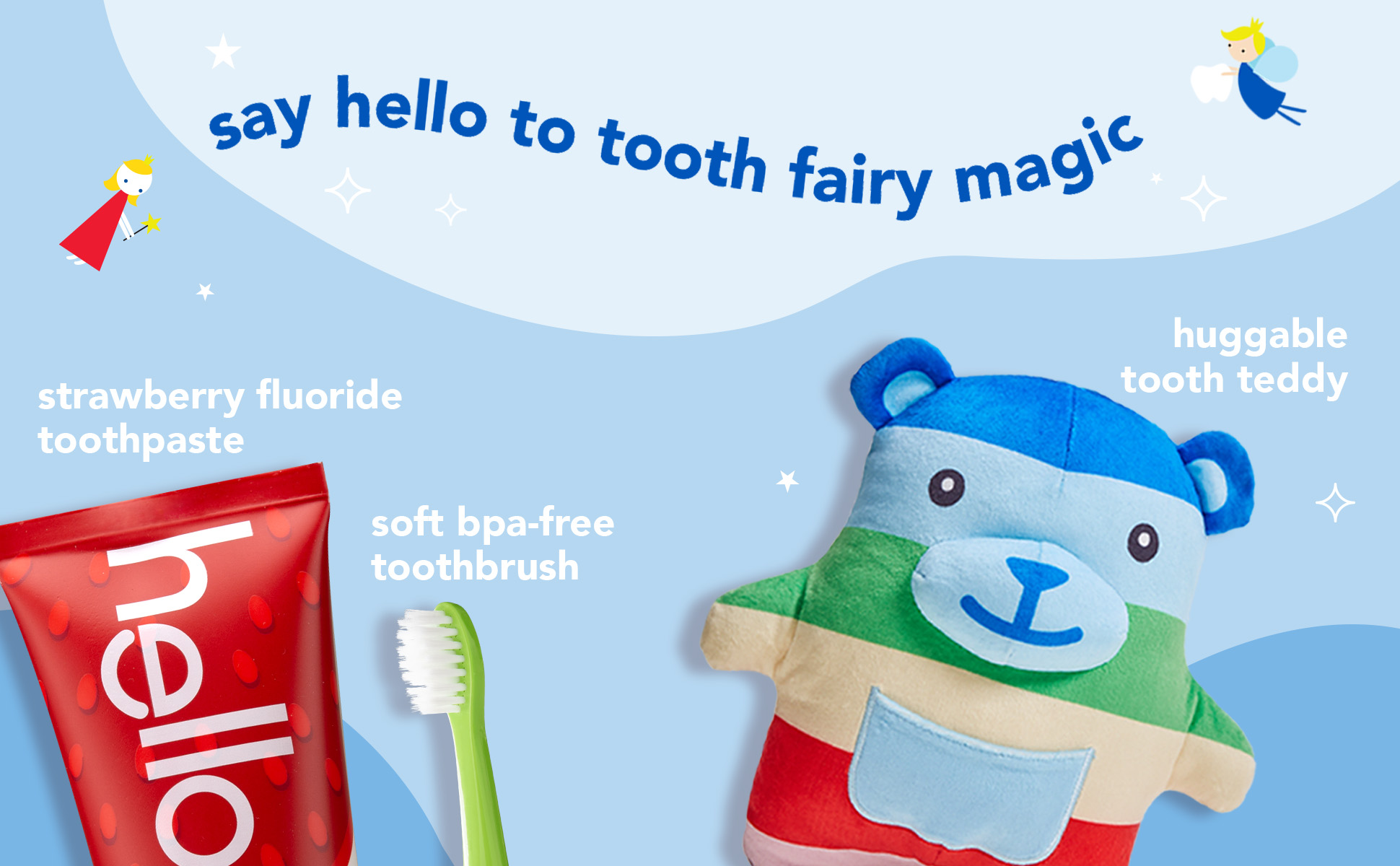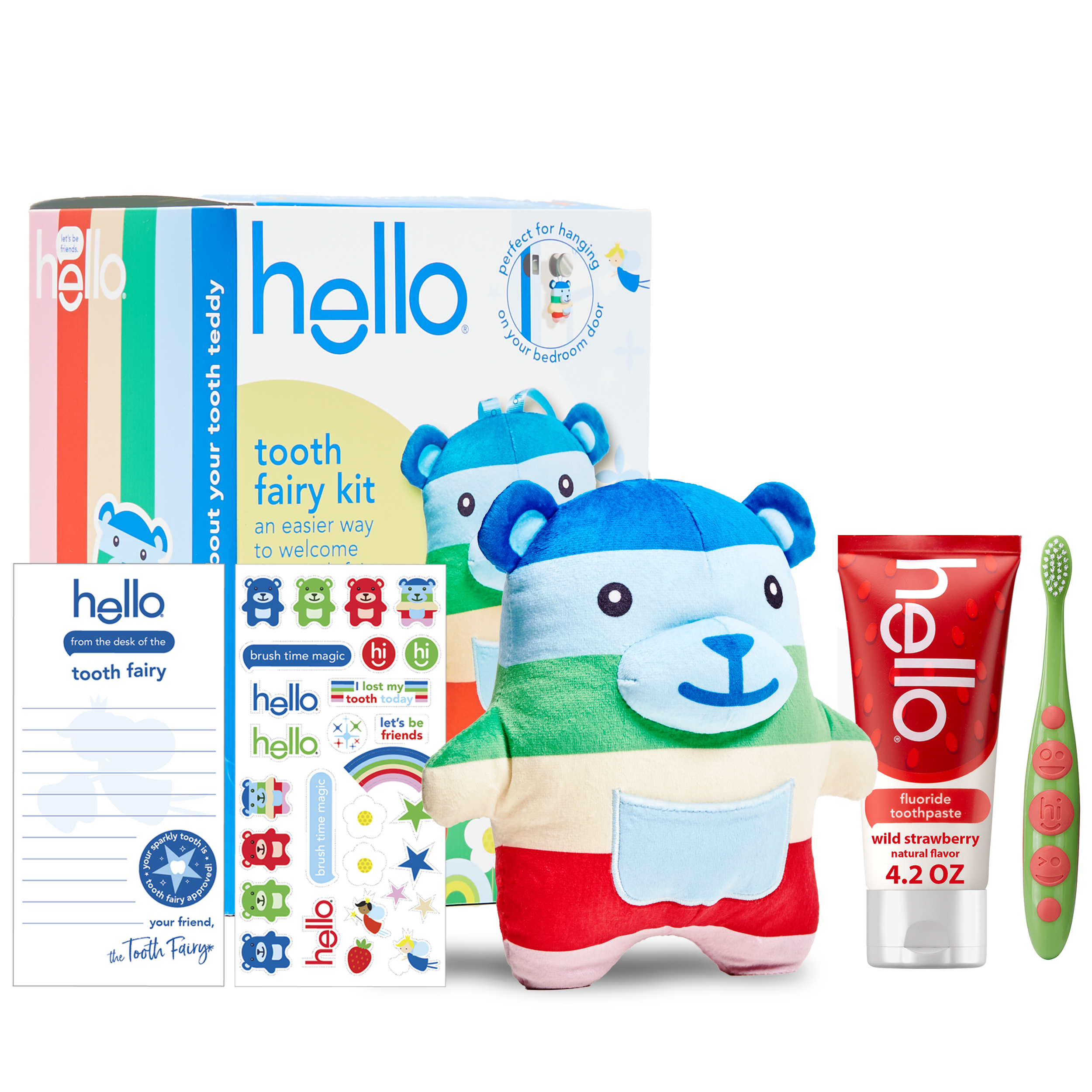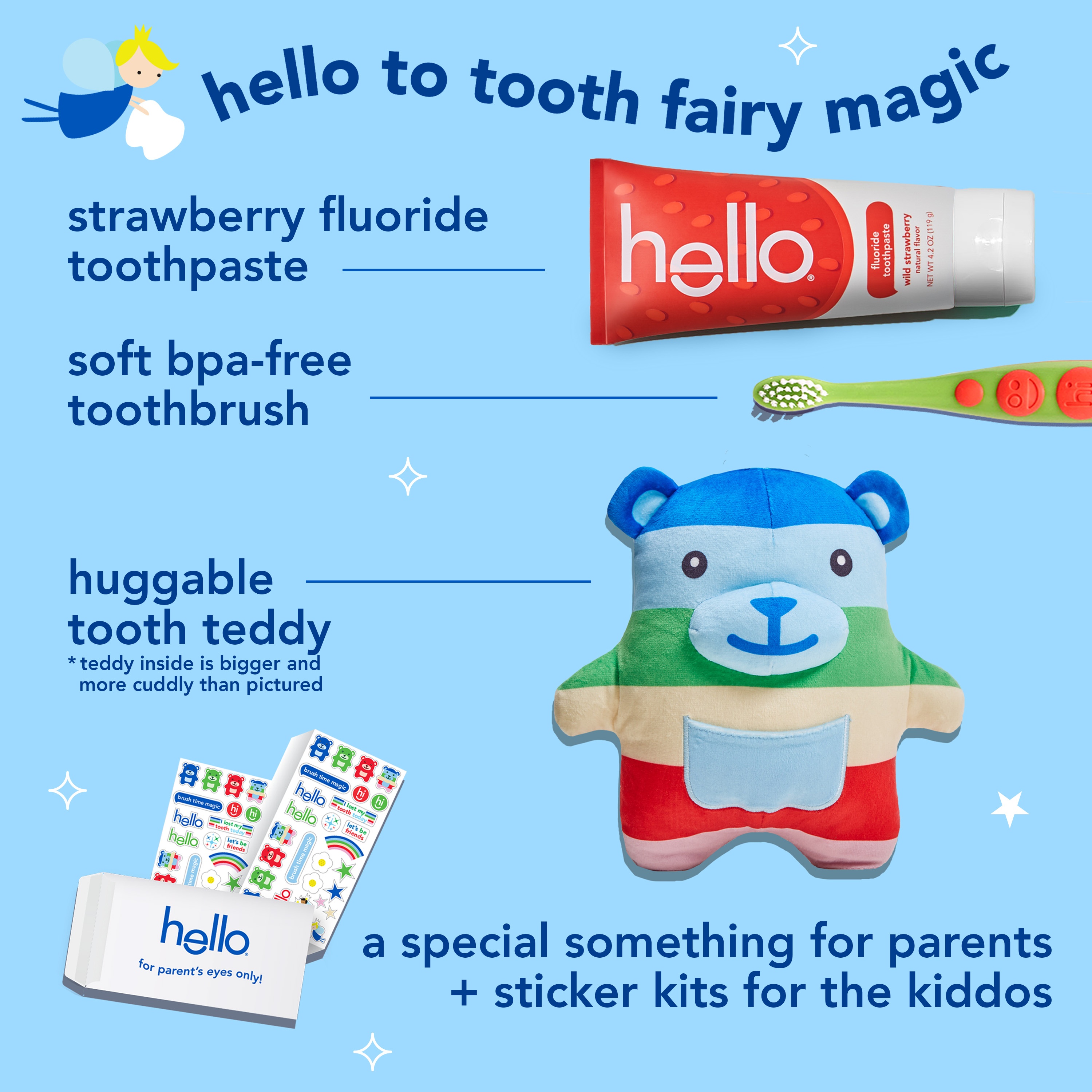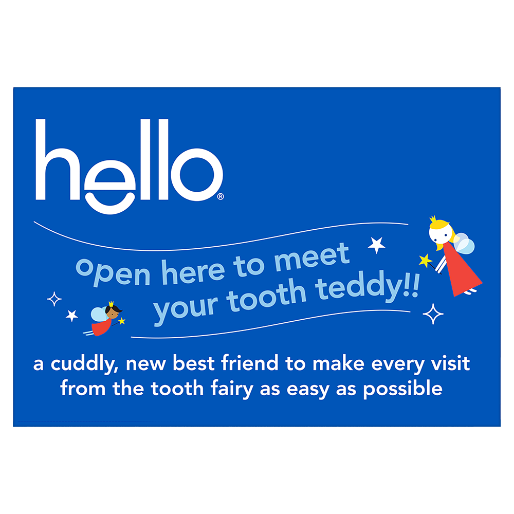 | Product Description | Say hello to tooth fairy magic and celebrate more everyday yay with the hello Tooth Fairy Kit. Designed to welcome the tooth fairy in the most magical way possible, this tooth fairy kit turns a lost tooth into a fun event. The tooth fairy kit includes a tooth teddy tooth fairy door hanger, an anticavity kids fluoride toothpaste, and a BPA-free kids toothbrush. Make tooth fairy visits stress-free by having your child hang this tooth fairy tooth holder right outside their door and eliminate the risk of waking them while searching under their pillow. The huggable tooth teddy includes a front pouch to keep those precious lost teeth safe until the tooth fairy arrives. The tooth fairy box kit also includes a vegan kids strawberry toothpaste that tastes magical with no artificial sweeteners, flavors, dyes, or SLS added. It helps prevent cavities and also polishes, brightens, and strengthens enamel to help with your child’s daily oral care routine. Plus, the kit includes a BPA-free kid toothbrush and set of stickers, along with a Parents Only pack with notes from the tooth fairy that keeps the magic alive. Welcome the tooth fairy with ease using the hello Tooth Fairy Kit. |