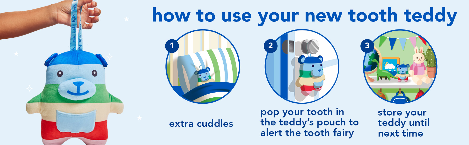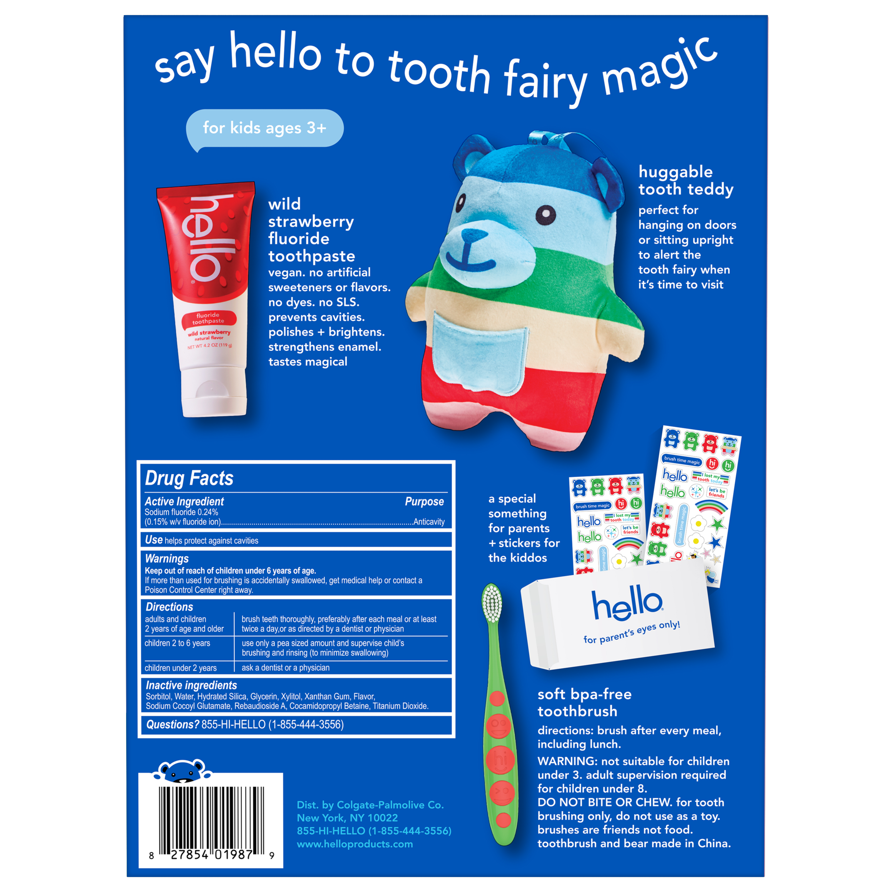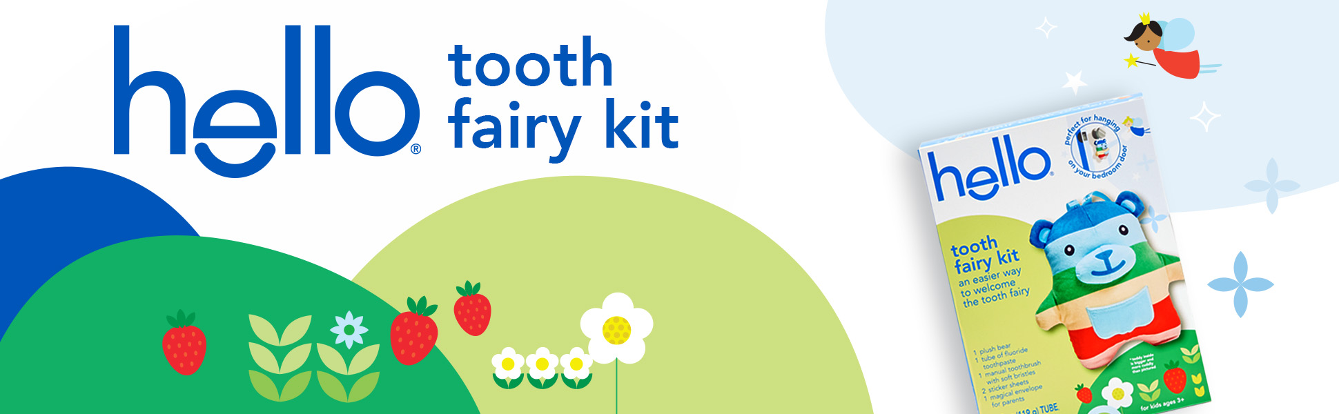 | Product Description | Say hello to tooth fairy magic and celebrate more everyday yay with the hello Tooth Fairy Kit. Designed to welcome the tooth fairy in the most magical way possible, this tooth fairy kit turns a lost tooth into a fun event. The tooth fairy kit includes a tooth teddy tooth fairy door hanger, an anticavity kids fluoride toothpaste, and a BPA-free kids toothbrush. Make tooth fairy visits stress-free by having your child hang this tooth fairy tooth holder right outside their door and eliminate the risk of waking them while searching under their pillow. The huggable tooth teddy includes a front pouch to keep those precious lost teeth safe until the tooth fairy arrives. The tooth fairy box kit also includes a vegan kids strawberry toothpaste that tastes magical with no artificial sweeteners, flavors, dyes, or SLS added. It helps prevent cavities and also polishes, brightens, and strengthens enamel to help with your child’s daily oral care routine. Plus, the kit includes a BPA-free kid toothbrush and set of stickers, along with a Parents Only pack with notes from the tooth fairy that keeps the magic alive. Welcome the tooth fairy with ease using the hello Tooth Fairy Kit. |