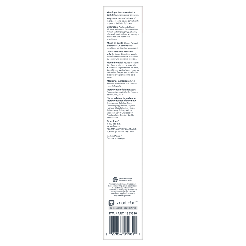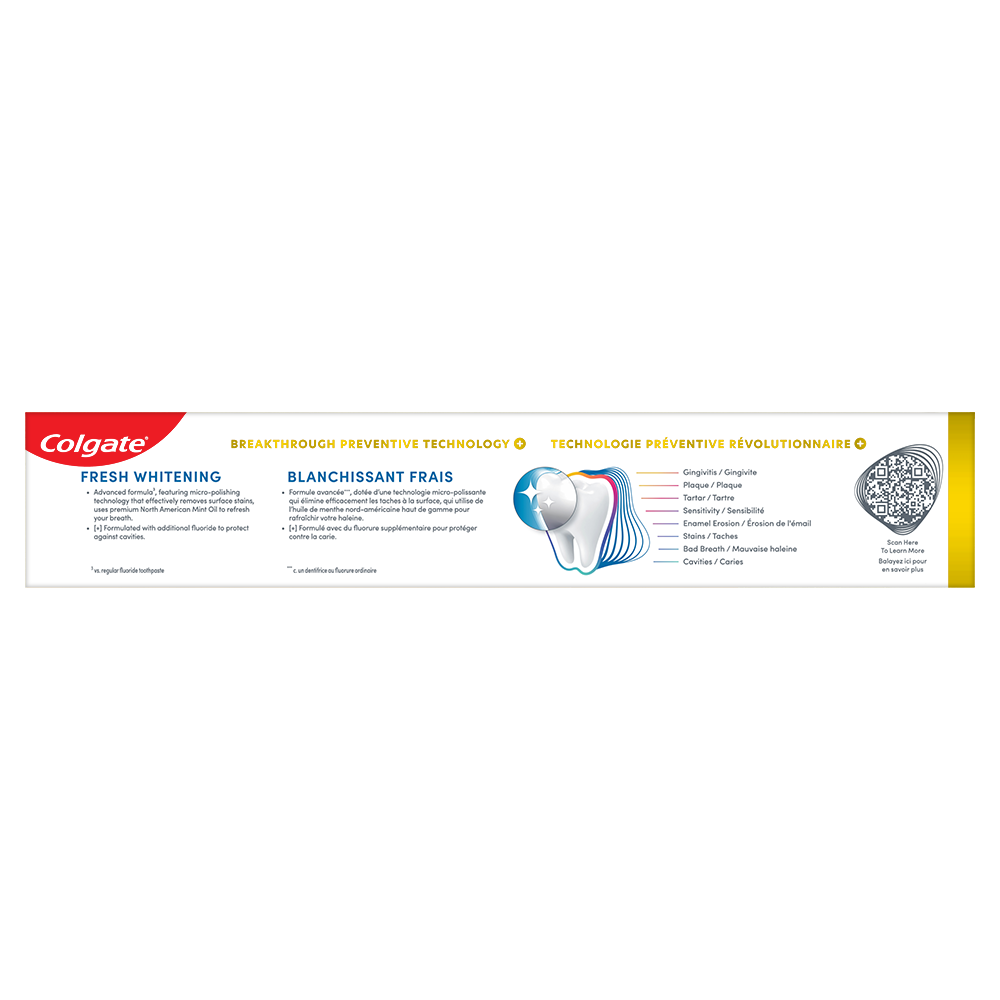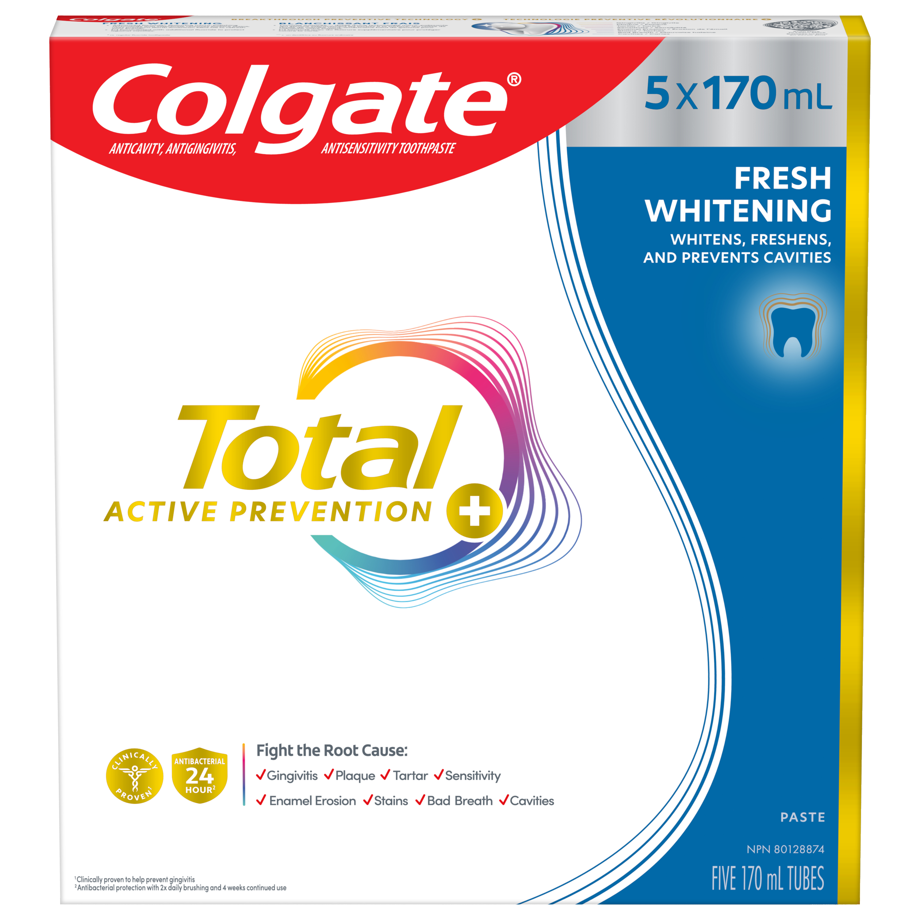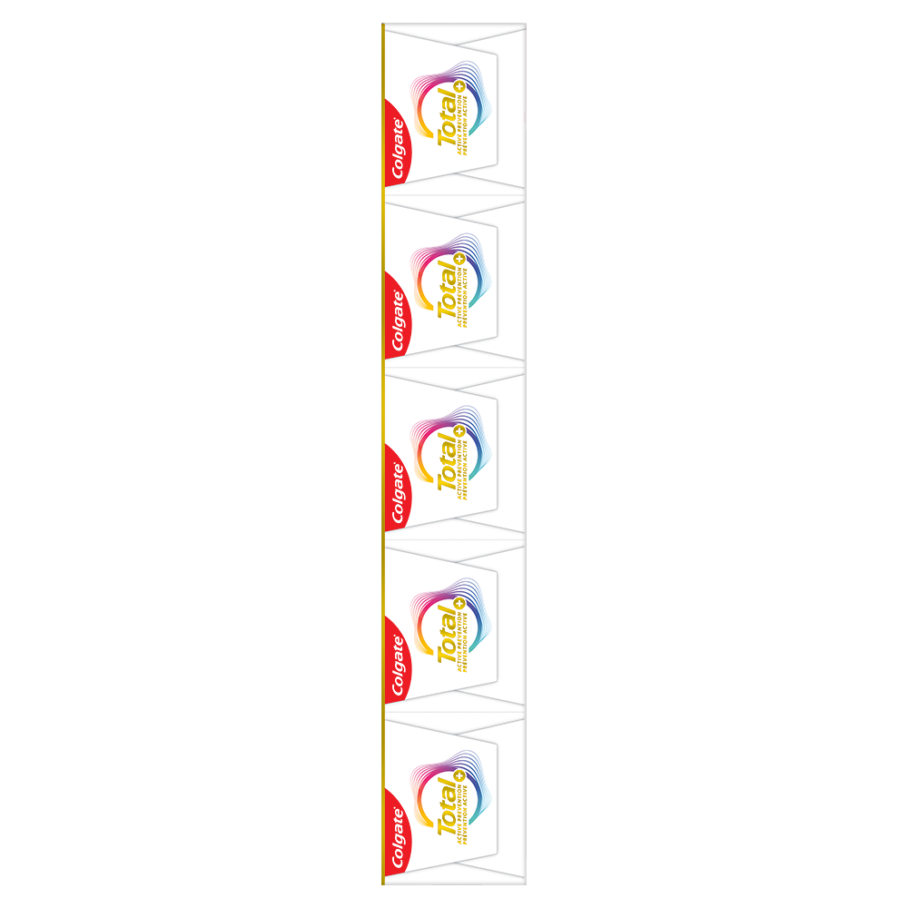 SKU 61046658 Consumer Unit - GTIN 00827854019817 Product Category Oral Care Product Sub Category Toothpaste Product Equity (Brand) Colgate Product Sub Brand Colgate Total TP Product Title Colgate Total Active Prevention Plus Fresh Whitening Toothpaste, Mint Flavour, 5 Pack, 170 mL Product Description Help stop common oral health problems* before they start with a pack of Colgate Total Active Prevention Plus Fresh Whitening Toothpaste. This powerful teeth whitening toothpaste pack offers 6x better stain removal** and uses a high concentration of scrubbing particles and dense cleaning foam to remove stains. Plus, this whitening fluoride toothpaste fights the root cause of common oral health issues including cavities, gingivitis, plaque, enamel erosion, sensitivity, and tartar. *such as cavities and gingivitis **after 6 weeks of use vs. regular fluoride toothpaste eCommerce Copy- Long Description Looking after your smile and keeping it protected can help stop oral health problems before they start. That’s why Colgate Total Active Prevention + Advanced Whitening Toothpaste, with its new and improved formula, has been scientifically designed for active prevention. It’s 3x more effective¹ at fighting a root cause¹ of many common oral health problems and offers 24 hours of antibacterial protection². What’s more, this teeth whitening toothpaste has been clinically proven and designed with a higher concentration of scrubbing particles that are specifically formulated for 6X better⁴ surface stain removal³! Just what you need to give your smile extra brilliance, shine and help prevent future oral health problems. Beyond teeth cleaning and safe teeth whitening, the powerful, patented⁵, preventative technology in Colgate’s Total Active Prevention + Advanced Whitening Toothpaste takes helps with 8 oral health problems: 1. Gum problems 2. Teeth plaque 3. Tartar 4. Sensitivity 5. Enamel erosion 6. Surface stains 7. Bad breath 8. Cavities With Colgate Total Active Prevention + Advanced Whitening Toothpaste you can be confident that your smile is protected and taken care of. ¹Bacterial plaque reduction vs non-antibacterial fluoride toothpaste, with 3 months continued use. ²With 2x daily brushing after 4 weeks continued use. ³Vs Colgate Total Original Toothpaste. ⁴After 6 weeks use vs fluoride toothpaste. ⁵US patented. _____________________________________ For markets where Total Mouthwash and Toothbrush are available: replace the last line of copy with this and add disclaimer By using Colgate Total Active Prevention + Advanced Whitening Toothpaste together with Colgate Total Mouthwash and a Colgate Total Toothbrush, it’s 15x more effective at fighting a root cause⁶, so you can be confident your smile is protected and taken care of. ⁶Bacterial plaque reduction vs. non-antibacterial fluoride toothpaste and regular brush, with 1 week continued use. Bullet 1 Includes five (5) 170 mL tubes of Colgate Total Active Prevention Plus Fresh Whitening Toothpaste, Mint Flavour Bullet 2 Helps fight the root cause of common oral health issues including cavities, gingivitis, plaque, enamel erosion, sensitivity, and tartar Bullet 3 This fluoride toothpaste is 2x more effective at fighting bacteria vs. a non-antibacterial fluoride toothpaste after 4 weeks of twice daily use Bullet 4 This mint toothpaste pack helps freshen breath and is also formulated with additional fluoride to protect against cavities Bullet 5 Help stop common oral health problems* before they start using this Colgate Total Active Prevention Plus Fresh Whitening Toothpaste Pack