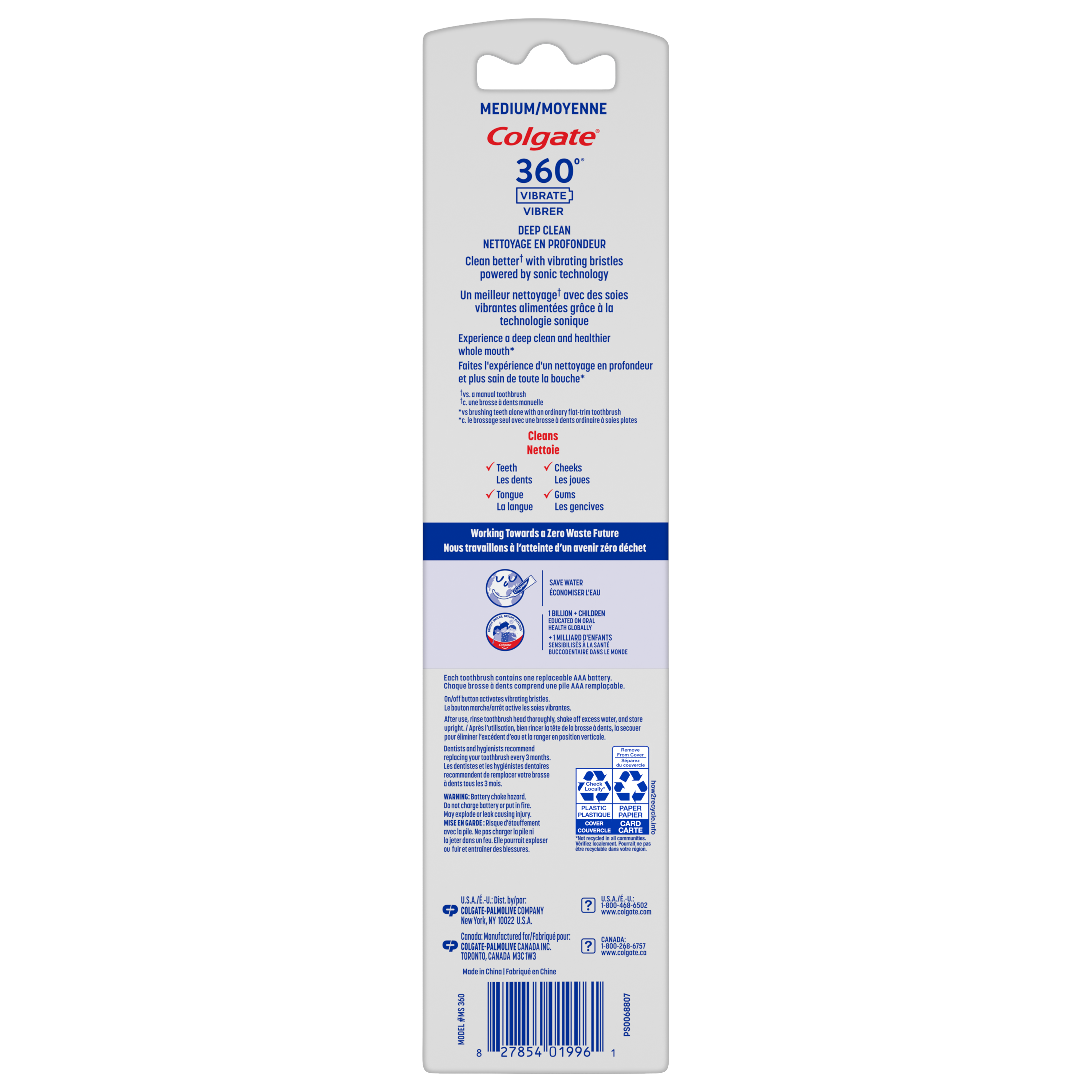 SKU 61046691 Consumer Unit - GTIN 00827854019961 Case - GTIN 10827854019951 Product Category Oral Care Product Sub Category Battery TB Product Equity (Brand) Colgate Product Sub Brand Colgate 360 Hybrid BTB Product Title Colgate 360 Vibrate Deep Clean Battery Toothbrush, Medium, 2 Pack Product Description The Colgate 360 Vibrate Deep Clean Battery Toothbrush Pack combines the power of a battery toothbrush with the familiarity of a manual toothbrush head for a refreshing teeth cleaning experience. Each medium toothbrush uses vibrating bristles powered by sonic technology to clean better*. These adult toothbrushes are perfect for travel because they are battery powered, so they can be used wherever you go (1 AAA battery included). Experience a deep clean and healthier whole mouth* with just a press of a button with the Colgate 360 Deep Clean Vibrating Toothbrush. This battery powered toothbrush cleans the teeth, cheeks, tongue, and gums so you can enjoy a whole mouth clean with every brush. The medium, vibrating bristles deliver cleaning powered by sonic technology. Clean better* with vibrating bristles powered by sonic technology with the Colgate 360 Vibrate Deep Clean Battery Toothbrush Pack. *vs. brushing teeth with an ordinary flat-trim toothbrush Bullet 1 Includes two (2) Colgate 360 Vibrate Deep Clean Battery Toothbrushes with Medium Bristles, 1 AAA battery included Bullet 2 Combines the familiarity of a manual adult toothbrush with the power of a battery toothbrush Bullet 3 This medium toothbrush pack uses vibrating bristles powered by sonic technology to clean better* with a simple press of a button Bullet 4 The vibrating toothbrush helps clean your teeth, cheeks, tongue, and gums so you can enjoy a whole mouth clean with every brush Bullet 5 Experience a deep clean and healthier whole mouth* using the Colgate 360 Vibrate Deep Clean Medium Bristle Battery Operated Toothbrush Pack Amazon RPC B0GJFW4MZC AMZ URL https://www.amazon.com/dp/B0GJFW4MZC Walmart RPC 5729970700 Walmart URL (Computed) https://www.walmart.com/ip/a/5729970700