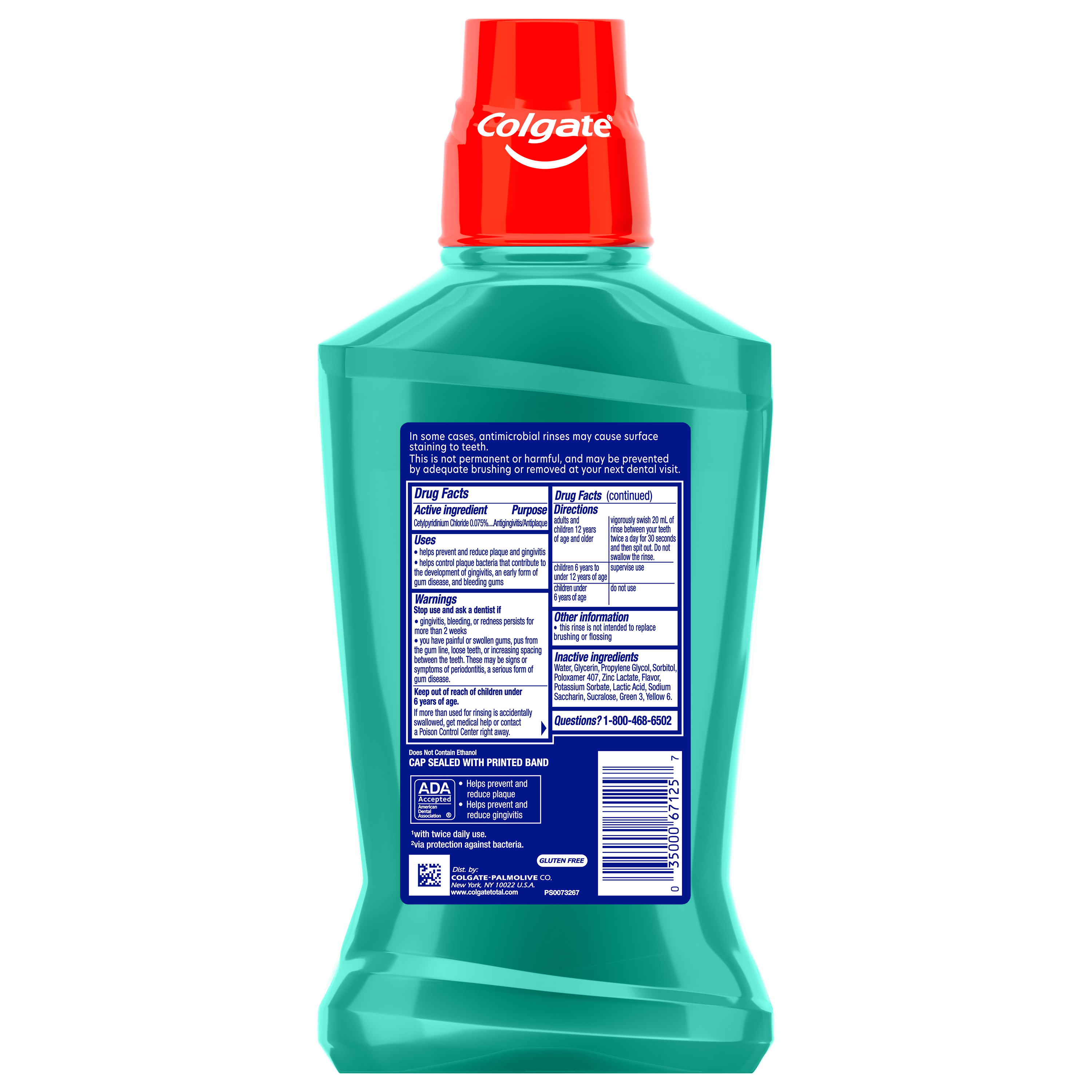SKU 61046778 Consumer Unit - GTIN 00035000671257 Case - GTIN 10035000671254 Product Category Oral Care Product Sub Category Mouthwash Product Equity (Brand) Colgate Product Sub Brand Colgate Total MW Product Title Colgate Total Alcohol Free Mouthwash, Spearmint, 500 mL Product Description Experience a healthy smile and fresh breath with Colgate Total Alcohol Free Spearmint Mouthwash, the only ADA-accepted alcohol-free* oral rinse with CPC as an active ingredient for plaque and gingivitis. This no-alcohol mouthwash is designed to deliver 24-hour protection against bacteria. Plus, it’s clinically proven to fight the root cause of plaque, gingivitis, and tartar buildup**, to help prevent oral health issues*** before they start. Colgate Total Alcohol Free Mouthwash uses a Zinc formula for freshness and doesn’t burn after use. This alcohol-free Colgate Total mint mouthwash continues to work after you brush, providing ongoing protection from bacteria between brushings. Use this alcohol-free mouthwash for superior performance**** and to help prevent many common oral care issues like plaque and gingivitis. For a complete approach to your oral health, use this mint mouthwash in combination with the Colgate Total toothpaste and the Colgate Total Active Prevention toothbrush. *does not contain ethanol **via protection against bacteria ***such as gingivitis and plaque ****vs. brushing alone eCommerce Copy- Long Description Experience a healthy smile and fresh breath with Colgate Total Alcohol Free Spearmint Mouthwash, the only ADA-accepted alcohol-free* oral rinse with CPC as an active ingredient for plaque and gingivitis. This no-alcohol mouthwash is designed to deliver 24-hour protection against bacteria. Plus, it’s clinically proven to fight the root cause of plaque, gingivitis, and tartar buildup**, to help prevent oral health issues*** before they start. Colgate Total Alcohol Free Mouthwash uses a Zinc formula for freshness and doesn’t burn after use. This alcohol-free Colgate Total mint mouthwash continues to work after you brush, providing ongoing protection from bacteria between brushings. Use this alcohol-free mouthwash for superior performance**** and to help prevent many common oral care issues like plaque and gingivitis. For a complete approach to your oral health, use this mint mouthwash in combination with the Colgate Total toothpaste and the Colgate Total Active Prevention toothbrush. *does not contain ethanol **via protection against bacteria ***such as gingivitis and plaque ****vs. brushing alone Bullet 1 Includes one (1) 500 mL bottle of Colgate Total Alcohol Free Mouthwash, Spearmint Mouthwash Bullet 2 Colgate Total Alcohol Free Spearmint Mouthwash delivers 24-hour protection against bacteria Bullet 3 Clinically proven to target the root causes of plaque, gingivitis, and tartar buildup** and helps prevent oral health issues before they start Bullet 4 Enjoy a fresh clean with Colgate Total Spearmint Mouthwash, a no-alcohol mouthwash Bullet 5 Colgate Total Spearmint Mouthwash is an ADA-accepted mint mouthwash and the oral rinse formula uses Zinc to help with fresh breath Active Ingredients Cetylpyridinium Chloride 0.075% Amazon RPC B00EZWSBL4 AMZ URL https://www.amazon.com/dp/B00EZWSBL4 Walmart RPC 24491225 Walmart URL (Computed) https://www.walmart.com/ip/a/24491225 CVS RPC 926302
