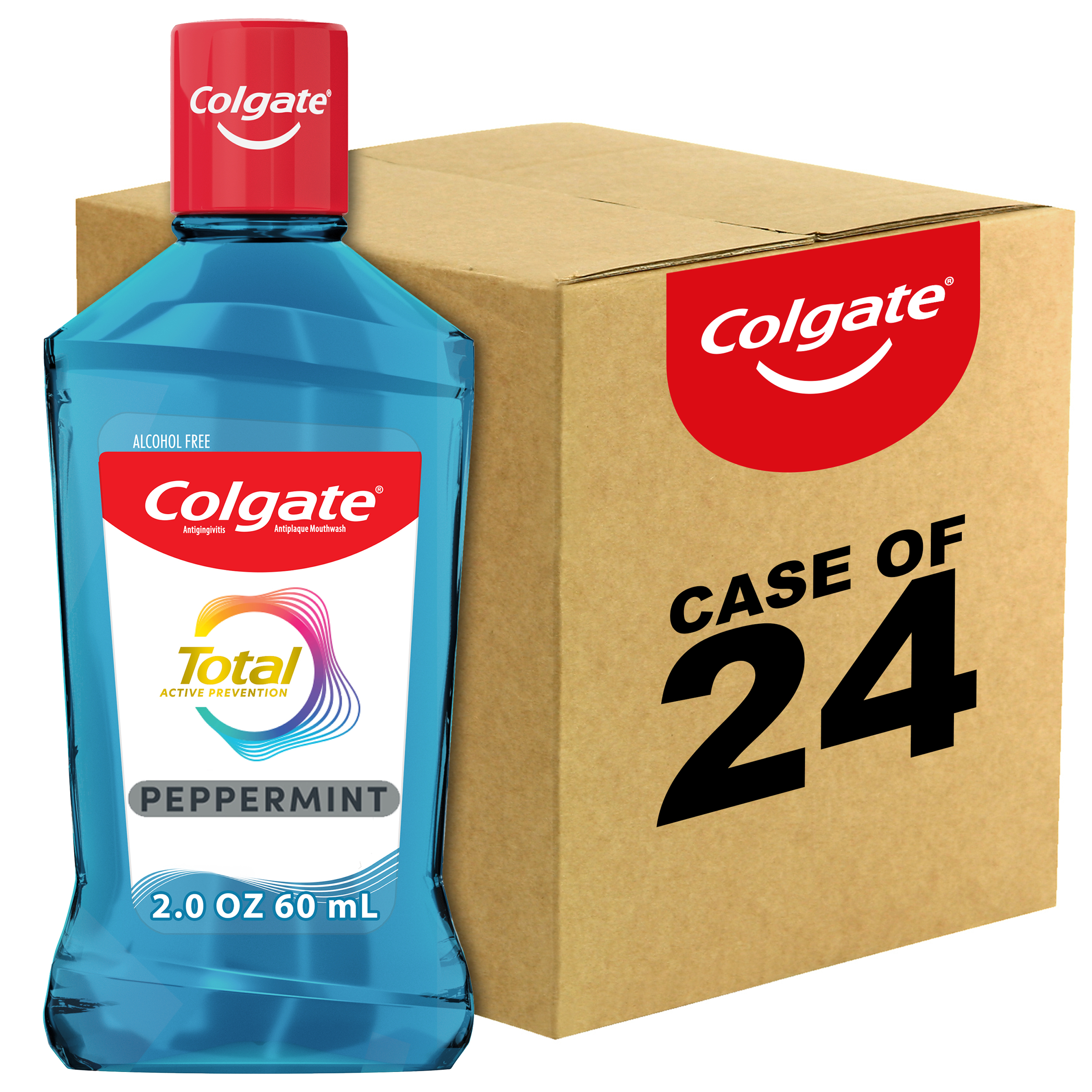 SKU 61046783 Consumer Unit - GTIN 00035000671295 Case - GTIN 10035000671292 Product Category Oral Care Product Sub Category Mouthwash Product Equity (Brand) Colgate Product Sub Brand Colgate Total MW Product Title Colgate Total Alcohol Free Mouthwash, Travel Size, Peppermint, 24 Pack, 60 mL Product Description Experience a healthy smile and fresh breath with Colgate Total Alcohol Free Peppermint Mouthwash, the only ADA-accepted alcohol-free* oral rinse with CPC as an active ingredient for plaque and gingivitis. This bulk travel size no-alcohol mouthwash pack is designed to deliver 24-hour protection against bacteria. Plus, it’s clinically proven to fight the root cause of plaque, gingivitis, and tartar buildup**, to help prevent oral health issues*** before they start. Colgate Total Alcohol Free Mouthwash uses a Zinc formula for freshness and doesn’t burn after use. This alcohol-free Colgate Total mint mouthwash continues to work after you brush, providing ongoing protection from bacteria between brushings. Use this alcohol-free mouthwash for superior performance**** and to help prevent many common oral care issues like plaque and gingivitis. For a complete approach to your oral health, use this bulk mouthwash pack in combination with the Colgate Total toothpaste and the Colgate Total Active Prevention toothbrush. *does not contain ethanol **via protection against bacteria ***such as gingivitis and plaque ****vs. brushing alone eCommerce Copy- Long Description Experience a healthy smile and fresh breath with Colgate Total Alcohol Free Peppermint Mouthwash, the only ADA-accepted alcohol-free* oral rinse with CPC as an active ingredient for plaque and gingivitis. This no alcohol mouthwash is designed to deliver 24-hour protection against bacteria. Plus, it’s clinically proven to fight the root cause of plaque, gingivitis, and tartar buildup**, to help prevent oral health issues*** before they start. Colgate Total Alcohol Free Mouthwash uses a Zinc formula for freshness and doesn’t burn after use. This alcohol free Colgate Total mint mouthwash continues to work after you brush, providing ongoing protection from bacteria between brushings. Use this alcohol free mouthwash for superior performance**** and to help prevent many common oral care issues like plaque and gingivitis. For a complete approach to your oral health, use this peppermint mouthwash in combination with the Colgate Total toothpaste and the Colgate Total Active Prevention toothbrush. *does not contain ethanol **via protection against bacteria ***such as gingivitis and plaque ****vs. brushing alone Bullet 1 Includes twenty-four (24) 60 mL bottles of Colgate Total Alcohol Free Mouthwash, Peppermint Mouthwash Bullet 2 This bulk mouthwash pack helps deliver 24-hour protection against bacteria Bullet 3 Clinically proven to target the root causes of plaque, gingivitis, and tartar buildup** and helps prevent oral health issues before they start Bullet 4 Enjoy a fresh clean with Colgate Total Peppermint Mouthwash, a no-alcohol mouthwash* Bullet 5 Colgate Total Peppermint Mouthwash is an ADA-accepted mint mouthwash and the oral rinse formula uses Zinc to help with fresh breath Active Ingredients Cetylpyridinium Chloride 0.075% Amazon RPC B08QTYBHN8 AMZ URL https://www.amazon.com/dp/B08QTYBHN8 CVS RPC 171589