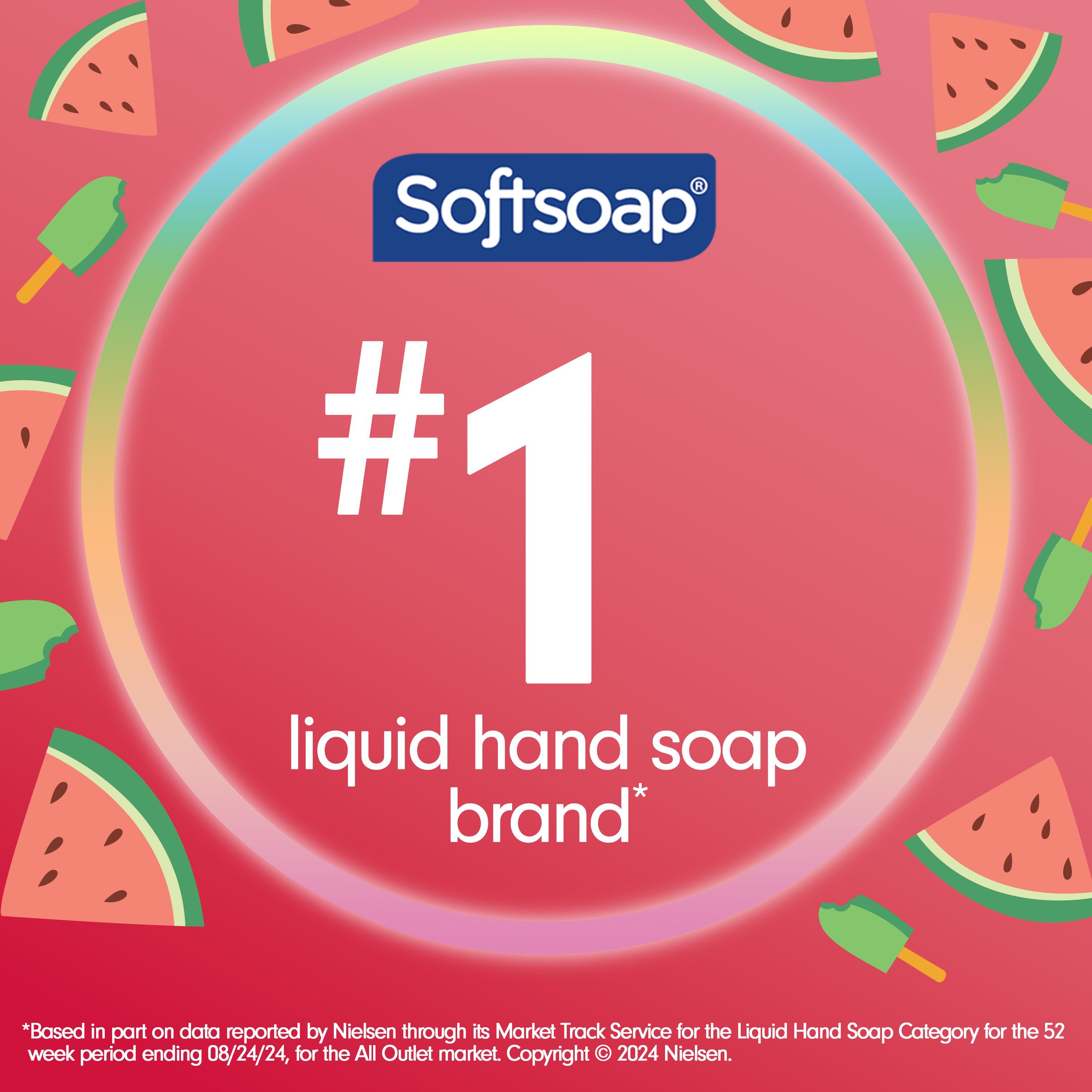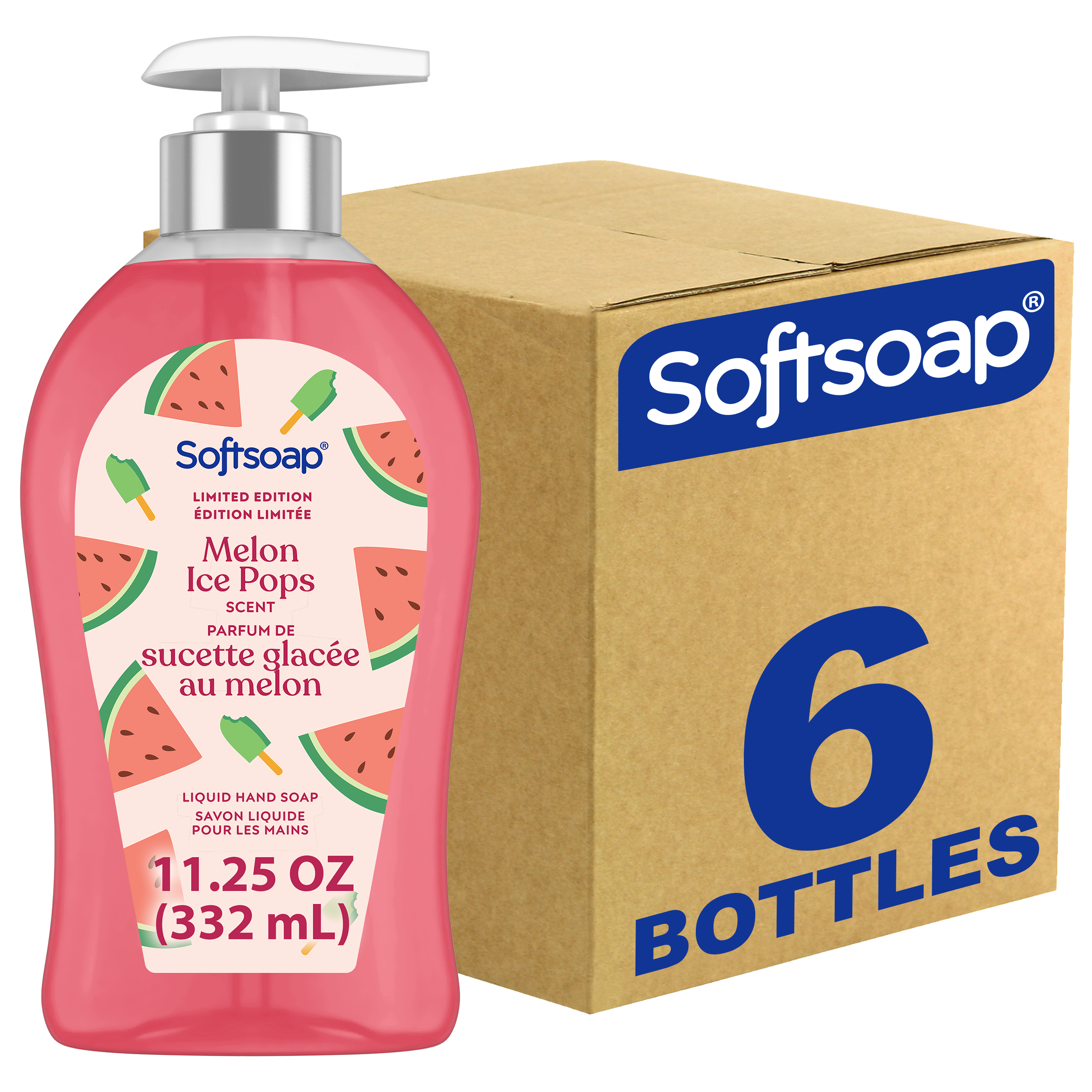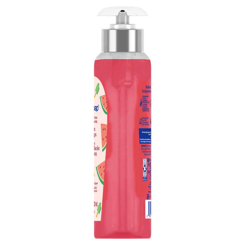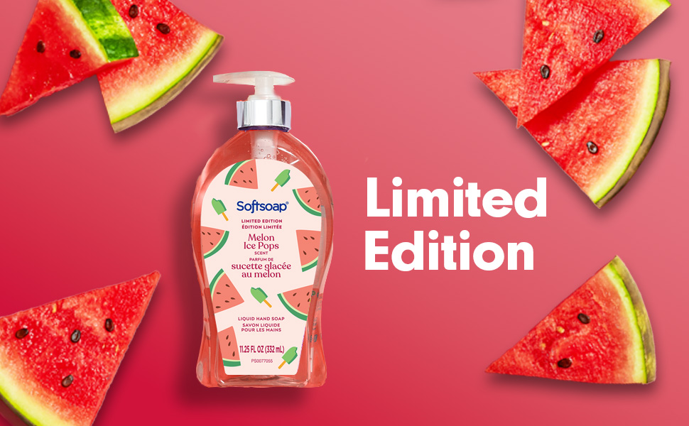 SKU 61047386 Consumer Unit - GTIN 00827854020806 Case - GTIN 10827854020803 Product Category Personal Care Product Sub Category Liquid Hand Wash Product Equity (Brand) Softsoap Product Sub Brand Softsoap LHW Product Title Softsoap Melon Ice Pops Limited Edition Liquid Hand Soap, Seasonal Hand Soap, Hand Cleaner, Paraben Free, pH Balanced, Melon Scent, 11.25 fl oz Pump Bottle Product Description Bring a touch of seasonal joy for your sink with Softsoap’s Melon Ice Pops Limited Edition Liquid Hand Soap. Softsoap is America's #1 Liquid Hand Soap brand (1), trusted to clean your hands since 1975. This fun, pink hand soap with hints of fresh melon sparks joy and refreshes your routine. Our formula is pH balanced, is paraben free, and formulated without phthalates. This seasonal hand soap helps retain your skin's natural moisture after every wash. Health care agencies recommended washing hands with soap and clean running water for 20 seconds to wash away dirt and bacteria. Don't miss the chance to make every hand wash a moment of happiness, grab yours while supplies last. (1) Based in part on data reported by Nielsen through its Market Track Service for the Liquid Hand Soap Category for the 52 week period ending 09/28/24, for the All Outlet market. Copyright © 2024 Nielsen. Bullet 1 One 11.25 fl oz pump bottle of Softsoap Melon Ice Pops Limited Edition Liquid Hand Soap Bullet 2 Softsoap is America's #1 Liquid Hand Soap brand (1), trusted to clean your hands since 1975 Bullet 3 This fun, pink hand soap with hints of fresh melon sparks joy and refreshes your routine Bullet 4 Versatile to use as a bathroom hand soap, kitchen hand soap, or in any other space that needs a touch of fun Bullet 5 Our formula is pH balanced, is paraben free, and formulated without phthalates Bullet 6 This seasonal hand soap helps retain your skin's natural moisture after every wash Bullet 7 Health care agencies recommend washing hands with soap and clean running water for 20 seconds to wash away dirt and bacteria Target RPC 94405534 Target URL https://www.target.com/p/a/-/A-94405534