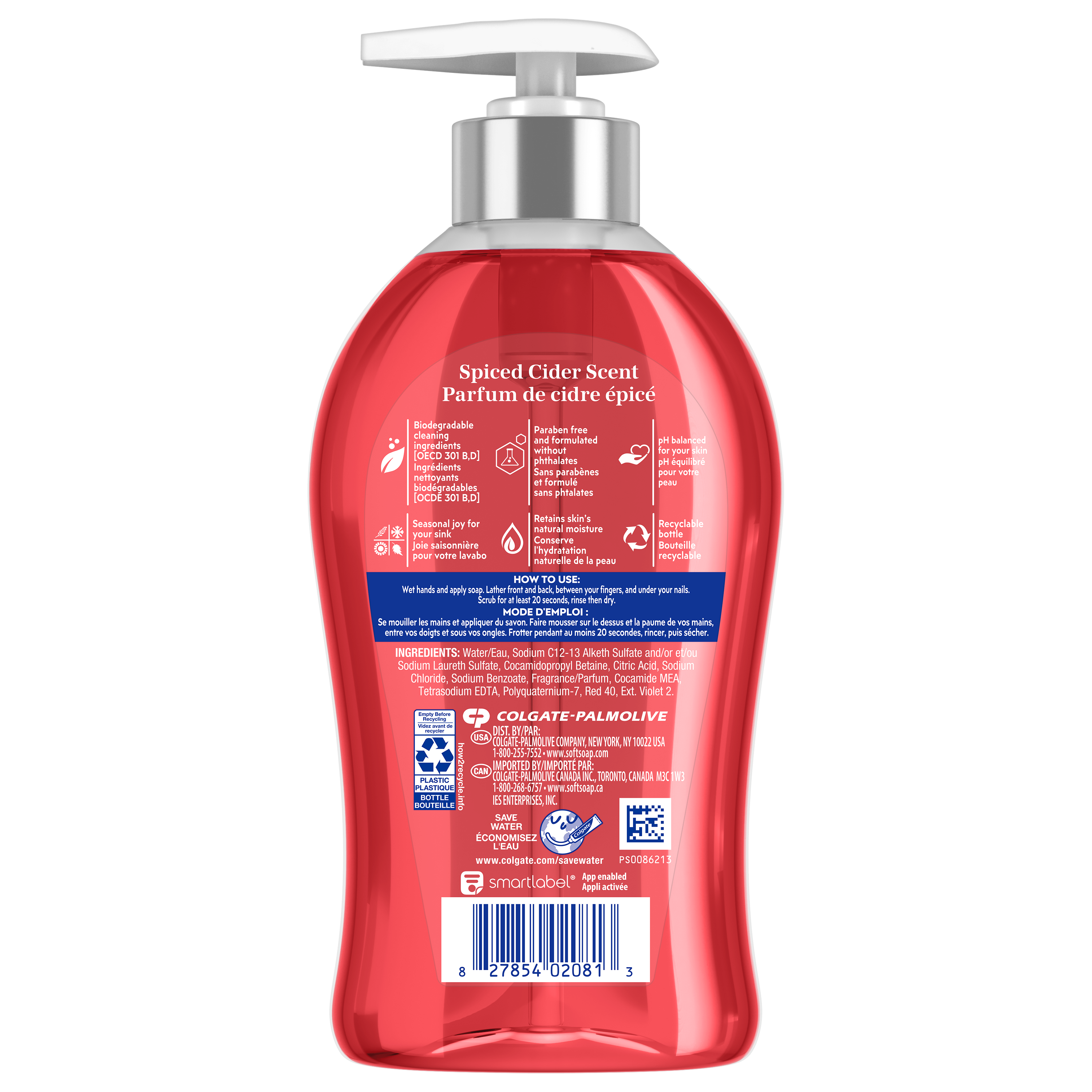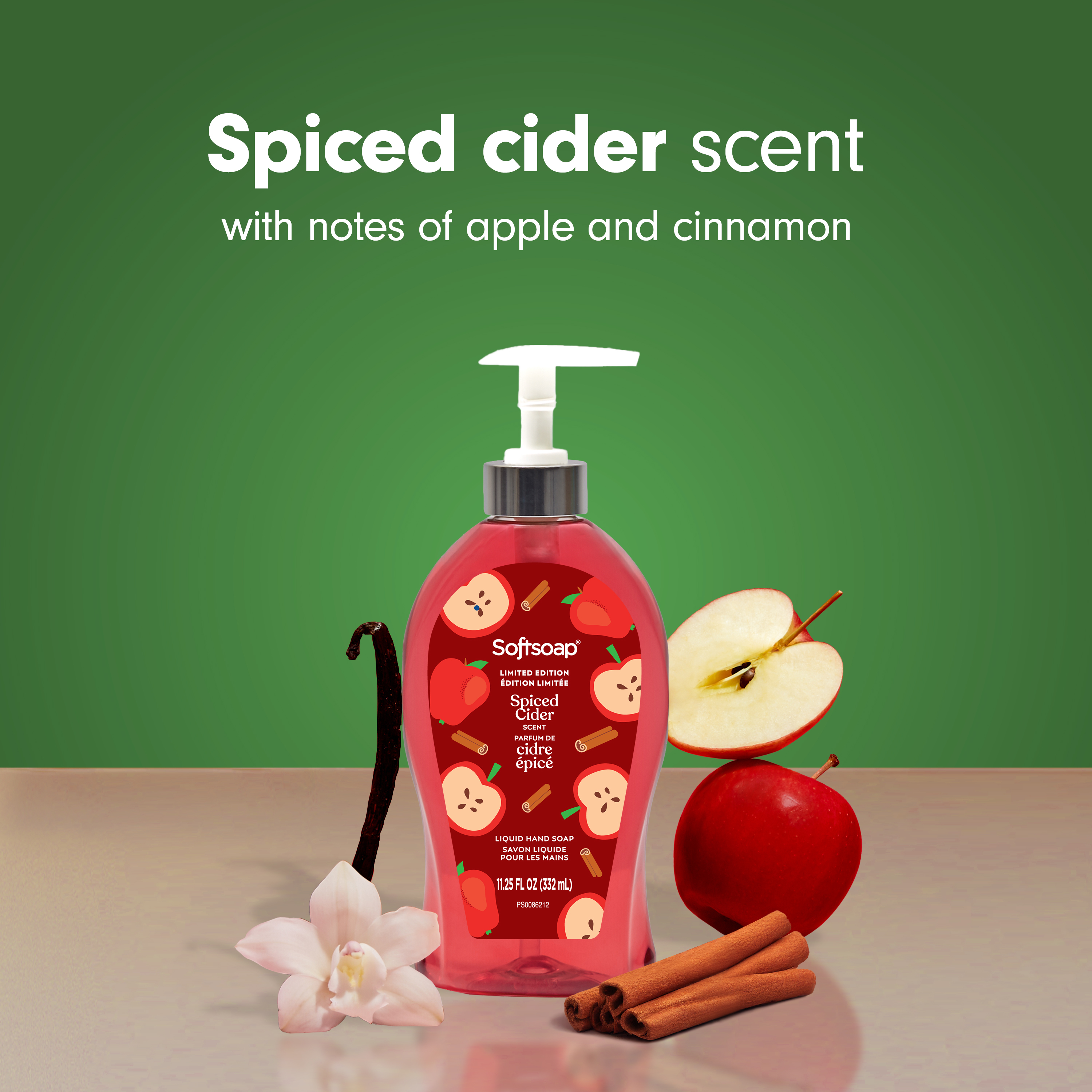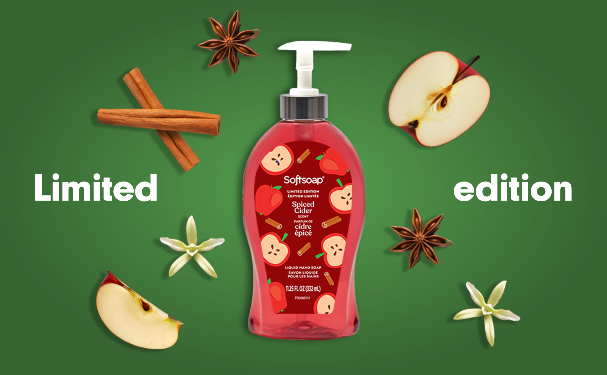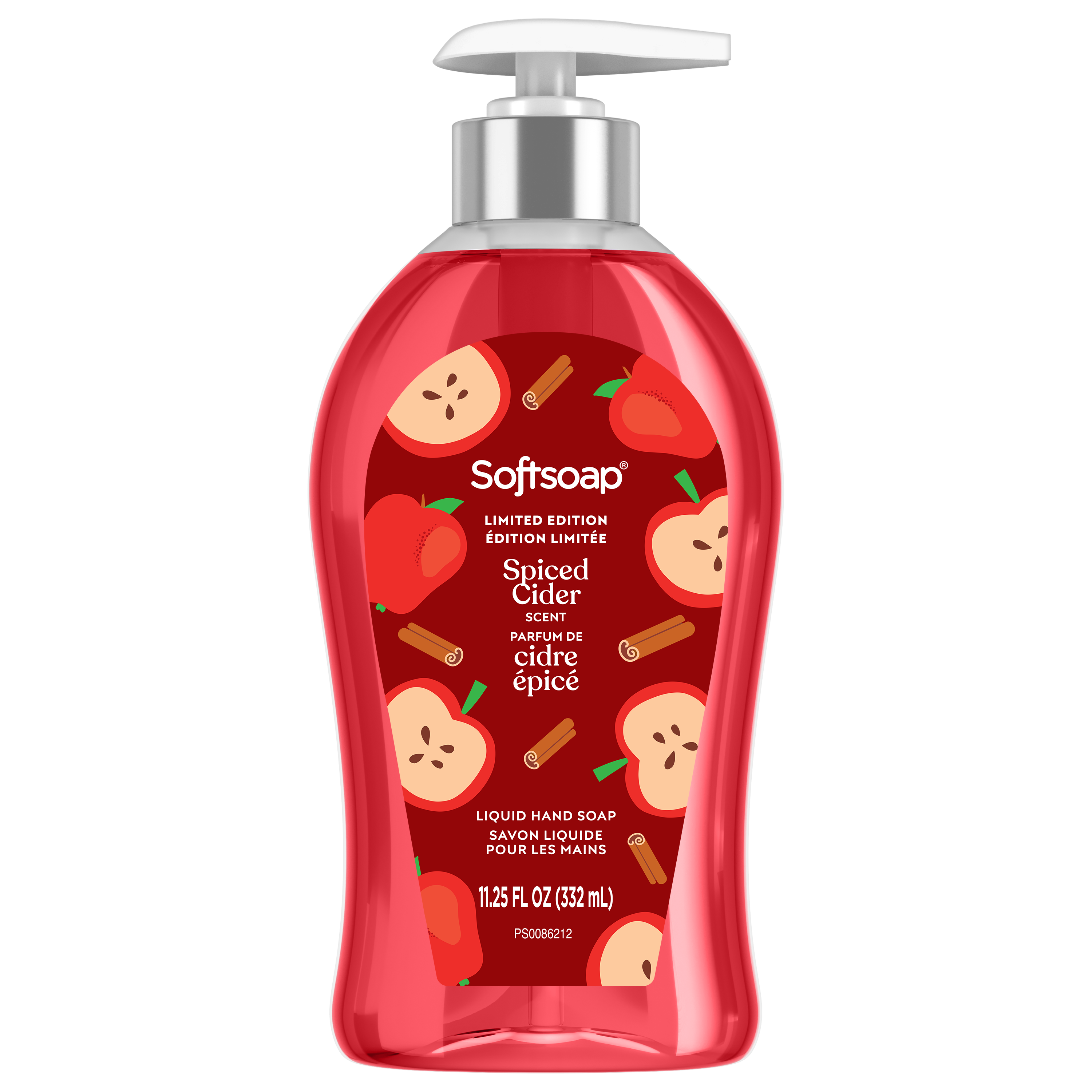 SKU 61047387 Consumer Unit - GTIN 00827854020813 Case - GTIN 10827854020810 Product Category Personal Care Product Sub Category Liquid Hand Wash Product Equity (Brand) Softsoap Product Sub Brand Softsoap LHW Product Title Softsoap Limited Edition Liquid Hand Soap, Bathroom or Kitchen Hand Soap, Spiced Cider Scent, 11.25 fl oz Pump Bottle Product Description Bring seasonal joy to your sink! Softsoap’s Limited Edition Liquid Hand Soap will bring the playful essence of the holidays right to your fingertips. The charming packaging, reminiscent of joyful festivities, will spark joy and brighten up your day. This hand soap washes away bacteria and is perfect for enjoying the holiday season! Our formula helps skin retain its natural moisture and is pH balanced for your skin. Health care agencies recommend washing hands with soap and clean running water for 20 seconds to wash away dirt and bacteria. Designed to be a festive fixture in your home, this limited edition hand soap turns ordinary hand washing into a joyful celebration. So why not treat yourself to our fall hand soap and enjoy the season to the fullest? Stock up now while supplies last and bring a little bit of fun into your daily routine! Bullet 1 One 11.25 fl oz bottle of Softsoap Limited Edition Liquid Hand Soap, Spiced Cider Scent Bullet 2 Softsoap’s seasonal hand soap sparks joy and brightens up your day Bullet 3 This fall hand soap helps to retain skin's natural moisture Bullet 4 This holiday hand soap is pH balanced for your skin Bullet 5 Versatile to use in the bathroom, as a kitchen hand soap, or in any other space that needs a touch of holiday spirit Bullet 6 Our scented hand soap cleans and captures the holiday essence with every pump, enveloping your senses with a Spiced Cider scent Target RPC 94723629 Target URL https://www.target.com/p/a/-/A-94723629