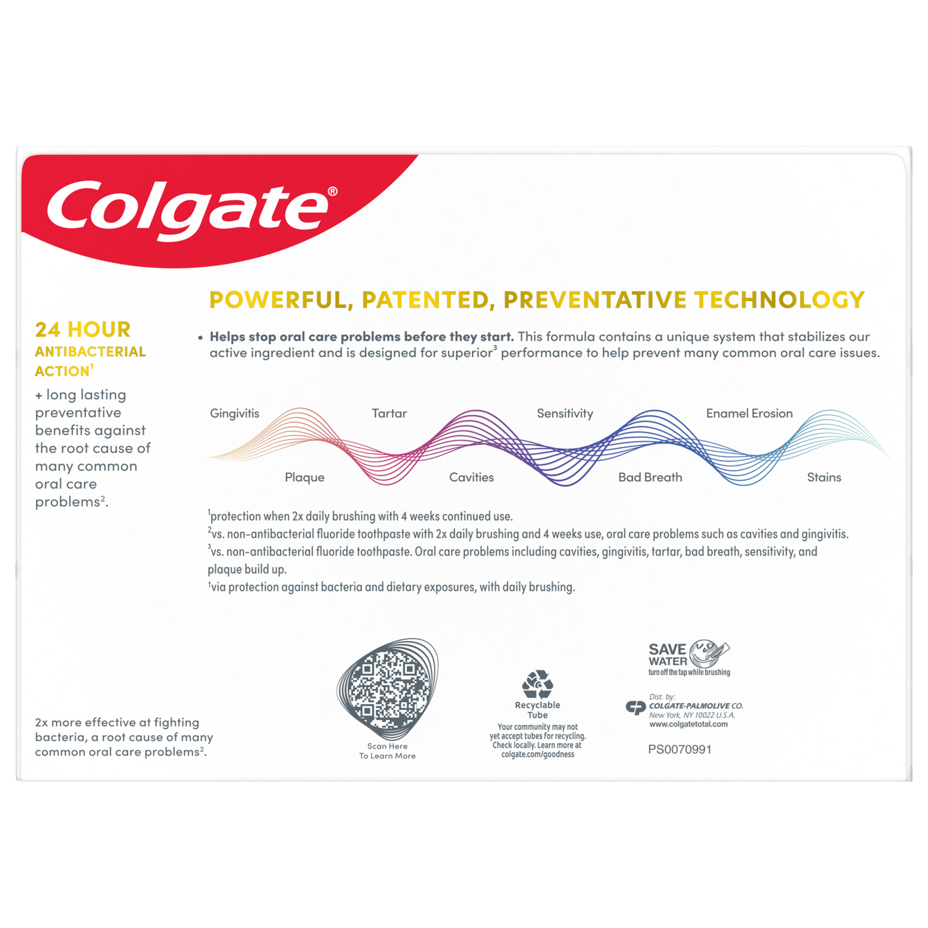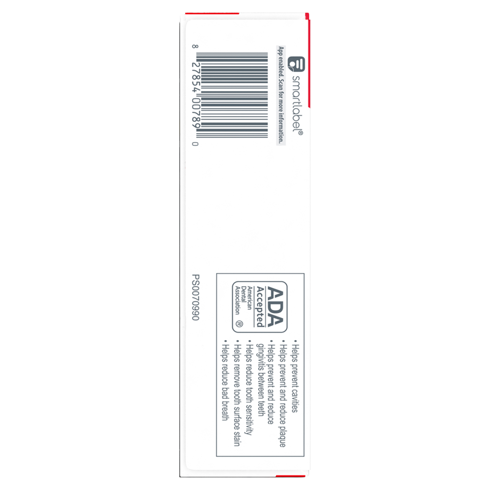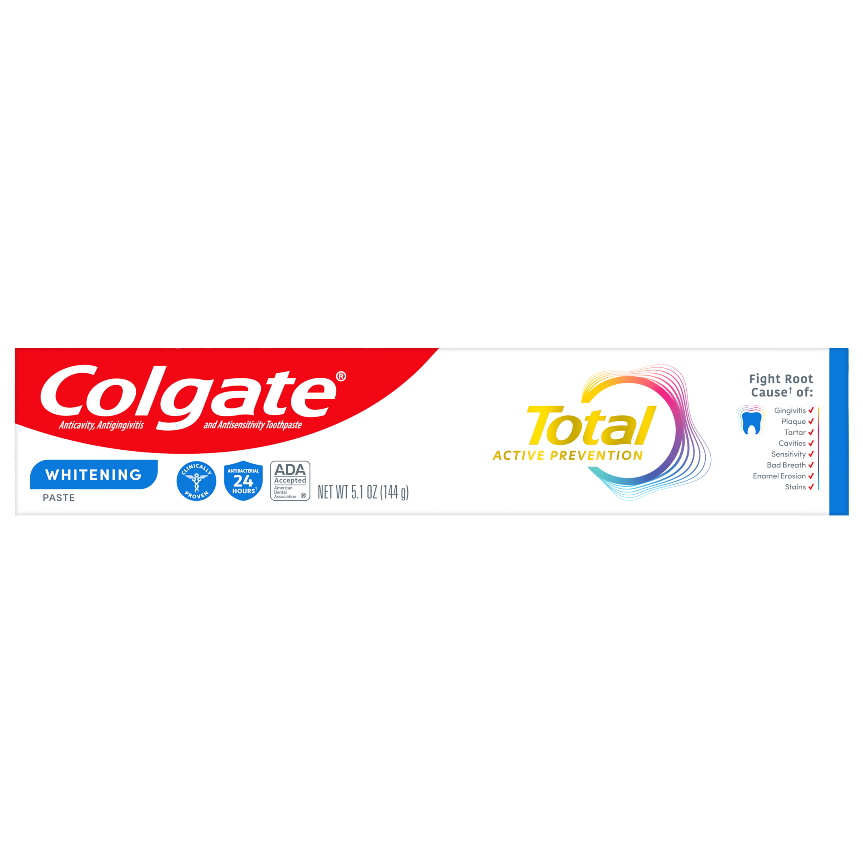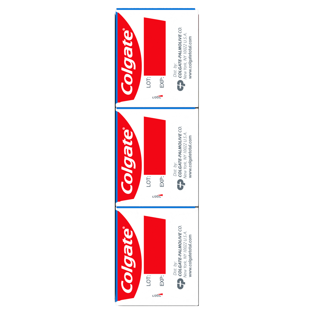 SKU 61047473 Consumer Unit - GTIN 00827854007890 Case - GTIN 10827854007897 Product Category Oral Care Product Sub Category Toothpaste Product Equity (Brand) Colgate Product Sub Brand Colgate Total TP Product Title Colgate Total Active Prevention Whitening Toothpaste, Mint, 3 Pack, 5.1 oz Product Description Help stop oral health problems* before they start with Colgate Total Active Prevention Whitening Toothpaste. This anticavity toothpaste pack fights bacteria, the root cause of many oral health issues such as gingivitis, plaque, tartar, sensitivity, bad breath, and cavities. In addition, this whitening toothpaste pack features cutting-edge cooling technology and blends peppermint and spearmint together for an invigorating minty flavor profile. This science-backed fluoride toothpaste uses a unique, clinically-proven stannous fluoride formula to help fight plaque bacteria. Plus, this whitening mint toothpaste helps minimize bad breath and helps remove stains. Colgate Total Active Prevention Whitening Fluoride Toothpaste can help improve your oral health by tackling many oral health issues* before they begin. This Colgate Total anticavity toothpaste offers 24 hours of long-lasting antibacterial protection when brushing twice daily with 4 weeks of continued use. Feel secure knowing that Colgate Total Active Prevention Whitening Toothpaste has your whitening, cavities, gingivitis, and sensitivity prevention needs covered for a healthy and brighter smile. *such as cavities and gingivitis **vs. non-antibacterial fluoride toothpaste with 3 months continued use eCommerce Copy- Long Description Help stop oral health problems* before they start with Colgate Total Active Prevention Whitening Toothpaste. This anticavity toothpaste fights bacteria, the root cause of many oral health issues such as gingivitis, plaque, tartar, sensitivity, weak enamel, stains, bad breath, and cavities. In addition, this whitening toothpaste features cutting-edge cooling technology and blends peppermint and spearmint together for an invigorating minty flavor profile. This science-backed fluoride toothpaste uses a unique, clinically-proven stannous fluoride formula to help fight plaque bacteria. Plus, this whitening mint toothpaste helps minimize bad breath and helps remove stains. Colgate Total Active Prevention Whitening Fluoride Toothpaste can help improve your oral health by tackling many oral health issues* before they begin. This Colgate Total anticavity toothpaste offers 24 hours of long-lasting antibacterial protection when brushing twice daily with 4 weeks of continued use. Feel secure knowing that Colgate Total Active Prevention Whitening Toothpaste has your whitening, cavities, gingivitis, and sensitivity prevention needs covered for a healthy and brighter smile. *such as cavities and gingivitis **vs. non-antibacterial fluoride toothpaste with 3 months continued use Bullet 1 Includes three (3) 5.1 oz tubes of Colgate Total Active Prevention Whitening Toothpaste, Mint Bullet 2 Fights bacteria, the root cause of many oral health issues like gingivitis, plaque, tartar, sensitivity, bad breath, and cavities Bullet 3 This whitening fluoride toothpaste pack uses a clinically proven formula to help stop oral health issues before they start* Bullet 4 The refreshing mint toothpaste formula helps freshen breath and removes surface stains Bullet 5 This anticavity toothpaste pack offers long-lasting 24 hours of antibacterial protection when brushing twice daily with 4 weeks of continued use Bullet 6 For superior prevention** against sensitivity, plaque, gingivitis, and tartar, choose Colgate Total Active Prevention Toothpaste Active Ingredients Stannous Fluoride 0.454% (0.15% w/v fluoride ion) Walmart RPC 1272593628 Walmart URL (Computed) https://www.walmart.com/ip/a/1272593628
