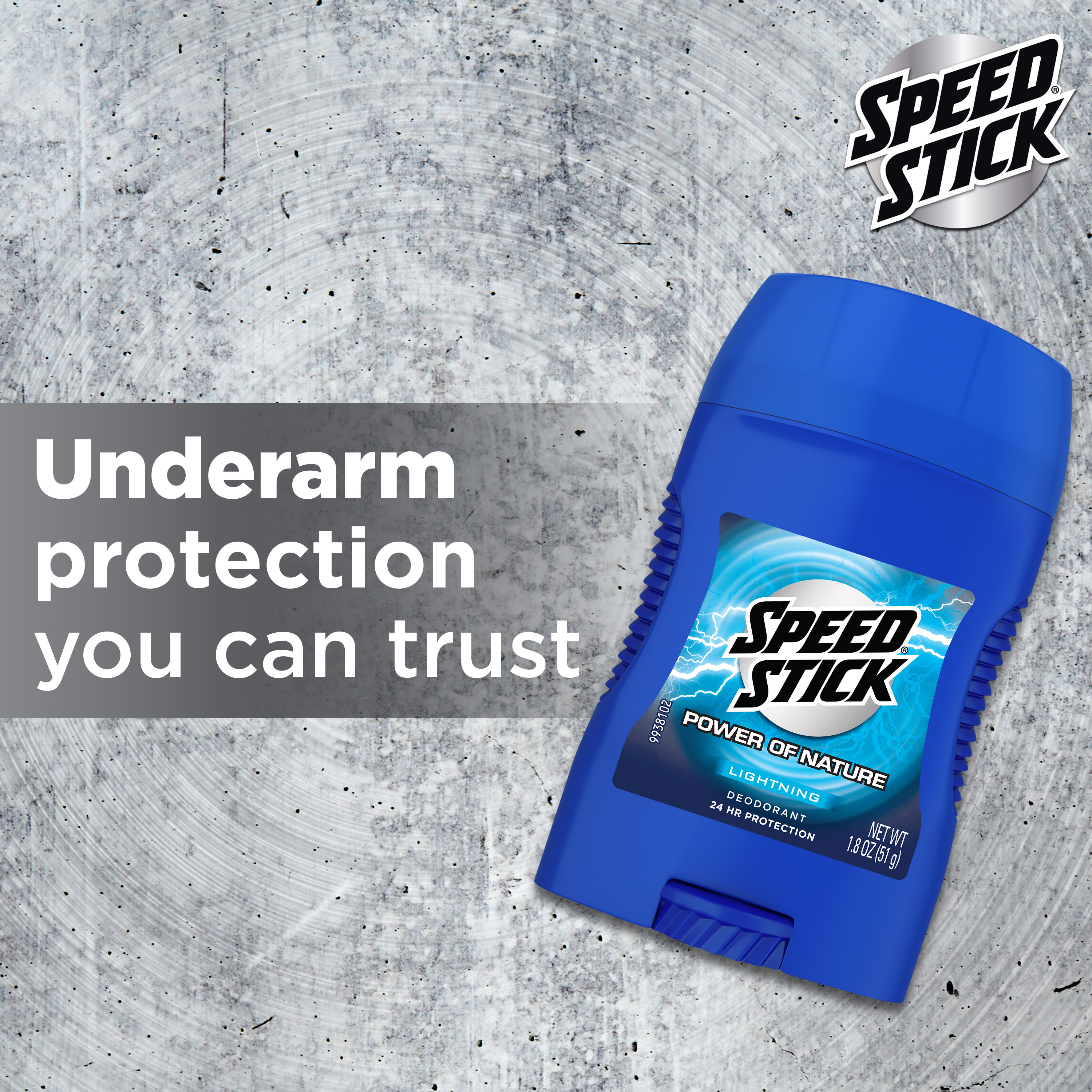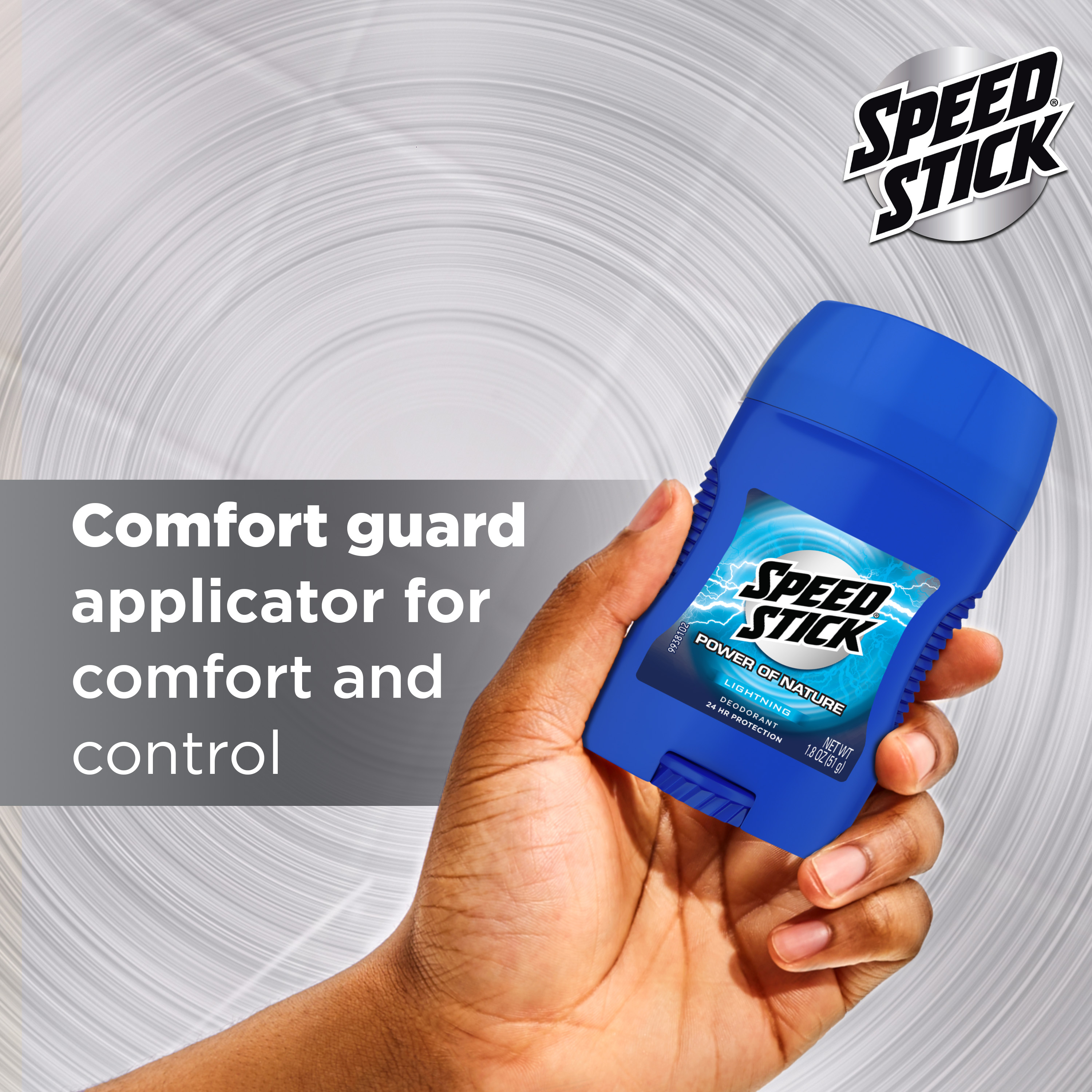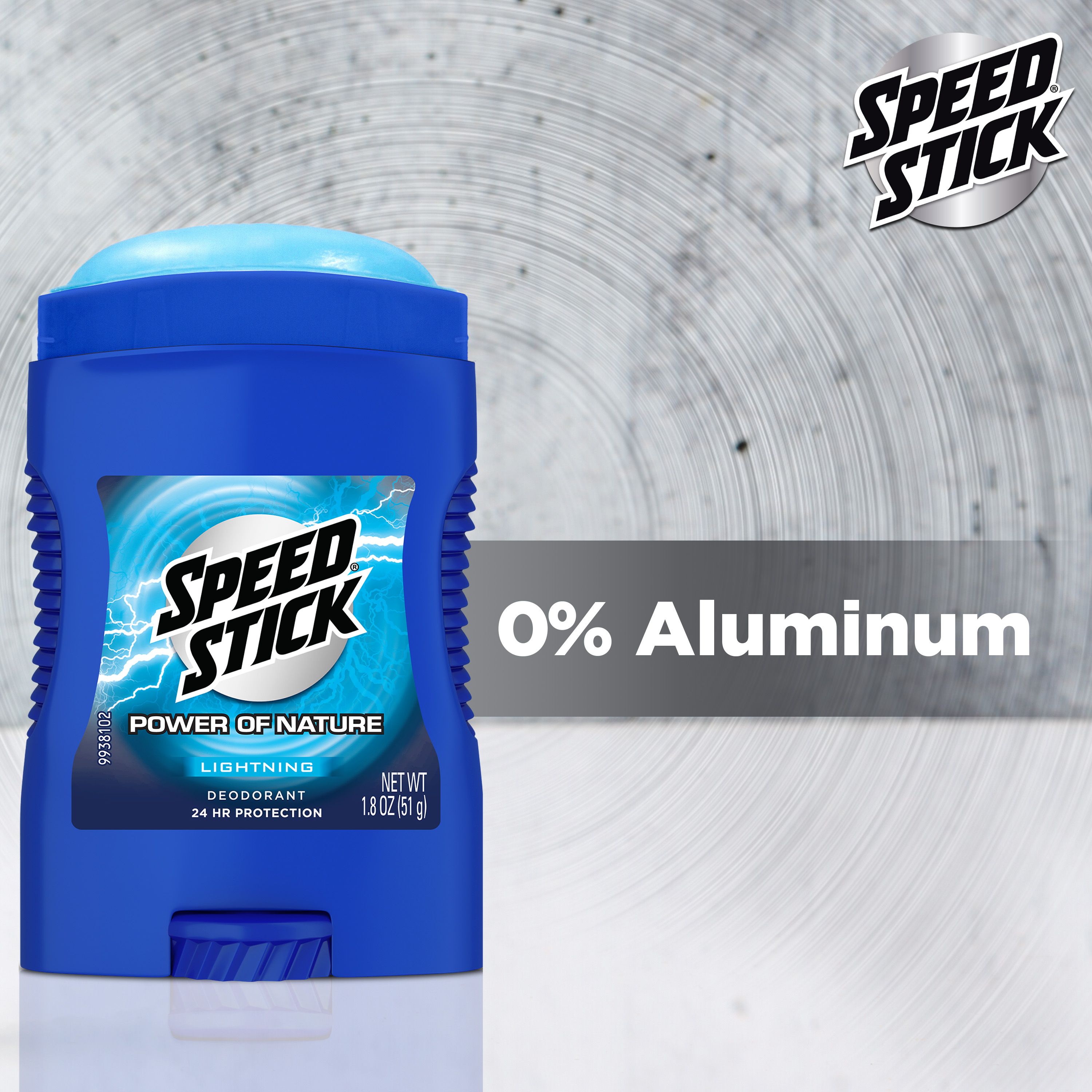 SKU 61047475 Consumer Unit - GTIN 00827854021124 Case - GTIN 10827854021121 Product Category Personal Care Product Sub Category AP > Deo Product Equity (Brand) Mennen Speed Stick Product Sub Brand Mennen Speed Stick Power of Nature AP/De Product Title Speed Stick Power of Nature Lightning Deodorant for Men, Aluminum Free, 24 Hour Protection, Comfort Guard Applicator, 1.8 oz Deodorant Stick Product Description Feel clean, masculine, and confident all day with Speed Stick Power of Nature Lightning Deodorant. This aluminum free deodorant for men provides 24 hour odor-fighting protection, keeping you at your best from morning till night. Whether you're powering through a workout, handling a busy day at the office, or enjoying an evening out, Speed Stick has you covered with long-lasting freshness. The nature-inspired scent enhances your well-being, adding a sense of assurance to your routine. For your comfort and control, Speed Stick Deodorant includes a comfort guard applicator. This thoughtful addition ensures a smooth and precise application process, allowing you to glide through your grooming routine effortlessly. The ergonomic design fits comfortably in your hand, providing an even and consistent application every time. Embrace the power of nature with Speed Stick Power of Nature Lightning and feel fresh and ready for anything the day brings. eCommerce Copy- Long Description Feel clean, masculine, and confident all day with Speed Stick Power of Nature Lightning Deodorant. This aluminum free deodorant for men provides 24 hour odor-fighting protection, keeping you at your best from morning till night. Whether you're powering through a workout, handling a busy day at the office, or enjoying an evening out, Speed Stick has you covered with long-lasting freshness. The nature-inspired scent enhances your well-being, adding a sense of assurance to your routine. For your comfort and control, Speed Stick Deodorant includes a comfort guard applicator. This thoughtful addition ensures a smooth and precise application process, allowing you to glide through your grooming routine effortlessly. The ergonomic design fits comfortably in your hand, providing an even and consistent application every time. Embrace the power of nature with Speed Stick Power of Nature Lightning and feel fresh and ready for anything the day brings. Bullet 1 One 1.8 oz stick of Speed Stick Power of Nature Lightning Deodorant for Men Bullet 2 Feel clean, masculine, and confident with Speed Stick for men Bullet 3 This underarm deodorant for men keeps you feeling fresh all day Bullet 4 Odor fighting formula provides 24 hour freshness for maximum confidence and sweat protection Bullet 5 Our aluminum free deodorant helps eliminate odors to enhance your overall well-being Bullet 6 For your comfort and control, our men's deodorant includes a unique comfort guard applicator, ensuring a smooth and precise application process, allowing you to glide through your grooming routine effortlessly