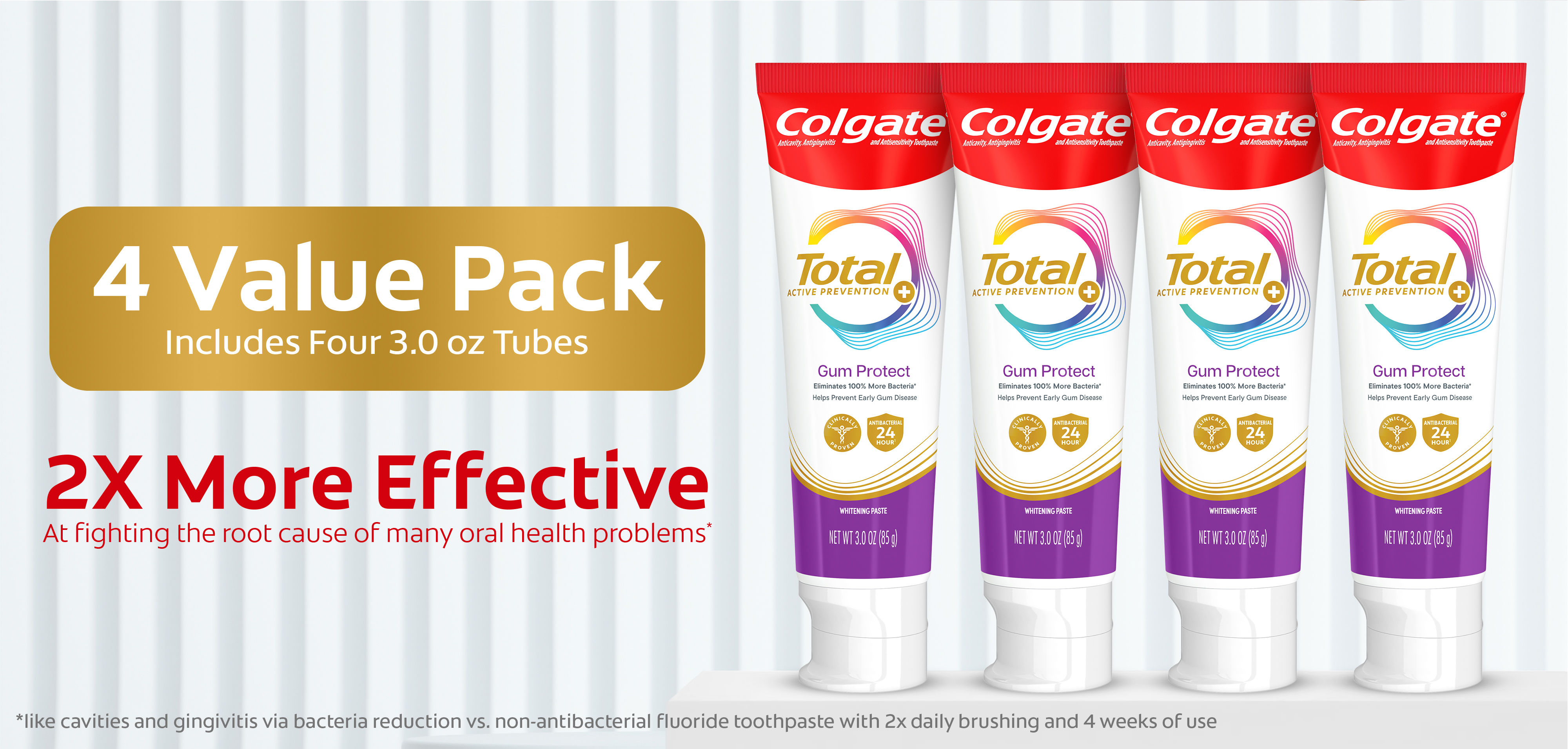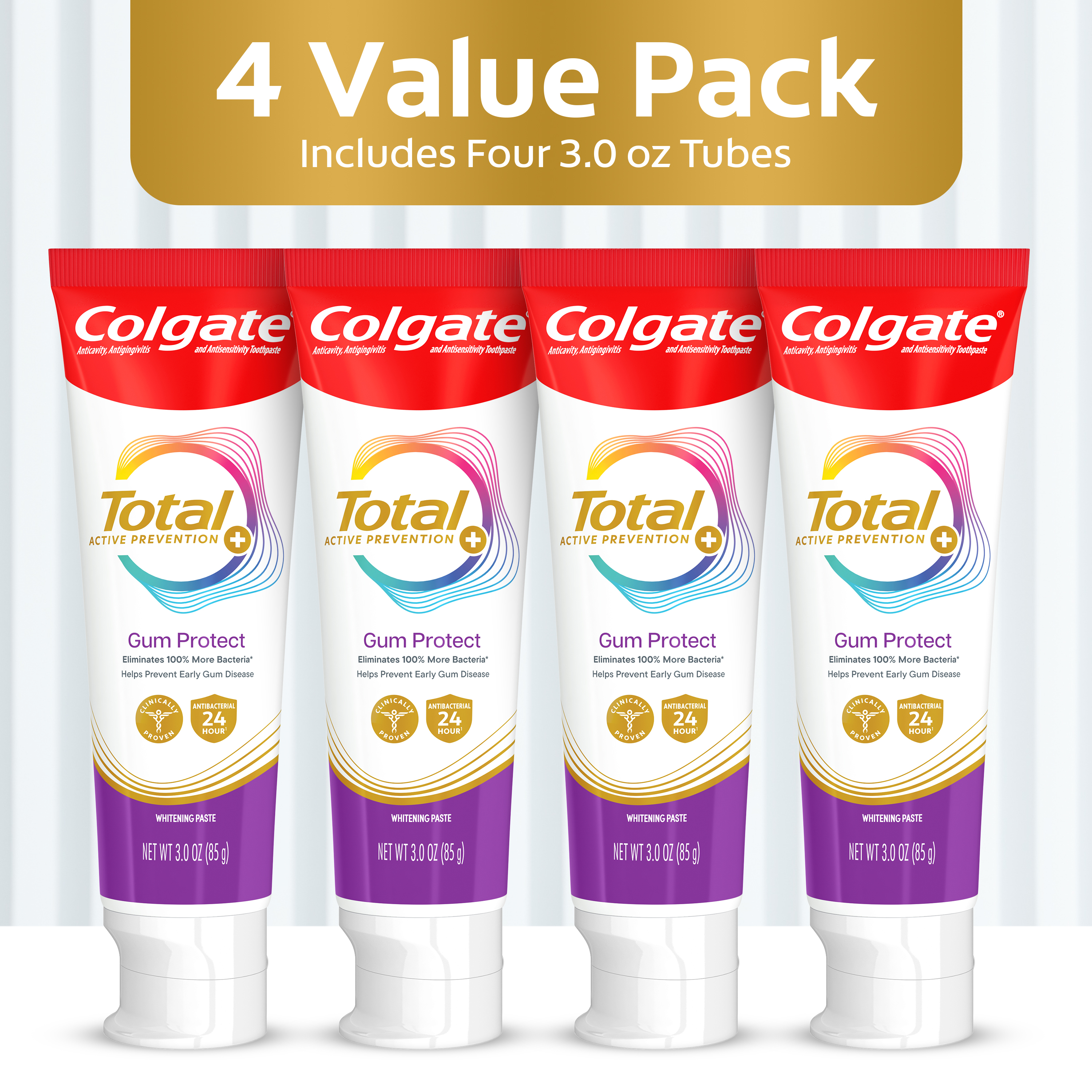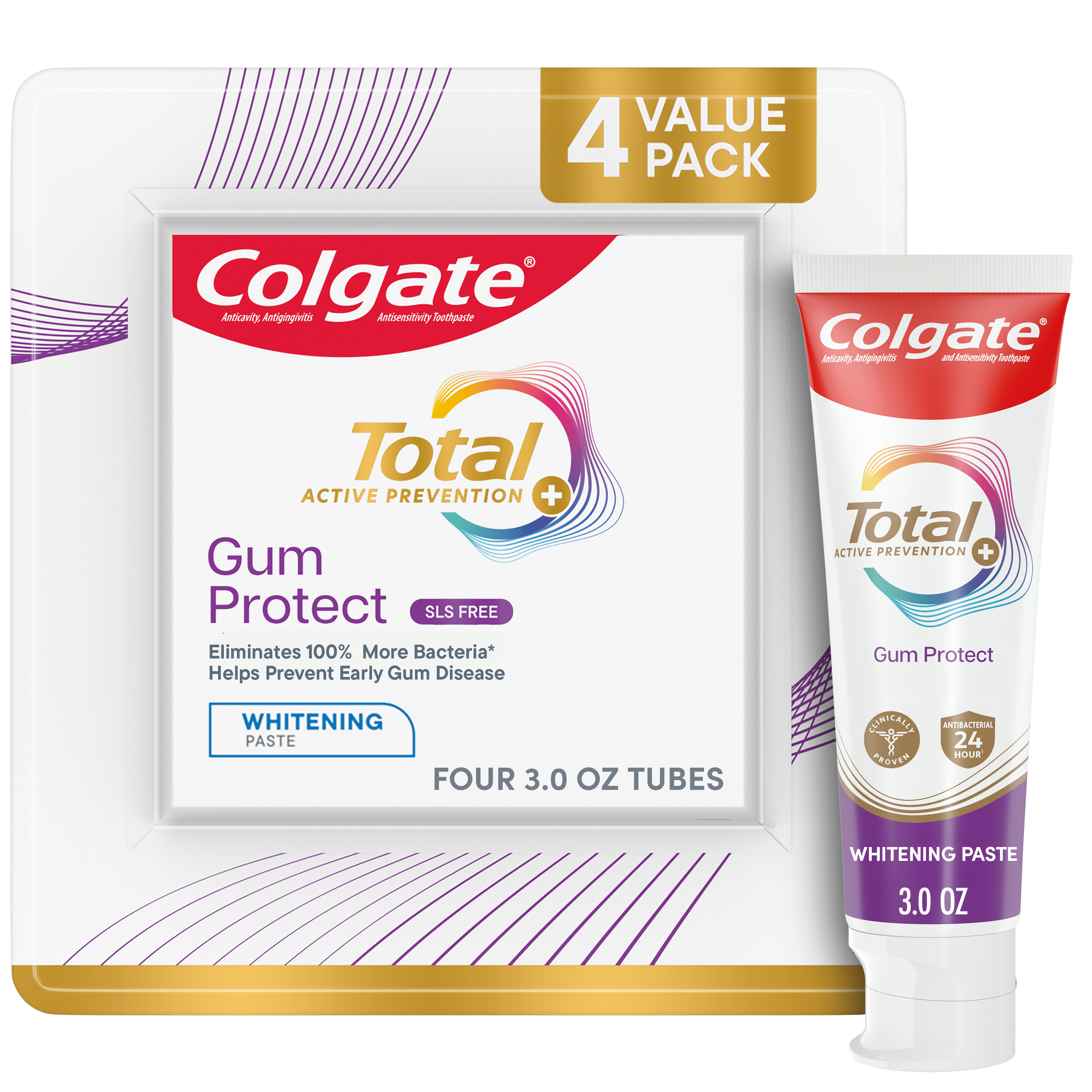 SKU 61047690 Consumer Unit - GTIN 00827854021353 Case - GTIN 10827854021350 Product Category Oral Care Product Sub Category Toothpaste Product Equity (Brand) Colgate Product Sub Brand Colgate Total TP Product Title Colgate Total Gum Protect Whitening Toothpaste, Fresh Mint Paste, 3.0 oz., 4 pk. Product Description Help protect your gum health with Colgate Total Active Prevention Gum Protect Whitening Toothpaste. Colgate Total Gum Protect Toothpaste is a gum protection toothpaste designed with patented technology that helps prevent the 5 signs of early gum disease including gum inflammation, redness, bleeding gums, irritation, and gum sensitivity. Colgate Total Gum Protect Antibacterial Toothpaste eliminates 100% more bacteria* and is an SLS free toothpaste. The rich, dense foam of the SLS free toothpaste offers robust coverage for those focused on gum care and helps prevent early gum disease. Colgate Total Active Prevention Gum Protect Toothpaste is more than just an early gum disease toothpaste, this fluoride formulated anti gingivitis toothpaste also helps fight bad breath, cavities, plaque bacteria, and gingivitis. It’s a great sensitive gum toothpaste for anyone focused on gum care or who has experienced gingivitis in the past. In addition, this whitening mint toothpaste is 2x more effective at fighting bacteria**, a root cause of many common oral care problems such as cavities and gingivitis. Feel secure knowing that Colgate Total Active Prevention Gum Protect Gum Health Toothpaste has your gum care needs covered for a healthy and confident smile. *plaque bacteria vs. a non-antibacterial fluoride toothpaste with 2x daily brushing and 4 weeks use **vs. non-antibacterial fluoride toothpaste with 2x daily brushing and 4 weeks of use eCommerce Copy- Long Description Colgate Total Gum Protect features an SLS free formula and is specifically formulated to be gentle on gums. The rich, dense foam offers robust coverage for those focused on gum care. Plus, this gum care toothpaste eliminates 100% more bacteria* to help prevent signs** of early gum disease. Colgate Total Active Prevention Gum Protect Toothpaste is more than just a gum toothpaste—it also helps fight bad breath, cavities, plaque bacteria, and gingivitis. This whitening/mint toothpaste is also 2x more effective at fighting bacteria*, a root cause of many common oral care problems**. Feel secure knowing that Colgate Total Active Prevention Gum Protect Toothpaste has your gum care needs covered for a healthy and confident smile. *plaque bacteria vs. a non antibacterial fluoride toothpaste after 4 weeks of twice daily use **such as cavities and gingivitis Bullet 1 Protects from gum inflammation, redness, bleeding, irritation, and sensitivity Bullet 2 Fresh Mint Paste flavor helps tackle bad breath Bullet 3 Includes four (4) 3.0 oz tubes of Colgate Total Gum Protect Whitening Toothpaste Bullet 4 2X more effective at fighting bacteria* to support healthy gums Bullet 5 SLS free formula is specifically formulated to be gentle on gums