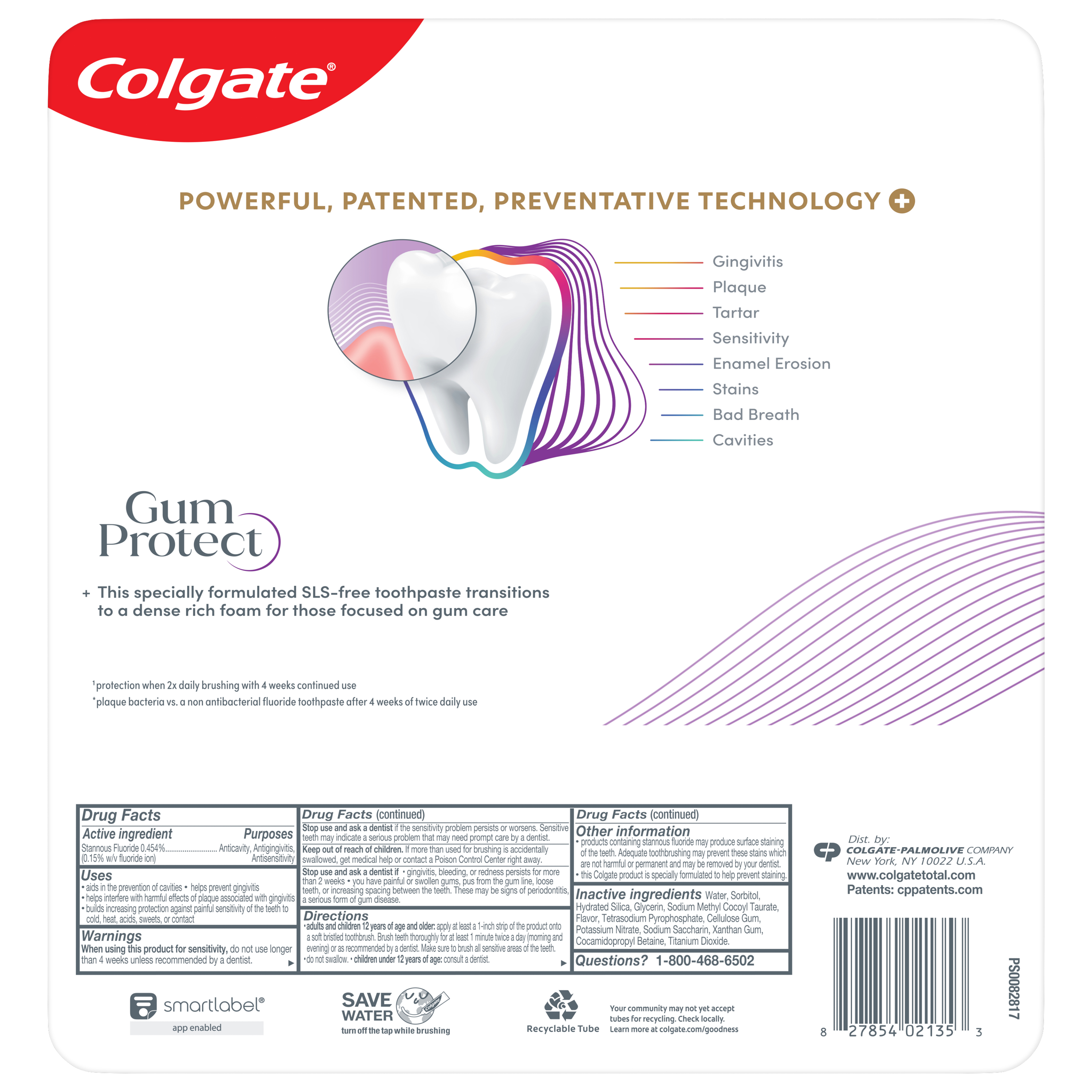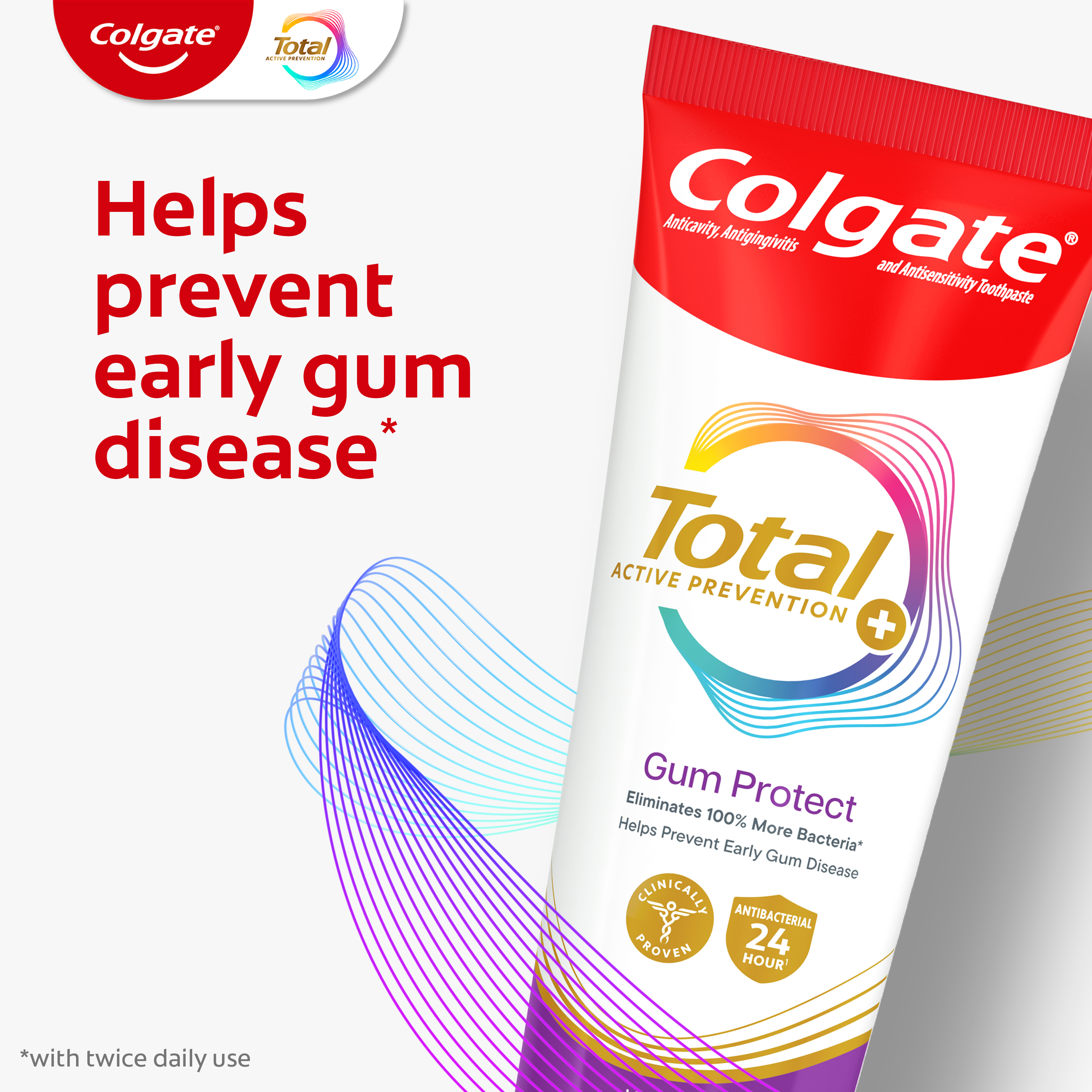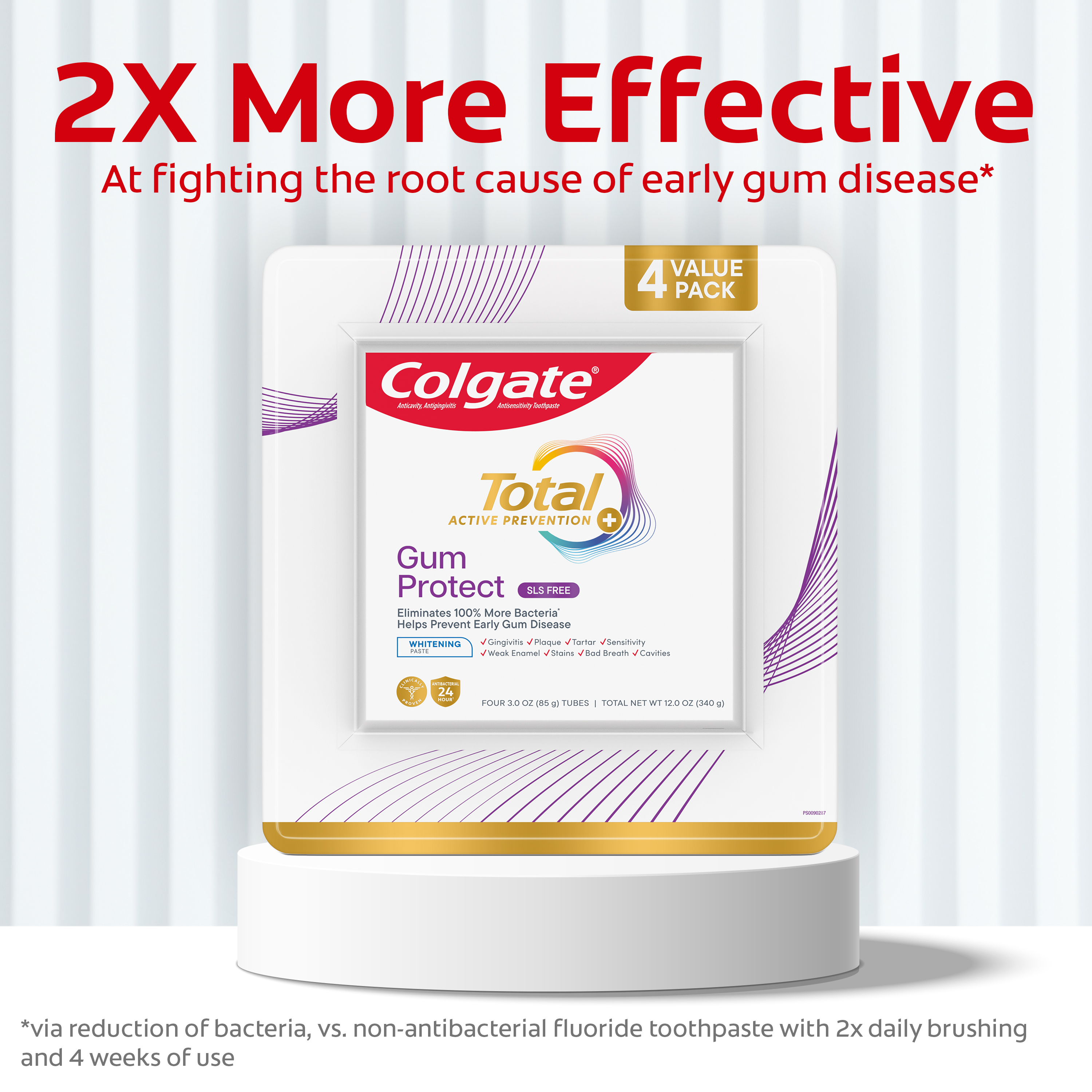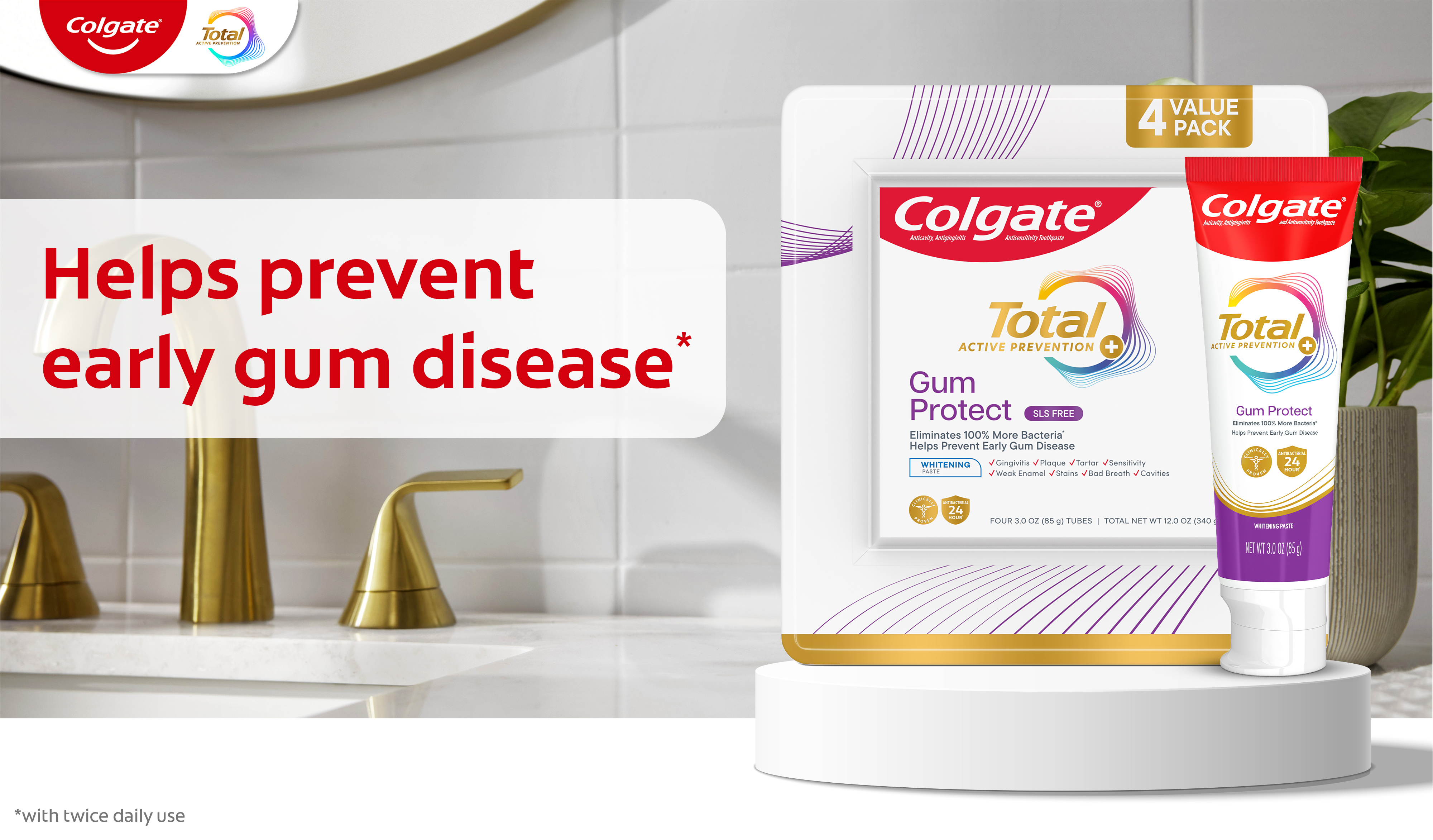 SKU 61047690 Consumer Unit - GTIN 00827854021353 Case - GTIN 10827854021350 Product Category Oral Care Product Sub Category Toothpaste Product Equity (Brand) Colgate Product Sub Brand Colgate Total TP Product Title Colgate Total Gum Protect Whitening Toothpaste, Fresh Mint Paste, 3.0 oz., 4 pk. Product Description Help protect your gum health with Colgate Total Active Prevention Gum Protect Whitening Toothpaste. Colgate Total Gum Protect Toothpaste is a gum protection toothpaste designed with patented technology that helps prevent the 5 signs of early gum disease including gum inflammation, redness, bleeding gums, irritation, and gum sensitivity. Colgate Total Gum Protect Antibacterial Toothpaste eliminates 100% more bacteria* and is an SLS free toothpaste. The rich, dense foam of the SLS free toothpaste offers robust coverage for those focused on gum care and helps prevent early gum disease. Colgate Total Active Prevention Gum Protect Toothpaste is more than just an early gum disease toothpaste, this fluoride formulated anti gingivitis toothpaste also helps fight bad breath, cavities, plaque bacteria, and gingivitis. It’s a great sensitive gum toothpaste for anyone focused on gum care or who has experienced gingivitis in the past. In addition, this whitening mint toothpaste is 2x more effective at fighting bacteria**, a root cause of many common oral care problems such as cavities and gingivitis. Feel secure knowing that Colgate Total Active Prevention Gum Protect Gum Health Toothpaste has your gum care needs covered for a healthy and confident smile. *plaque bacteria vs. a non-antibacterial fluoride toothpaste with 2x daily brushing and 4 weeks use **vs. non-antibacterial fluoride toothpaste with 2x daily brushing and 4 weeks of use eCommerce Copy- Long Description Colgate Total Gum Protect features an SLS free formula and is specifically formulated to be gentle on gums. The rich, dense foam offers robust coverage for those focused on gum care. Plus, this gum care toothpaste eliminates 100% more bacteria* to help prevent signs** of early gum disease. Colgate Total Active Prevention Gum Protect Toothpaste is more than just a gum toothpaste—it also helps fight bad breath, cavities, plaque bacteria, and gingivitis. This whitening/mint toothpaste is also 2x more effective at fighting bacteria*, a root cause of many common oral care problems**. Feel secure knowing that Colgate Total Active Prevention Gum Protect Toothpaste has your gum care needs covered for a healthy and confident smile. *plaque bacteria vs. a non antibacterial fluoride toothpaste after 4 weeks of twice daily use **such as cavities and gingivitis Bullet 1 Protects from gum inflammation, redness, bleeding, irritation, and sensitivity Bullet 2 Fresh Mint Paste flavor helps tackle bad breath Bullet 3 Includes four (4) 3.0 oz tubes of Colgate Total Gum Protect Whitening Toothpaste Bullet 4 2X more effective at fighting bacteria* to support healthy gums Bullet 5 SLS free formula is specifically formulated to be gentle on gums