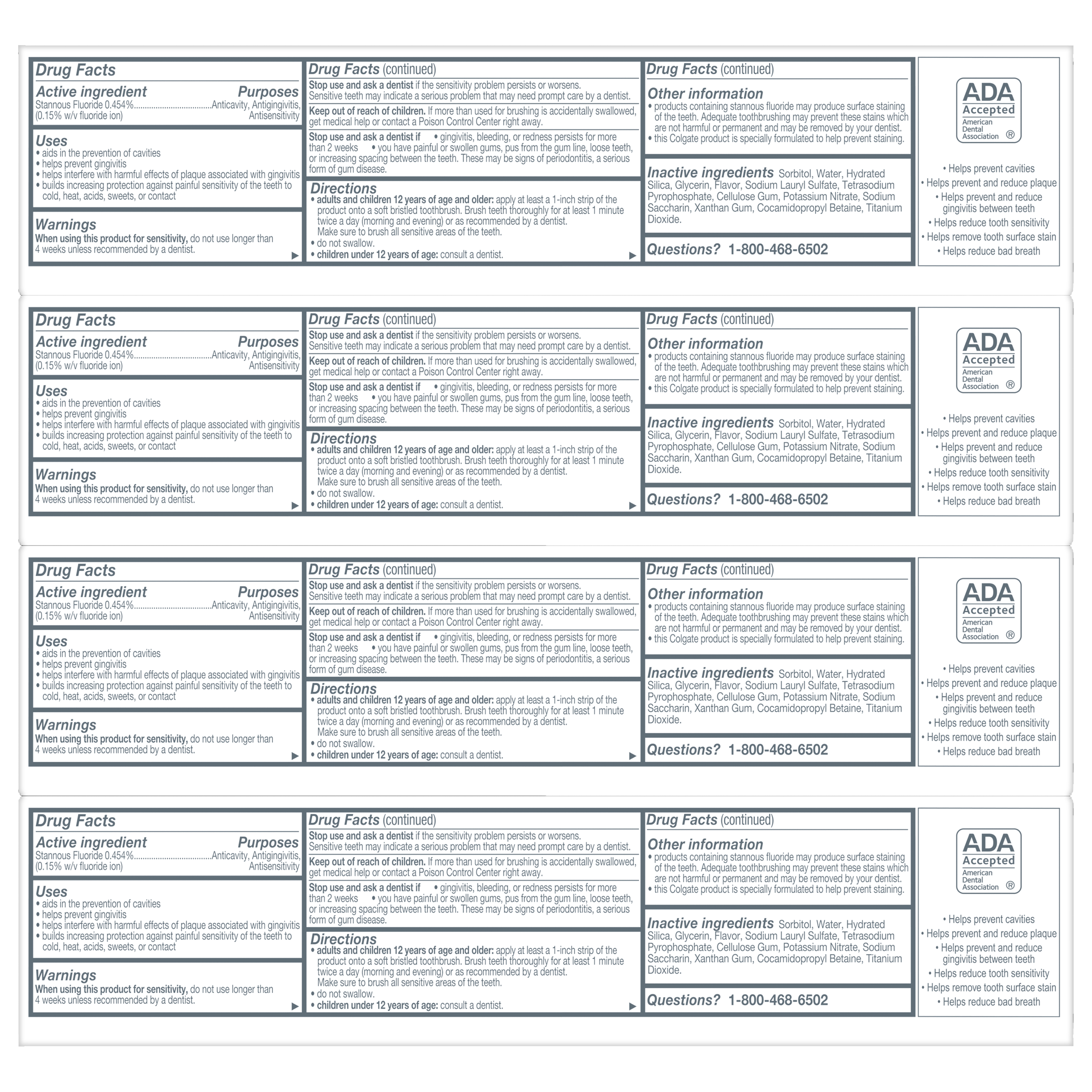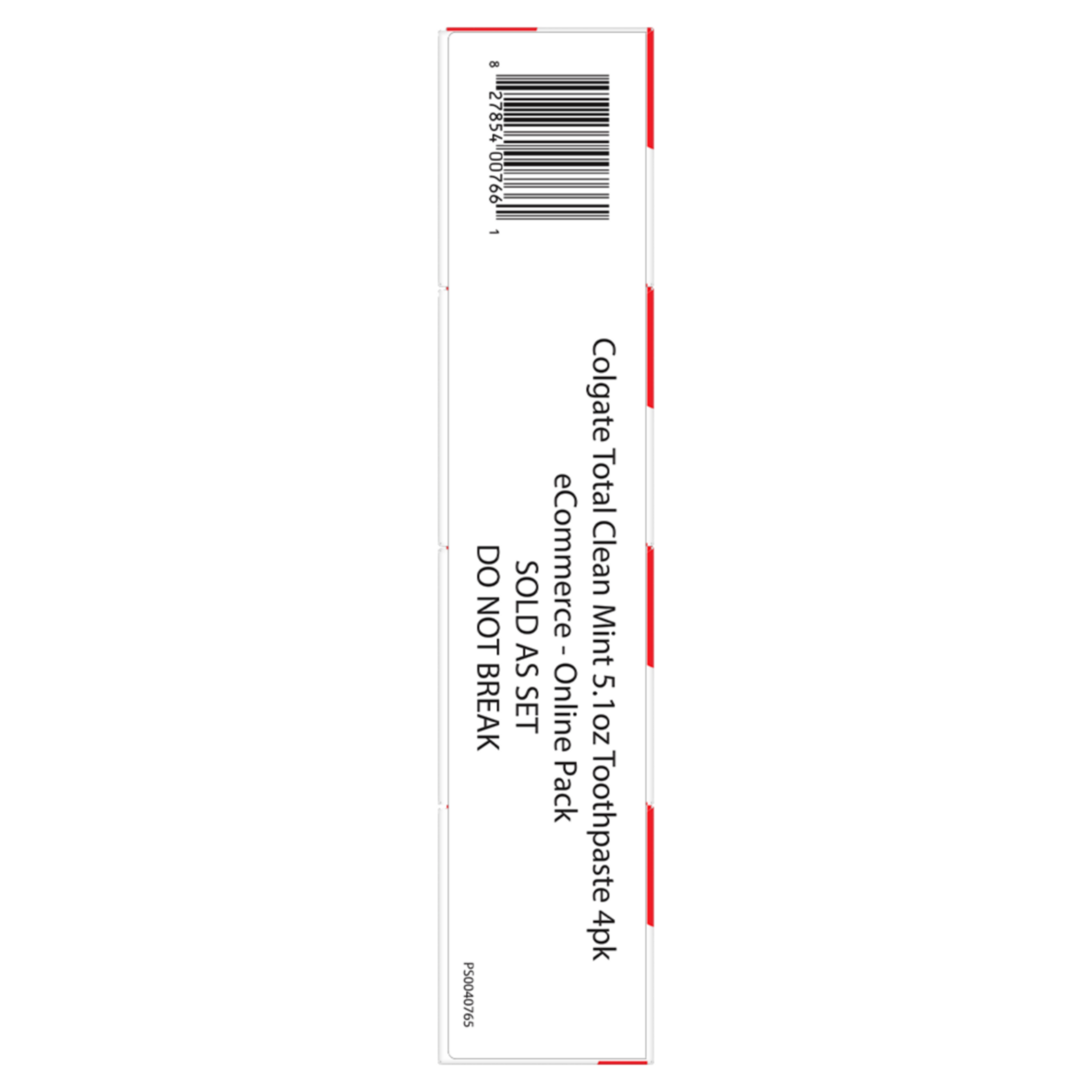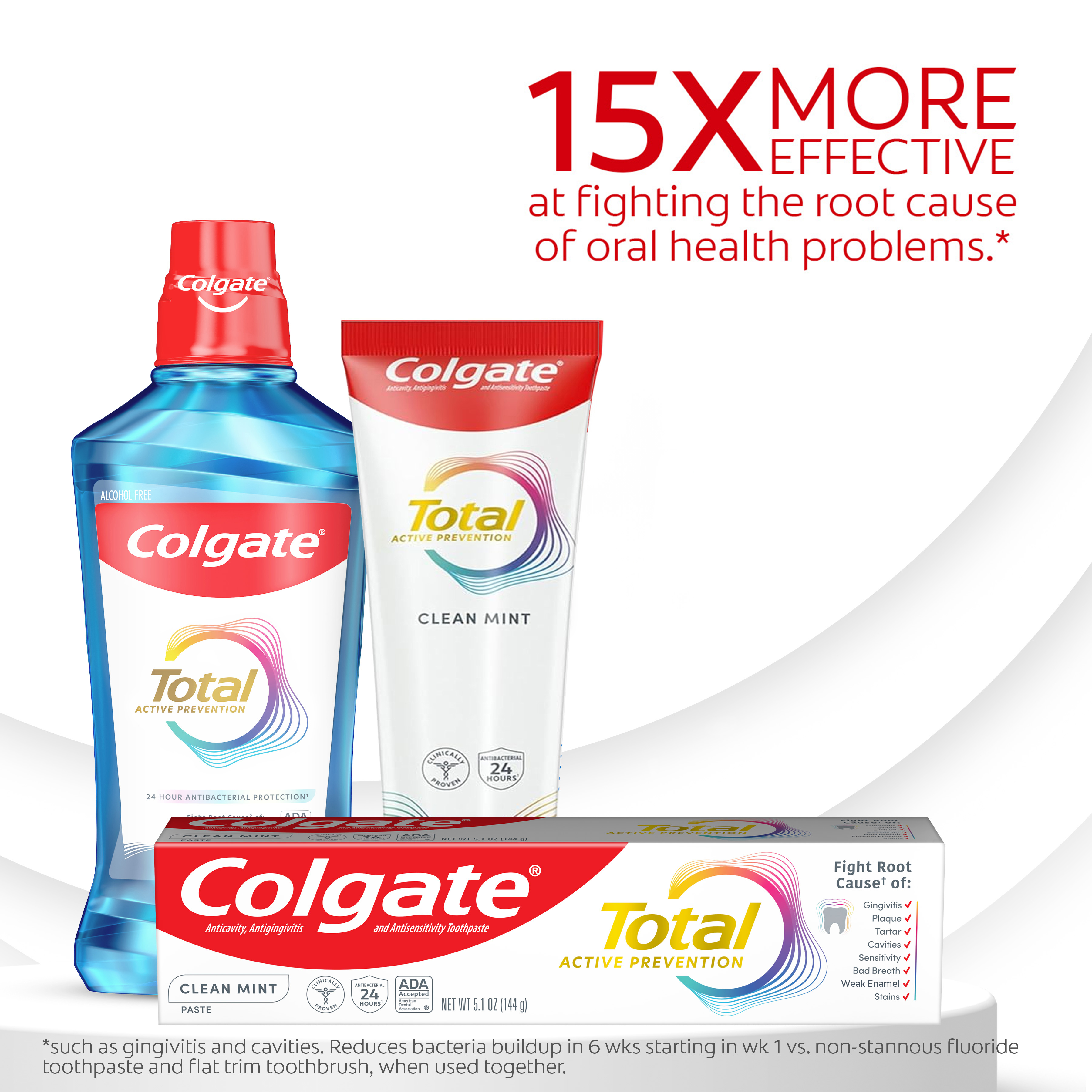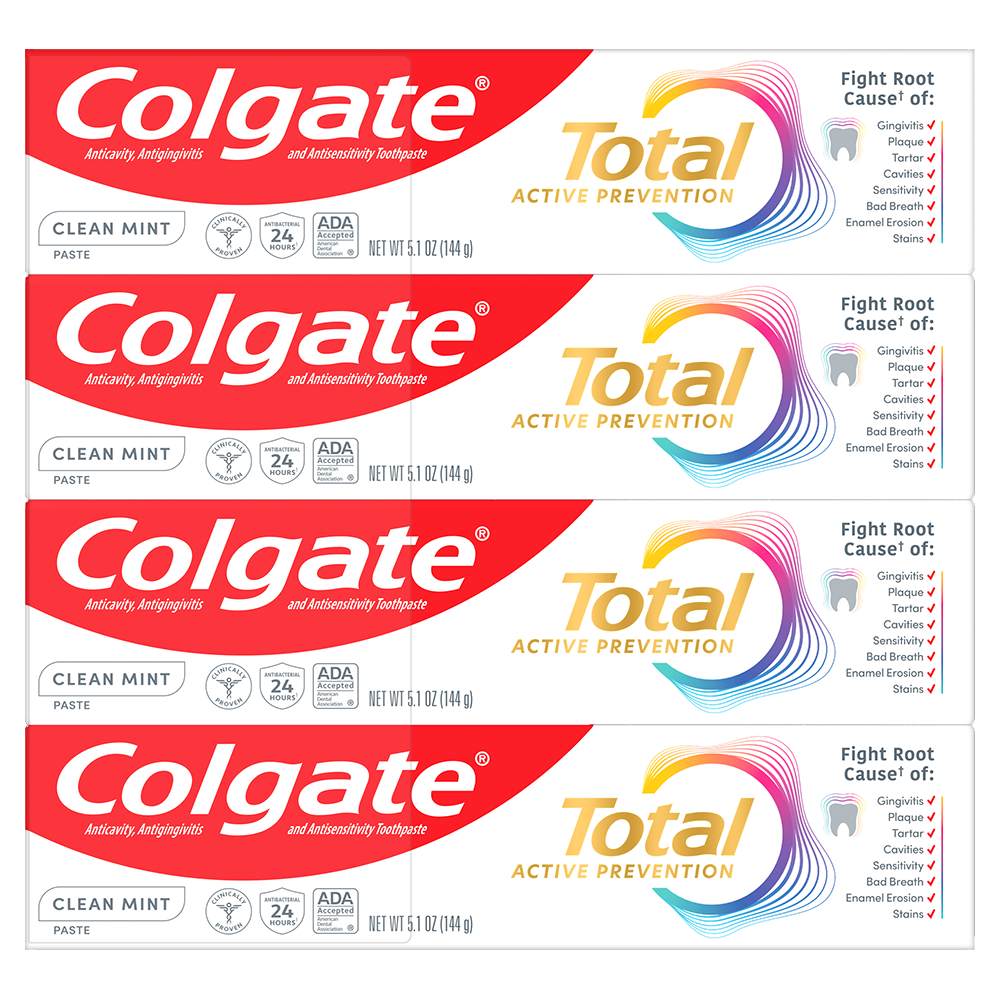 SKU 61047984 Consumer Unit - GTIN 00827854007661 Case - GTIN 10827854007668 Product Category Oral Care Product Sub Category Toothpaste Product Equity (Brand) Colgate Product Sub Brand Colgate Total TP Product Title Colgate Total Active Prevention Clean Mint Toothpaste, 4 Pack, 5.1 oz Product Description Help stop oral health problems* before they start with this Colgate Total Active Prevention Clean Mint Toothpaste Pack. This anticavity toothpaste fights bacteria, the root cause of many oral health issues such as gingivitis, plaque, tartar, sensitivity, bad breath, and cavities. This science-backed fluoride toothpaste uses a unique, clinically-proven stannous fluoride formula to help fight plaque bacteria. In addition, this mint toothpaste uses fresh, high-impact peppermint with nuances of warm spice notes to provide a modern cooling effect and helps minimize bad breath. Colgate Total Active Prevention Clean Mint Fluoride Toothpaste can help improve your oral health by tackling many oral health issues* before they begin. This Colgate Total anticavity toothpaste offers 24 hours of long-lasting antibacterial protection when brushing twice daily with 4 weeks of continued use. Feel secure knowing that Colgate Total Active Prevention Clean Mint Toothpaste has your cavity, gingivitis, and sensitivity prevention needs covered for a healthy and confident smile. *such as cavities and gingivitis **vs. non-antibacterial fluoride toothpaste with 3 months continued use Bullet 1 Includes four (4) 5.1 oz tubes of Colgate Total Active Prevention Clean Mint Toothpaste Bullet 2 Fights bacteria, the root cause of oral health issues like gingivitis, plaque, tartar, sensitivity, bad breath, and cavities Bullet 3 This fluoride toothpaste pack uses a clinically proven formula to help stop oral health issues before they start* Bullet 4 The Clean Mint toothpaste formula helps freshen breath and removes surface stains Bullet 5 This anticavity toothpaste offers long-lasting 24 hours of antibacterial protection when brushing twice daily with 4 weeks of continued use Bullet 6 For superior performance** against sensitivity, plaque, gingivitis, and tartar, choose Colgate Total Active Prevention Toothpaste Amazon RPC B0BLWHGGTQ AMZ URL https://www.amazon.com/dp/B0BLWHGGTQ