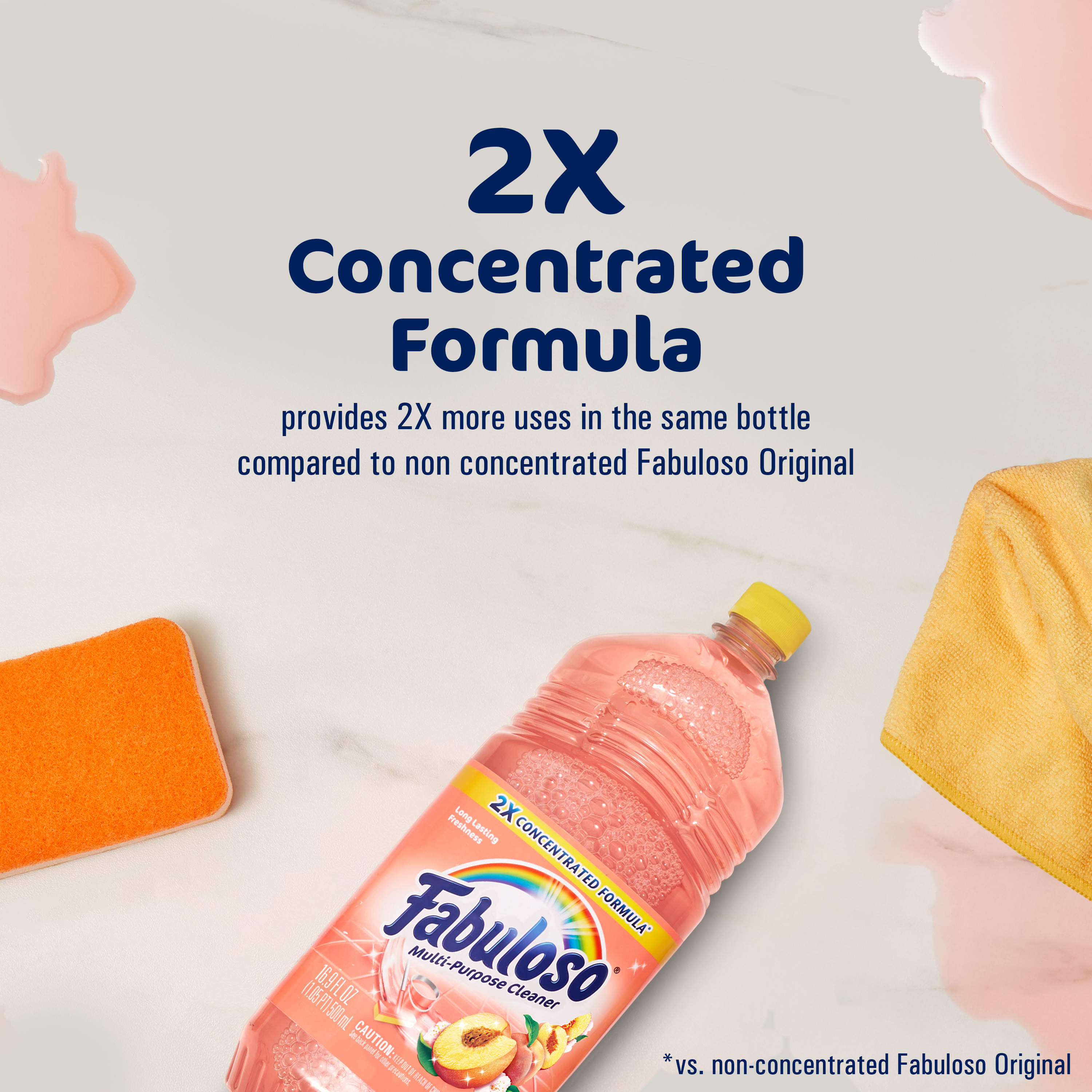 SKU 61048499 Consumer Unit - GTIN 00827854022145 Case - GTIN 10827854022142 Product Category Home Care Product Sub Category Cleaners Liquid / Gel Product Equity (Brand) Fabuloso Product Sub Brand Fabuloso Liq Cln Product Title Fabuloso Multi-Purpose Cleaner, 2X Concentrated Formula, Floor Cleaner, Peach Scent, 16.9 fl oz Product Description Fabuloso Multi-Purpose Cleaner is powerful and safe for multi-surfaces and cleans with a lasting scent. Fabuloso 2X concentrated formula provides 2X more uses in the same bottle compared to non-concentrated Fabuloso Original. Fabuloso 2X Peach fills your home with long-lasting freshness and a sparkling peach scent with notes of fresh-picked violet and coconut. It can be used as a kitchen cleaner and on a wide range of surfaces including sinks, toilets, tubs, showers, floors, sealed wood surfaces, appliances, counters, windows, mirrors, walls, doorknobs, and furniture. Fabuloso Multi-Purpose Cleaner also doubles as a powerful floor cleaner concentrate, making it perfect for tackling dirt and grime on a variety of floor surfaces with ease. Fabuloso’s 2X concentrated formula also acts as a no rinse floor cleaner, allowing you to clean floors effortlessly without leaving behind any residue when diluted per instructions. Our 2X concentrated formula provides 2X more uses and 2X more active ingredients vs. non-concentrated Fabuloso Original. Plus, by following dosing instructions, you can use 50% less plastic while enjoying twice as many uses from the same size bottle as Fabuloso Original. For best results, use Fabuloso cleaning products safely by following the label instructions. Mix 1/8 cup in a gallon of water or apply directly onto a sponge for a thorough clean. Bullet 1 One 16.9 fl oz bottle of Fabuloso 2X concentrated formula, Multi-purpose cleaner Bullet 2 A sparkling peach scent with notes of fresh-picked violet and coconut Bullet 3 Fabuloso 2X concentrated formula provides 2X more active ingredients compared to non-concentrated Fabuloso Original Bullet 4 Use Fabuloso as a bathroom cleaner, on sinks, toilets, tubs, showers, floors, sealed wood surfaces, appliances, counters, windows, mirrors, walls, doorknobs, and furniture Bullet 5 Powerful floor cleaner concentrate and no rinse floor cleaner tackles dirt on floors without leaving residue when diluted per instructions Bullet 6 Uses 50% less plastic by following dosing instructions and getting twice as many uses out of one bottle vs. same size of Fabuloso Original Bullet 7 Mix 1/8 cup in a gallon of water or pour on a sponge and clean Walmart RPC 12365007908 Walmart URL (Computed) https://www.walmart.com/ip/a/12365007908