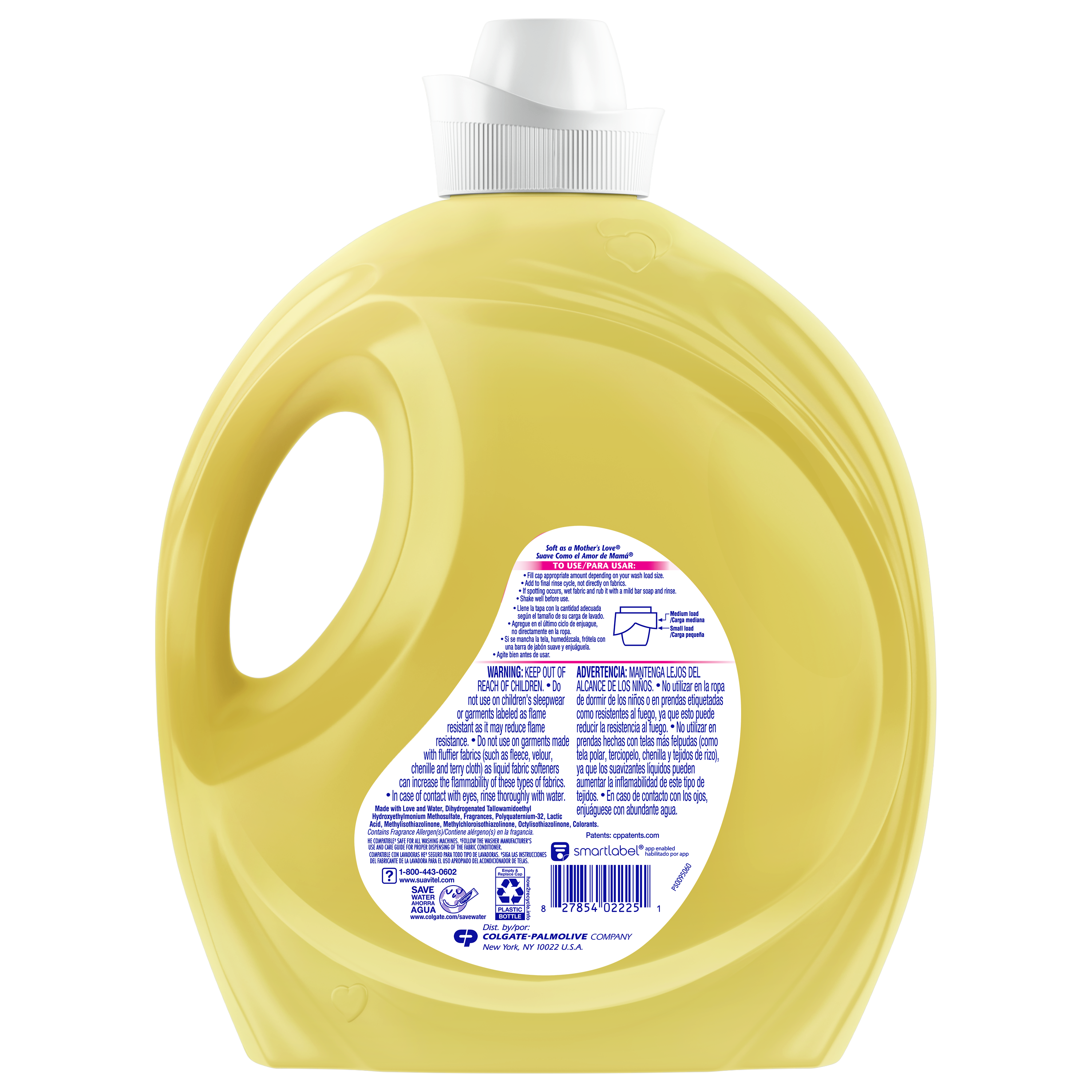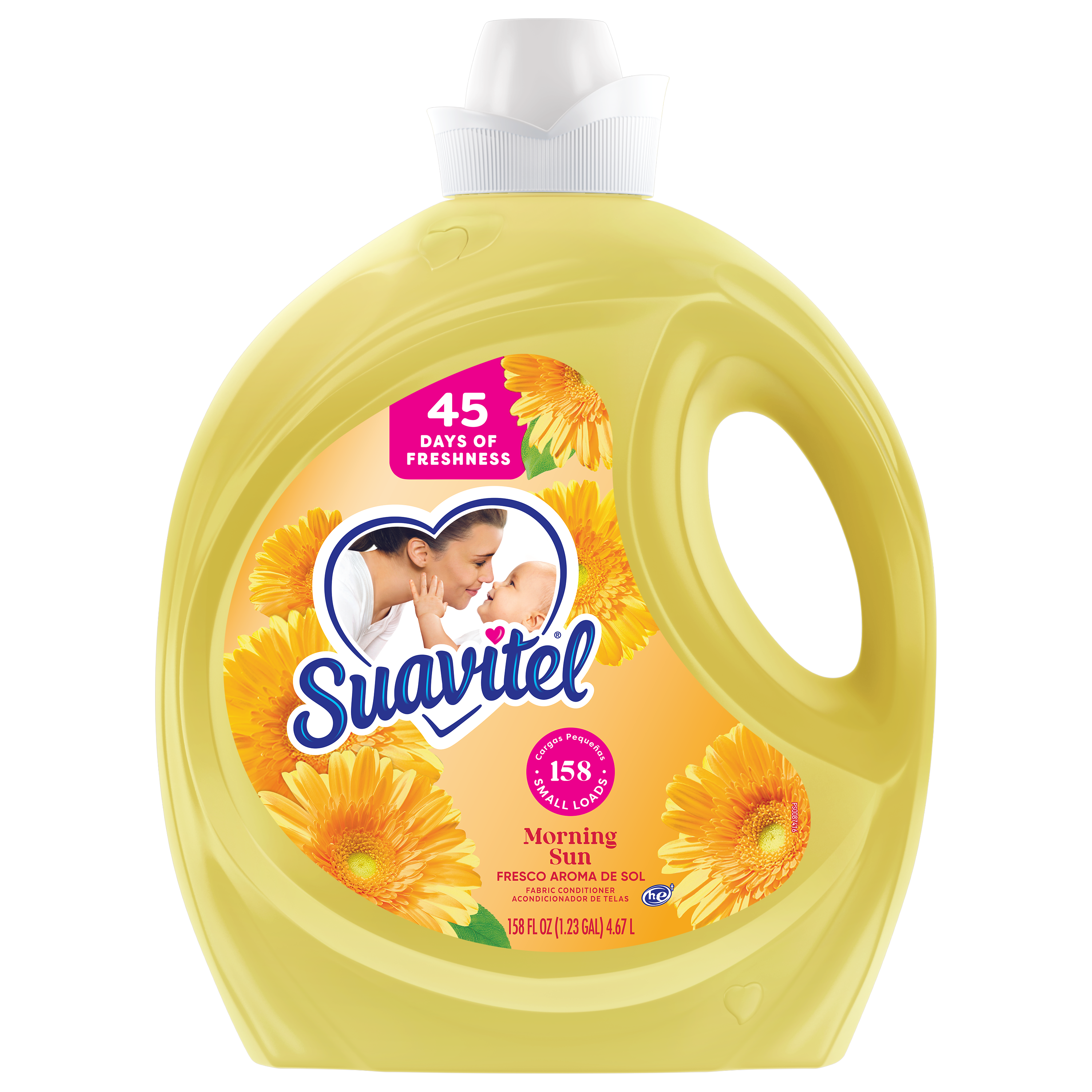 SKU 61048656 Consumer Unit - GTIN 00827854022251 Case - GTIN 10827854022258 Product Category Home Care Product Sub Category FC Liquids Product Equity (Brand) Suavitel Product Sub Brand Suavitel Liq FC Product Title Suavitel Fabric Conditioner, Liquid Fabric Softener, 45 Days of Freshness, HE Compatible, 158 Small Loads, Morning Sun Scent, 158 fl oz Bottle Product Description Suavitel Fabric Conditioner in Morning Sun scent is designed for busy households, with enough for 158 small loads to make frequent washing simple and convenient. Experience the light, fresh scent of a bright summer morning with every wash. Enjoy up to 45 days of freshness so your clothes, towels, and linens always smell clean and inviting between washes. Each load is wrapped in irresistible fragrance and incredible softness, leaving fabrics feeling luxuriously smooth. Our fabric softener is compatible with all washing machines, including HE models*. Suavitel cares gently for your family’s laundry and appliances. For best results, use 1 capful for small loads and more for larger loads or extra softness. Always add to the final rinse cycle, not directly on fabrics. If spotting occurs, treat with a mild bar soap and rinse. Shake well before use. Enjoy the comforting softness of a mother’s love with every wash. *Follow the washer manufacturer's use and care guide for proper dispensing of the fabric conditioner eCommerce Copy- Long Description Suavitel Complete Liquid Fabric Softener is the ideal solution for caring for your family’s clothes with ease. With fabric protection technology, this liquid fabric softener helps keep clothes looking newer longer* by providing color protection* and fewer wrinkles*. Enjoy irresistible softening and freshness in every load. Experience the light, fresh scent of a bright summer morning with every wash. Our fabric conditioner fights odors** so your clothes stay fresh and pleasant-smelling. This complete fabric care formula helps with easier stain removal* so you can tackle tough messes on your family’s laundry. Suavitel Complete is soft as a mother’s love and is compatible with all types of washing machines, including HE models***. Contains 0% parabens and phosphates and includes naturally inspired fragrances. To use, fill the cap with the appropriate amount depending on your wash load. Add to the final rinse cycle, not directly on fabrics. If spotting occurs, wet fabric and rub it with a mild bar soap and rinse. Shake well before use. Upgrade your laundry routine with long-lasting freshness and trusted care. *After 5 washes; tested on cotton and cotton polyester fabric; vs. detergent alone **Tested on cotton and cotton polyester fabric; vs. detergent alone; against body odor ***Follow the washer manufacturer's use and care guide for proper dispensing of the fabric conditioner Bullet 1 One 158 fl oz bottle of Suavitel Fabric Conditioner, Morning Sun Scent Bullet 2 Provides enough for 158 small loads making it ideal for regular household laundry needs and convenient for frequent washing Bullet 3 Enjoy 45 days of freshness so your clothes, towels, and linens smell clean and inviting between washes providing comfort in every wear Bullet 4 Experience the light, fresh scent of a bright summer morning with every wash Bullet 5 Compatible with all types of washing machines including HE models* for easy integration into your existing laundry routine Bullet 6 Safe for your family’s laundry and appliances Bullet 7 Providing the comforting softness of a mother’s love so every load receives gentle care and reliable fabric protection