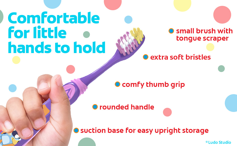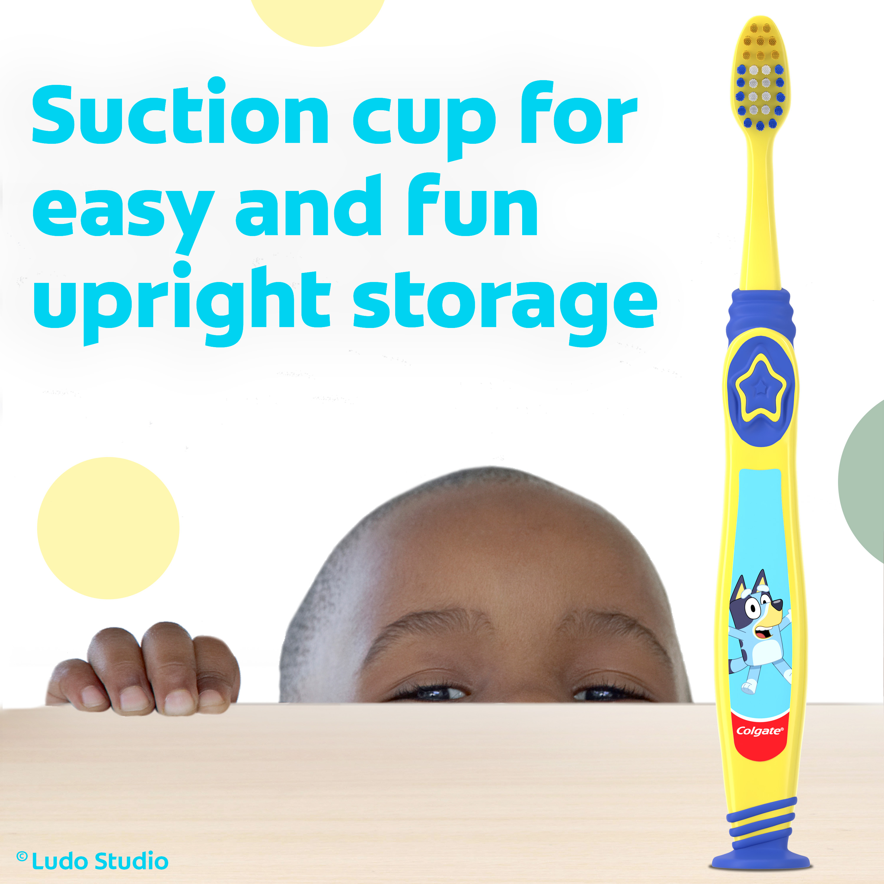 | Product Description | This six pack of Bluey themed Colgate Kids Toothbrushes with Extra Soft Bristles and Suction Cup is the perfect way to encourage good oral habits early on! Made for children 5 years and older, this Bluey kids toothbrush pack is great for children with baby teeth and adult teeth. Each brush has multi-height bristles for cleaning big and small teeth easily and a raised tip to clean hard-to-reach teeth. Brushing kids' teeth can be a completely new experience for both parents and children. So making the teeth brushing routine a positive experience right from the start is important. When letting your child hold their kids toothbrush to get used to it and try to brush their own teeth, the Colgate Extra Soft Toothbrush For Kids With Suction Cup is designed to make teeth brushing fun. This kids toothbrush features a small head for easy access to the child's mouth, a suction cup for easy and fun upright storage, and a thumb grip and rounded handle for a comfortable grip. |
