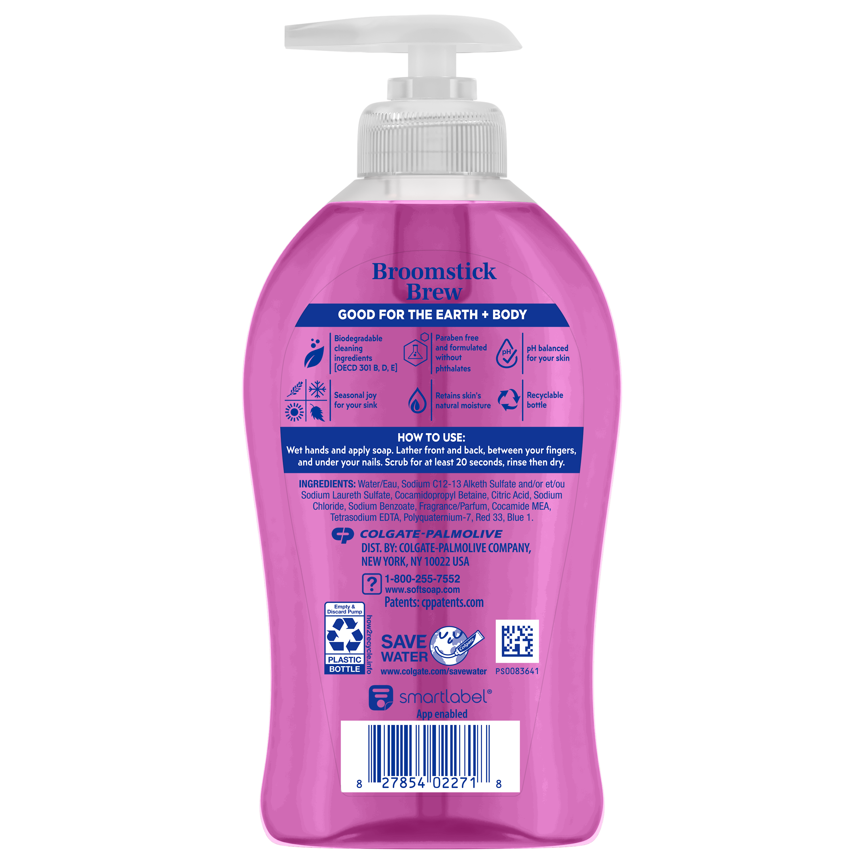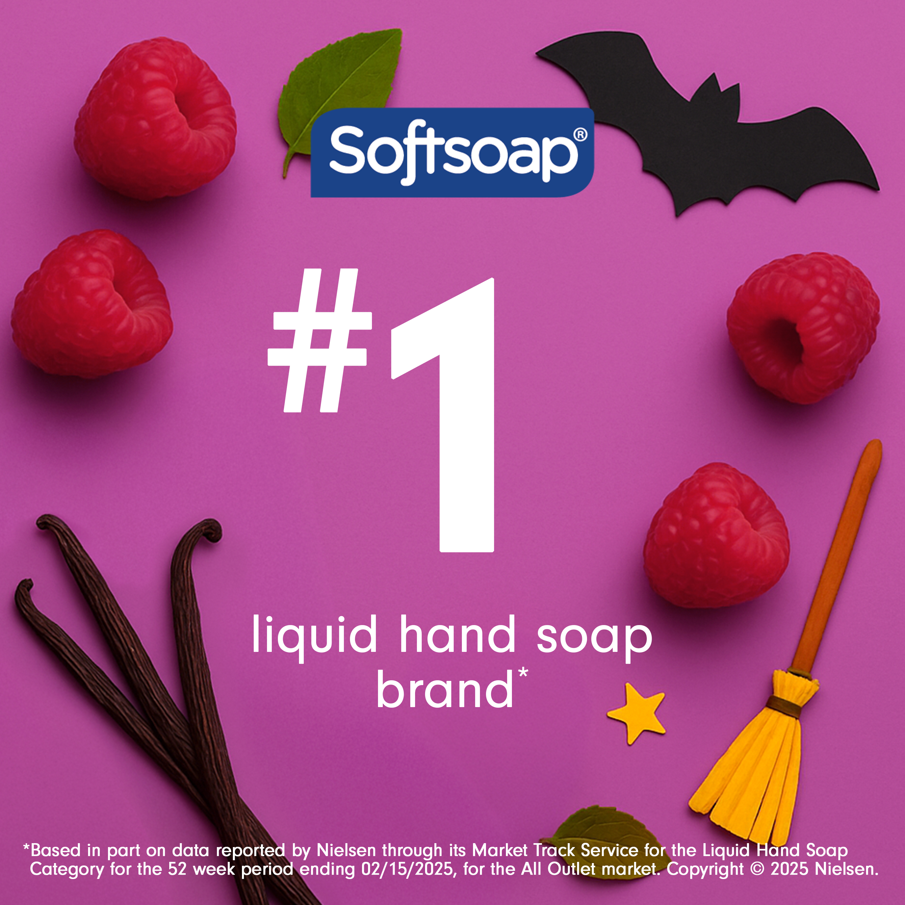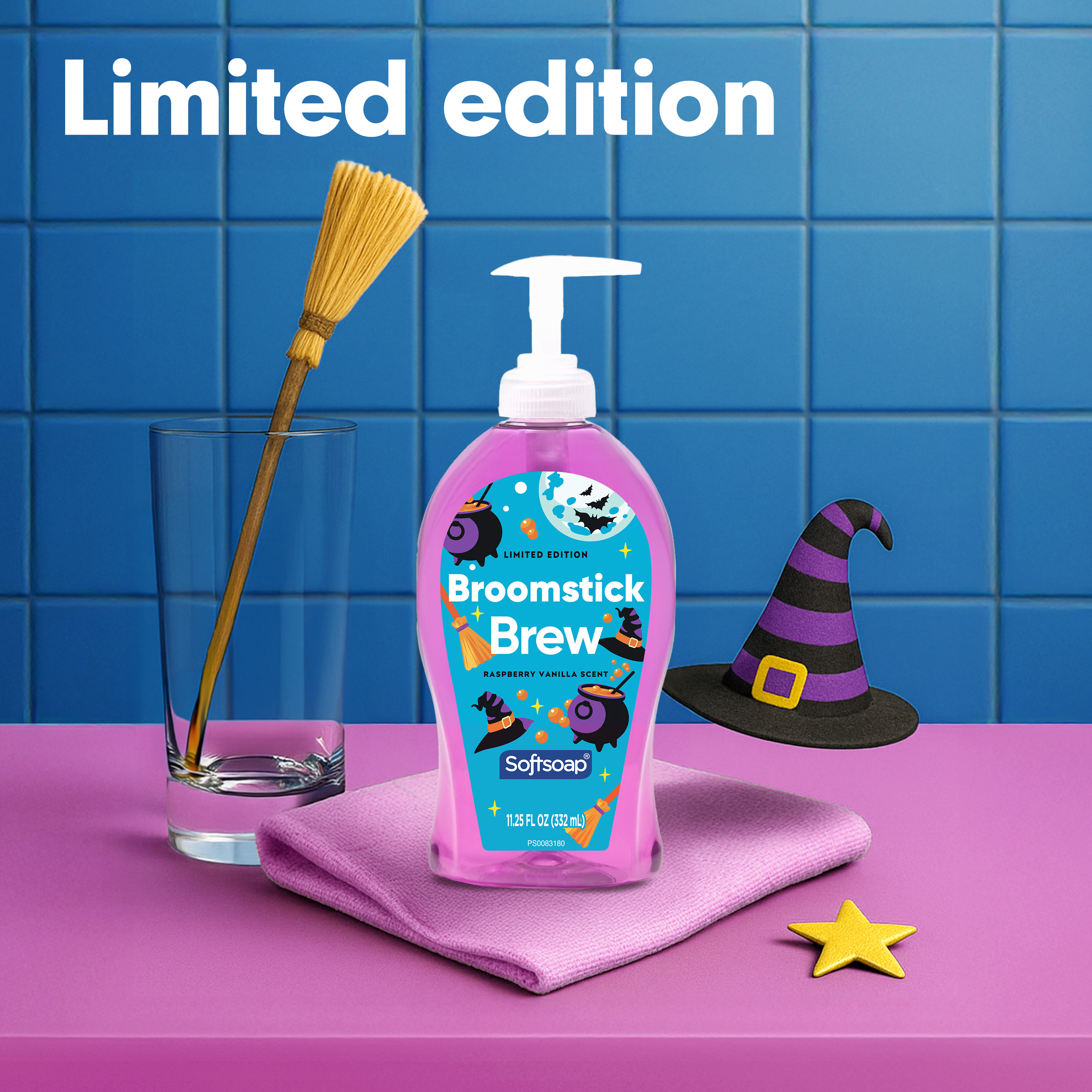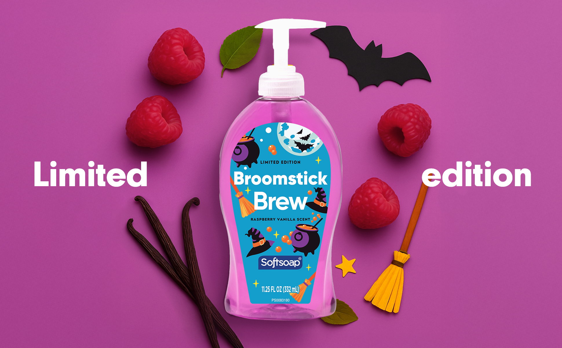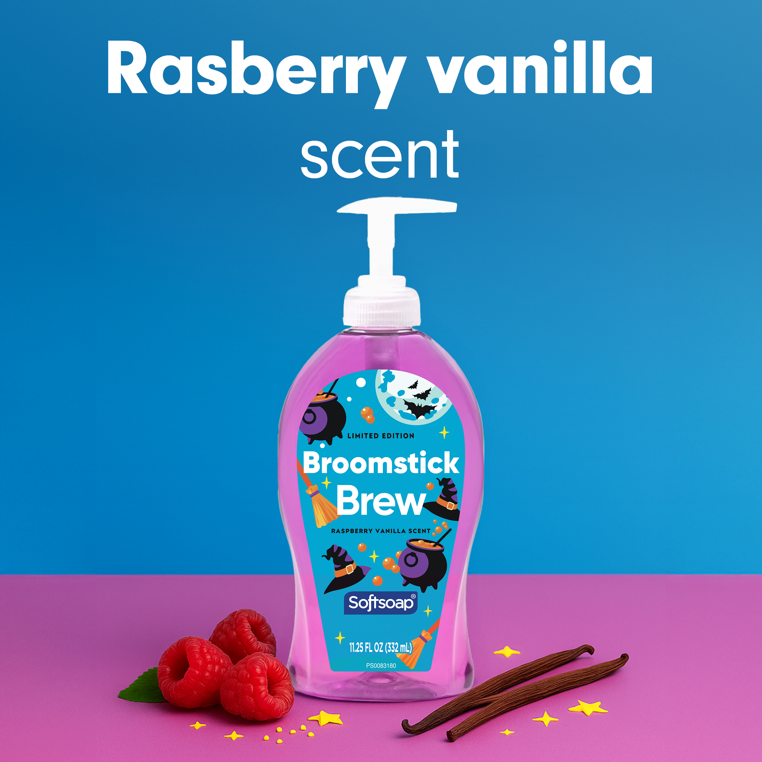 SKU 61049181 Consumer Unit - GTIN 00827854022718 Case - GTIN 10827854022715 Product Category Personal Care Product Sub Category Liquid Hand Wash Product Equity (Brand) Softsoap Product Sub Brand Softsoap LHW Product Title Softsoap Limited Edition Broomstick Brew Liquid Hand Soap, Kitchen and Bathroom Hand Soap, Raspberry Vanilla Scent, 11.25 fl oz Pump Bottle Product Description Brighten your daily routine with Softsoap’s Limited Edition Broomstick Brew Liquid Hand Soap. Softsoap is America's #1 Liquid Hand Soap brand (1), trusted to clean your hands since 1975. This purple hand soap with its Raspberry Vanilla scent blends sweet raspberries and creamy vanilla for a playful and cozy feel. Our scented hand soap helps retain skin’s natural moisture. This seasonal soap is paraben free and formulated without phthalates. Health care agencies recommend washing hands with soap and clean running water for 20 seconds to wash away dirt and bacteria. Versatile for any space, this fun and cute soap adds a touch of freshness to your sink this season. Don't miss the chance to make every hand wash a moment of happiness; grab yours while supplies last. (1) Based in part on data reported by Nielsen through its Market Track Service for the Liquid Hand Soap Category for the 52 week period ending 02/15/25, for the All Outlet market. Copyright © 2025 Nielsen Bullet 1 One 11.25 fl oz pump bottle of Softsoap Limited Edition Broomstick Brew Liquid Hand Soap, Raspberry Vanilla Scent Bullet 2 Softsoap is America's #1 Liquid Hand Soap brand (1), trusted to clean your hands since 1975 Bullet 3 This purple hand soap with its Raspberry Vanilla scent blends the scent of sweet raspberries and creamy vanilla for a playful and cozy feel Bullet 4 Our scented hand soap helps retain skin’s natural moisture Bullet 5 This seasonal soap is paraben free and formulated without phthalates Bullet 6 Great to use as a kitchen hand soap or bathroom hand soap Bullet 7 This fun and cute soap brings a cheerful touch to your sink this season