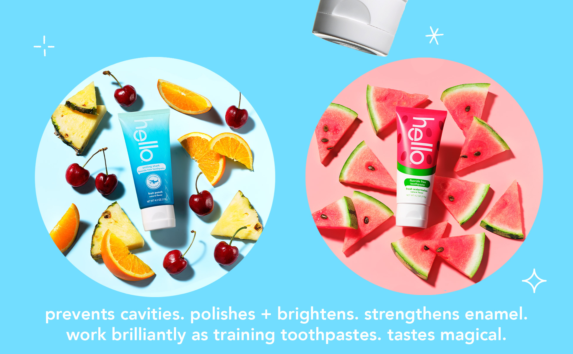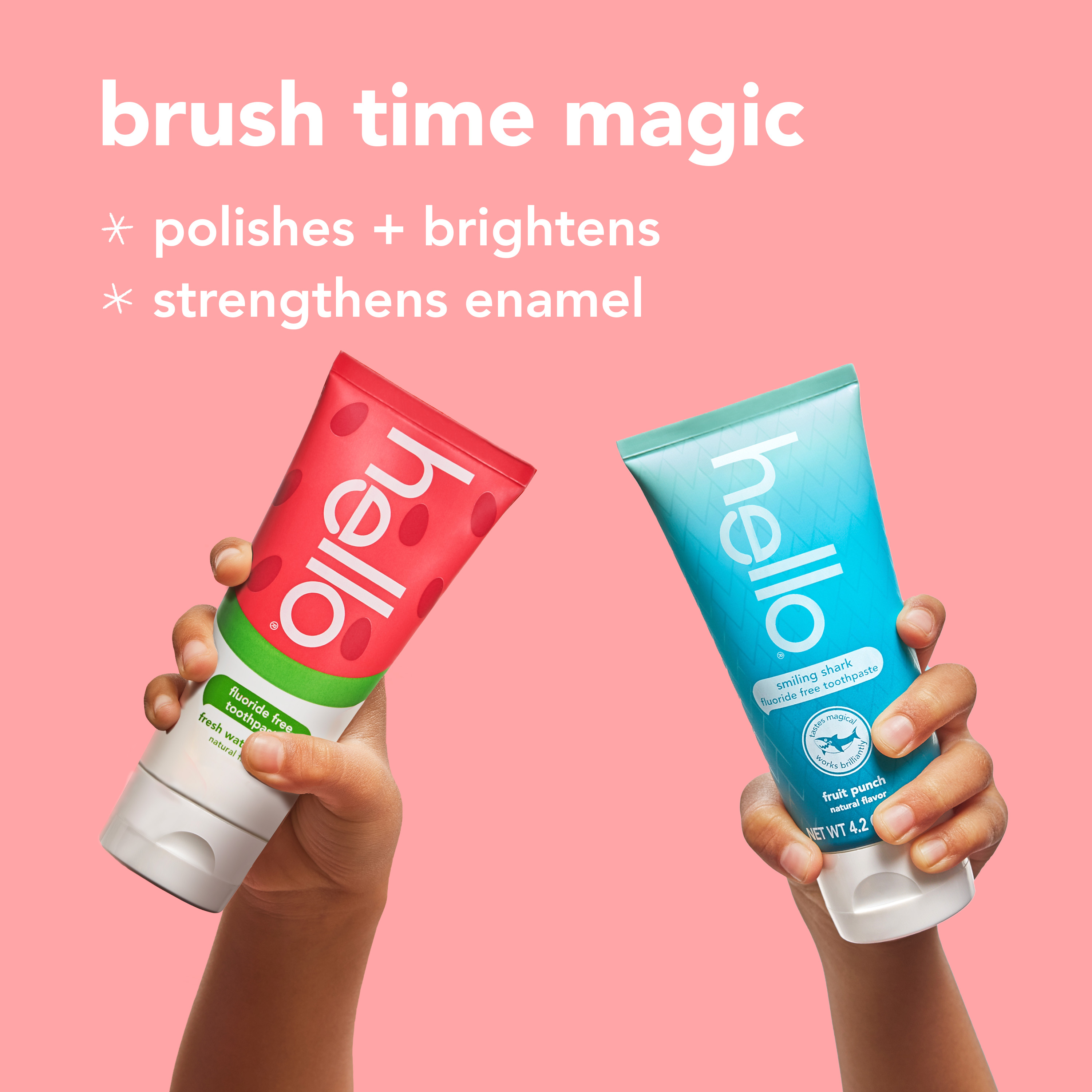 | Product Description | Say goodbye to brush time negotiations and hello to everyday yay with the hello Smiling Shark and Fresh Watermelon Fluoride Free Kids Toothpaste Pack. These one in a melon and totally jawsome kids fluoride free toothpastes help remove plaque with regular brushing and tastes awesome. The refreshing natural watermelon flavor (Fresh Watermelon) and fab fruit punch flavor (Smiling Shark) are perfect for brush time magic. Don’t worry parents, we won’t tell if you decide to take a brush for yourself. These fluoride free kids toothpastes help gently polish and brighten little teeth and are safe for all ages. Plus, our toddler toothpaste is formulated without spicy mint and uses fun flavors kids will love, bringing on big smiles with every brush. These training toothpaste flavors also contain no artificial sweeteners, artificial flavors, SLS, parabens, dyes, spicy mint, and are gluten free This fluoride free children’s toothpaste pack is not tested on animals. Choose friendly and brush happy with the hello Smiling Shark and Fresh Watermelon Kids Fluoride Free Toothpaste Pack. |