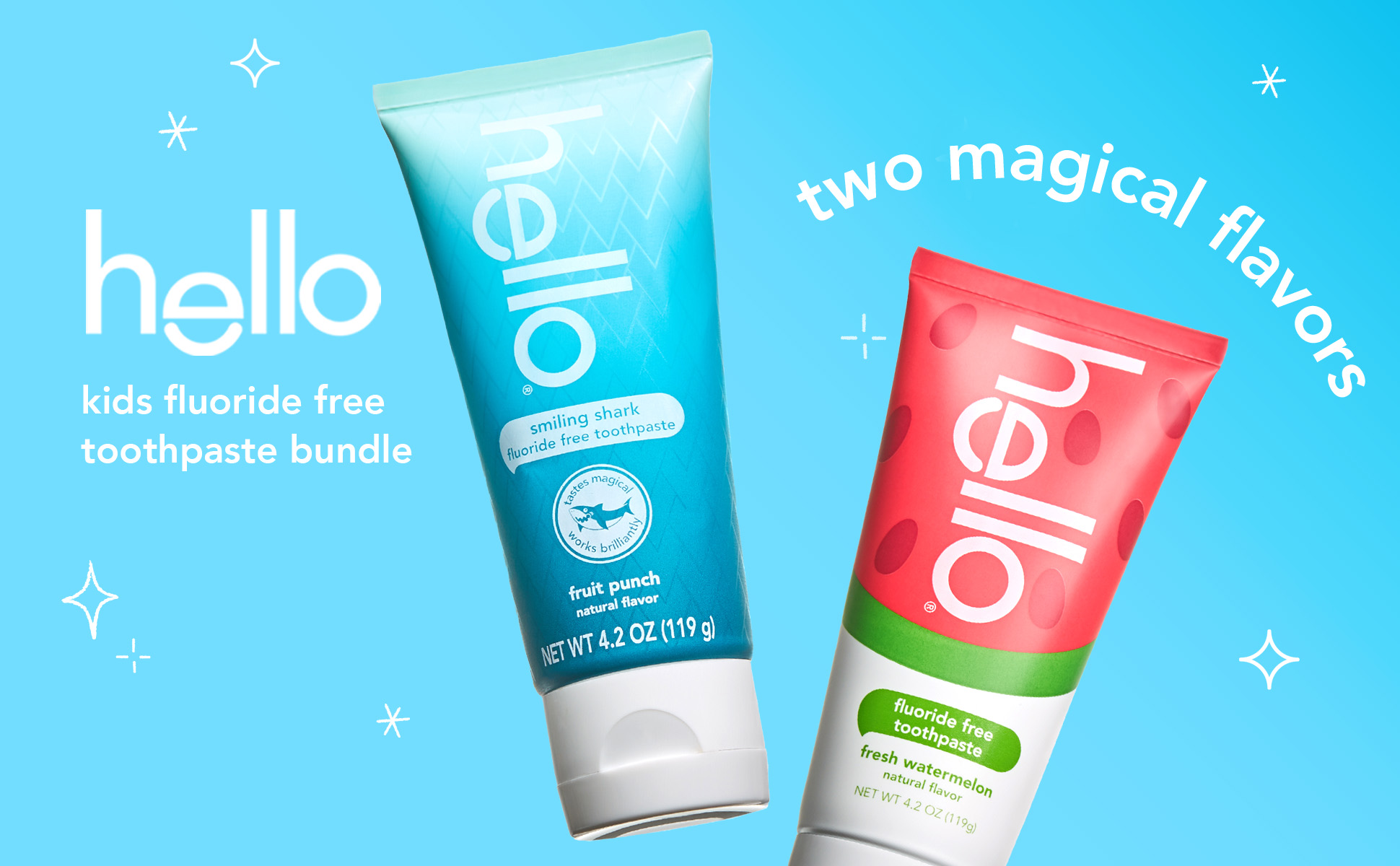| Bullet 1 | WHAT’S IN THE BUNDLE: Includes one (1) 4.2 oz tube of hello Smiling Shark Fluoride Free Kids Toothpaste (natural fruit punch flavor) and one (1) 4.2 oz tube of hello Fresh Watermelon Kids Fluoride Free Toothpaste (natural watermelon flavor) |