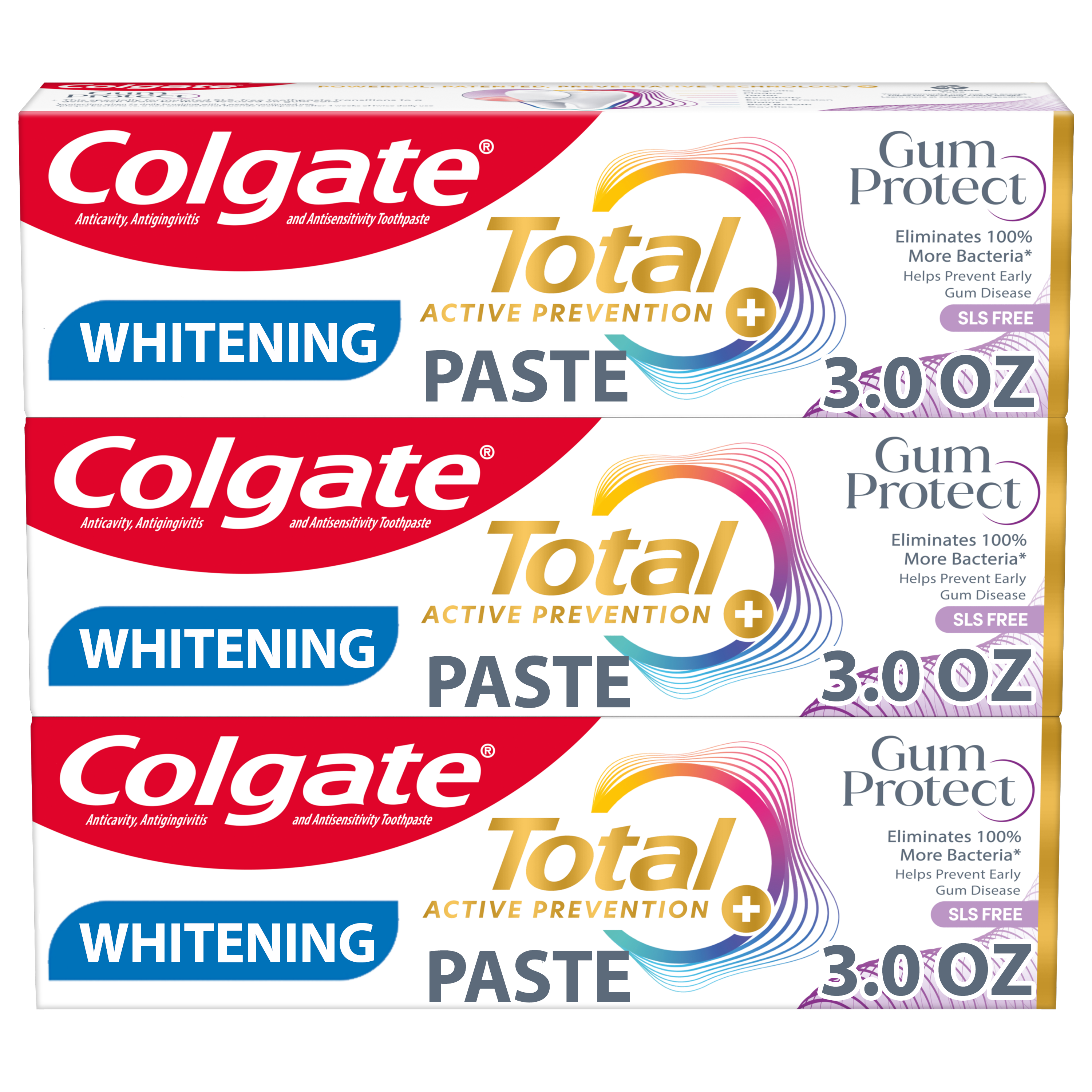 | Product Description | Help protect your gum health with this 3 pack of Colgate Total Active Prevention Gum Protect Whitening Toothpaste. Colgate Total Gum Protect Toothpaste is a gum protection toothpaste that helps prevent the 5 signs of early gum disease including gum inflammation, redness, bleeding gums, irritation, and gum sensitivity. Colgate Total Gum Protect Antibacterial Toothpaste eliminates 100% more bacteria* and is an SLS free toothpaste. The rich, dense foam of the SLS free toothpaste offers robust coverage for those focused on gum care and helps prevent early gum disease. Colgate Total Active Prevention Gum Protect Toothpaste is more than just an early gum disease toothpaste, this fluoride formulated anti gingivitis toothpaste also helps fight bad breath, cavities, plaque bacteria, and gingivitis. In addition, this whitening mint toothpaste is 2x more effective at fighting bacteria**, a root cause of many oral care problems such as cavities and gingivitis. Feel secure knowing that Colgate Total Active Prevention Gum Protect Gum Health Toothpaste has your gum care needs covered for a healthy and confident smile.