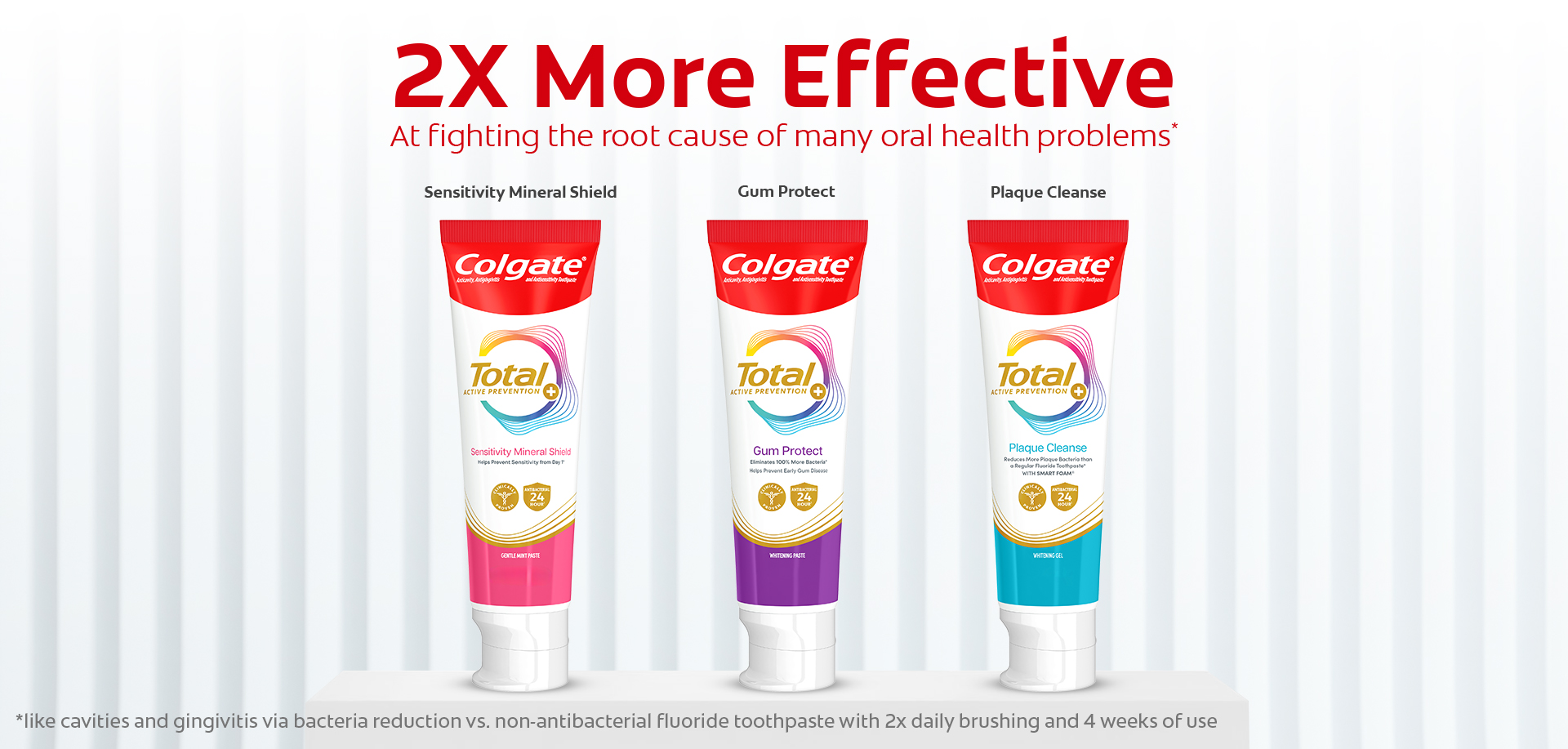 | Bullet 5 | The antibacterial toothpaste is 2x more effective at fighting bacteria** a root cause of many common oral care problems such as cavities and gingivitis |