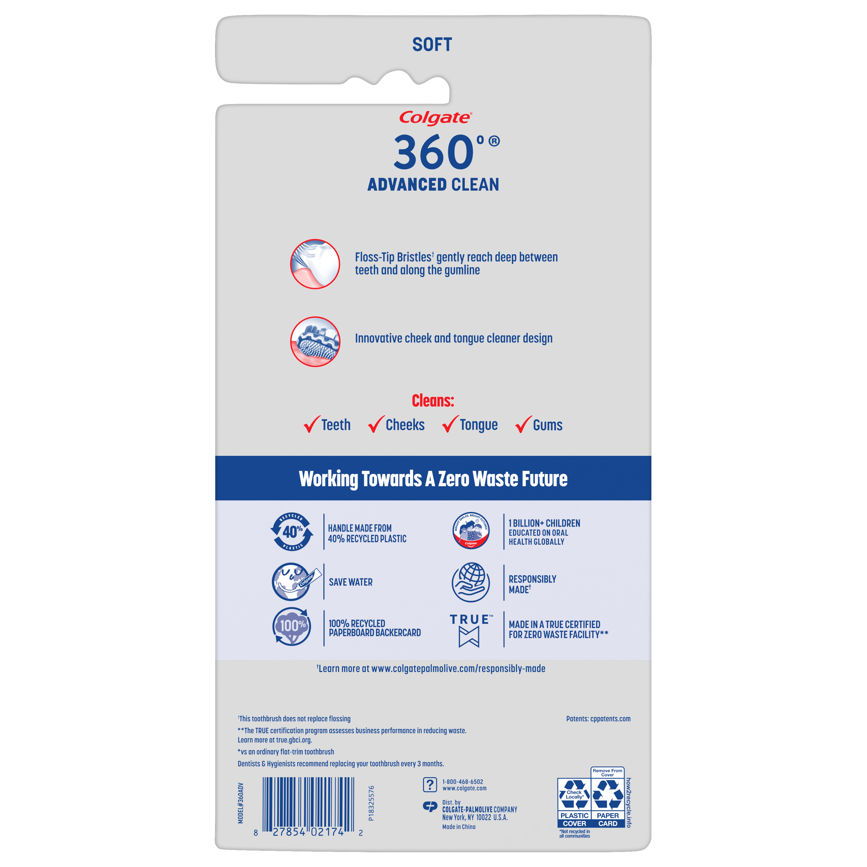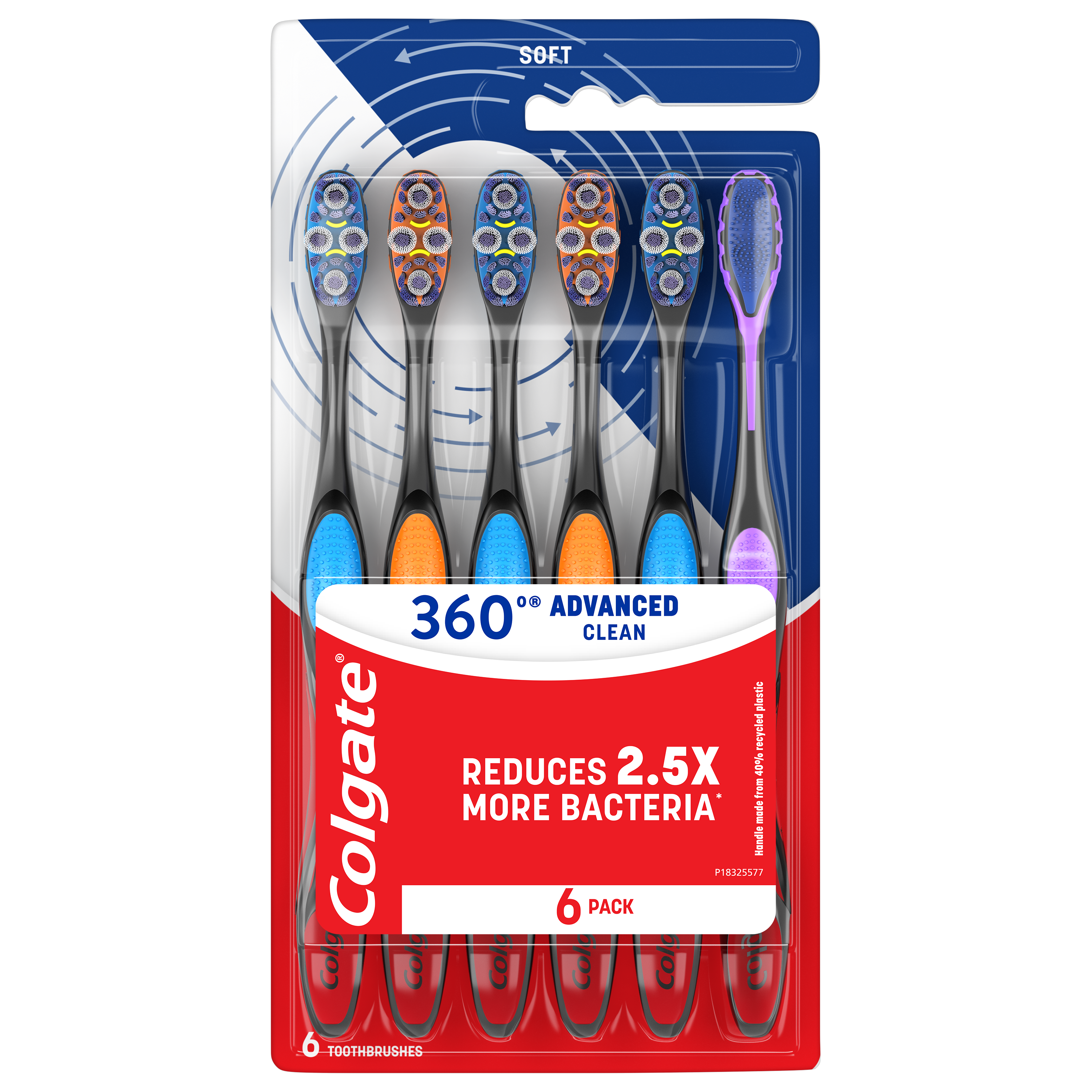 SKU 61049545 Consumer Unit - GTIN 00827854021742 Case - GTIN 10827854021749 Product Category Oral Care Product Sub Category Manual TB Product Equity (Brand) Colgate Product Sub Brand Colgate 360 Adv Floss Tip Man TB Product Title Colgate 360 Advanced Clean Adult Soft Toothbrush, 6 Pack Product Description Help achieve a deep clean with the Colgate 360 Advanced Clean Adult Soft Toothbrush Pack. These 6 soft toothbrushes help clean your teeth, tongue, cheeks, and gums and remove 2.5X more bacteria* along the gumline to help with a deep, effective clean. Each adult toothbrush uses soft Floss-Tip Bristles** which help reach deep between teeth and along the gumline. In addition to their soft bristles, each manual toothbrush also includes an innovative cheek and tongue cleaner. Each Colgate 360 Advanced Clean Adult Soft Bristled Toothbrush is made in a TRUE certified for zero waste facility*** and comes packaged in a 100% Recycled Paperboard Backercard that is recyclable. The Colgate 360 Advanced Clean Adult Soft Toothbrush Pack is ideal for anyone looking for a comfortable adult toothbrush that provides a deep clean. *vs. an ordinary flat-trimmed toothbrush **this toothbrush does not replace flossing ***The TRUE certification program assesses business performance in reducing waste. Learn more at true.gbci.org. Bullet 1 Includes six (6) individual Colgate 360 Advanced Clean Adult Soft Toothbrushes Bullet 2 Each Colgate 360 Advanced Clean Adult Soft Toothbrush features soft bristles that help remove 2.5X more bacteria* Bullet 3 Each soft Colgate toothbrush in this toothbrush pack features an innovative cheek and tongue cleaner Bullet 4 The Floss-Tip bristles** on each adult toothbrush help reach deep between teeth and along the gumline Bullet 5 The extra toothbrushes in this 6 pack mean you have over a year’s worth of Colgate soft bristled toothbrushes ready to go when it’s time to change your manual toothbrush after 3 months Bullet 6 The Colgate 360 Advanced Clean Adult Soft Toothbrush Pack comes packaged in a 100% Recycled Paperboard Backercard that is recyclable Bullet 7 Choose the Colgate 360 Advanced Clean Adult Toothbrush for a comfortable manual toothbrush that provides a deep clean Amazon RPC B0F6NX58GB AMZ URL https://www.amazon.com/dp/B0F6NX58GB