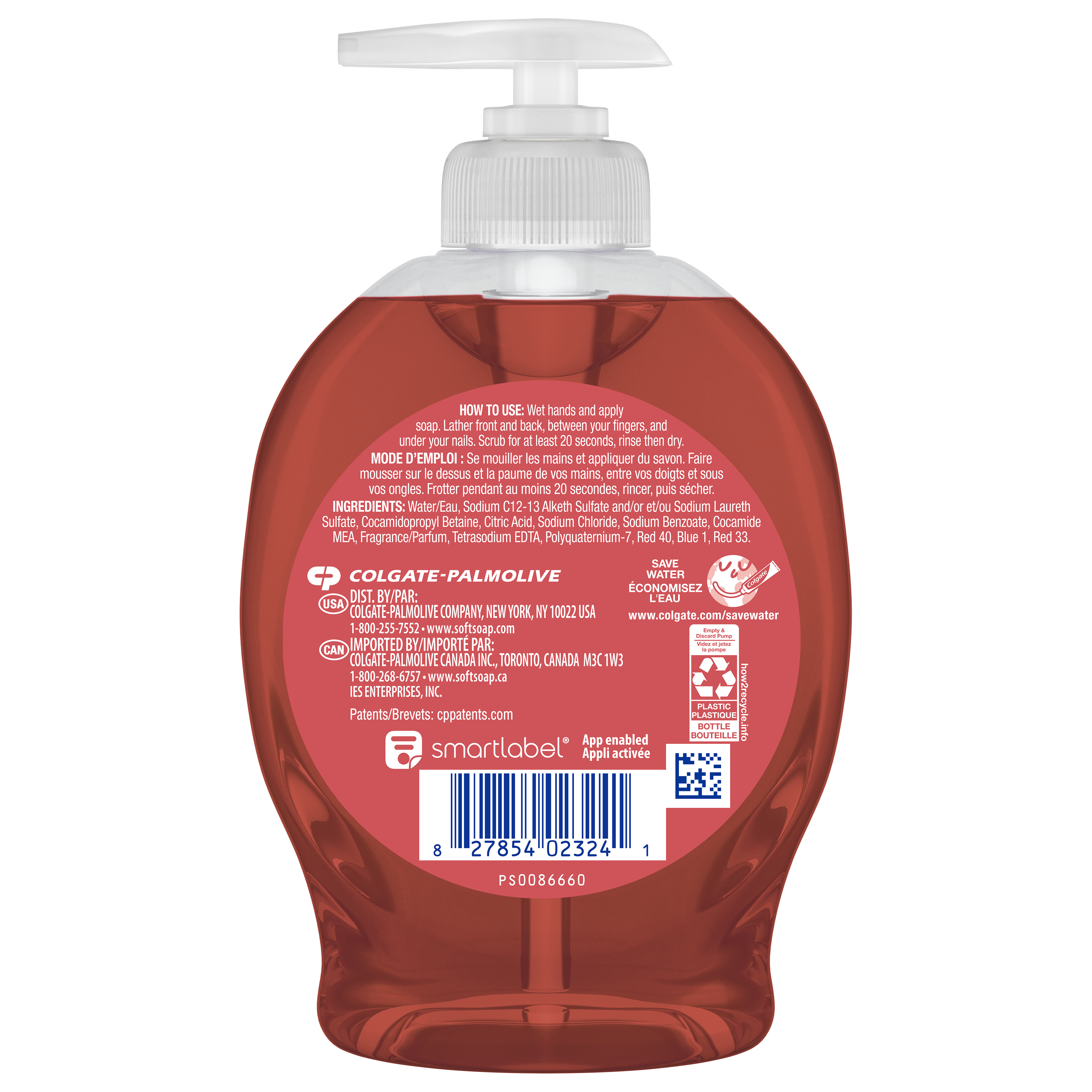 SKU 61050140 Consumer Unit - GTIN 00827854023241 Case - GTIN 10827854023248 Product Category Personal Care Product Sub Category Liquid Hand Wash Product Equity (Brand) Softsoap Product Sub Brand Softsoap LHW Product Title Softsoap Limited Edition Halloween Liquid Hand Soap Pump, Berry Scent, 7.5 fl oz Product Description Celebrate Halloween every time you wash your hands with Softsoap Limited Edition Berry Liquid Hand Soap, featuring a convenient hand soap pump for easy dispensing. The sweet berry fragrance captures the playful spirit of the season and adds a festive touch to your sink. The fun seasonal packaging delights both kids and adults, making handwashing a joyful part of your fall routine. This formula is paraben-free, made without phthalates, and helps retain skin’s natural moisture for daily cleansing. Softsoap, the #1 liquid hand soap brand*, is versatile to use in the kitchen, as a bathroom hand soap, or in any other space that needs a touch of warmth. So why not treat yourself to our limited edition fall hand soap and enjoy the season to the fullest? Stock up now while supplies last and bring a little bit of fun into your daily routine! *Based in part on data reported by Nielsen through its Market Track Service for the Liquid Hand Soap Category for the 52 week period ending 07/01/25, for the All Outlet market. Copyright © 2025 Nielsen. Bullet 1 One 7.5 fl oz pump bottle of Softsoap Limited Edition Hand Soap, Berry Scent Bullet 2 Softsoap is the #1 liquid hand soap brand* Bullet 3 Softsoap’s seasonal hand soap sparks joy and brightens up your day Bullet 4 This Halloween hand soap helps to retain skin's natural moisture Bullet 5 This berry scented hand soap is paraben-free and formulated without phthalates Bullet 6 Versatile to use in the bathroom, as a kitchen hand soap, or in any other space that needs a touch of warmth Bullet 7 Health care agencies recommend washing hands with soap and clean running water for 20 seconds to wash away dirt and bacteria Walmart RPC 15702771051 Walmart URL (Computed) https://www.walmart.com/ip/a/15702771051