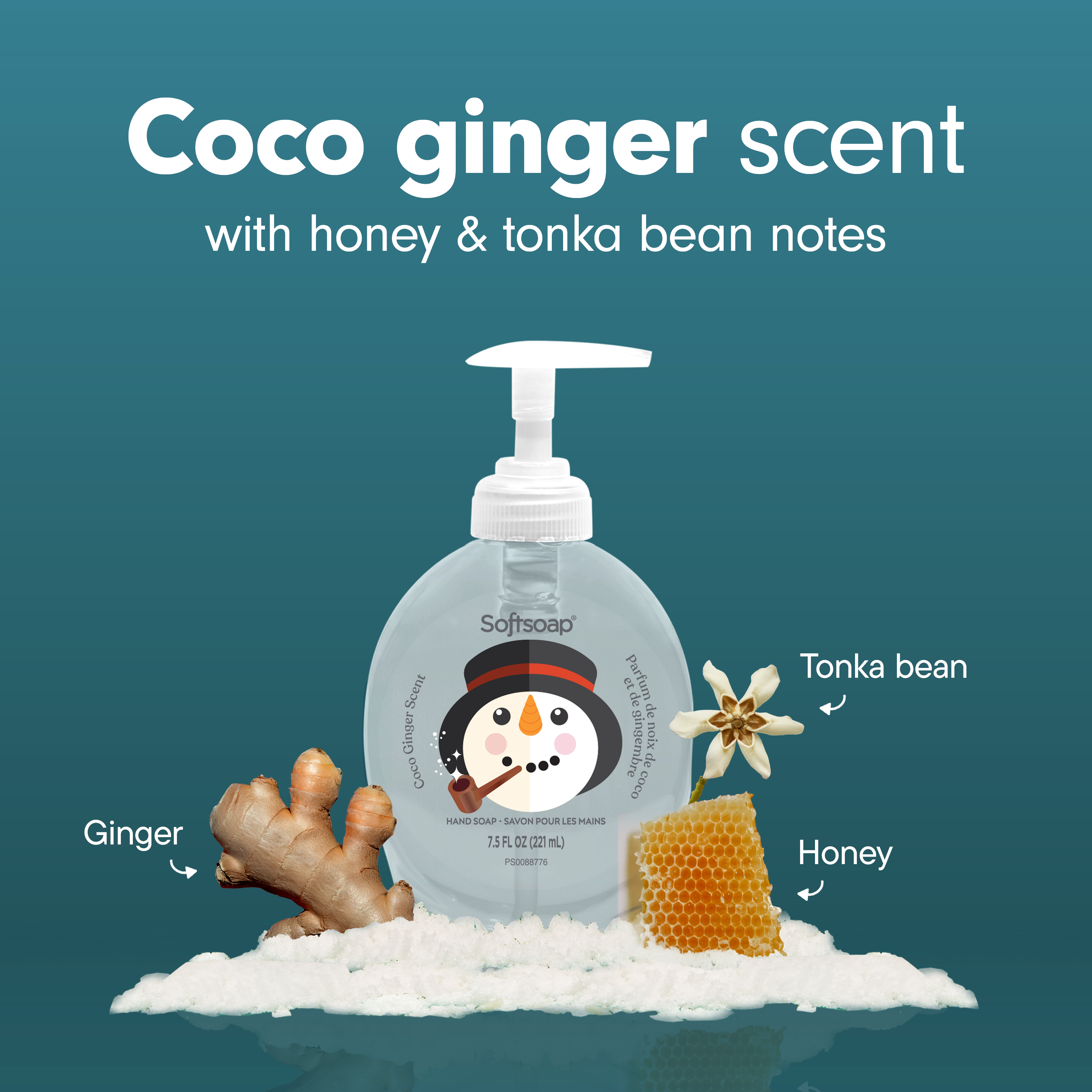 SKU 61050150 Consumer Unit - GTIN 00827854023302 Case - GTIN 10827854023309 Product Category Personal Care Product Sub Category Liquid Hand Wash Product Equity (Brand) Softsoap Product Sub Brand Softsoap LHW Product Title Softsoap Limited Edition Coco Ginger Liquid Hand Soap, Kitchen or Bathroom Hand Soap, 7.5 fl oz Pump Bottle Product Description Add a touch of seasonal delight to your daily routine with Softsoap Limited Edition Coco Ginger Liquid Hand Soap. This special edition features a warm coco ginger scent that captures the cozy spirit of winter, filling your home with a festive aroma. The cheerful packaging is inspired by ginger roots and coconut, adding a decorative accent to any kitchen or bathroom. Formulated without parabens or phthalates, it cleanses while helping skin retain its natural moisture. This fall hand soap is pH balanced for your skin. Perfect for elevating your handwashing experience, this limited edition soap is available in a 7.5 fl oz pump bottle and only for a short time. Stock up to bring a hint of seasonal joy for your sink. Enjoy a clean that feels as good as it smells and make every hand wash a reminder of cozy moments and festive celebrations during the colder months. Bullet 1 Includes one 7.5 fl oz pump bottle of Softsoap Limited Edition Coco Ginger Liquid Hand Soap Bullet 2 Features festive packaging inspired by ginger roots and coconut for a cheerful seasonal accent Bullet 3 Paraben-free and phthalate-free formula helps skin retain its natural moisture with each hand wash Bullet 4 Ideal for use in the bathroom, as a kitchen hand soap, or anywhere that could use a touch of winter warmth Bullet 5 This seasonal hand soap is pH balanced for your skin Walmart RPC 15696450500 Walmart URL (Computed) https://www.walmart.com/ip/a/15696450500