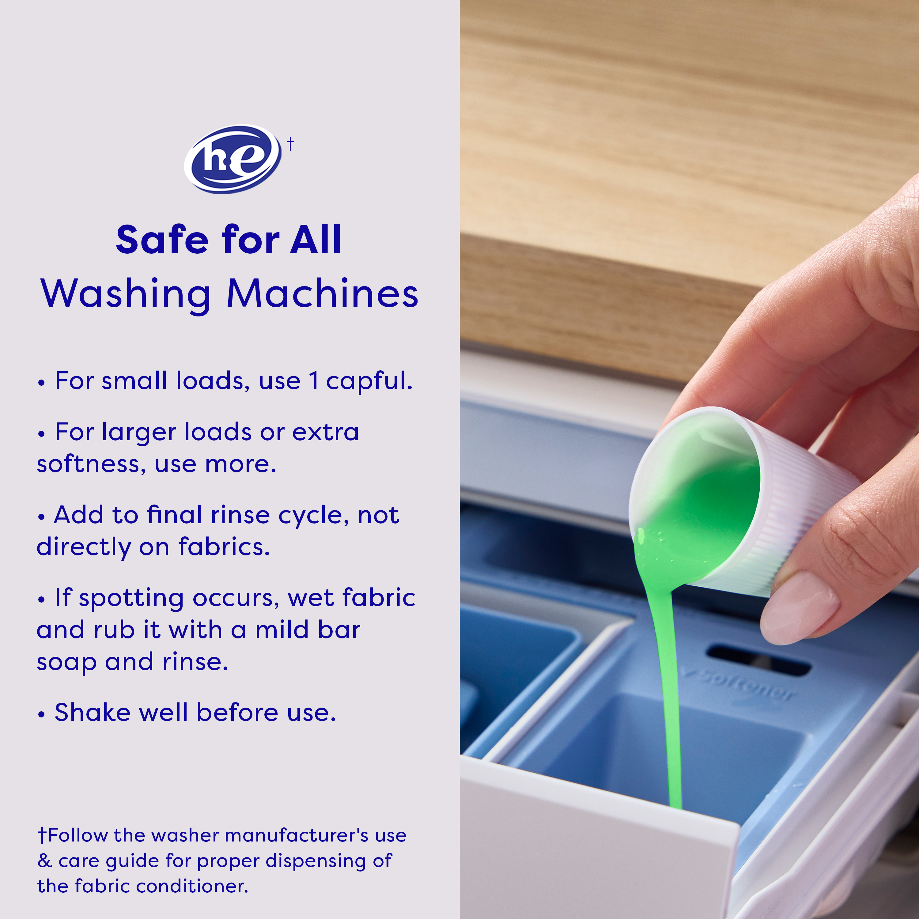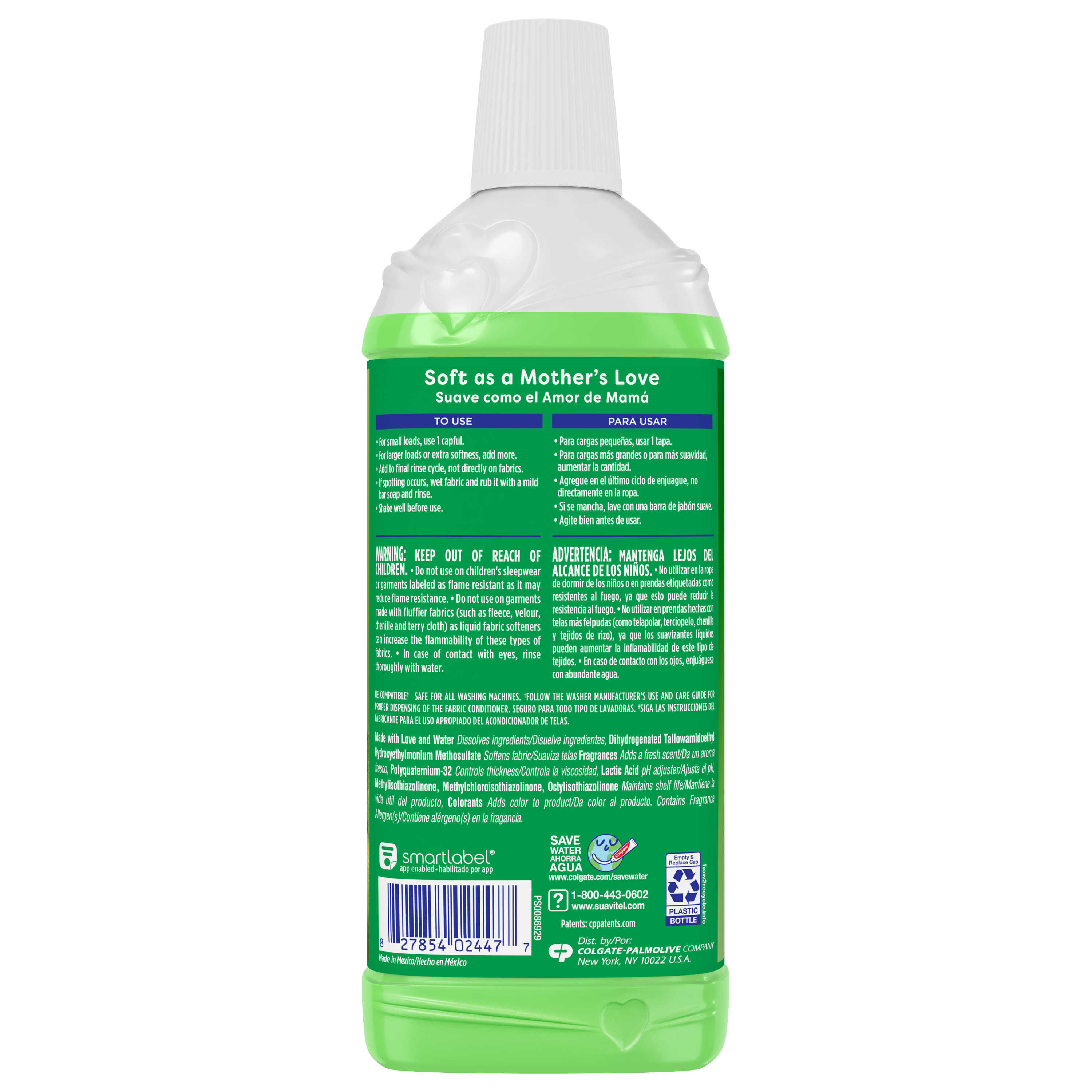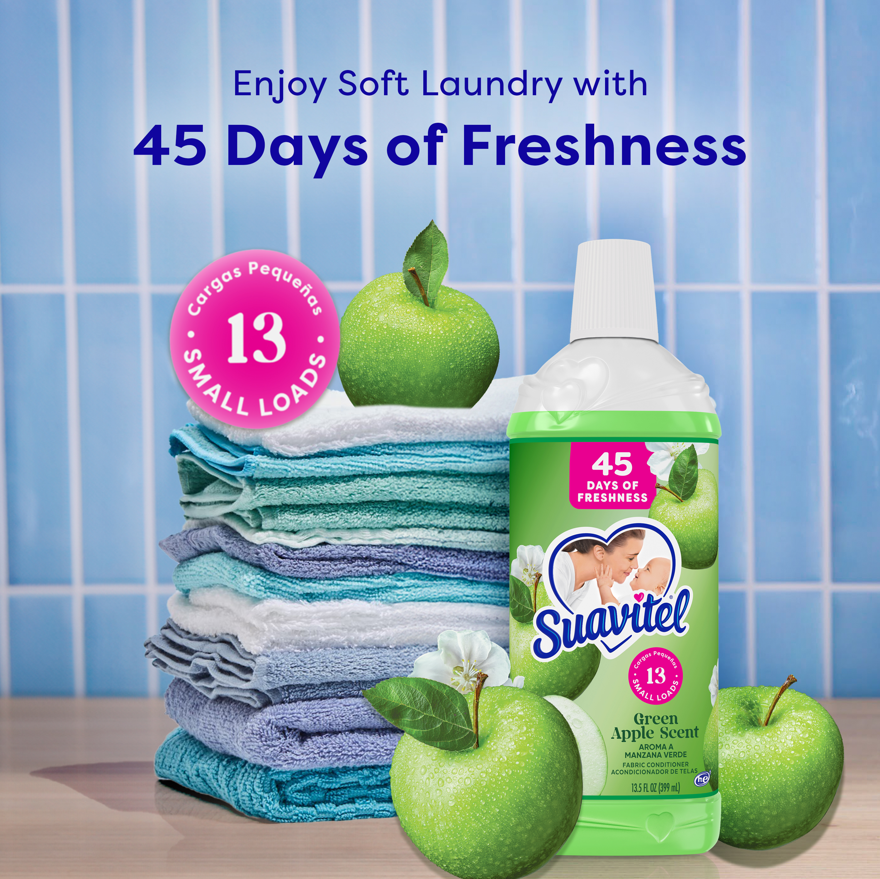 SKU 61051645 Consumer Unit - GTIN 00827854024477 Case - GTIN 10827854024474 Product Category Home Care Product Sub Category FC Liquids Product Equity (Brand) Suavitel Product Sub Brand Suavitel Liq FC Product Title Suavitel Fabric Conditioner, Liquid Fabric Softener, 45 Days of Freshness, HE Compatible, 13 Small Loads, Green Apple Scent, 13.5 fl oz Bottle Product Description Suavitel Fabric Conditioner in Green Apple Scent is designed for busy households, with enough for 13 small loads to make frequent washing simple and convenient. Enjoy up to 45 days of freshness so your clothes, towels, and linens always smell clean and inviting between washes. Each load is wrapped in irresistible fragrance and incredible softness, leaving fabrics feeling luxuriously smooth. Our fabric softener is compatible with all washing machines, including HE models*. Suavitel cares gently for your family’s laundry and appliances. For best results, use 1 capful for small loads and more for larger loads or extra softness. Always add to the final rinse cycle, not directly on fabrics. If spotting occurs, treat with a mild bar soap and rinse. Shake well before use. Enjoy the comforting softness of a mother’s love with every wash. *Follow the washer manufacturer's use and care guide for proper dispensing of the fabric conditioner Bullet 1 One 13.5 fl oz bottle of Suavitel Fabric Conditioner, Green Apple Scent Bullet 2 Provides enough for 13 small loads making it ideal for regular household laundry needs and convenient for frequent washing Bullet 3 Enjoy 45 days of freshness so your clothes, towels, and linens smell clean and inviting between washes providing comfort in every wear Bullet 4 Experience irresistible fragrance and incredible softness that wraps every load in a clean Green Apple scent Bullet 5 Compatible with all types of washing machines including HE models* for easy integration into your existing laundry routine Bullet 6 Safe for your family’s laundry and appliances Bullet 7 Provides the comforting softness of a mother’s love so every load receives gentle care and reliable fabric protection Dollar Tree RPC 412681