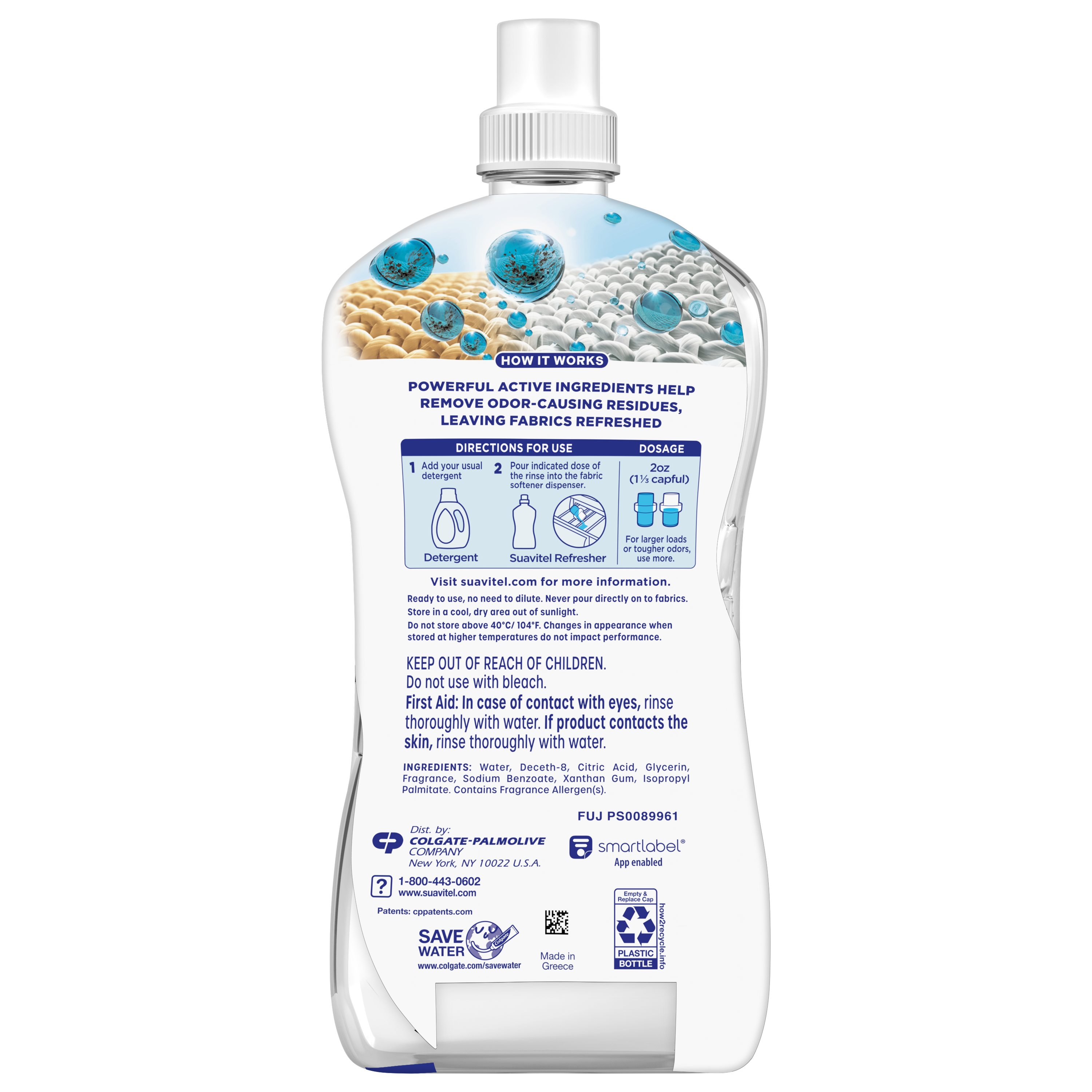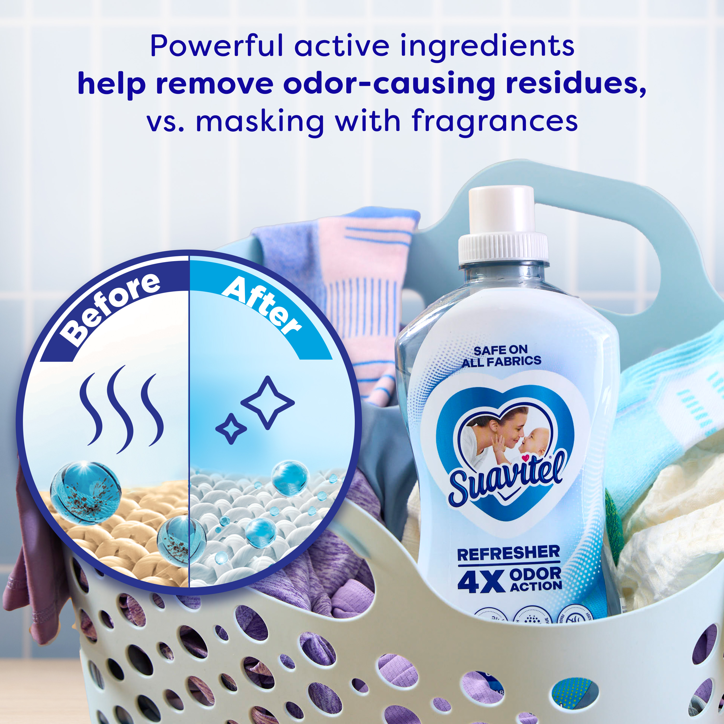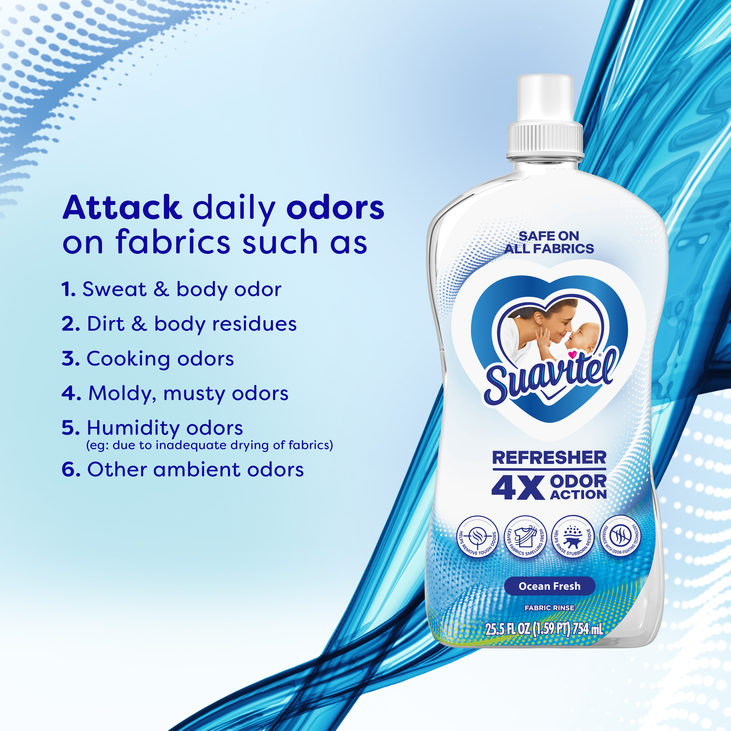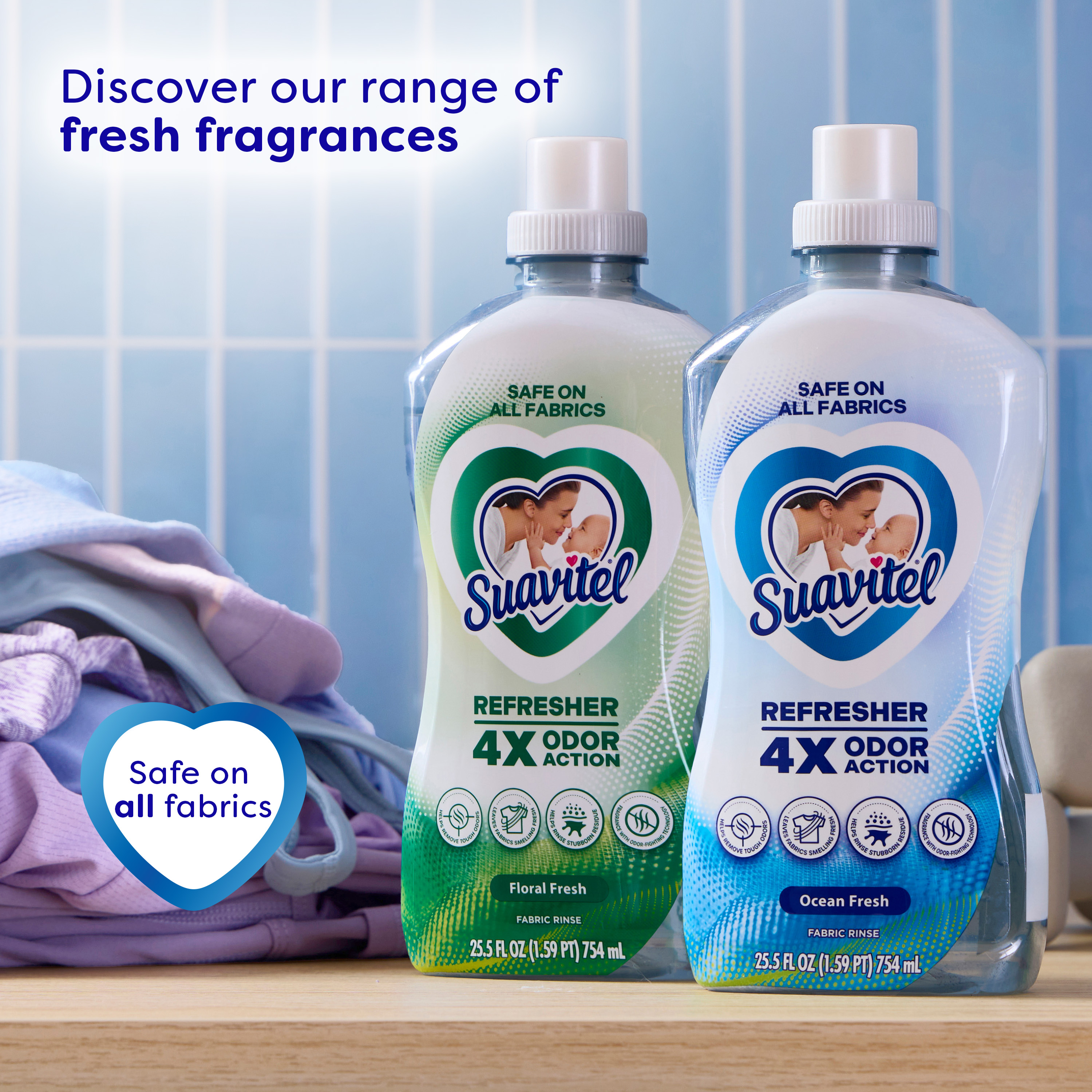 | Product Description | Experience the next level of freshness with Suavitel Refresher Fabric Rinse. The 4X odor action helps to remove tough odors, leaves fabrics smelling fresh, helps rinse stubborn residue, and has a fragrance with odor-fighting technology. Juicy fresh fruits, clean watery facets, and dewy floral notes blend to create an oceanic freshness that lasts. Its powerful active ingredients and fragrance with odor-fighting technology work with your regular detergent to leave clothes truly refreshed, not just masked with a coat of fragrance. The low pH formula is safe for all types of fabrics*, making it ideal for clothes, bedding, garments, linens, towels, and activewear. Simply add 2 fl oz to your fabric softener dispenser for easy, effective freshness every wash with no dilution needed. Ready to use from the bottle, Suavitel Refresher is perfect for everyday laundry or when you need an extra boost of odor removal. Trusted by families, Suavitel offers affordable, high-performing fabric care that keeps your home smelling clean. Store in a cool, dry area away from sunlight.