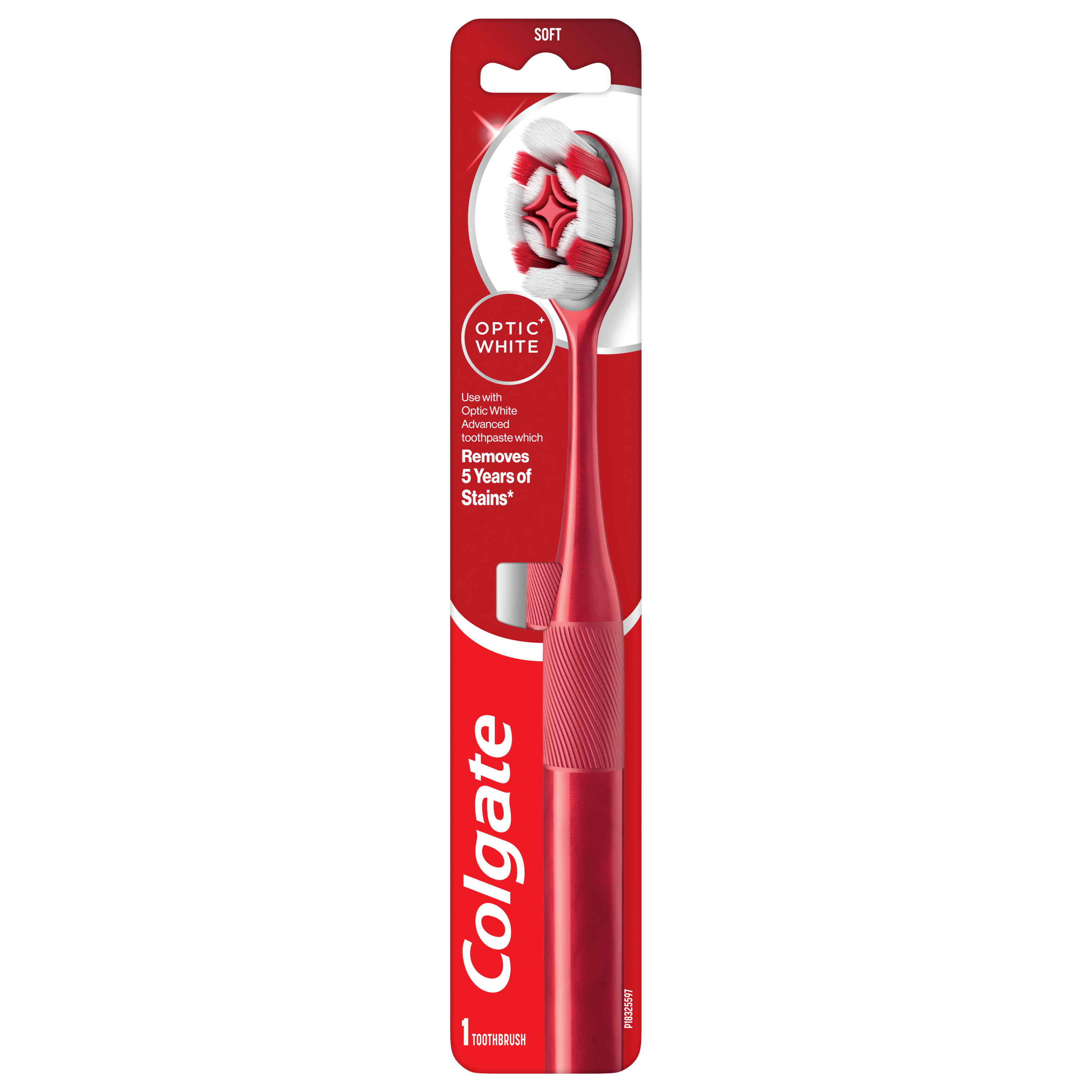 SKU 61052087 Consumer Unit - GTIN 00827854024675 Case - GTIN 10827854024672 Product Category Oral Care Product Sub Category Manual TB Product Equity (Brand) Colgate Product Sub Brand Colgate Optic White Man TB Product Title Colgate Optic White Soft Toothbrush for Adults, 1 Pack Product Description Discover a bright, clean smile with the Colgate Optic White Soft Toothbrush for Adults. Specially designed to clean and whiten, this soft bristled whitening toothbrush helps you achieve a radiant look by polishing away surface stains. Plus, the striking toothbrush design will add a stylish touch to your bathroom counter to help elevate your daily oral care routine. The Colgate Optic White Manual Toothbrush includes a polishing star in the middle of the toothbrush bristles that is designed to help remove surface stains when brushing. In addition, this soft bristled toothbrush also features multi-height, high-density bristles that help clean between teeth and along the gumline. For a brighter whitening experience, pair the Colgate Optic White Soft Adult Toothbrush with Colgate Optic White Advanced Toothpaste which removes 5 years of stains.* Promote a white, clean smile with the Colgate Optic White Soft Toothbrush. *when brushing twice daily for 2 weeks eCommerce Copy- Long Description Cleans and Whitens The Colgate Optic White Manual Toothbrush includes a polishing star in the middle of the toothbrush bristles which is designed to help remove surface stains when brushing. In addition, this soft bristle toothbrush also features multi-height, high-density bristles which help clean between teeth and along the gumline. The Optic White Difference For a brighter whitening experience, pair the Colgate Optic White Soft Adult Toothbrush with Colgate Optic White Advanced Toothpaste which removes 5 years of stains.* Promote a white, clean smile with the Colgate Optic White Soft Toothbrush. *when brushing twice daily for 2 weeks Bullet 1 Includes one (1) Colgate Optic White Soft Toothbrush for Adults Bullet 2 This manual toothbrush uses multi-height, high-density soft toothbrush bristles to gently clean between teeth and along the gumline Bullet 3 This adult toothbrush features a polishing star in between bristles designed to help whiten teeth by removing surface stains Bullet 4 Use this adult soft toothbrush with Colgate Optic White Advanced Toothpaste, which removes 5 years of stains* Bullet 5 The soft bristled toothbrush features high-density bristles that are designed for gentle stain removal along the gumline Walmart RPC 15862719867 Walmart URL (Computed) https://www.walmart.com/ip/a/15862719867