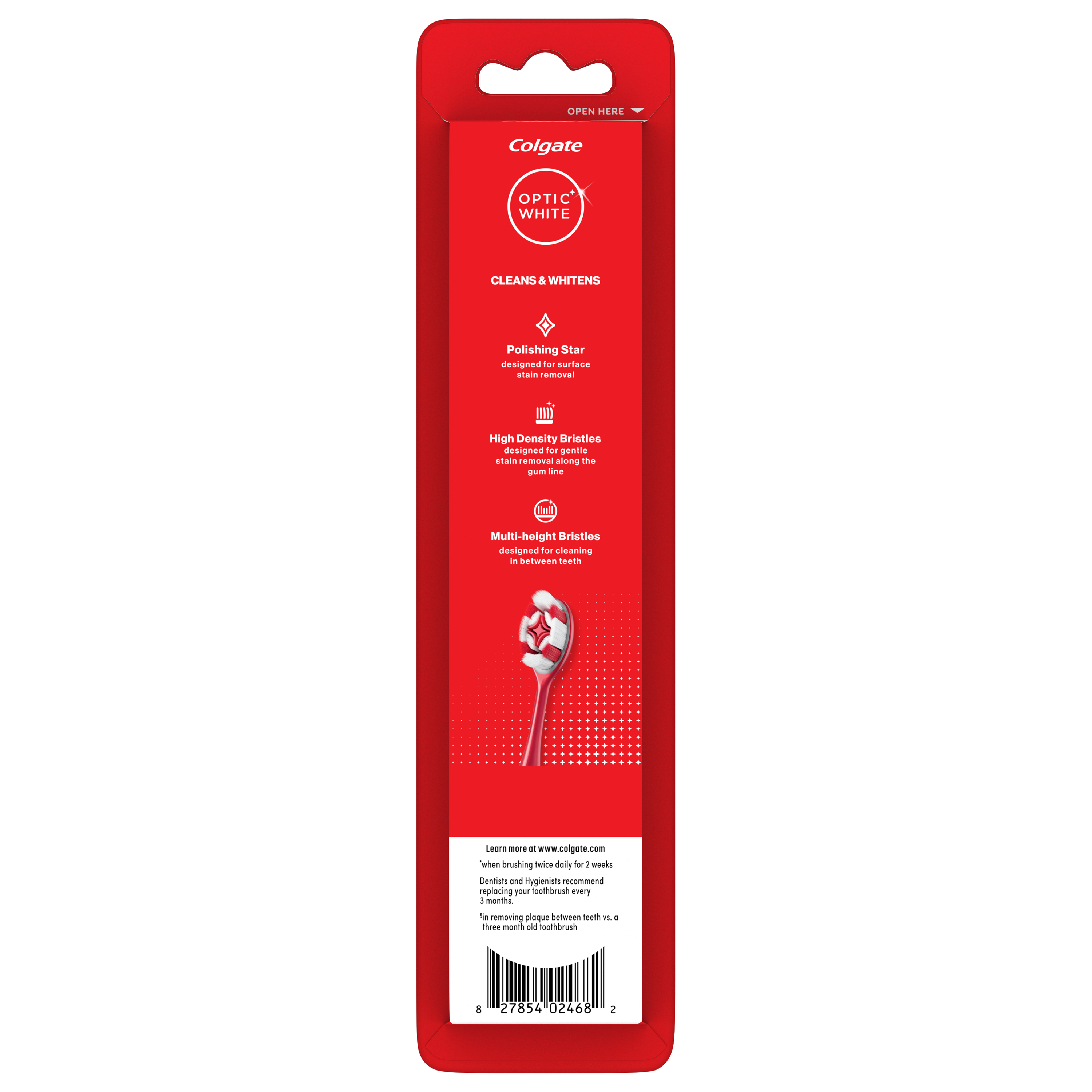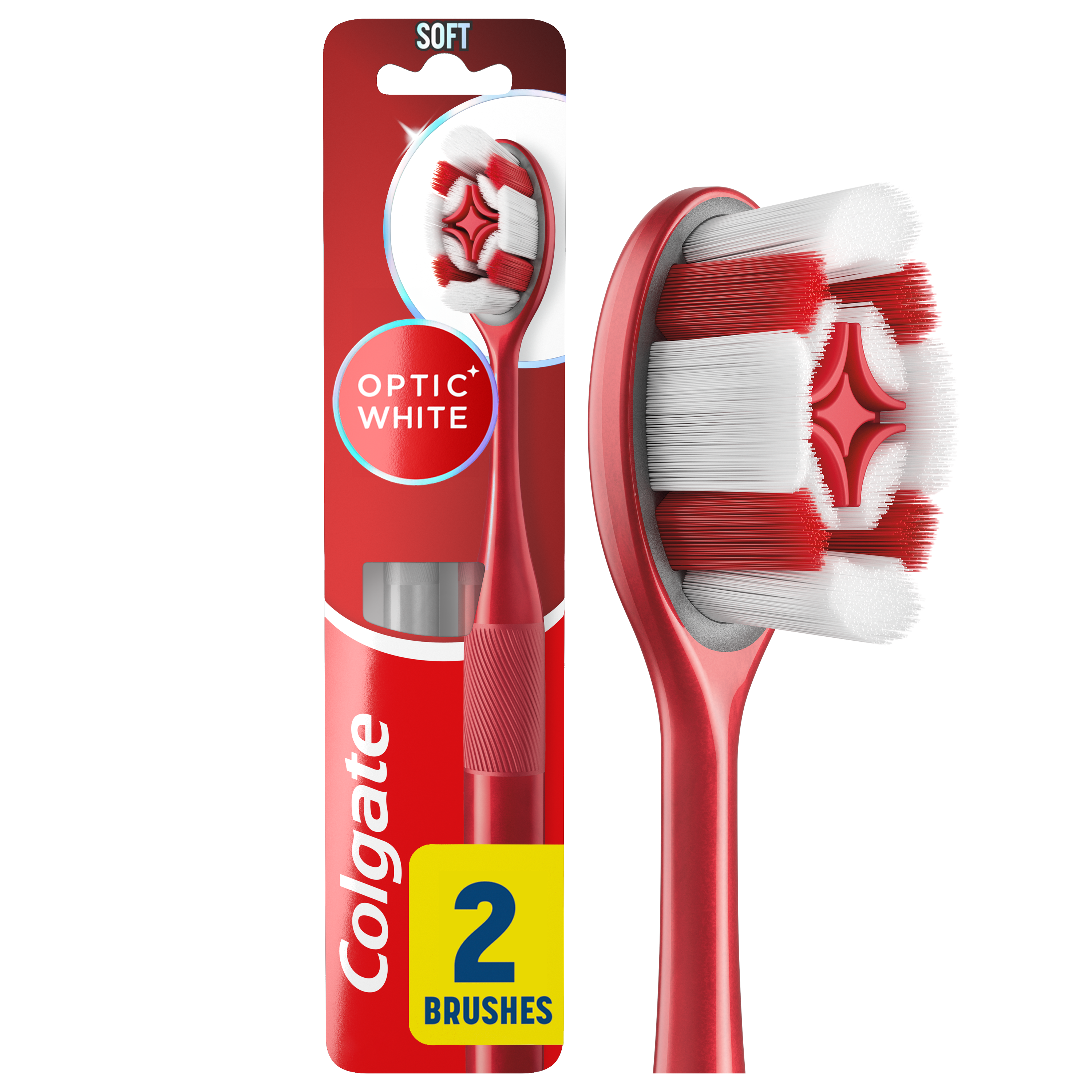 SKU 61052091 Consumer Unit - GTIN 00827854024682 Product Category Oral Care Product Sub Category Manual TB Product Equity (Brand) Colgate Product Sub Brand Colgate Optic White Man TB Product Title Colgate Optic White Soft Toothbrush for Adults, 2 Pack Product Description Discover a bright, clean smile with the Colgate Optic White Soft Toothbrush for Adults. Specially designed to clean and whiten, this soft bristled whitening toothbrush pack helps you achieve a radiant look by polishing away surface stains. Plus, the striking toothbrush design will add a stylish touch to your bathroom counter to help elevate your daily oral care routine. The Colgate Optic White Manual Toothbrush includes a polishing star in the middle of the toothbrush bristles that is designed to help remove surface stains when brushing. In addition, this soft bristled toothbrush also features multi-height, high-density bristles that help clean between teeth and along the gumline. For a brighter whitening experience, pair the Colgate Optic White Soft Adult Toothbrush with Colgate Optic White Advanced Toothpaste which removes 5 years of stains.* Promote a white, clean smile with the Colgate Optic White Soft Toothbrush Pack. *when brushing twice daily for 2 weeks Bullet 1 Includes two (2) Colgate Optic White Soft Toothbrushes for Adults, Soft Bristled Toothbrush Pack Bullet 2 This manual toothbrush uses multi-height, high-density soft toothbrush bristles to gently clean between teeth and along the gumline Bullet 3 This adult toothbrush features a polishing star in between bristles designed to help whiten teeth by removing surface stains Bullet 4 Use this adult soft toothbrush pack with Colgate Optic White Advanced Toothpaste, which removes 5 years of stains* Bullet 5 The soft bristled toothbrush features high-density bristles that are designed for gentle stain removal along the gumline Walmart RPC 15867071647 Walmart URL (Computed) https://www.walmart.com/ip/a/15867071647 Target RPC 94823725 Target URL https://www.target.com/p/a/-/A-94823725