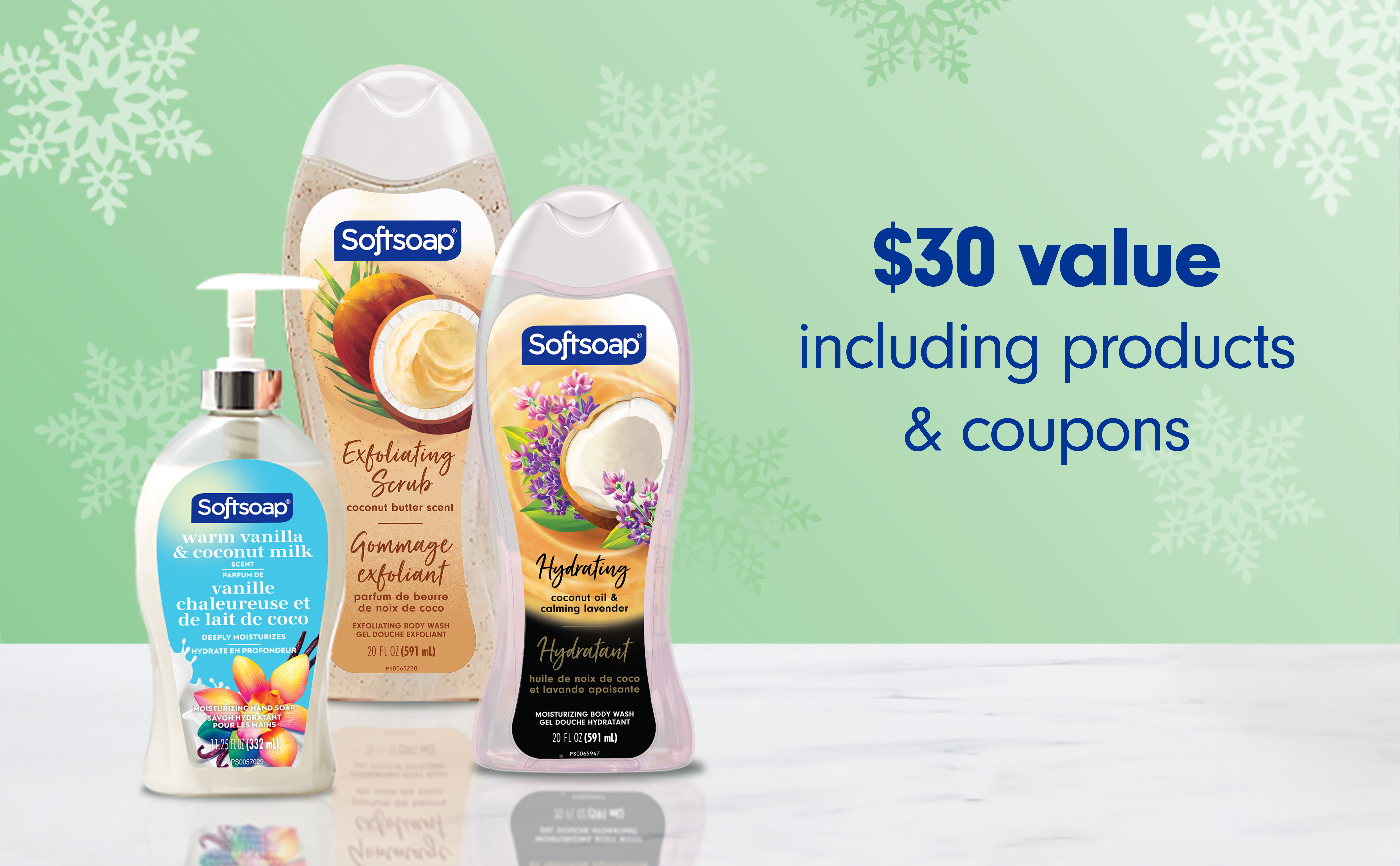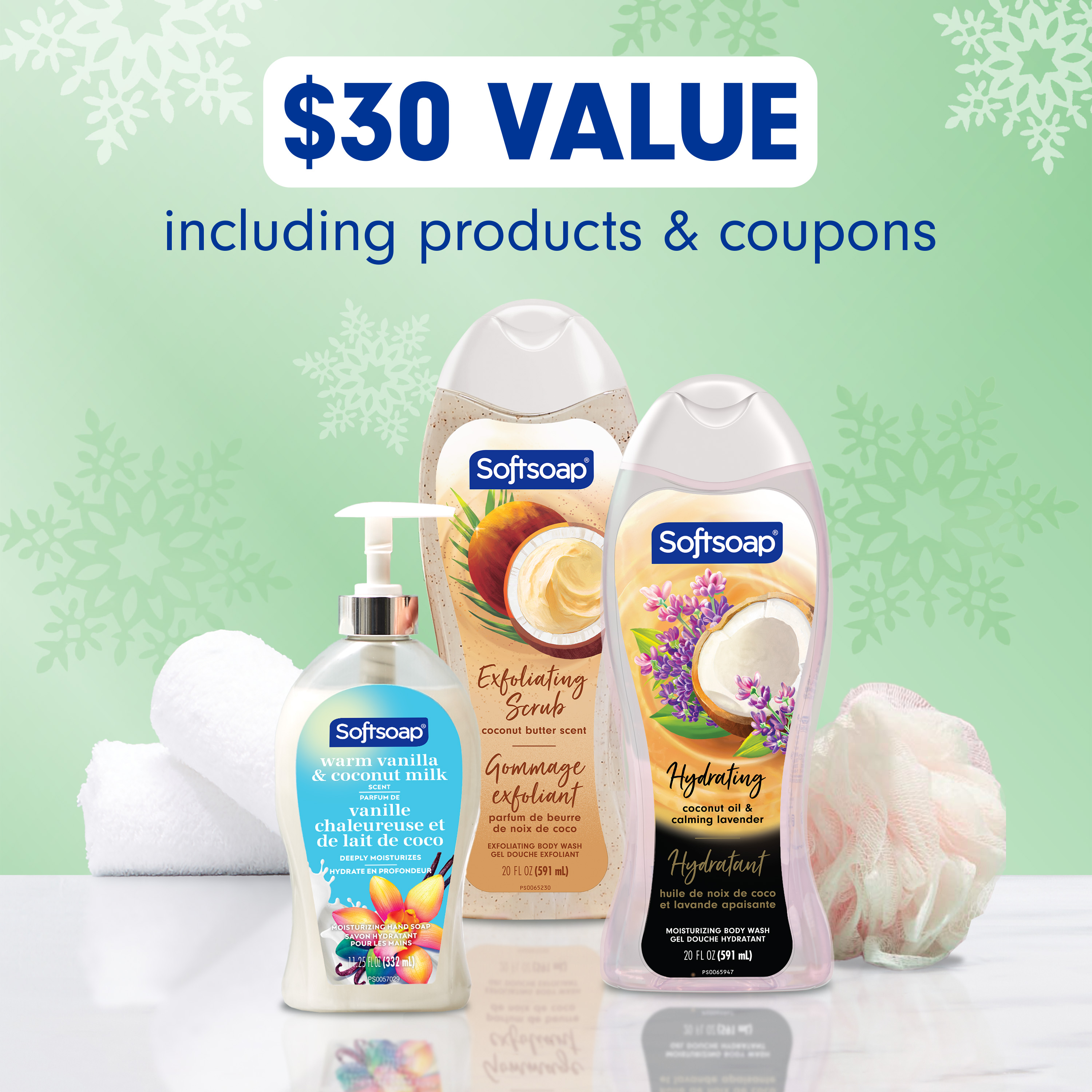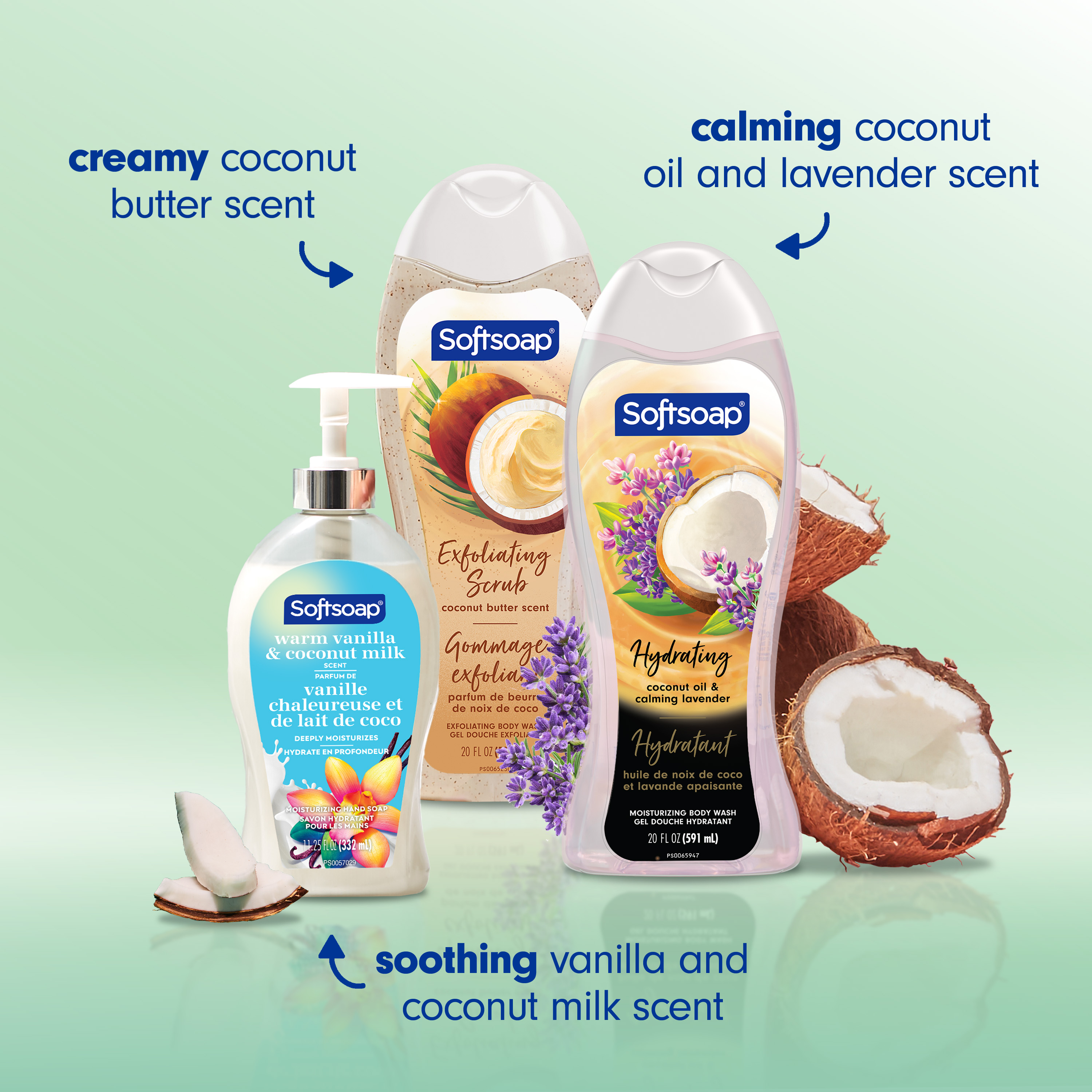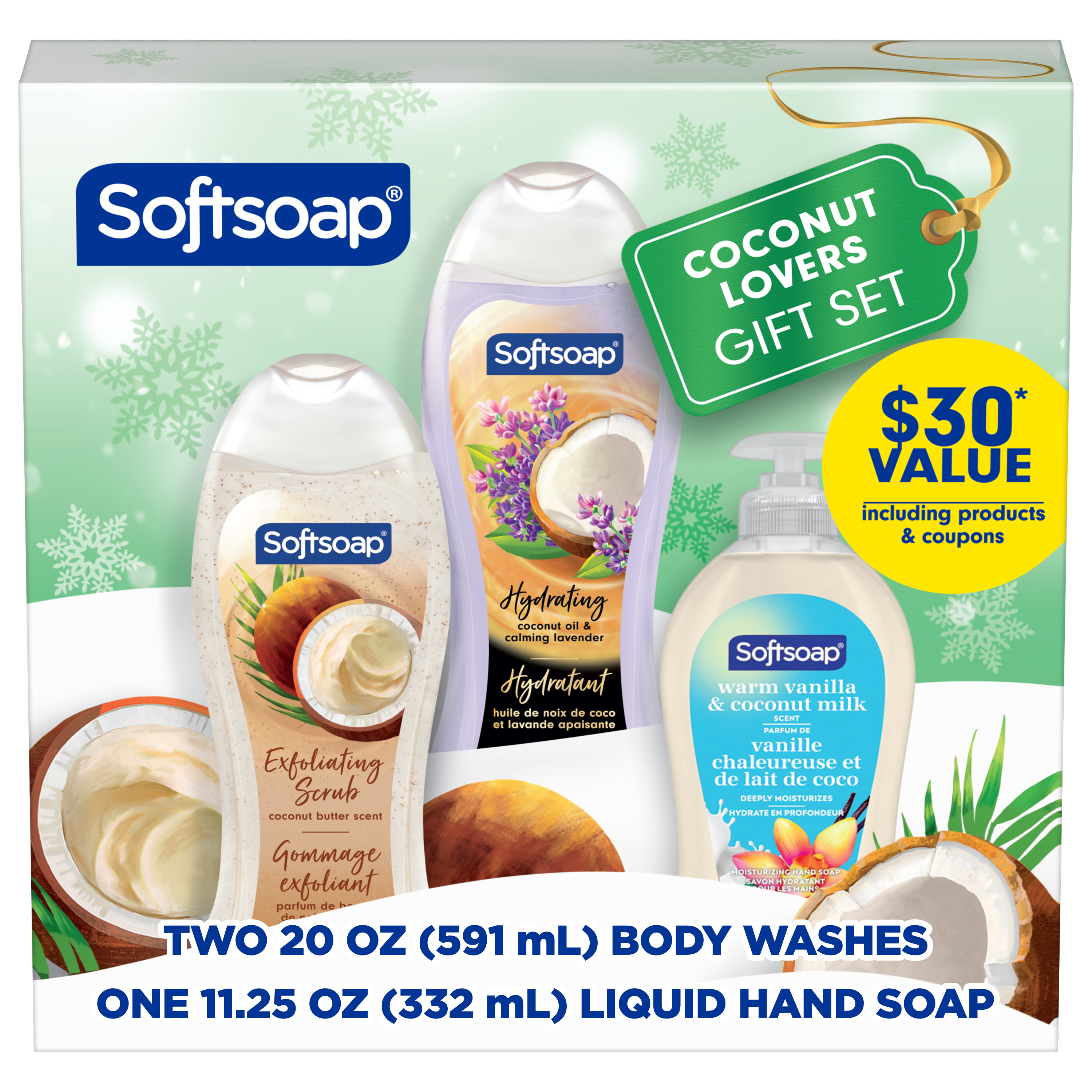 SKU 61052163 Consumer Unit - GTIN 00827854025061 Case - GTIN 10827854025068 Product Category Personal Care Product Sub Category Body Wash Product Equity (Brand) Softsoap Product Sub Brand Softsoap BW Product Title Softsoap Coconut Lovers Gift Set, 20 fl oz Coconut Butter Scent Exfoliating Body Wash, 20 fl oz Coconut Oil & Calming Lavender Body Wash, 11.25 fl oz Warm Vanilla & Coconut Milk Scent Liquid Hand Soap Product Description Celebrate the holidays and bring seasonal joy to every wash with the Softsoap Limited Edition Coconut Lovers Holiday Gift Set—a $30 value* featuring two 20 fl oz body washes and one 11.25 fl oz liquid hand soap. Tucked inside the festive box, you’ll also find valuable coupons for extra savings on future Softsoap purchases, making this set a thoughtful holiday gift or a delightful treat for yourself during the winter season. Indulge in a tropical escape amidst the holiday hustle with irresistible scents and gentle, effective cleansing for both hands and body. The Coconut Butter Scented Exfoliating Body Wash offers creamy lather and exfoliation, while the Coconut Oil & Calming Lavender Body Wash—made with real coconut oil—helps your skin retain its natural moisture, even in colder months. The Warm Vanilla & Coconut Milk Scented Hand Soap helps retain skin’s natural moisture. All products are dermatologist tested, pH balanced, and free from parabens and phthalates, ensuring safe daily use for all skin types. This 3-piece Softsoap Gift Set is the perfect present for the holidays—Christmas, Hanukkah, Kwanzaa, or any winter celebration—or a wonderful way to elevate your own self-care routine with luxurious fragrances that bring warmth to the season. *vs. MSRP if each item purchased separately and use of coupons Bullet 1 $30 value* set includes two 20 fl oz body washes and one 11.25 fl oz liquid hand soap, plus valuable coupons for extra Softsoap savings Bullet 2 Indulge your senses with the aromas of coconut butter, coconut oil, lavender, vanilla, and coconut milk for a relaxing bath, shower, or hand wash Bullet 3 These moisturizing formulas help retain your skin’s natural moisture, leaving you feeling soft, refreshed, and ready to enjoy the holidays Bullet 4 Body washes and hand soap are dermatologist tested, pH balanced, and formulated with parabens or phthalates Bullet 5 Makes a perfect Christmas gift for family or friends or to elevate your own self-care routine with luxurious fragrances Bullet 6 Ideal for the busy holiday season, this set fills every sink and shower in your home with a relaxing, festive touch and a refreshing clean Bullet 7 Limited edition gift set brings seasonal magic to every wash Walmart RPC 16341007471 Walmart URL (Computed) https://www.walmart.com/ip/a/16341007471