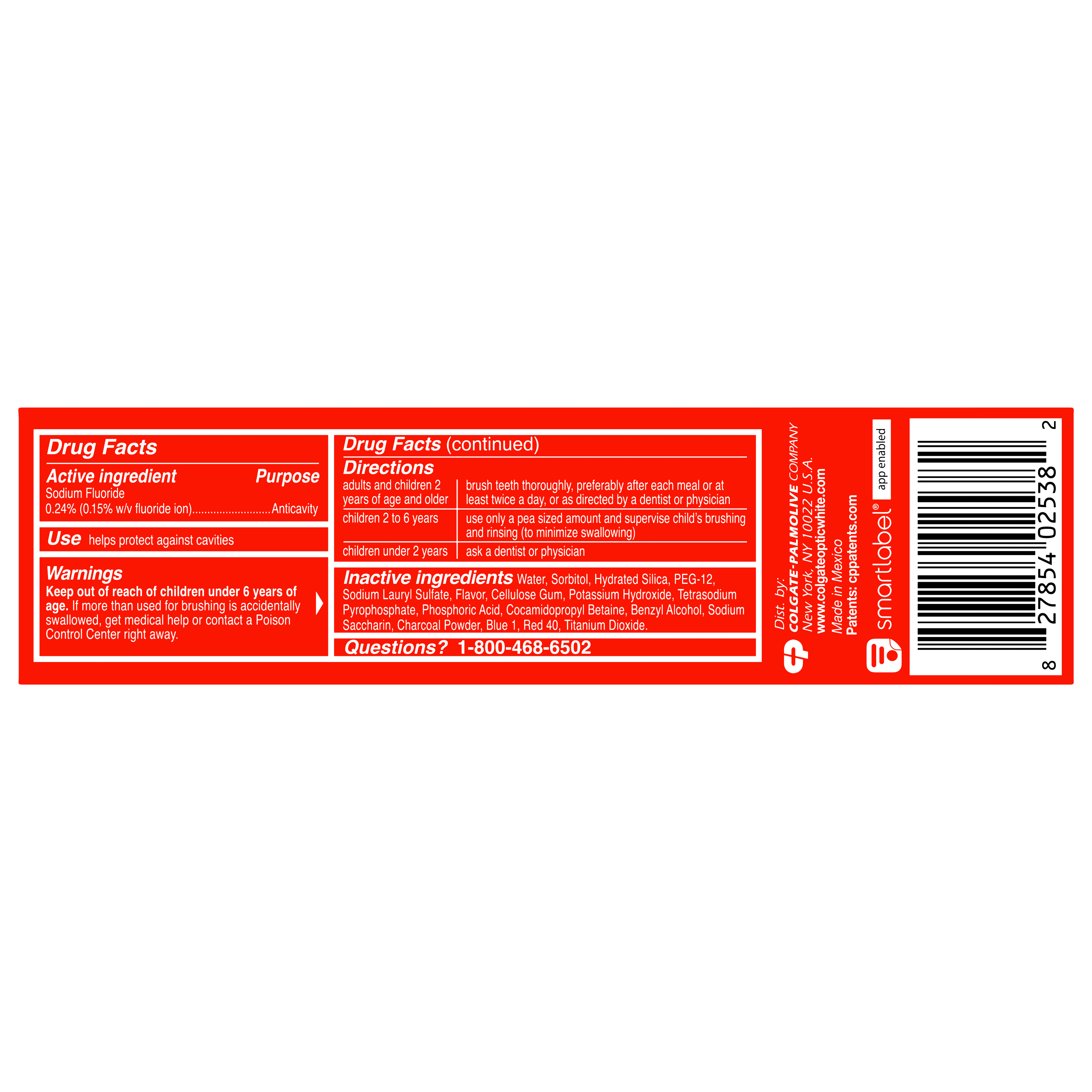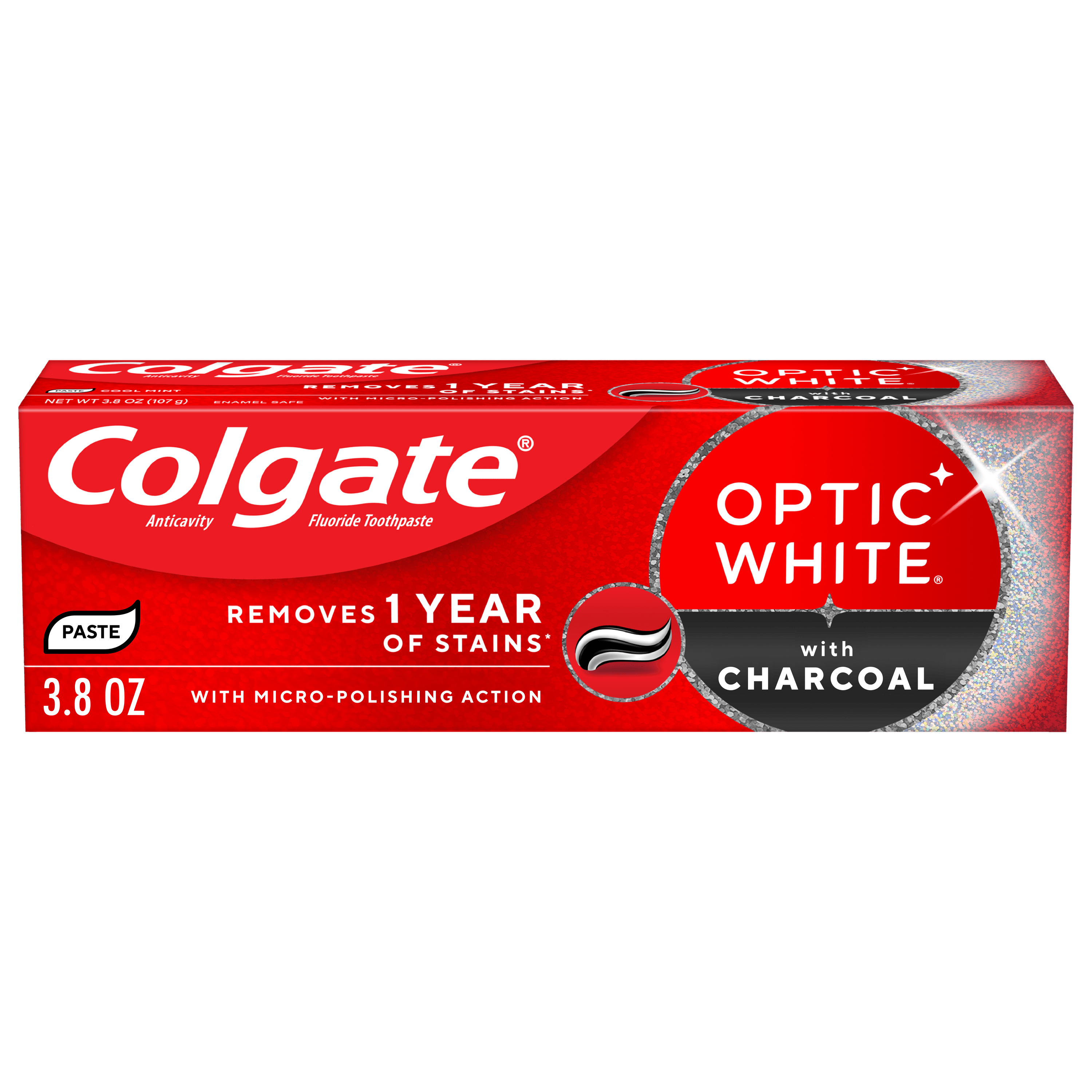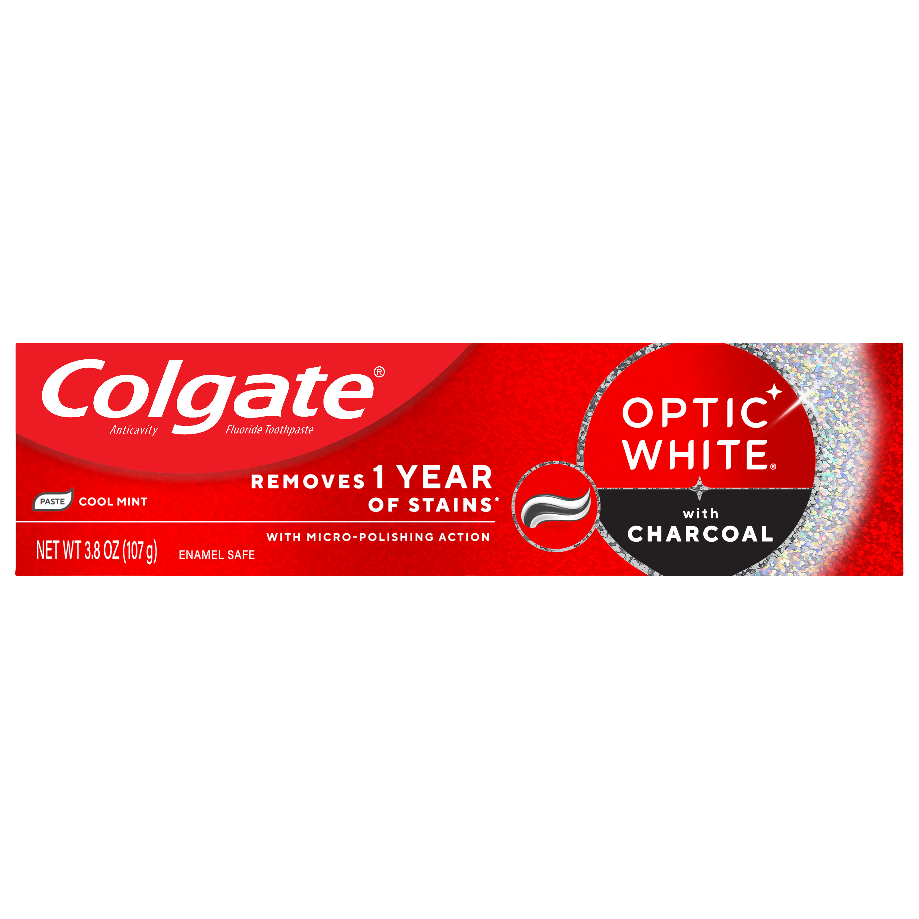 SKU 61052427 Consumer Unit - GTIN 00827854025382 Case - GTIN 10827854025389 Product Category Oral Care Product Sub Category Toothpaste Product Equity (Brand) Colgate Product Sub Brand Colgate Optic White TP Product Title Colgate Optic White with Charcoal Teeth Whitening Toothpaste, Anticavity Toothpaste with Fluoride, Cool Mint Flavor, 3.8 OZ Product Description Colgate Optic White with Charcoal Toothpaste removes 1 year of stains* while freshening breath with its cool mint flavor. With effective micropolishers, this teeth whitening toothpaste safely removes surface stains. Enamel safe for daily use, Optic White with Charcoal delivers a refreshing experience with a sweet peppermint flavor. Optic White with Charcoal removes 5X more surface stains with micro-polishing action** for a brighter smile. Micro-Polishing Action: Safely Removes Surface StainsColgate Optic White with Charcoal uses micropolishers to brush away surface stains and help prevent new ones from forming. This black toothpaste with black and white stripes is designed to remove 1 year of stains*.Enamel Safe ToothpasteOptic White with Charcoal is a patented whitening formula that is enamel safe for everyday use and an effective anticavity toothpaste with fluoride.Cool Mint ToothpasteOur sweet peppermint toothpaste freshens breath with a cool mint flavor that lasts from the first taste to the finish.*when brushing twice daily for 3 weeks**vs. ordinary, non-whitening toothpaste after 2 weeks of continued use eCommerce Copy- Long Description Help remove everyday surface stains with the Colgate Optic White Whitening Toothpaste with Charcoal. This whitening toothpaste pack removes 95% of daily surface stains* for a brighter smile. Get ready to reveal a smile that’s ready to shine with the Colgate Optic White Whitening Toothpaste with Charcoal. The Colgate Optic White Whitening Toothpaste with Charcoal uses a patented whitening formula to remove 95% of daily surface stains*. Using micro-polishing actions, this whitening stain removal toothpaste removes 5X more surface stains.** Plus, this toothpaste comes in a refreshing Cool Mint toothpaste flavor so you can enjoy minty freshness every time you brush. Colgate Optic White Toothpaste with Charcoal is a sugar free and vegan toothpaste that is enamel-safe for daily use. This teeth whitening toothpaste is also an anticavity fluoride toothpaste to help prevent cavities. For whitening that works, choose the Colgate Optic White Whitening with Charcoal Toothpaste Pack. *after 2 weeks of twice daily use **vs. ordinary, non whitening toothpaste after 2 weeks of continued use Bullet 1 One 3.8 oz tube of Colgate Optic White with Charcoal Toothpaste Bullet 2 Removes 1 year of stains* (*when brushing twice daily for three weeks) Bullet 3 Safely removes 5X more surface stains with micro-polishing action* (*vs. ordinary, non-whitening toothpaste after 2 weeks of continued use) Bullet 4 Cool Mint flavor with sweet peppermint and anise for a refreshing taste Bullet 5 Enamel safe for daily use Bullet 6 Optic White with Charcoal is a fluoride toothpaste that provides cavity protection Bullet 7 Optic White with Charcoal is a vegan toothpaste Active Ingredients Sodium Fluoride 0.24% (0.15% w/v fluoride ion) Walmart RPC 17951817704 Walmart URL (Computed) https://www.walmart.com/ip/a/17951817704 Albertsons RPC 970027990 Albertsons URL https://www.albertsons.com/shop/product-details.970027990.html CVS RPC 350961 Family Dollar RPC 998909