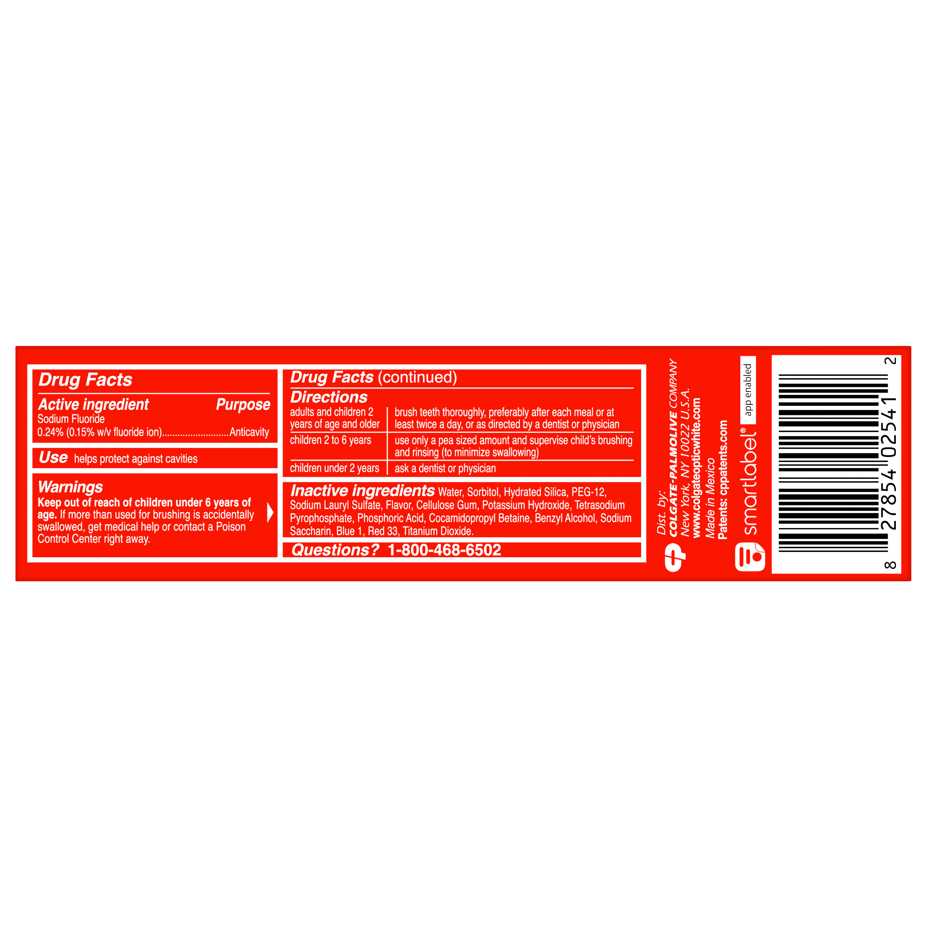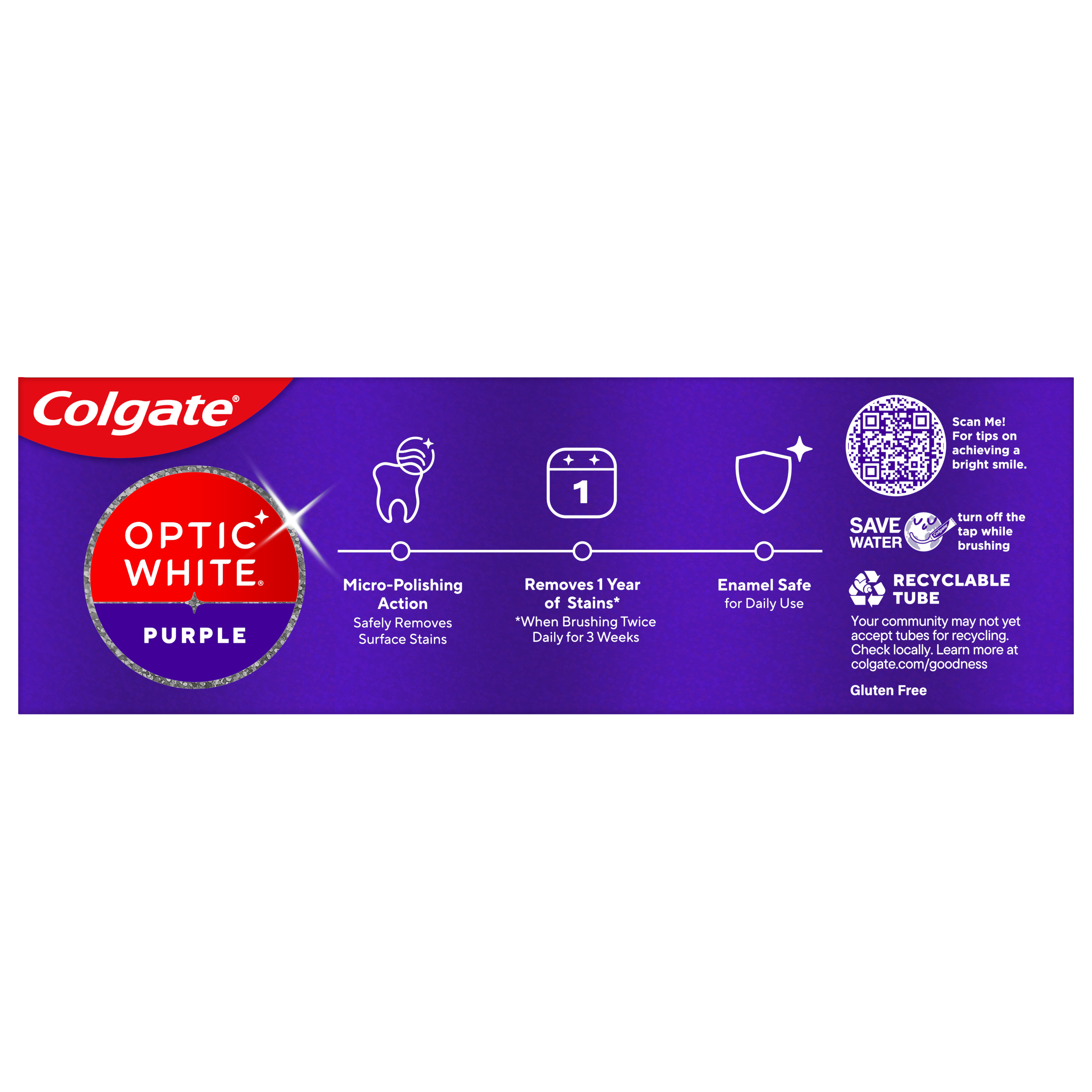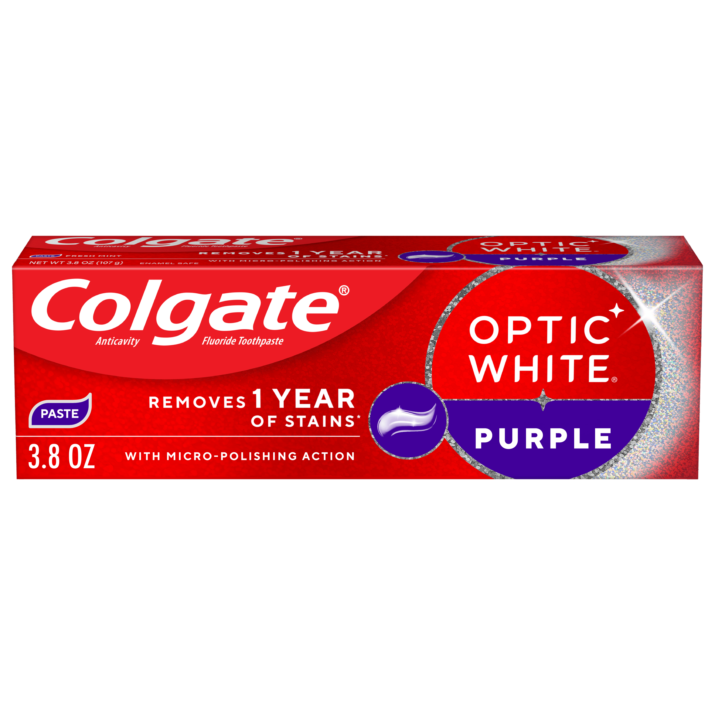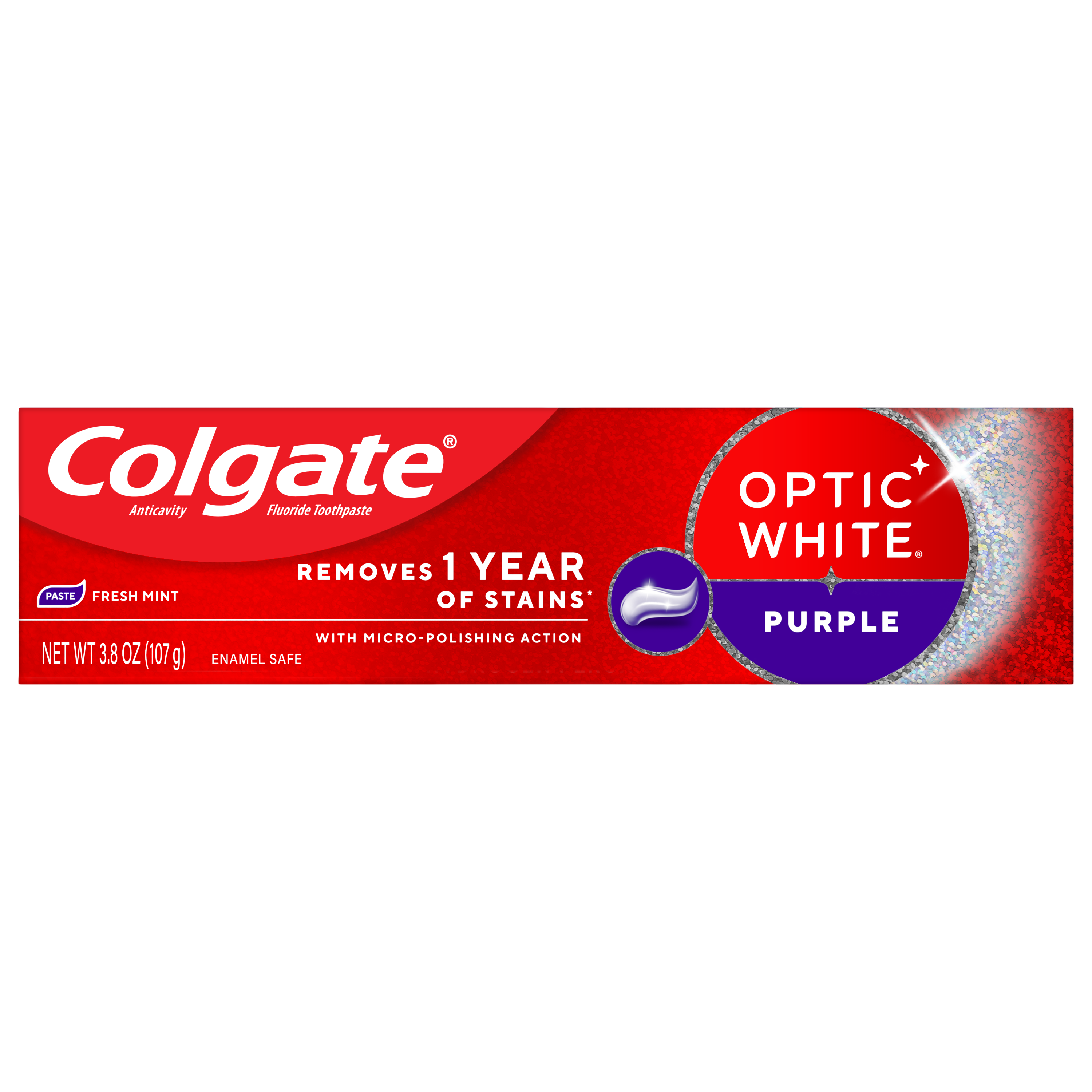 SKU 61052438 Consumer Unit - GTIN 00827854025412 Case - GTIN 10827854025419 Product Category Oral Care Product Sub Category Toothpaste Product Equity (Brand) Colgate Product Sub Brand Colgate Optic White TP Product Title Colgate Optic White Purple Teeth Whitening Toothpaste, Anticavity Toothpaste with Fluoride, Fresh Mint Flavor, 3.8 OZ Product Description Colgate Optic White Purple Toothpaste removes 1 year of stains* while freshening breath with its mint flavor. With effective micropolishers, this anticavity toothpaste safely removes surface stains. Designed to be enamel safe for daily use, this teeth whitening toothpaste delivers a refreshing experience with a sweet peppermint flavor. Optic White Purple removes 5X more surface stains with micro-polishing action** for a brighter smile. Colgate Optic White uses micropolishers to brush away surface stains and help prevent new ones from forming. This purple toothpaste gets the job done with a patented whitening formula to remove 1 year of stains*. Optic White Purple provides the effective protection of an anticavity fluoride toothpaste. Plus, it is designed for enamel-safe stain removal. Our sweet peppermint toothpaste freshens breath with a mint flavor from the first taste to the finish. *when brushing twice daily for 3 weeks **vs. ordinary, non-whitening toothpaste after 2 weeks of continued use eCommerce Copy- Long Description Colgate Optic White Purple Toothpaste removes 1 year of stains* while freshening breath with its mint flavor. With effective micropolishers, this anticavity toothpaste safely removes surface stains. Designed to be enamel safe for daily use, this teeth whitening toothpaste pack delivers a refreshing experience with a sweet peppermint flavor. Optic White Purple removes 5X more surface stains with micro-polishing action** for a brighter smile. Colgate Optic White uses micropolishers to brush away surface stains and help prevent new ones from forming. This purple toothpaste gets the job done with a patented whitening formula to remove 1 year of stains*. Optic White Purple provides the effective protection of an anticavity fluoride toothpaste. Plus, this triple toothpaste pack is designed for enamel-safe stain removal. Our sweet peppermint toothpaste freshens breath with a mint flavor from the first taste to the finish. *when brushing twice daily for 3 weeks **vs. ordinary, non-whitening toothpaste after 2 weeks of continued use Bullet 1 One 3.8 oz tube of Colgate Optic White Purple Toothpaste Bullet 2 Removes 1 year of stains* (*when brushing twice daily for 3 weeks) Bullet 3 Safely removes 5X more surface stains with micro-polishing action* (*vs. ordinary, non-whitening toothpaste after 2 weeks of continued use) Bullet 4 Fresh mint toothpaste flavor with sweet peppermint and anise for a refreshing taste Bullet 5 Enamel safe for daily use Bullet 6 Optic White Purple is a fluoride toothpaste that provides cavity protection Bullet 7 Purple toothpaste for teeth whitening Active Ingredients Sodium Fluoride 0.24% (0.15% w/v fluoride ion) Walmart RPC 17909566938 Walmart URL (Computed) https://www.walmart.com/ip/a/17909566938 Target RPC 94823729 Target URL https://www.target.com/p/a/-/A-94823729 CVS RPC 831633 Family Dollar RPC 903946