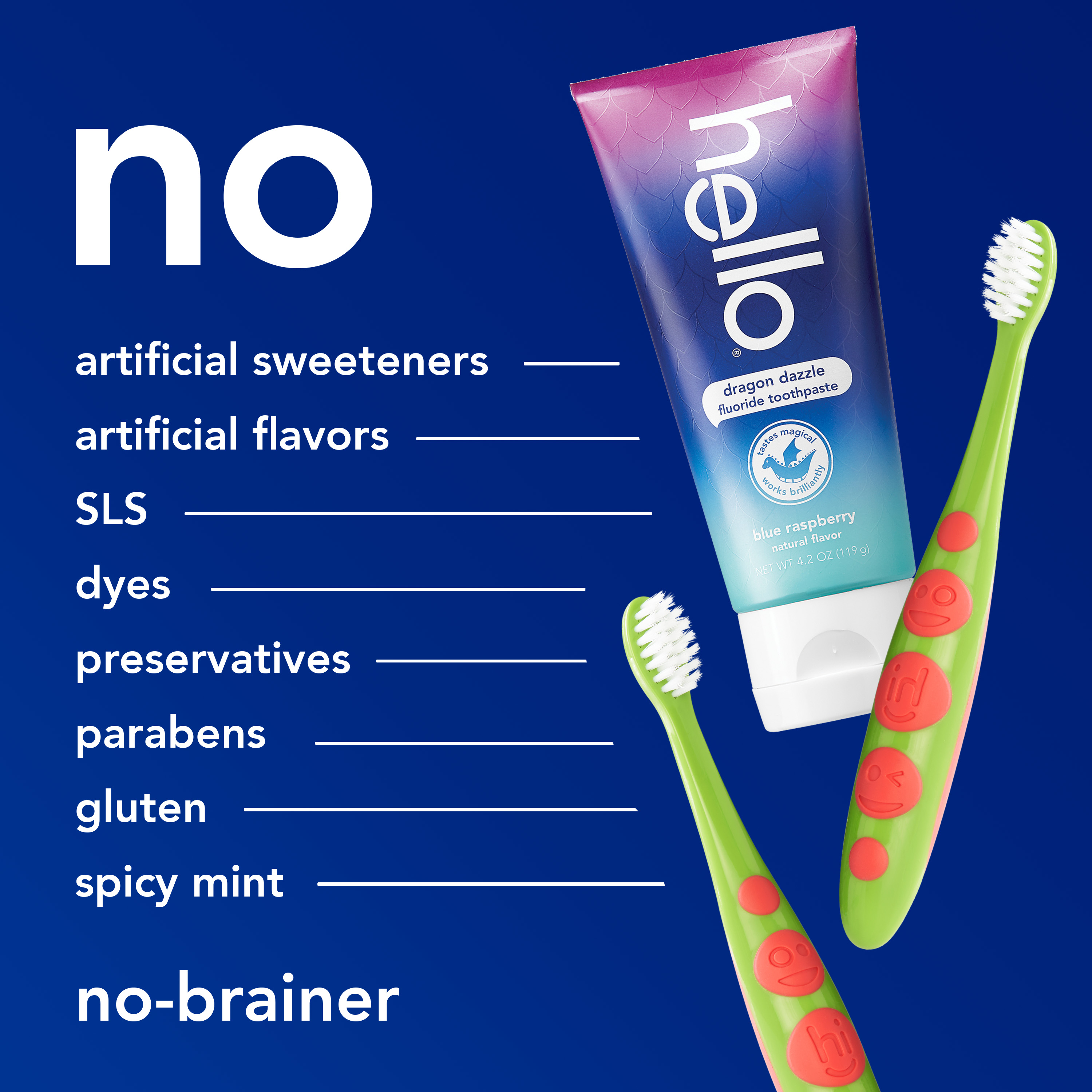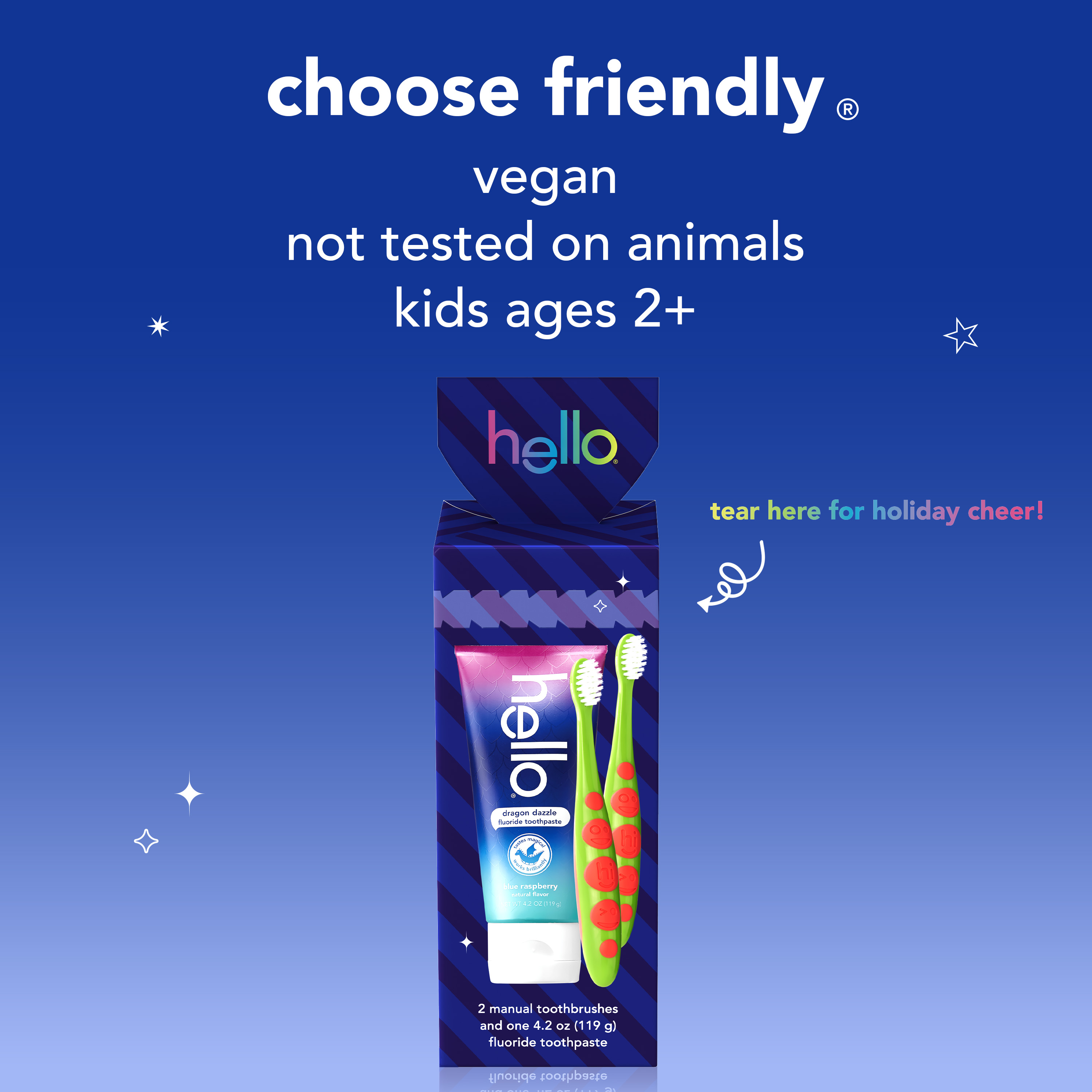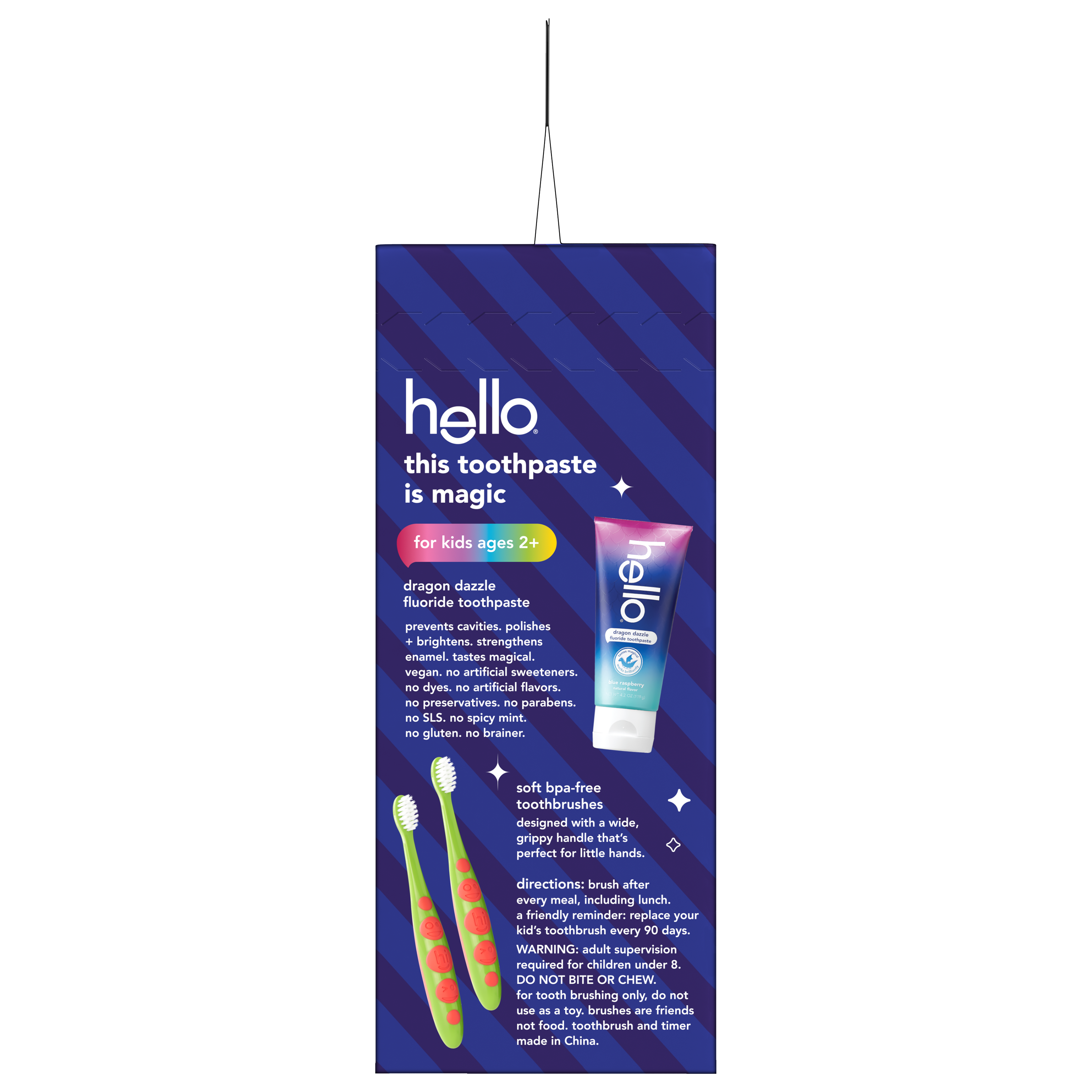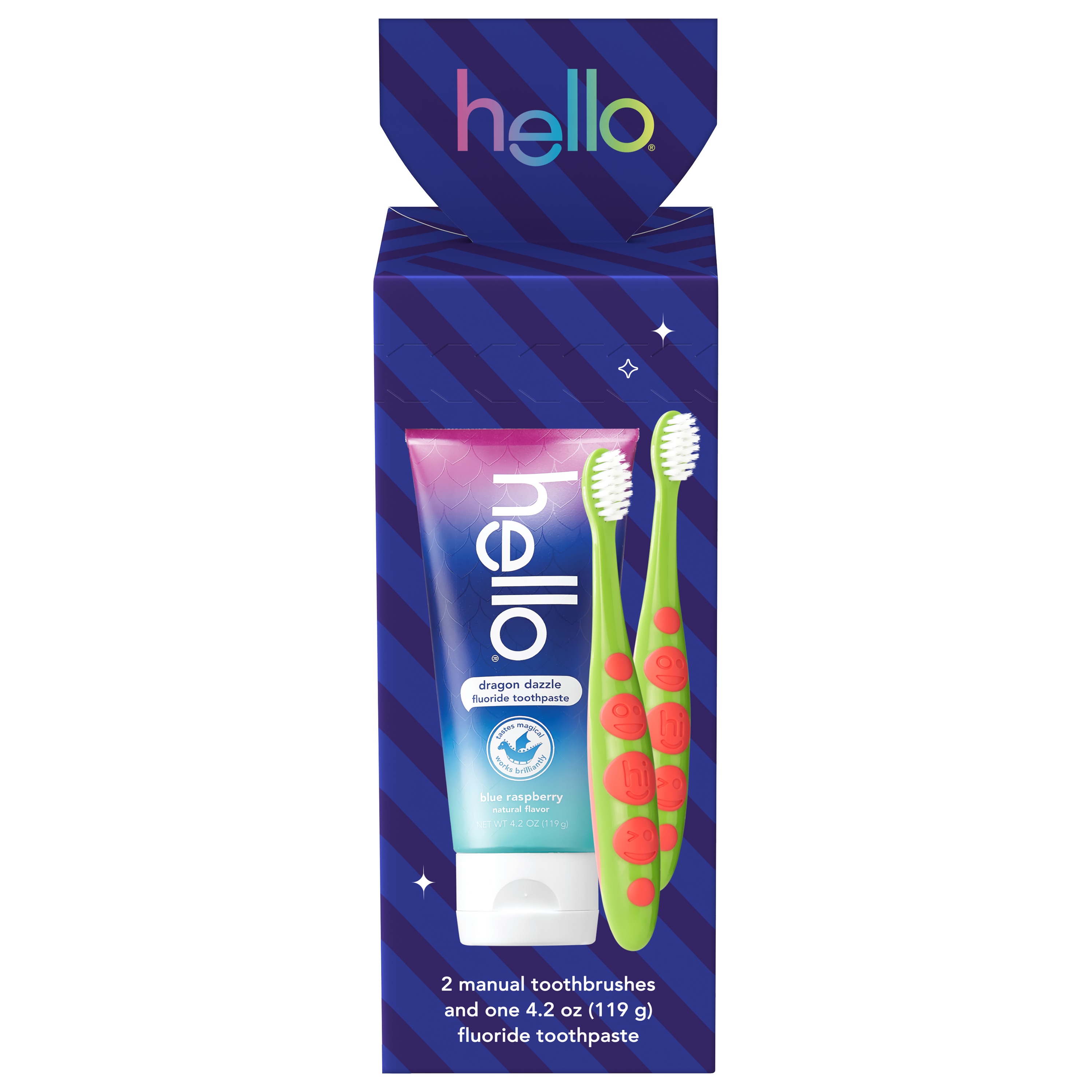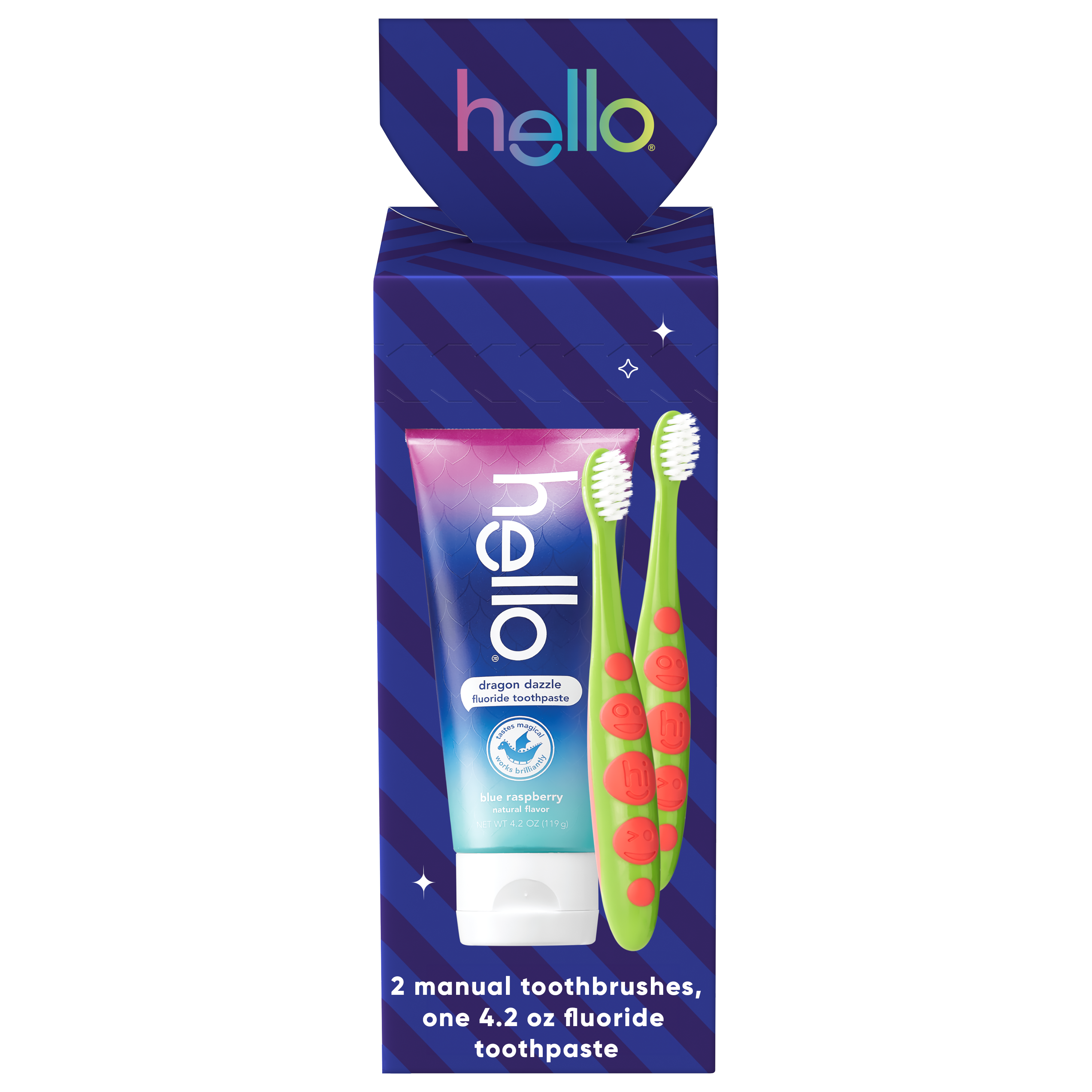 | Bullet 1 | What's Included: This kids holiday gift pack includes two (2) soft bristled kids toothbrushes and one (1) 4.2 oz hello Dragon Dazzle Blue Raspberry Flavored Kids Fluoride Toothpaste |