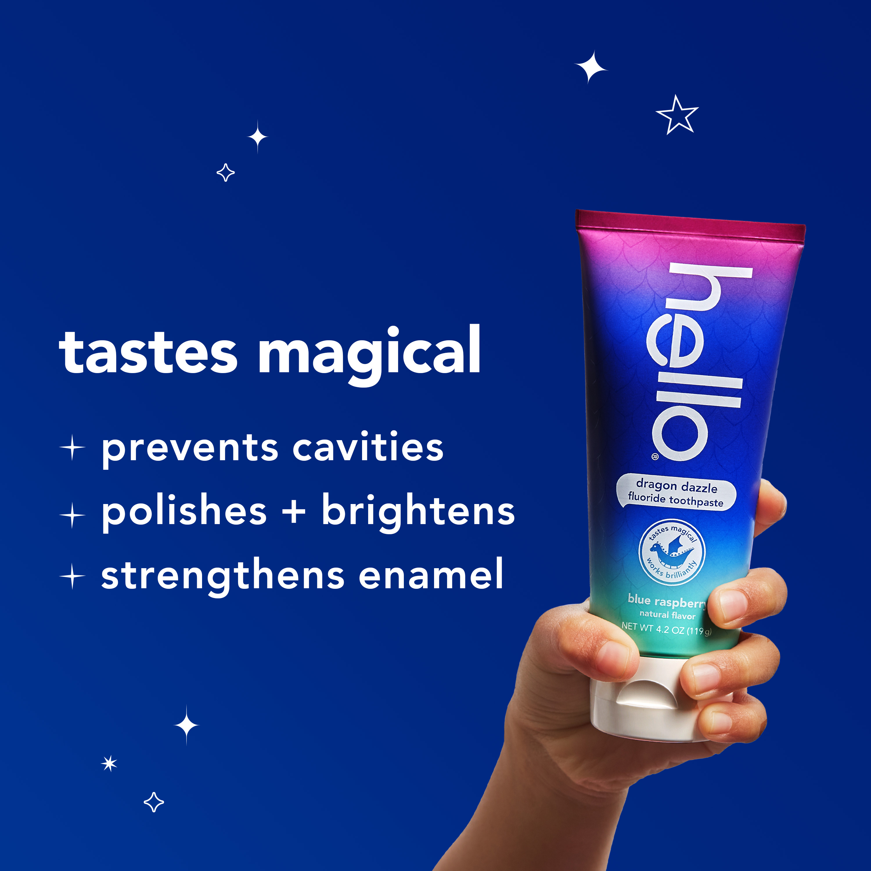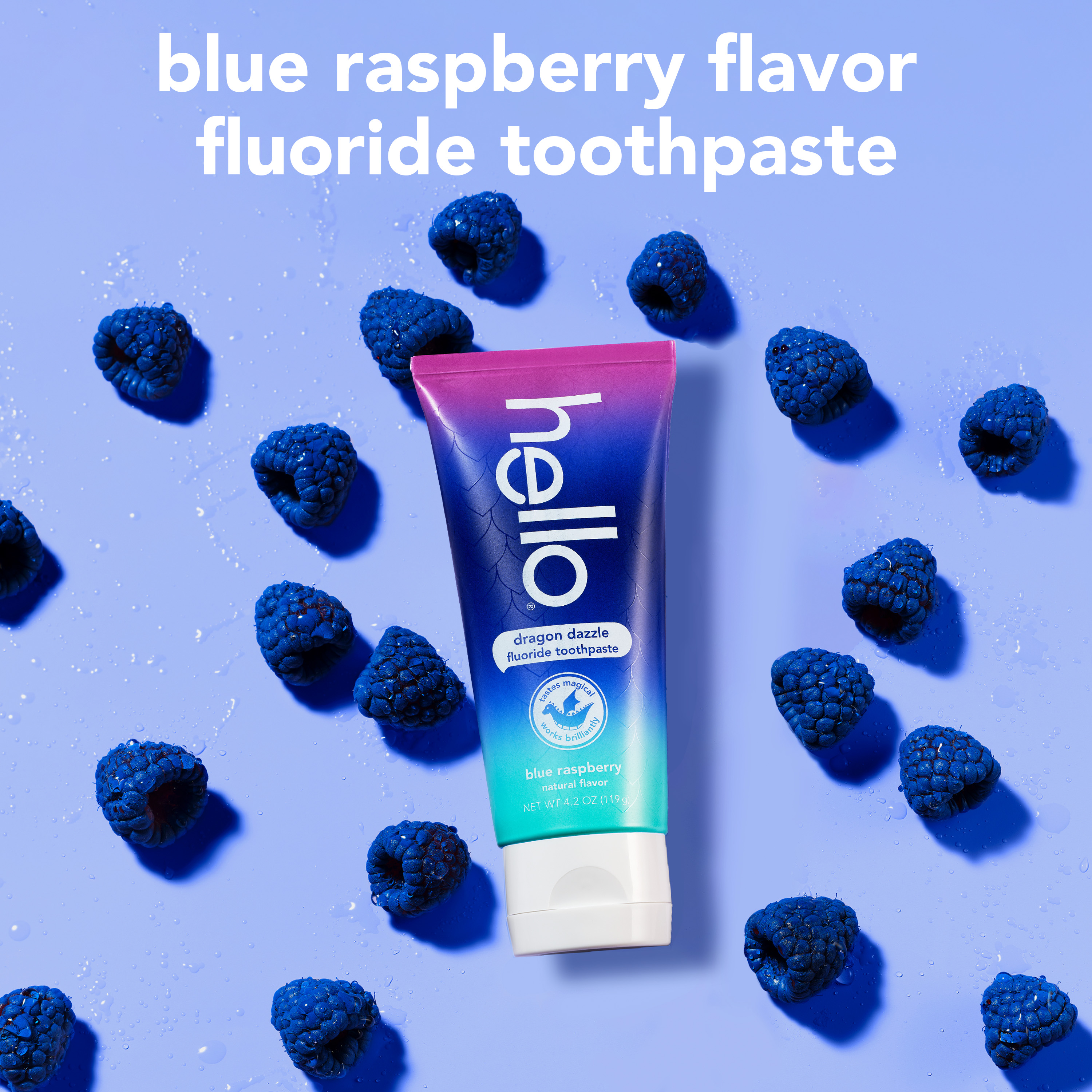 | Bullet 4 | Magical Flavor: The hello Dragon Dazzle blue raspberry flavored kids toothpaste is formulated with fluoride to help prevent cavities and strengthen teeth enamel |