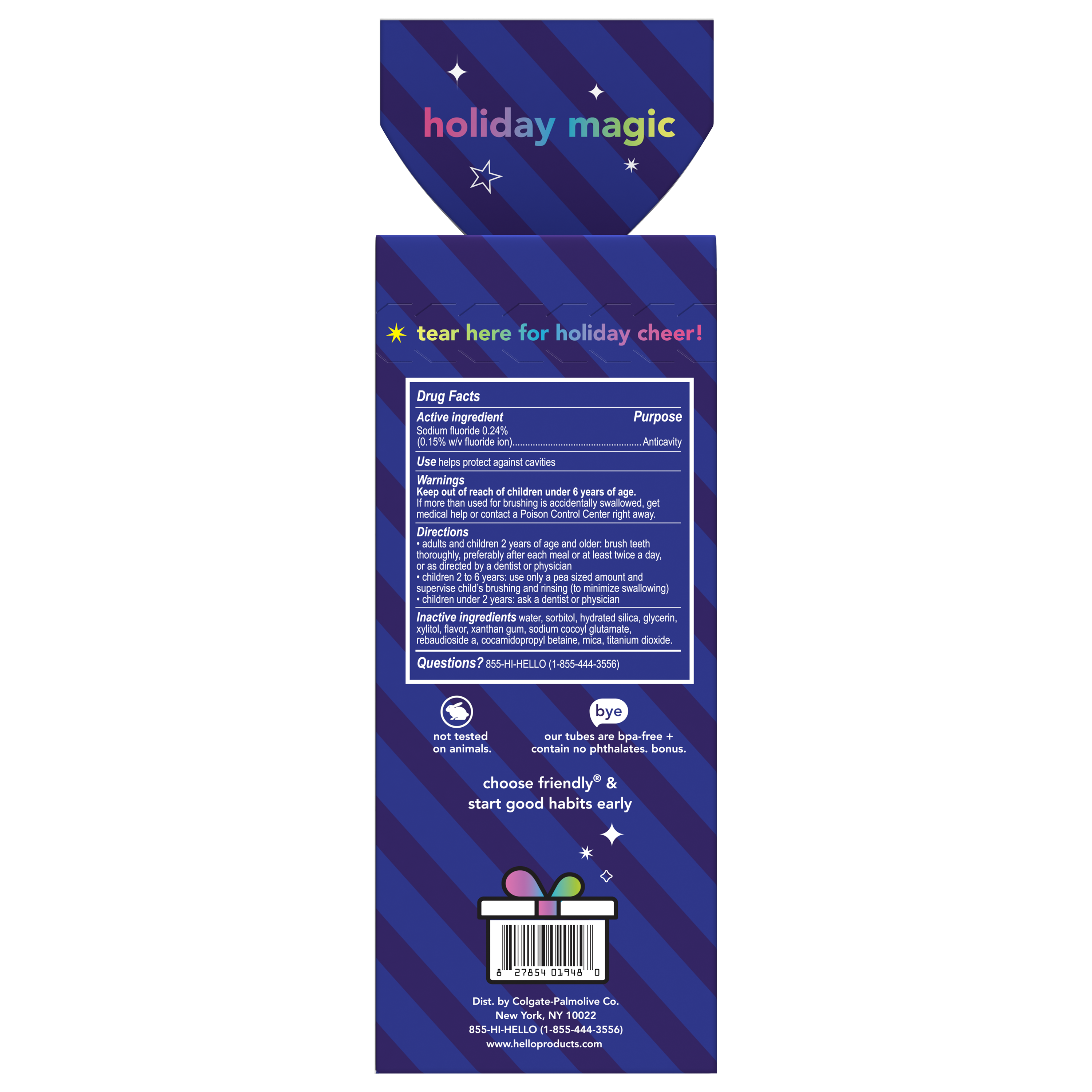 | Product Description | Say hello to filling their stocking with magic this holiday with the hello Kids Toothbrush and Kids Toothpaste Stocking Stuffer Holiday Gift Set. Joyfully bundled for children ages 2 and up, this kids holiday gift pack includes two soft bristled kids toothbrushes and a juicy, blue raspberry kids fluoride toothpaste that helps prevent cavities and strengthens enamel. The soft kids toothbrushes help gently polish and use a grippy handle and the kids toothpaste with fluoride tastes magical and contains no spicy mint, artificial sweeteners or flavors, dyes, preservatives, parabens, SLS, or gluten. |