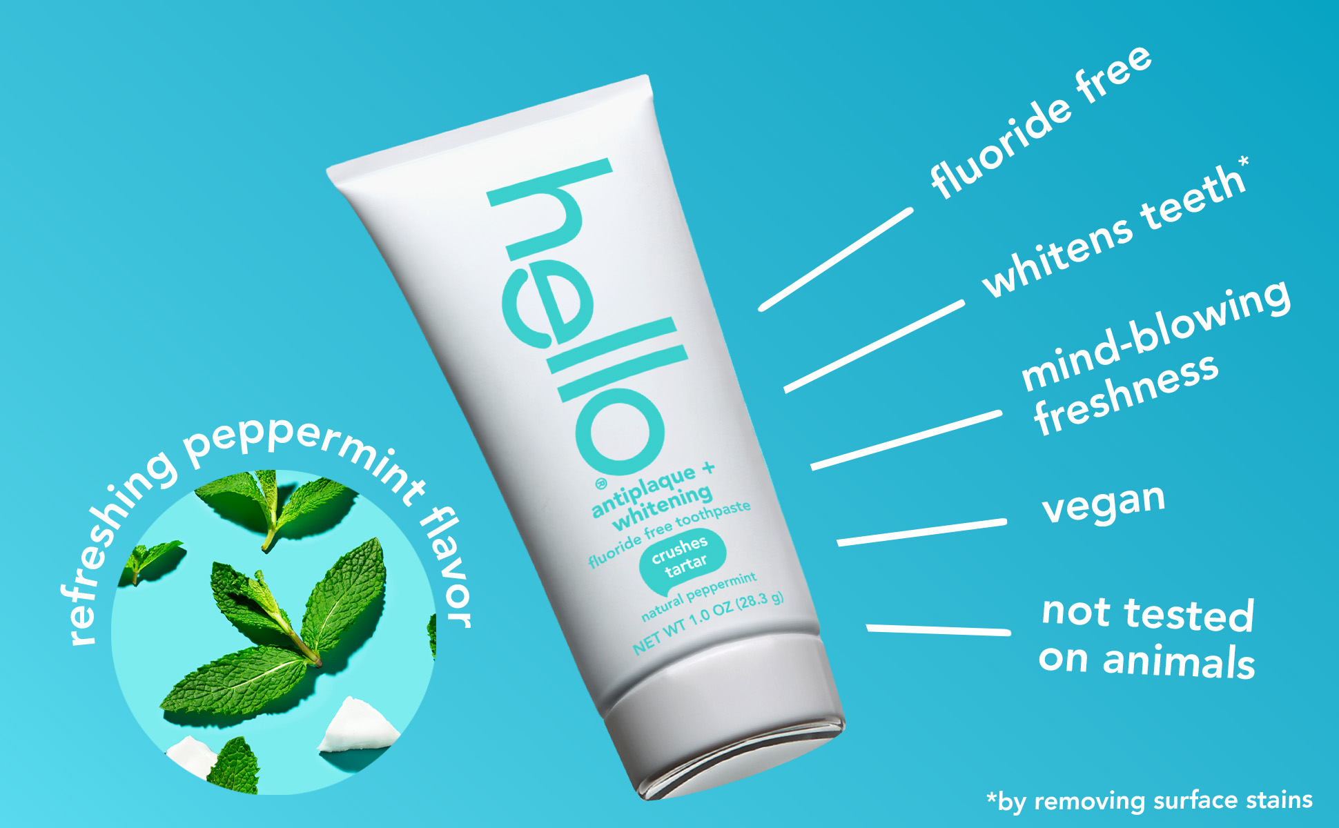 SKU 61052685 Consumer Unit - GTIN 00035000002259 Case - GTIN 10035000002058 Product Category Oral Care Product Sub Category Toothpaste Product Equity (Brand) hello Product Sub Brand Hello Adult TP Product Title hello Antiplaque and Whitening Fluoride Free Travel Toothpaste, Natural Peppermint, 1 Oz Product Description Say hello to a mighty and tiny fluoride free toothpaste that helps whiten teeth and crush tartar during your travels with hello Antiplaque and Whitening Travel Toothpaste. This travel friendly fluoride free teeth whitening toothpaste for adults is TSA-approved and helps brush away plaque with regular brushing and includes high quality ingredients like farm grown peppermint, tea tree oil, and coconut oil to help tame bad breath and moisturize magnificently. Show tartar who’s boss with hello Antiplaque Natural Whitening Toothpaste, a fluoride free whitening toothpaste that helps brush away plaque with regular brushing and naturally whitens with mighty minerals by removing surface stains. Plus, this peppermint toothpaste is a fluoride free toothpaste that tastes awesome and works brilliantly to tame bad breath, helping you start the day with minty fresh breath. This hello fluoride free toothpaste is a vegan toothpaste and an SLS free toothpaste and contains no artificial sweeteners, artificial flavors, peroxide, synthetic dyes, titanium dioxide, and is gluten free. No-brainer. As if that weren't enough magic for one tube, hello antiplaque toothpaste is also not tested on animals. Show tartar who’s boss and choose friendly with this fluoride free hello Antiplaque Whitening Travel Size Toothpaste. eCommerce Copy- Long Description Say hello to a mighty and tiny fluoride free toothpaste that helps whiten teeth and crush tartar during your travels with hello Antiplaque and Whitening Travel Toothpaste. This travel friendly fluoride free teeth whitening toothpaste for adults is TSA-approved and helps brush away plaque with regular brushing and includes high quality ingredients like farm grown peppermint, tea tree oil, and coconut oil to help tame bad breath and moisturize magnificently. Show tartar who’s boss with hello Antiplaque Natural Whitening Toothpaste, a fluoride free whitening toothpaste that helps brush away plaque with regular brushing and naturally whitens with mighty minerals by removing surface stains. Plus, this peppermint toothpaste is a fluoride free toothpaste that tastes awesome and works brilliantly to tame bad breath, helping you start the day with minty fresh breath. This hello fluoride free toothpaste is a vegan toothpaste and an SLS free toothpaste and contains no artificial sweeteners, artificial flavors, peroxide, synthetic dyes, titanium dioxide, and is gluten free. No-brainer. As if that weren't enough magic for one tube, hello antiplaque toothpaste is also not tested on animals. Show tartar who’s boss and choose friendly with this fluoride free hello Antiplaque Whitening Travel Size Toothpaste. Bullet 1 Includes one (1) 1.0 oz travel size tube of hello Antiplaque and Whitening Fluoride Free Travel Toothpaste, Natural Peppermint Toothpaste Bullet 2 The travel size natural whitening toothpaste is TSA approved and naturally whitens with friendly minerals by removing surface stains Bullet 3 This travel size mint toothpaste is formulated with farm grown peppermint, tea tree oil to tame bad breath, and coconut oil to moisturize Bullet 4 hello Antiplaque mini toothpaste is a plaque remover toothpaste that helps remove plaque and crush tartar with regular brushing Bullet 5 Contains no SLS, peroxide, dyes, parabens, artificial sweeteners or flavors, titanium dioxide, and is a gluten free vegan toothpaste Bullet 6 Tame bad breath and add a bit of friendly freshness to your brushing routine with hello peppermint toothpaste Bullet 7 Say hello to an SLS free toothpaste that is fluoride free, helps whiten teeth, and crush tartar with this hello Antiplaque and Whitening Travel Size Toothpaste Target RPC 94903481 Target URL https://www.target.com/p/a/-/A-94903481