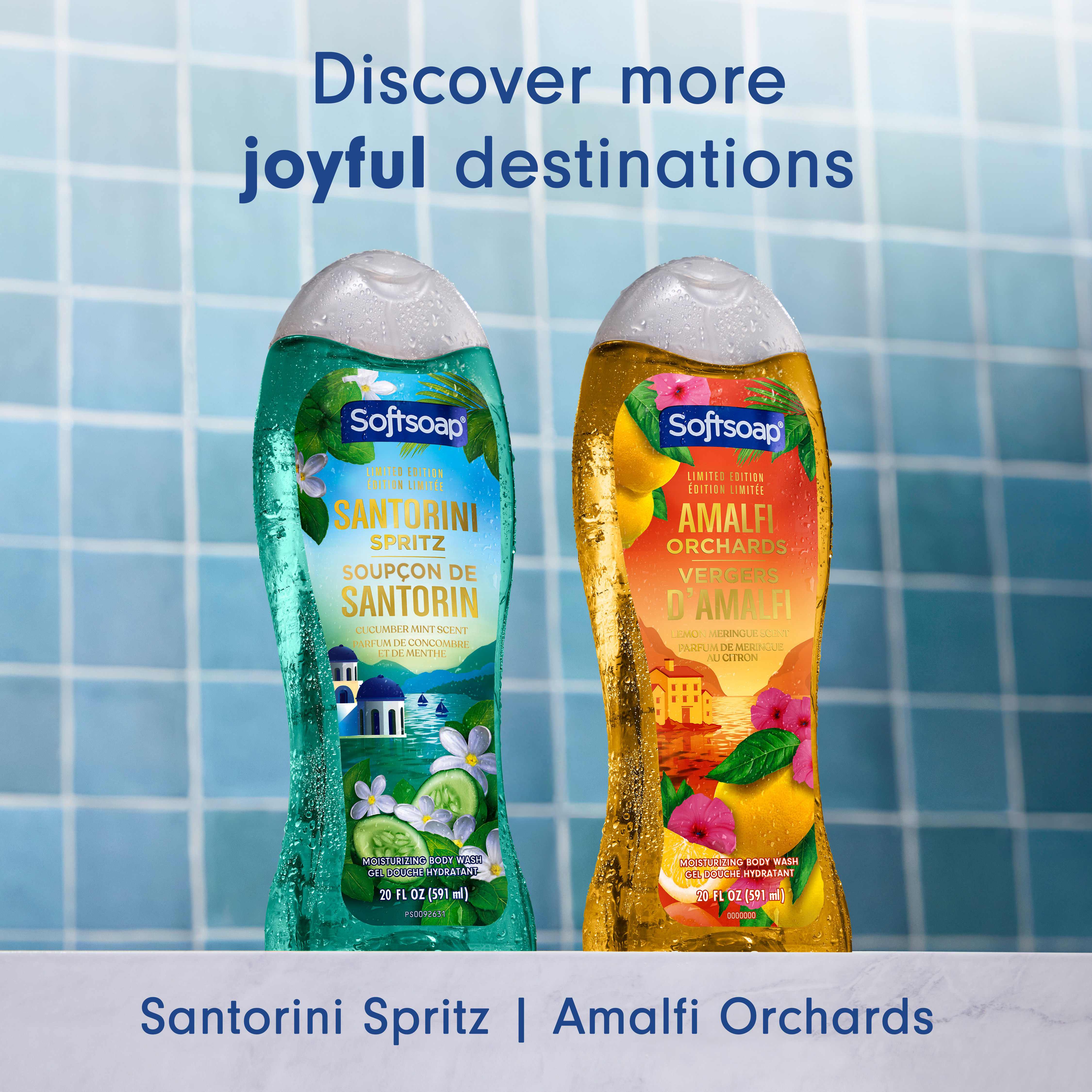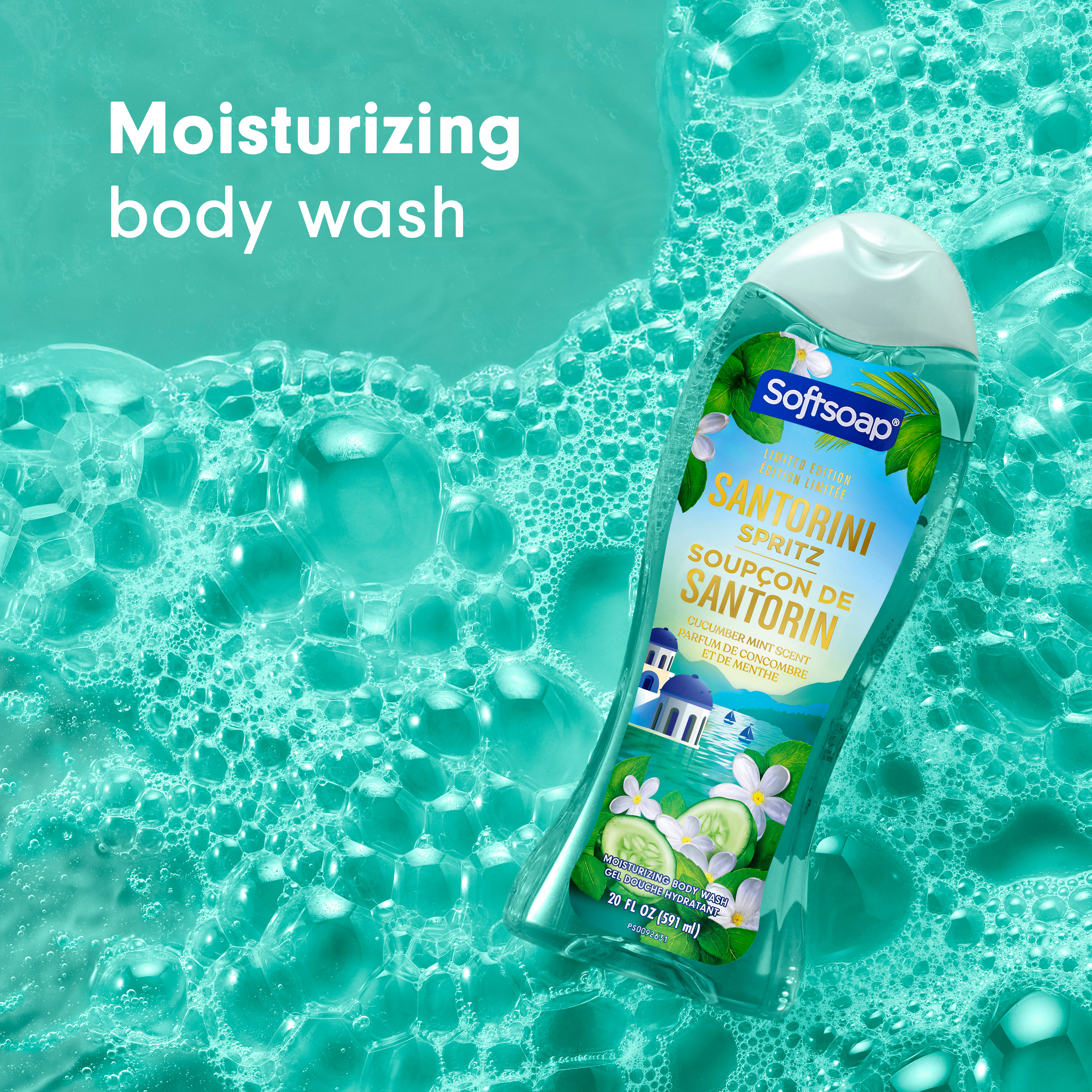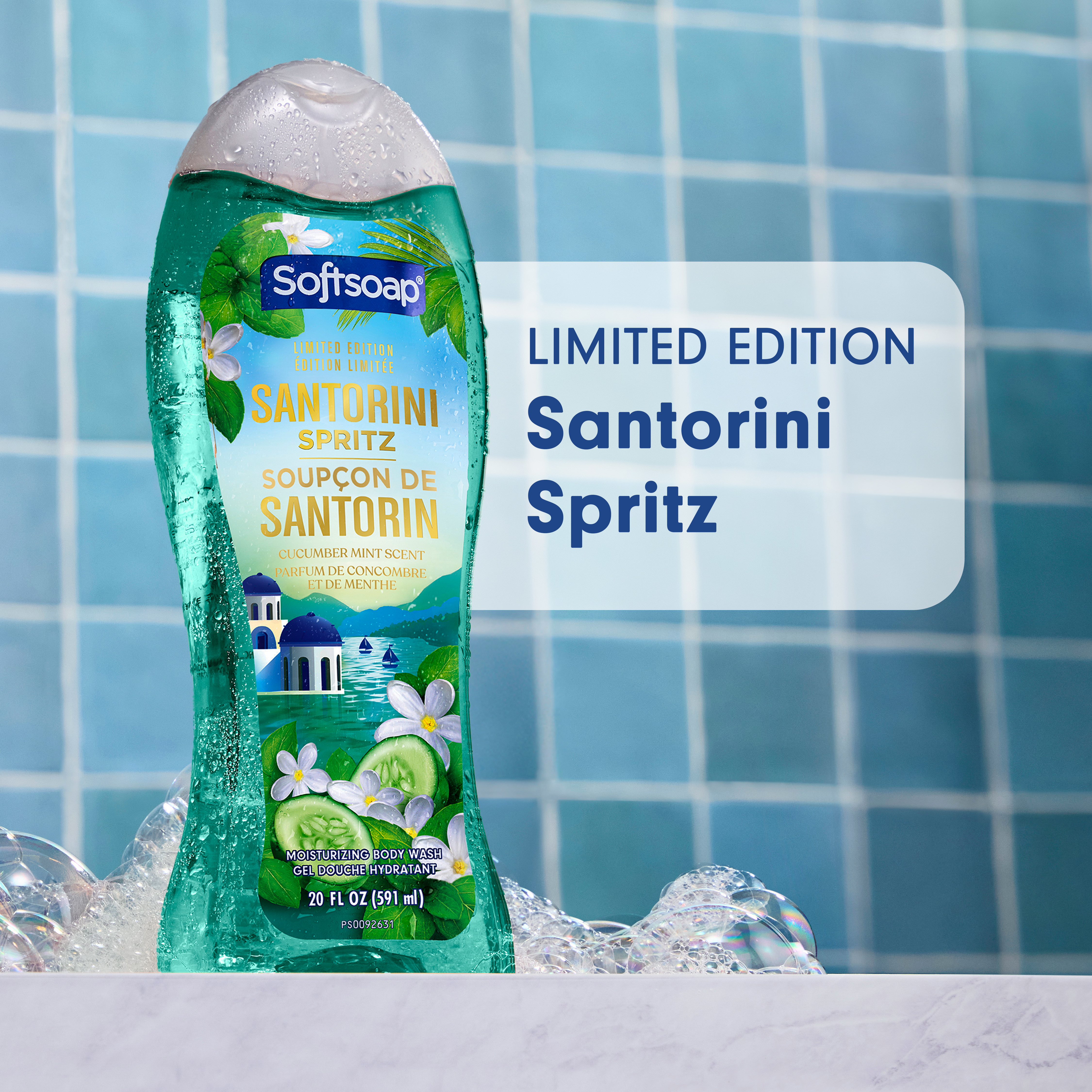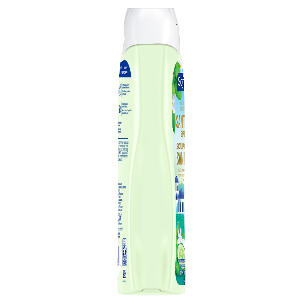 SKU 61052807 Consumer Unit - GTIN 00827854025856 Case - GTIN 10827854025853 Product Category Personal Care Product Sub Category Body Wash Product Equity (Brand) Softsoap Product Sub Brand Softsoap Limited Edition BW Product Title Softsoap Limited Edition Santorini Spritz Moisturizing Body Wash, pH Balanced, Paraben Free, Body Wash and Shower Gel, Cucumber Mint Scent, 20 fl oz Product Description Experience a burst of bliss every day with Softsoap Limited Edition Santorini Spritz Moisturizing Body Wash. Let your senses escape to this beautiful destination with every wash, inspired by one of the world’s most sought-after getaways and the refreshing aroma of cucumbers and mint. This body wash brings freshness to every shower, leaving you feeling refreshed and revitalized. Softsoap is a moisturizing body wash - pH balanced to help maintain your skin’s natural moisture. This body wash is formulated without parabens and phthalates, making it a gentle option for the whole family. Softsoap is a great choice as a girls body wash or kids body wash. Whether you’re searching for a blue body wash, a shower gel, or simply a delightful new addition to your daily routine, Softsoap’s got you covered! eCommerce Copy- Long Description Experience a burst of bliss every day with Softsoap Limited Edition Santorini Spritz Moisturizing Body Wash. Let your senses escape to this beautiful destination with every wash, inspired by one of the world’s most sought-after getaways and the refreshing aroma of cucumbers and mint. This body wash brings freshness to every shower, leaving you feeling refreshed and revitalized. Softsoap is a moisturizing body wash - pH balanced to help maintain your skin’s natural moisture. This body wash is formulated without parabens and phthalates, making it a gentle option for the whole family. Softsoap is a great choice as a girls body wash or kids body wash. Whether you’re searching for a blue body wash, a shower gel, or simply a delightful new addition to your daily routine, Softsoap’s got you covered! Bullet 1 Includes one 20 fl oz bottle of Softsoap Limited Edition Santorini Spritz Moisturizing Body Wash, Cucumber Mint Scent Bullet 2 Softsoap is a moisturizing body wash – pH balanced to help maintain your skin’s natural moisture Bullet 3 Enjoy the refreshing aroma of cucumber mint, a scent that brings brightness and cheer with each use with this cucumber body wash Bullet 4 This body wash for women provides cleansing and retains skin's natural moisture, leaving your skin feeling fresh, smooth, and beautifully scented Bullet 5 Formulated without parabens and phthalates Bullet 6 Elevate your shower routine with this summer body wash and enjoy a refreshing, uplifting scent that brightens your bathroom Bullet 7 Softsoap brings joy to everyday moments through body wash solutions that provide a burst of sensorial bliss