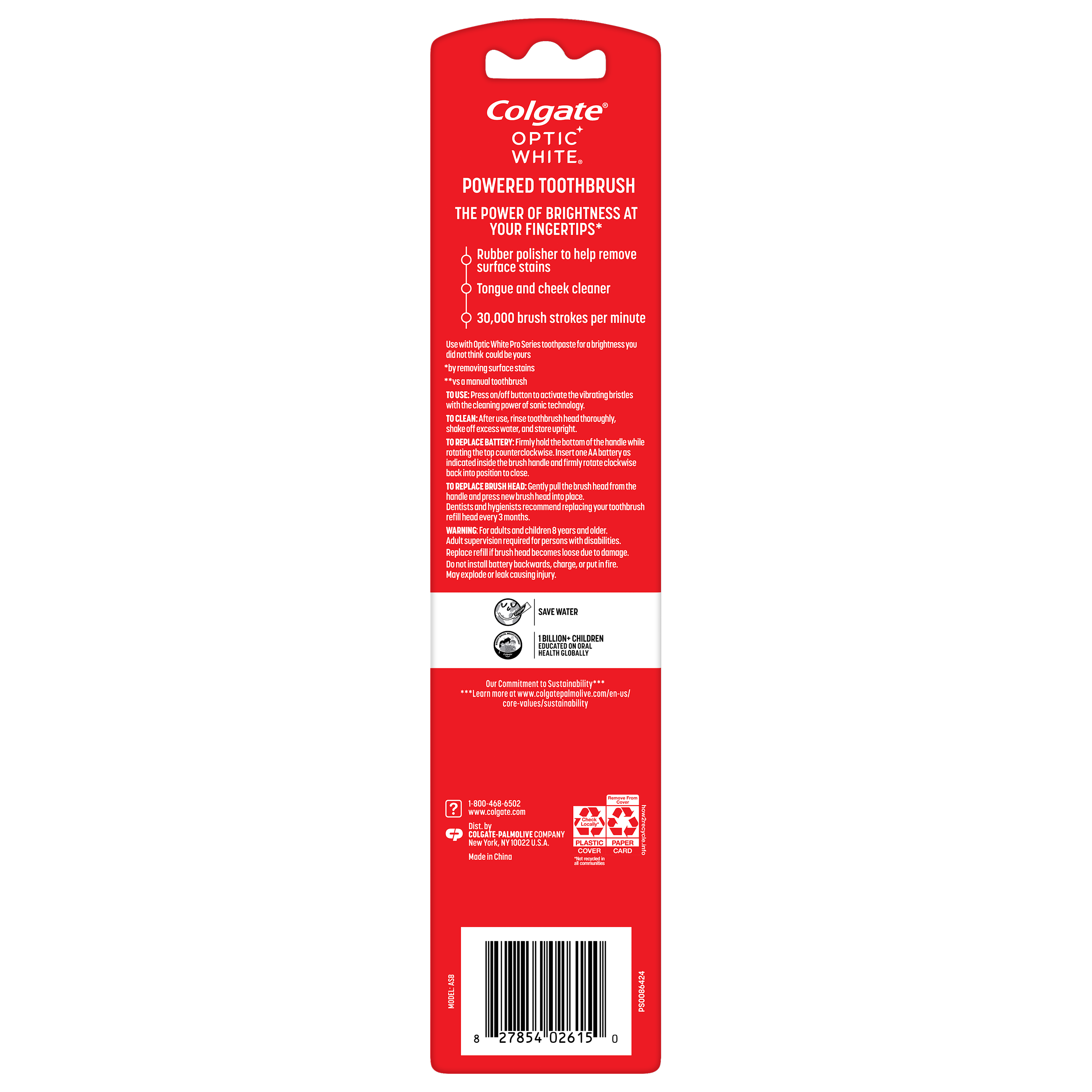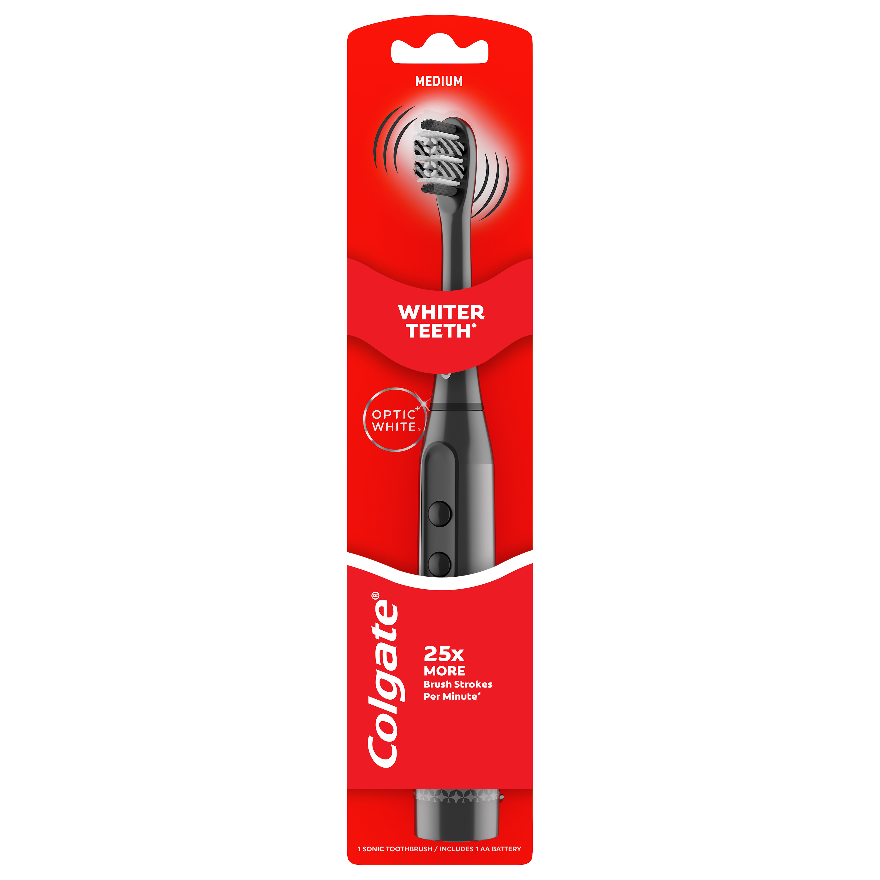 | Product Description | Experience the power of brightness at your fingertips* with the Colgate Optic White Medium Bristled Adult Battery Toothbrush. The Colgate Optic White Adult Sonic Toothbrush is expertly designed to help you achieve whiter teeth by removing surface stains when you brush. This battery powered toothbrush for white teeth works great as a portable travel toothbrush and includes one AA battery for immediate use. The Colgate Optic White Battery Toothbrush uses sonic technology to enable 25x more brush strokes per minute** and also features a built-in rubber polisher to help remove surface stains. With a touch of a button, unleash the cleaning power of 30,000 brush strokes per minute with this battery powered white teeth toothbrush. In addition to helping whiten teeth, the sonic powered medium bristle toothbrush also includes a tongue and cheek cleaner. Pair this Colgate Optic White Battery Operated Medium Toothbrush with Colgate Optic White Pro Series toothpaste for a brightness you did not think could be yours. Start your journey to whiter teeth using the Colgate Optic White Adult Battery Powered Toothbrush.