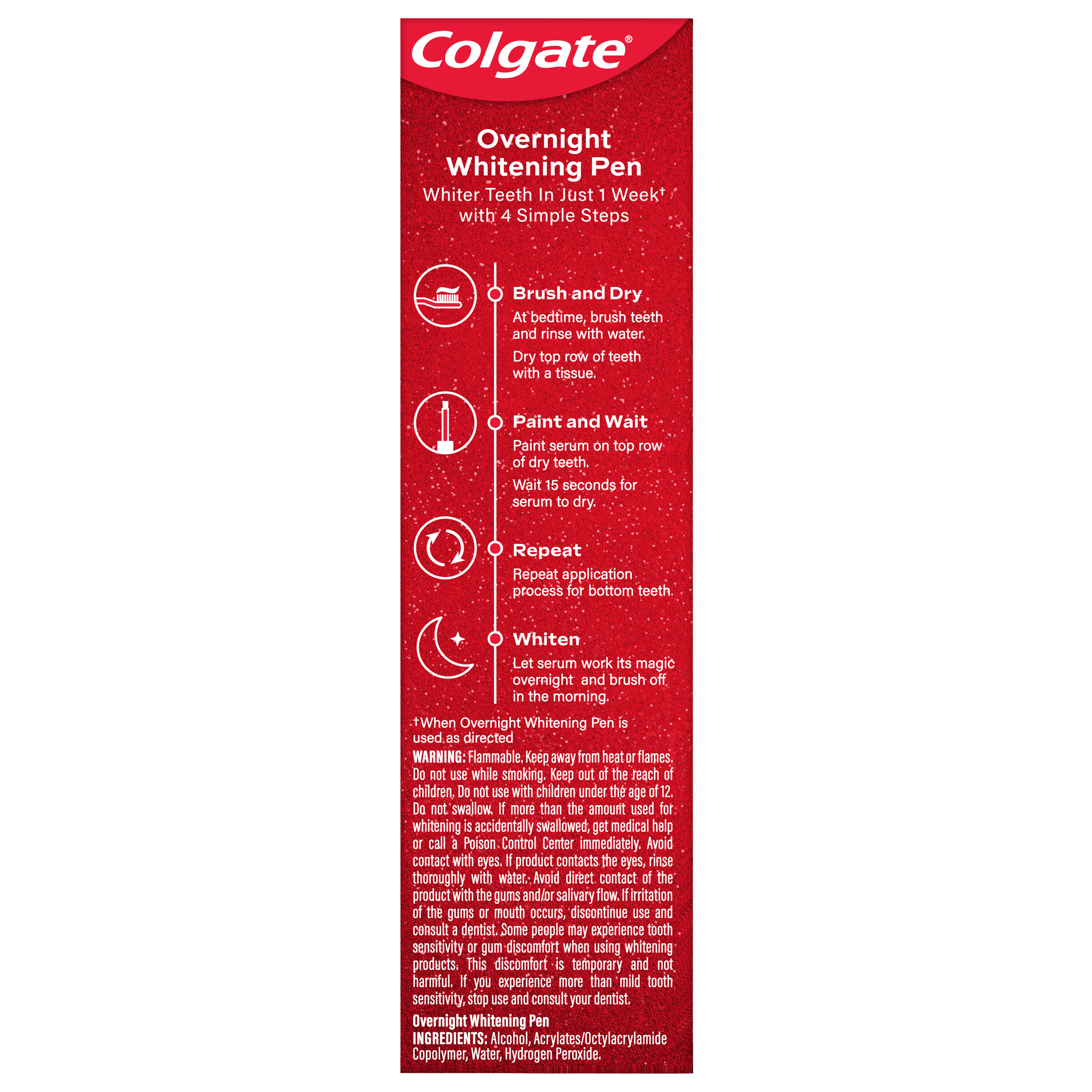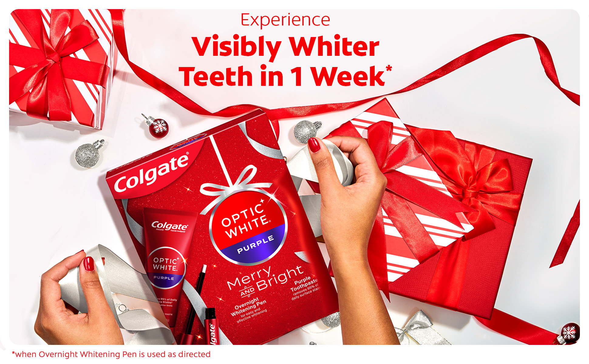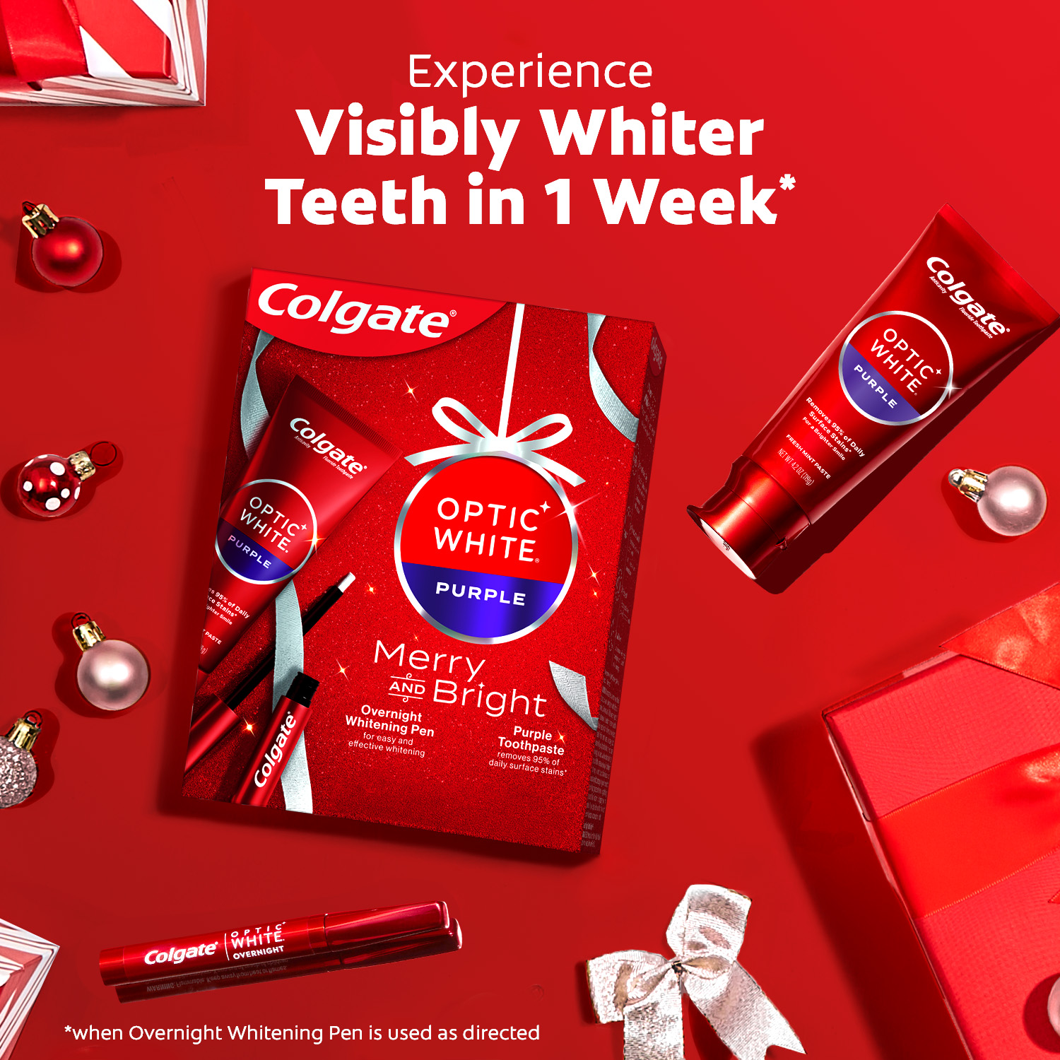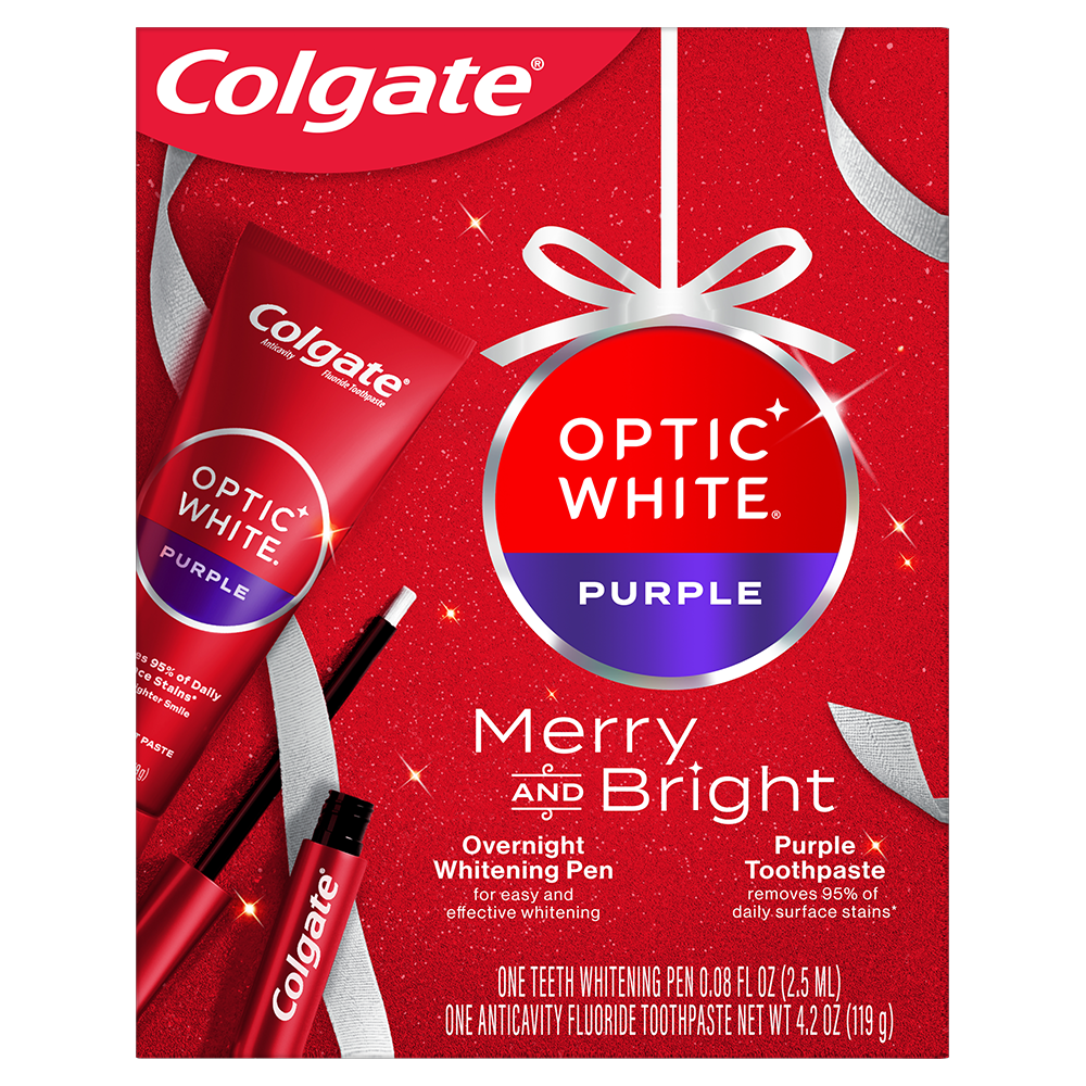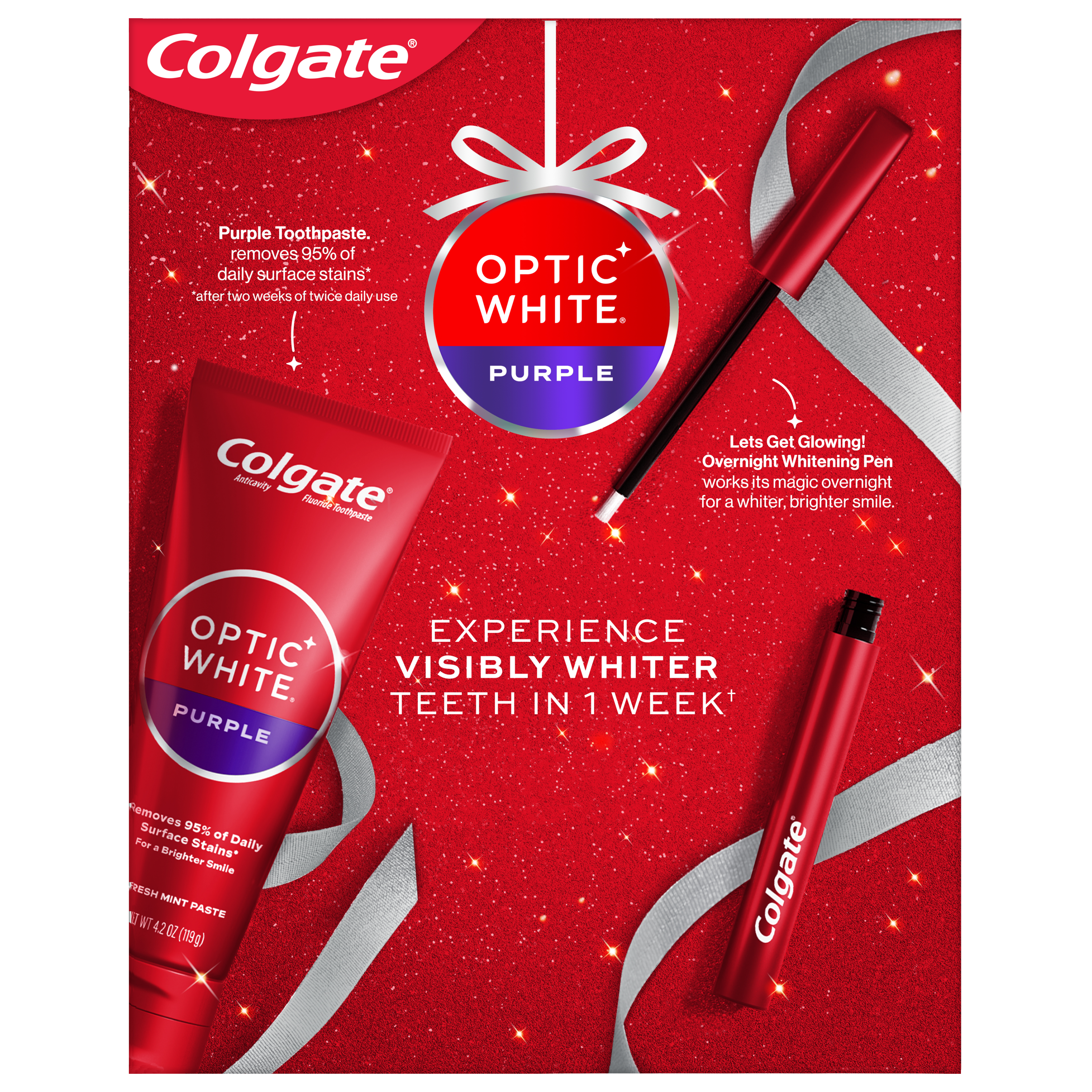 SKU 61053288 Product Title Colgate Optic White Overnight Teeth Whitening Pen and Purple Toothpaste Holiday Gift Set Product Description Celebrate a bright smile all season long with the Colgate Optic White Overnight Teeth Whitening Pen and Purple Toothpaste Holiday Gift Set. This holiday teeth whitening kit includes a brightening Colgate Optic White Purple Toothpaste and a Colgate Optic White Overnight Teeth Whitening Pen. The whitening fluoride toothpaste removes 95% of daily surface stains* and the easy-to-use overnight whitening pen delivers visibly whiter teeth in just one week**. Shine bright with this Colgate Optic White Teeth Whitening Holiday Gift Pack. *after brushing twice daily for 2 weeks **when used as directed Bullet 1 Includes one (1) 0.08 oz Colgate Optic White Overnight Teeth Whitening Pen with 21 Treatments and (1) 4.2 oz Colgate Optic White Purple Toothpaste Bullet 2 Celebrate the holidays with a dazzling and bright smile using this bundled teeth whitening holiday gift set from Colgate Bullet 3 The enamel-safe teeth whitening pen delivers visibly whiter teeth in just 1 week** (3 weeks of treatment is recommended for the best results) Bullet 4 Colgate Optic White Purple Toothpaste with Fluoride removes 95% of daily surface stains for a brighter smile* Bullet 5 The teeth whitening pen helps whiten teeth using hydrogen peroxide and is designed for no tooth sensitivity during and after the whitening process Bullet 6 Use this Colgate teeth whitening kit as a fun adult stocking stuffer, white elephant gift, office Secret Santa gift, and more Bullet 7 Colgate Optic White Purple Toothpaste comes in a refreshing mint flavor and is made with a fluoride-based formula to help fight cavities Target RPC 94745638 Target URL https://www.target.com/p/a/-/A-94745638